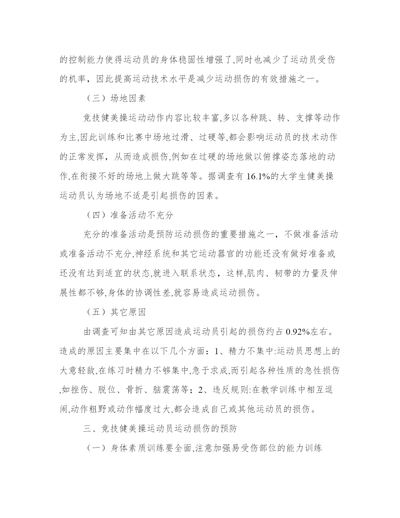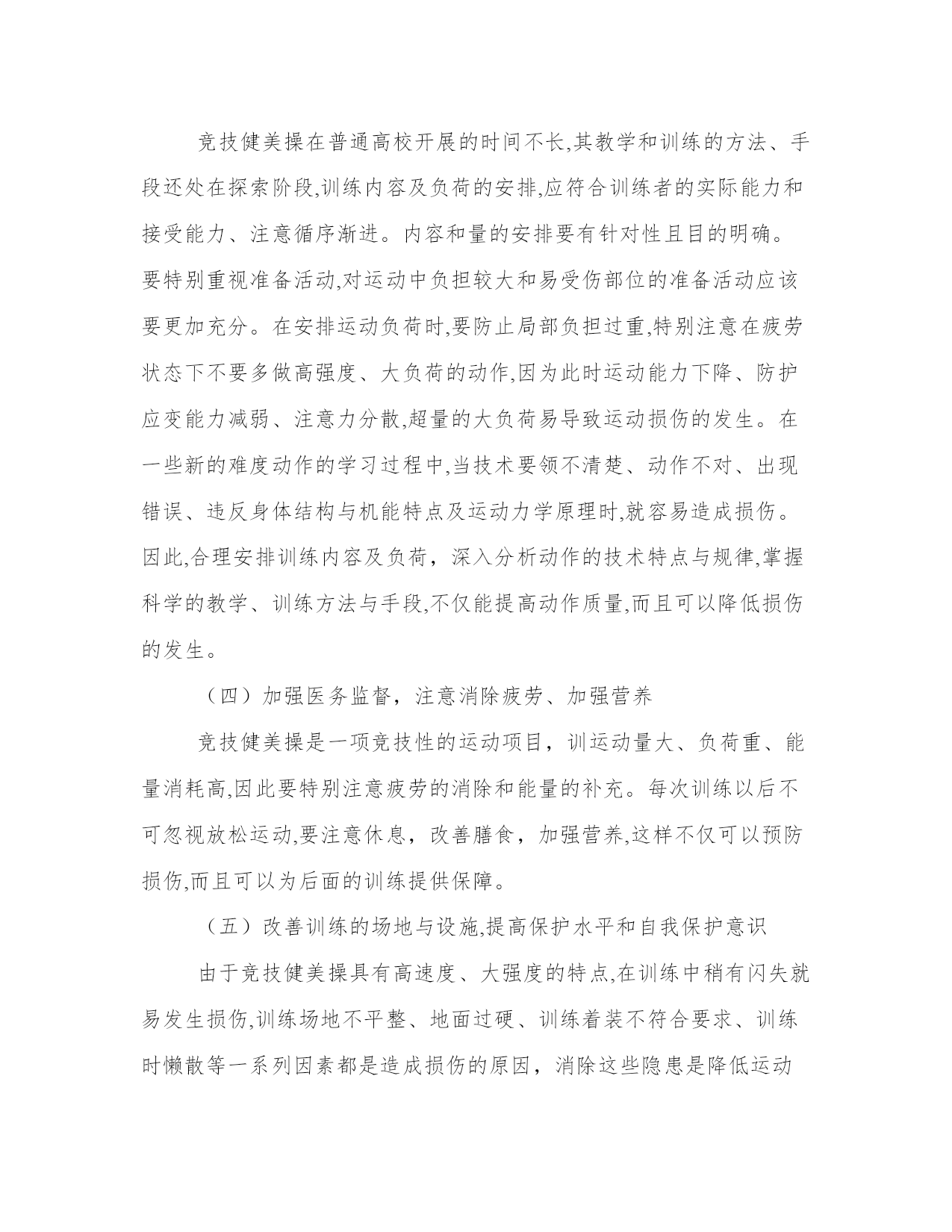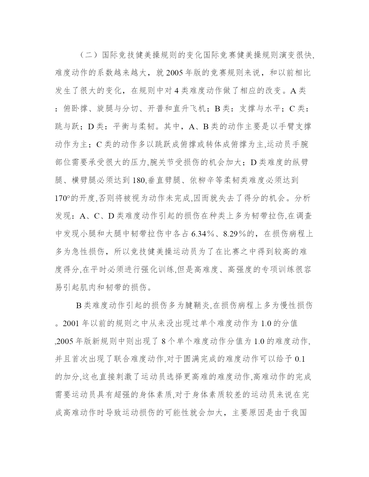 关于桂林高校竞技健美操运动员运动损伤的原因及预防教育论文论文关键词:运动员;竞技健美操;运动损伤一、大学生竞技健美操运动员损伤的因素(一)竞技健美操项目的特点竞技健美操是一项快节奏、动作变化多的新型比赛项目,其内容丰富,动作新颖独特,难度高,具有强烈的表现力和艺术感染力,是由技巧的规定动作创编动作和跑跳结合的单人、双人、三人、六人的徒手操。它是一项以柔韧、协调为基础,以力度、力量为核心,以耐力为保证的表现难美性非周期性的技能运动项目。它要求运动员在三维空间交替中进行难度较大的动力性和静力性动作,高频率、大幅度地完成复杂的动作组合,流畅地完成各种托举、支撑配合等动作,因此在完成动作的过程中身体承受的压力是非常大的,一旦这种压力作用于身体某一薄弱环节,在快速变化中完成的动作时稍有疏忽就易导致损伤。通过对62名大学生健美操运动员及损伤种类和受伤部位构成比的调查,从事健美操运动员都发生过运动损伤。损伤部位大多属于急性损伤,慢性损伤,造成运动员损伤的主要原因是突击难度动作和准备活动的不充分,如常见的运动损伤有肌肉拉伤,踝关节韧带损伤等,由此可见健美操运动项目是一个易发生损伤的运动项目之一。(二)国际竞技健美操规则的变化国际竞赛健美操规则演变很快,难度动作的系数越来越大,就2005年版的竞赛规则来说,和以前相比发生了很大的变化,在规则中对4类难度动作做了相应的改变。A类:俯卧撑、旋腿与分切、开普和直升飞机;B类:支撑与水平;C类:跳与跃;D类:平衡与柔韧。其中,A、B类的动作主要是以手臂支撑动作为主;C类的动作多以跳跃成俯撑或转体成俯撑为主,运动员手腕部位需要承受很大的压力,腕关节受损伤的机会加大;D类难度的纵劈腿、横劈腿必须达到180,垂直劈腿、依柳辛等柔韧类难度必须达到170°的开度,否则将被视为动作未完成,因而就失去了得分的机会。分析发现:A、C、D类难度动作引起的损伤在种类上多为韧带拉伤,在调查中发现小腿和大腿中韧带拉伤中各占6.34%、8.29%的,在损伤病程上多为急性损伤,所以竞技健美操运动员为了在比赛之中得到较高的难度得分,在平时必须进行强化训练,但是高难度、高强度的专项训练很容易引起肌肉和韧带的损伤。B类难度动作引起的损伤多为腱鞘炎,在损伤病程上多为慢性损伤。2001年以前的规则之中从来没出现过单个难度动作为1.0的分值,2005年版新规则中则出现了8个单个难度动作分值为1.0的难度动作,并且首次出现了联合难度动作,对于圆满完成的难度动作可以给予0.1的加分,这也直接刺激了运动员选择更高难的难度动作,高难动作的完成需要运动员具有超强的身体素质,对于身体素质较差的运动员来说在完成高难动作时导致运动损伤的可能性就会加大,主要原因是由于我国竞技健美操不象竞技体操的发展那么成熟,包括训练经验、恢复保障手段等,导致了竞技健美操的训练存在着一定的盲目性,所以,竞技健美操规则的导向对运动员的损伤存在着潜在的影响。二、桂林高校竞技健美操运动员损伤的直接因素(一)运动疲劳竞技健美操要求运动员要在规定的时间内大幅度、高频率、高强度、精确地完成每一个动作,由于大学生健美操运动员训练时间有限,因此体能储备不足,使得运动员在完成后半套动作时体力不支,完成动作的质量下降,失误率增多,从而导致损伤的发生。大学生健美操运动员具有双重身份,担负着学业和训练的双重任务,训练时间不足,由于训练时间短,又有获得好的成绩渴望,所以赛前多次重复练习某些不易掌握的动作,势必会造成身体某些部位的局部负担过重,使身体的局部部位产生疲劳,肌肉的机能下降,力量减弱,协调性降低,久而久之就会引起损伤;调查得知有19.51%的运动员认为疲劳是导致损伤的原因,占损伤因素的第一位。(二)技术因素竞技健美操还是一个年轻的竞技项目,训练方法和手段还不够完善,技术动作还不够规范的现象突出,尤其是在高校。根据调查由于技术原因而导致损伤的占大学生运动员受伤率的15.61%。一名优秀运动员应当具备较强的身体控制能力和精确地完成成套动作的能力,这种身体的控制能力使得运动员的身体稳固性增强了,同时也减少了运动员受伤的机率,因此提高运动技术水平是减少运动损伤的有效措施之一。(三)场地因素竞技健美操运动动作内容比较丰富,多以各种跳、转、支撑等动作为主,因此训练和比赛中场地过滑、过硬等,都会影响运动员的技术动作的正常发挥,从而造成损伤,例如在过硬的场地做以俯撑姿态落地的动作,在衔接不好的场地上做大跳等等。据调查有16.1%的大学生健美操运动员认为场地不适是引起损伤的因素。(四)准备活动不充分充分的准备活动是预防运动损伤的重要措施之一,不做准备活动或准备活动不充分,神经系统和其它运动器官的功能还没有做好准备或还没有达到适宜的状态,就进入联系状态,这样,肌肉、韧带的力量及伸展性