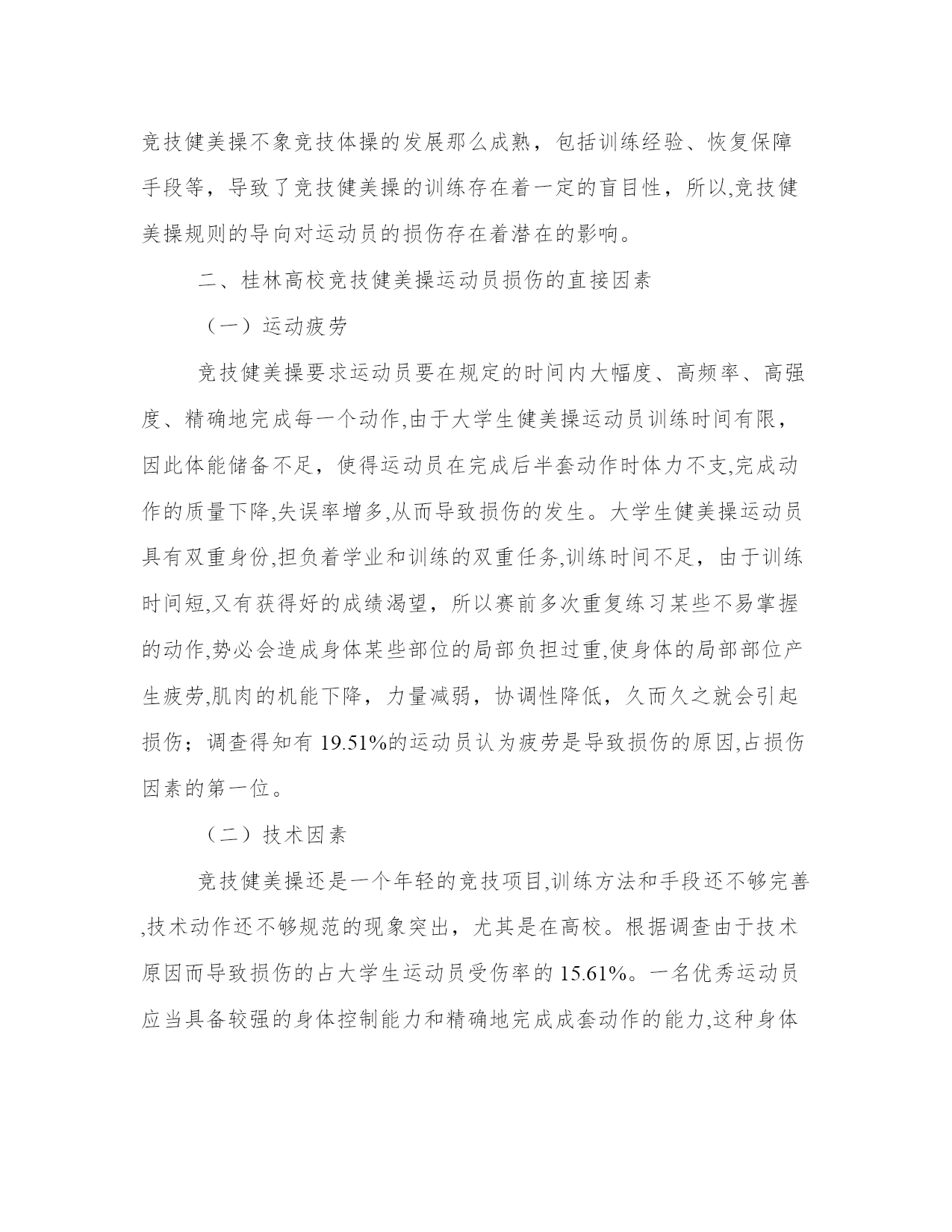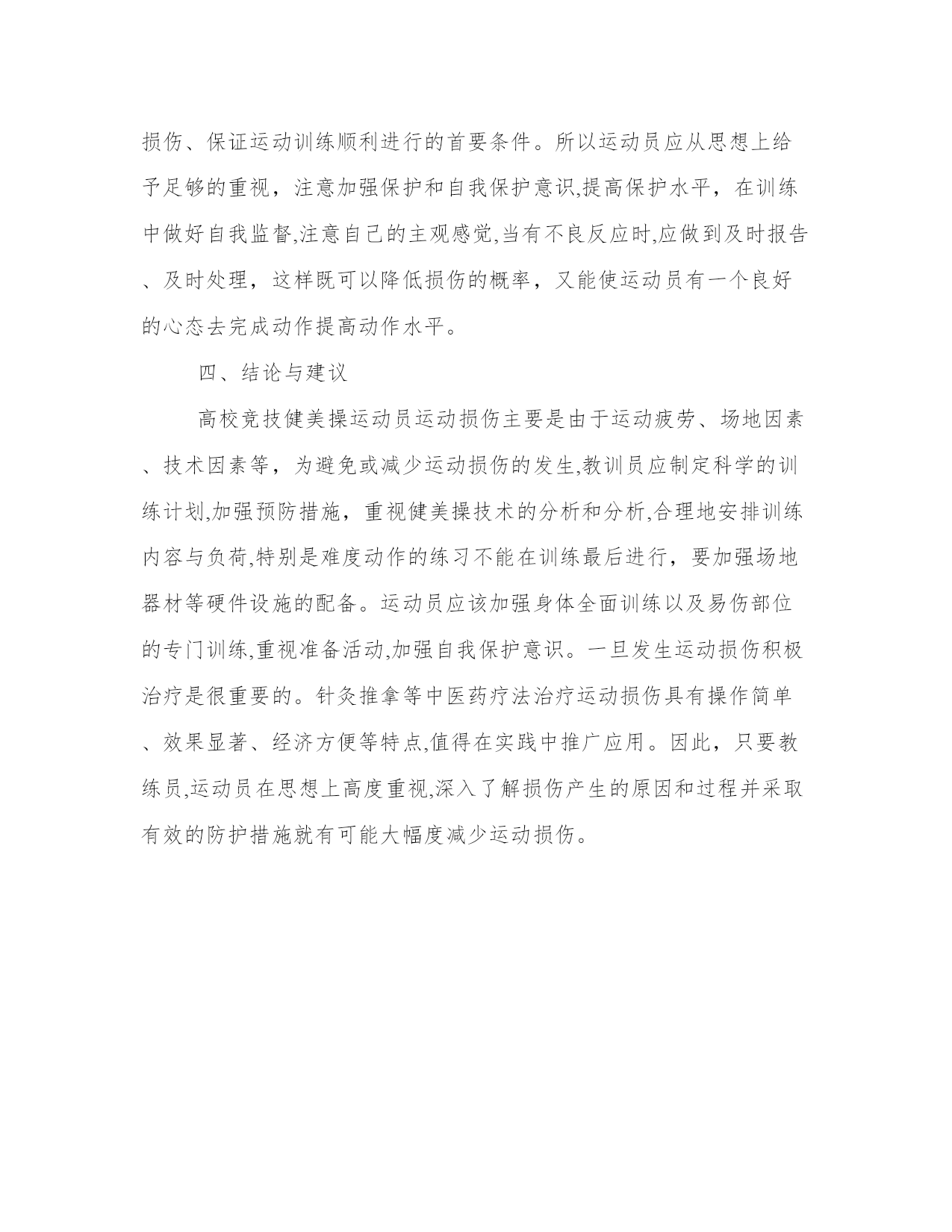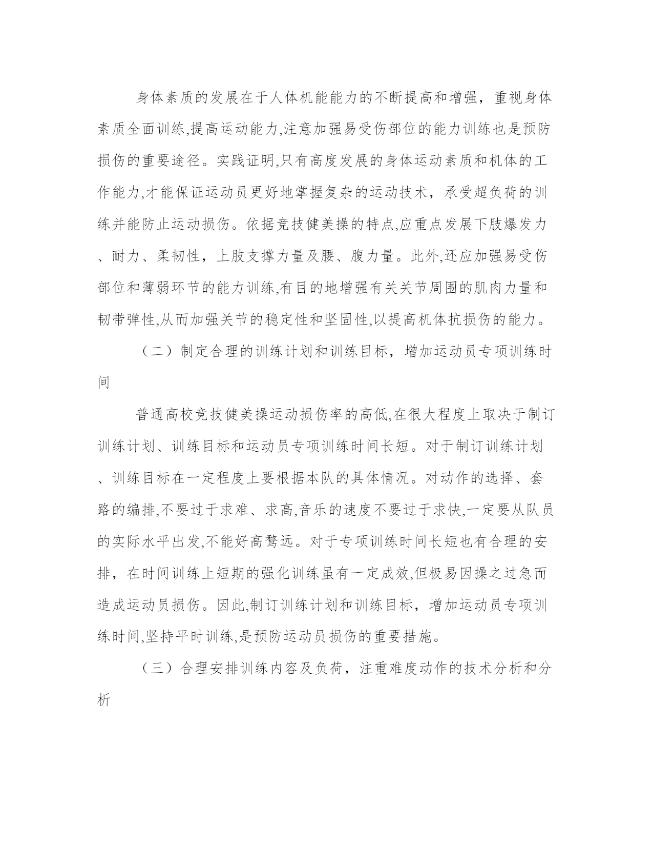 关于桂林高校竞技健美操运动员运动损伤的原因及预防教育论文论文关键词:运动员;竞技健美操;运动损伤一、大学生竞技健美操运动员损伤的因素(一)竞技健美操项目的特点竞技健美操是一项快节奏、动作变化多的新型比赛项目,其内容丰富,动作新颖独特,难度高,具有强烈的表现力和艺术感染力,是由技巧的规定动作创编动作和跑跳结合的单人、双人、三人、六人的徒手操。它是一项以柔韧、协调为基础,以力度、力量为核心,以耐力为保证的表现难美性非周期性的技能运动项目。它要求运动员在三维空间交替中进行难度较大的动力性和静力性动作,高频率、大幅度地完成复杂的动作组合,流畅地完成各种托举、支撑配合等动作,因此在完成动作的过程中身体承受的压力是非常大的,一旦这种压力作用于身体某一薄弱环节,在快速变化中完成的动作时稍有疏忽就易导致损伤。通过对62名大学生健美操运动员及损伤种类和受伤部位构成比的调查,从事健美操运动员都发生过运动损伤。损伤部位大多属于急性损伤,慢性损伤,造成运动员损伤的主要原因是突击难度动作和准备活动的不充分,如常见的运动损伤有肌肉拉伤,踝关节韧带损伤等,由此可见健美操运动项目是一个易发生损伤的运动项目之一。(二)国际竞技健美操规则的变化国际竞赛健美操规则演变很快,难度动作的系数越来越大,就2005年版的竞赛规则来说,和以前相比发生了很大的变化,在规则中对4类难度动作做了相应的改变。A类:俯卧撑、旋腿与分切、开普和直升飞机;B类:支撑与水平;C类:跳与跃;D类:平衡与柔韧。其中,A、B类的动作主要是以手臂支撑动作为主;C类的动作多以跳跃成俯撑或转体成俯撑为主,运动员手腕部位需要承受很大的压力,腕关节受损伤的机会加大;D类难度的纵劈腿、横劈腿必须达到180,垂直劈腿、依柳辛等柔韧类难度必须达到170°的开度,否则将被视为动作未完成,因而就失去了得分的机会。分析发现:A、C、D类难度动作引起的损伤在种类上多为韧带拉伤,在调查中发现小腿和大腿中韧带拉伤中各占6.34%、8.29%的,在损伤病程上多为急性损伤,所以竞技健美操运动员为了在比赛之中得到较高的难度得分,在平时必须进行强化训练,但是高难度、高强度的专项训练很容易引起肌肉和韧带的损伤。B类难度动作引起的损伤多为腱鞘炎,在损伤病程上多为慢性损伤。2001年以前的规则之中从来没出现过单个难度动作为1.0的分值,2005年版新规则中则出现了8个单个难度动作分值为1.0的难度动作,并且首次出现了联合难度动作,对于圆满完成的难度动作可以给予0.1的加分,这也直接刺激了运动员选择更高难的难度动作,高难动作的完成需要运动员具有超强的身体素质,对于身体素质较差的运动员来说在完成高难动作时导致运动损伤的可能性就会加大,主要原因是由于我国竞技健美操不象竞技体操的发展那么成熟,包括训练经验、恢复保障手段等,导致了竞技健美操的训练存在着一定的盲目性,所以,竞技健美操规则的导向对运动员的损伤存在着潜在的影响。二、桂林高校竞技健美操运动员损伤的直接因素(一)运动疲劳竞技健美操要求运动员要在规定的时间内大幅度、高频率、高强度、精确地完成每一个动作,由于大学生健美操运动员训练时间有限,因此体能储备不足,使得运动员在完成后半套动作时体力不支,完成动作的质量下降,失误率增多,从而导致损伤的发生。大学生健美操运动员具有双重身份,担负着学业和训练的双重任务,训练时间不足,由于训练时间短,又有获得好的成绩渴望,所以赛前多次重复练习某些不易掌握的动作,势必会造成身体某些部位的局部负担过重,使身体的局部部位产生疲劳,肌肉的机能下降,力量减弱,协调性降低,久而久之就会引起损伤;调查得知有19.51%的运动员认为疲劳是导致损伤的原因,占损伤因素的第一位。(二)技术因素竞技健美操还是一个年轻的竞技项目,训练方法和手段还不够完善,技术动作还不够规范的现象突出,尤其是在高校。根据调查由于技术原因而导致损伤的占大学生运动员受伤率的15.61%。一名优秀运动员应当具备较强的身体控制能力和精确地完成成套动作的能力,这种身体的控制能力使得运动员的身体稳固性增强了,同时也减少了运动员受伤的机率,因此提高运动技术水平是减少运动损伤的有效措施之一。(三)场地因素竞技健美操运动动作内容比较丰富,多以各种跳、转、支撑等动作为主,因此训练和比赛中场地过滑、过硬等,都会影响运动员的技术动作的正常发挥,从而造成损伤,例如在过硬的场地做以俯撑姿态落地的动作,在衔接不好的场地上做大跳等等。据调查有16.1%的大学生健美操运动员认为场地不适是引起损伤的因素。(四)准备活动不充分充分的准备活动是预防运动损伤的重要措施之一,不做准备活动或准备活动不充分,神经系统和其它运动器官的功能还没有做好准备或还没有达到适宜的状态,就进入联系状态,这样,肌肉、韧带的力量及伸展性