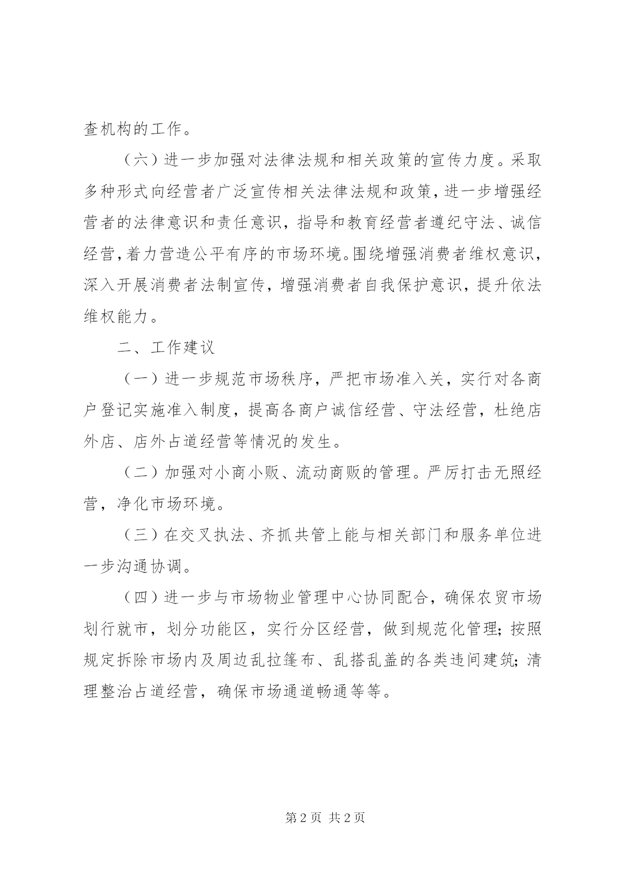 第PAGE\*Arabic\*MERGEFORMAT2页共NUMPAGES\*MERGEFORMAT2页工商局工作评议情况汇报根据崇常办字[2013]7号文件要求,我局组织了城管大队、市场物业管理中心等与工商工作关系比较紧密的部门对我县工商局的工作进行了评议,就县工商局与我局有关部门相关的工作情况加以总结,并就今后工作中双方的配合和协作方面提了几点工作建议。总的来说,县工商局在县委、县政府和市工商局的正确领导下,坚持依法行政,加强市场监管,严格市场准入,不断整顿规范市场经济秩序,努力为企业、个体工商户和私营业主服务,较好地维护了我县市场环境和投资环境。一、工作情况(一)贯彻执行党的路线、方针、政策和法律法规,依法行政,服务社会经济健康发展。(二)整顿规范市场秩序,强化市场监管,积极为企业和个体工商户服务。(三)依法组织监督市场交易行为,组织监督流通领域商品质量,组织查处假冒伪劣商品行为,受理消费者申诉,组织查处侵犯消费者权益案件,保护经营者、消费者合法权益。(四)能与各部门配合,积极参与联合执法。配合我局做好县域市容环境整治、四城同创等工作,有效地打击了各类违章经营活动。(五)协助管理广告审批发布与广告经营活动,指导广告审查机构的工作。(六)进一步加强对法律法规和相关政策的宣传力度。采取多种形式向经营者广泛宣传相关法律法规和政策,进一步增强经营者的法律意识和责任意识,指导和教育经营者遵纪守法、诚信经营,着力营造公平有序的市场环境。围绕增强消费者维权意识,深入开展消费者法制宣传,增强消费者自我保护意识,提升依法维权能力。二、工作建议(一)进一步规范市场秩序,严把市场准入关,实行对各商户登记实施准入制度,提高各商户诚信经营、守法经营,杜绝店外店、店外占道经营等情况的发生。(二)加强对小商小贩、流动商贩的管理。严厉打击无照经营,净化市场环境。(三)在交叉执法、齐抓共管上能与相关部门和服务单位进一步沟通协调。(四)进一步与市场物业管理中心协同配合,确保农贸市场划行就市,划分功能区,实行分区经营,做到规范化管理;按照规定拆除市场内及周边乱拉篷布、乱搭乱盖的各类违间建筑;清理整治占道经营,确保市场通道畅通等等。