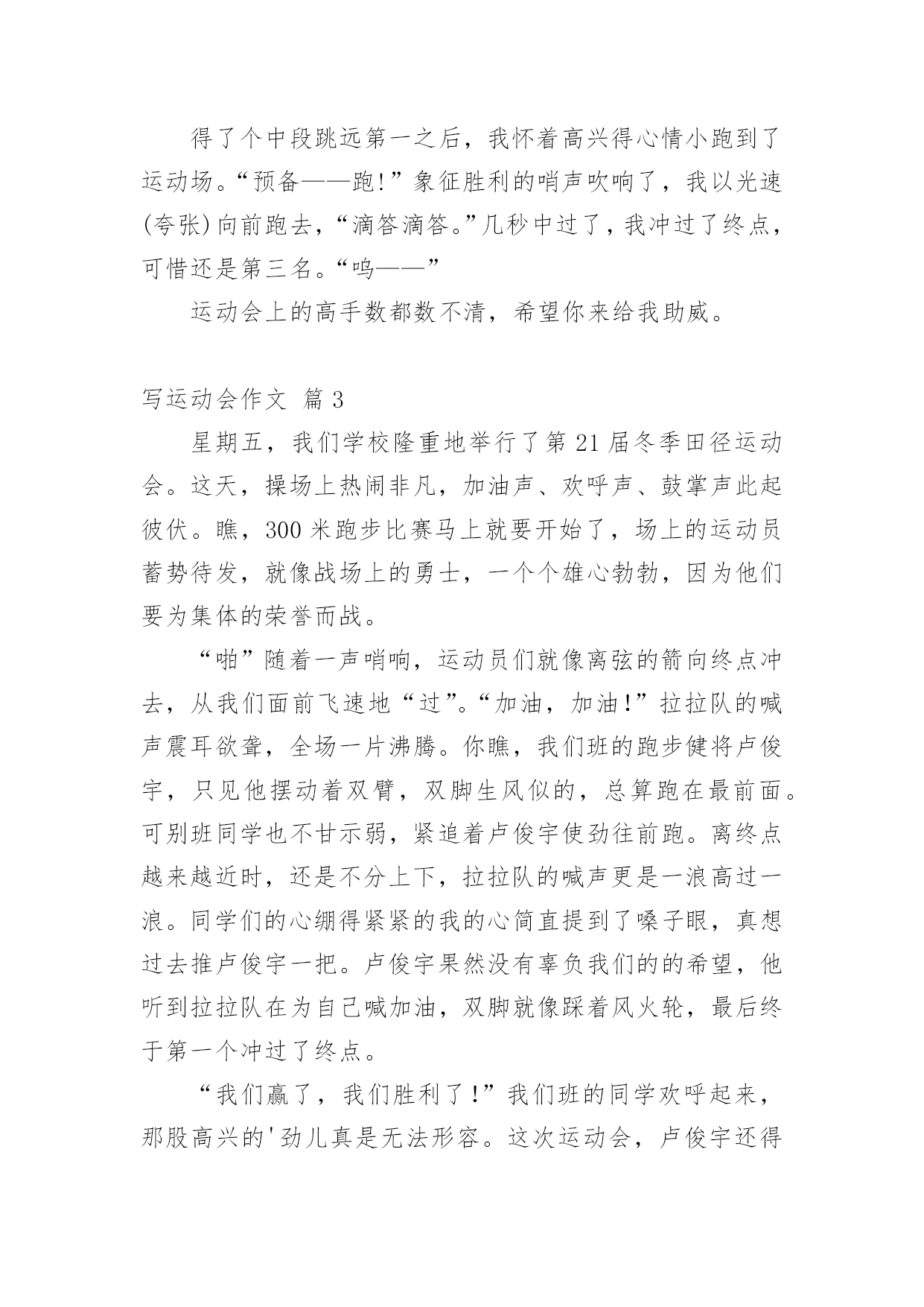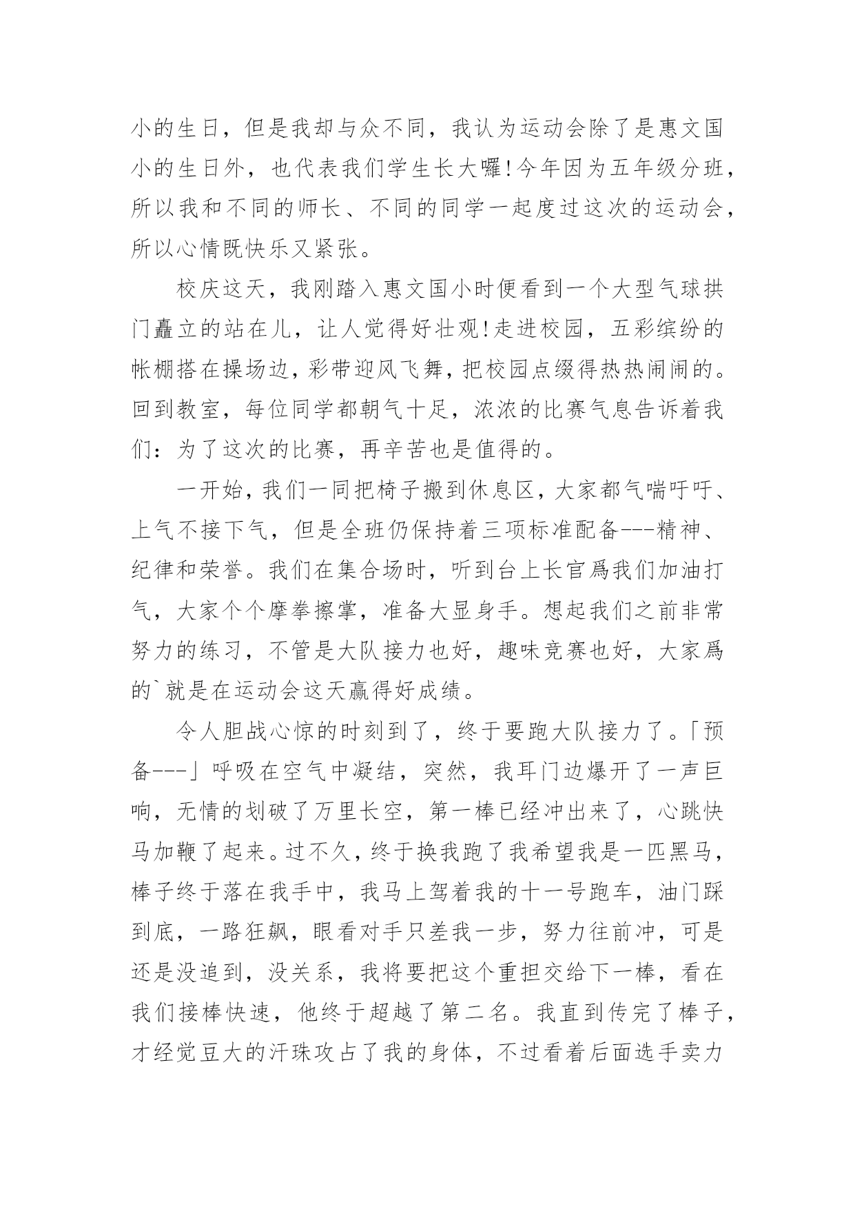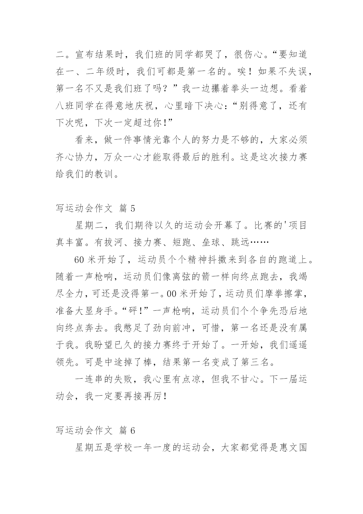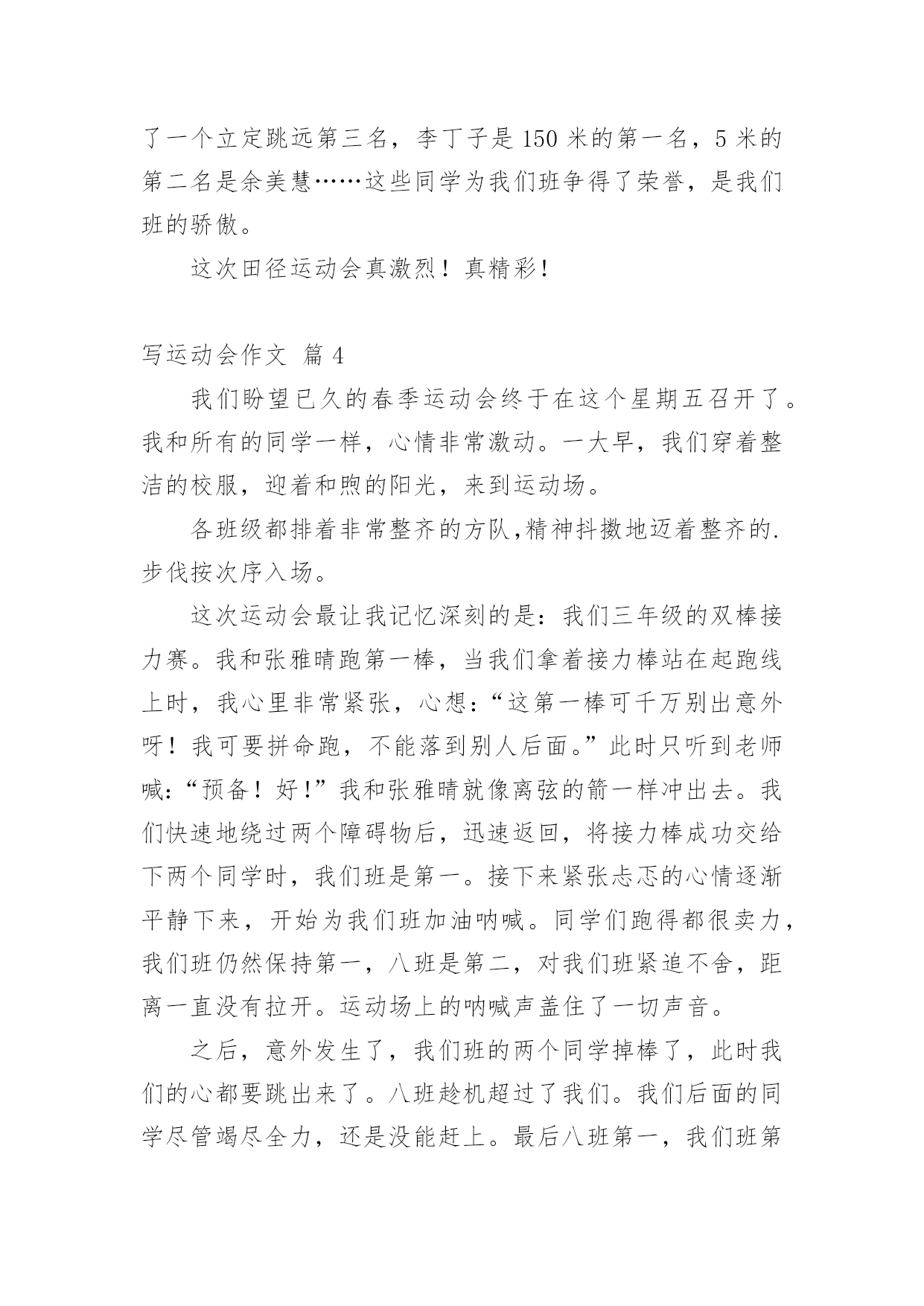 写运动会作文写运动会作文【精华】无论在学习、工作或是生活中,大家总免不了要接触或使用作文吧,根据写作命题的特点,作文可以分为命题作文和非命题作文。作文的注意事项有许多,你确定会写吗?下面是小编精心整理的写运动会作文9篇,欢迎大家分享。写运动会作文篇1“加油!加油!”咦同学们在干什么呢?哦,原来今天我们学校在开趣味运动会,大家都在为自己班的同学呐喊助威。这次趣味运动会有七、八个项目,给我印象最深的是广播操和踢毽子比赛。因为这两个项目都有我的份。一开始是广播操比赛。我们排着整齐的队伍向前走去,嘴里喊着:“大雁、大雁团结守纪,五一、五一勇往直前。”这样洪亮的口号,齐步走到了指定的位置。当我做到最后一节时我犯了一个小错误,那一节我的脚应该不用动的,可我却动了,我不禁有点自责、内疚。经过了紧张的广播操比赛,马上迎来了踢毽子比赛。比赛前老师还特别和我说:“踢毽子时不要把毽子踢得太高,这样会浪费时间,另外毽子掉地上要马上捡起接着踢。”我上场时心里有些紧张,我对自己说:“不要紧张,如果你紧张了就不能为班级争光了。”我深吸了一口气。然后依着老师跟我说的话去做。“八十一、八十、八十三、八十四……”只听裁判员说了一声“停”。给我数的吴爱娟老师说:“真不错,踢了八十四个。”果然,皇天不负有心人,我在踢毽子比赛中得了一个男生第一名。当我听到这个消息时,我一蹦三尺高。这时我不禁回想起之的`努力和流过的汗水,没有白费。我回到家后把这个消息告诉了大妈,大妈说:“真的,你终于得了一个第一名。”说完从包里拿出了十元钱给我说:“这十元钱做为给你的奖励。”经过了这次运动会我知道只要努力就会有成功。写运动会作文篇2今天,我们学校开运动会。作为运动员的我急急忙忙地赶到学校,到了学校以后,看到拉拉队像灰尘一样多,真的诗人山人海。我看见五(2)班拿着一个牌子,上面写着:五一五一,倒数第一。让我苦笑不得。有的'人在沙坑边上蹲着,议论着谁有可能得第一;有的人在自言自语:我一定要得第一;还有的在当拉拉队,手里拿着一个毛球,鼓励着自己班上的运动员得第一。我是跳沙坑得和跑步的,身兼两任。我先走到沙坑旁,直冲过去,踩上踏板,飞身一跃就跳了个2米6,我为我的第一跳感到自豪。第二次,我没有踩中踏板,犯规了。第三次,我发火了,就以我最大的力气跳了最后一跳,居然跳了个3米,我真高兴。得了个中段跳远第一之后,我怀着高兴得心情小跑到了运动场。“预备——跑!”象征胜利的哨声吹响了,我以光速(夸张)向前跑去,“滴答滴答。”几秒中过了,我冲过了终点,可惜还是第三名。“呜——”运动会上的高手数都数不清,希望你来给我助威。写运动会作文篇3星期五,我们学校隆重地举行了第21届冬季田径运动会。这天,操场上热闹非凡,加油声、欢呼声、鼓掌声此起彼伏。瞧,300米跑步比赛马上就要开始了,场上的运动员蓄势待发,就像战场上的勇士,一个个雄心勃勃,因为他们要为集体的荣誉而战。“啪”随着一声哨响,运动员们就像离弦的箭向终点冲去,从我们面前飞速地“过”。“加油,加油!”拉拉队的喊声震耳欲聋,全场一片沸腾。你瞧,我们班的跑步健将卢俊宇,只见他摆动着双臂,双脚生风似的,总算跑在最前面。可别班同学也不甘示弱,紧追着卢俊宇使劲往前跑。离终点越来越近时,还是不分上下,拉拉队的喊声更是一浪高过一浪。同学们的心绷得紧紧的我的心简直提到了嗓子眼,真想过去推卢俊宇一把。卢俊宇果然没有辜负我们的的希望,他听到拉拉队在为自己喊加油,双脚就像踩着风火轮,最后终于第一个冲过了终点。“我们赢了,我们胜利了!”我们班的同学欢呼起来,那股高兴的'劲儿真是无法形容。这次运动会,卢俊宇还得了一个立定跳远第三名,李丁子是150米的第一名,5米的第二名是余美慧……这些同学为我们班争得了荣誉,是我们班的骄傲。这次田径运动会真激烈!真精彩!写运动会作文篇4我们盼望已久的春季运动会终于在这个星期五召开了。我和所有的同学一样,心情非常激动。一大早,我们穿着整洁的校服,迎着和煦的阳光,来到运动场。各班级都排着非常整齐的方队,精神抖擞地迈着整齐的.步伐按次序入场。这次运动会最让我记忆深刻的是:我们三年级的双棒接力赛。我和张雅晴跑第一棒,当我们拿着接力棒站在起跑线上时,我心里非常紧张,心想:“这第一棒可千万别出意外呀!我可要拼命跑,不能落到别人后面。”此时只听到老师喊:“预备!好!”我和张雅晴就像离弦的箭一样冲出去。我们快速地绕过两个障碍物后,迅速返回,将接力棒成功交给下两个同学时,我们班是第一。接下来紧张忐忑的心情逐渐平静下来,开始为我们班加油呐喊。同学们跑得都很卖力,我们班仍然保持第一,八班是第二,对我们班紧追不舍,距离一直没有拉开。运动场上的呐喊声盖住了一切声音。之后,意外发生了,我们班的两个同学掉棒了,此时我们的心都要跳出来了。八班趁机超过了我们。我们后面的同学尽管竭
