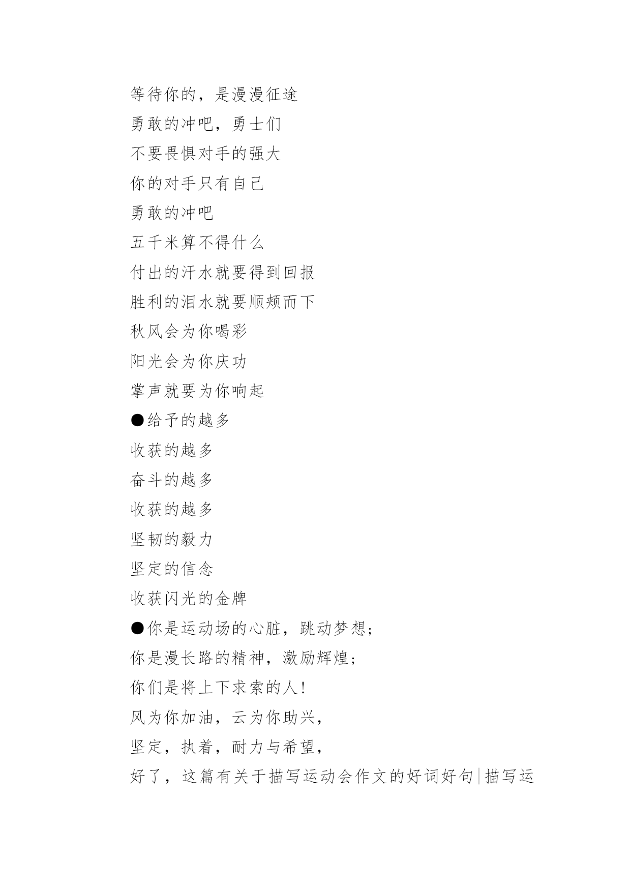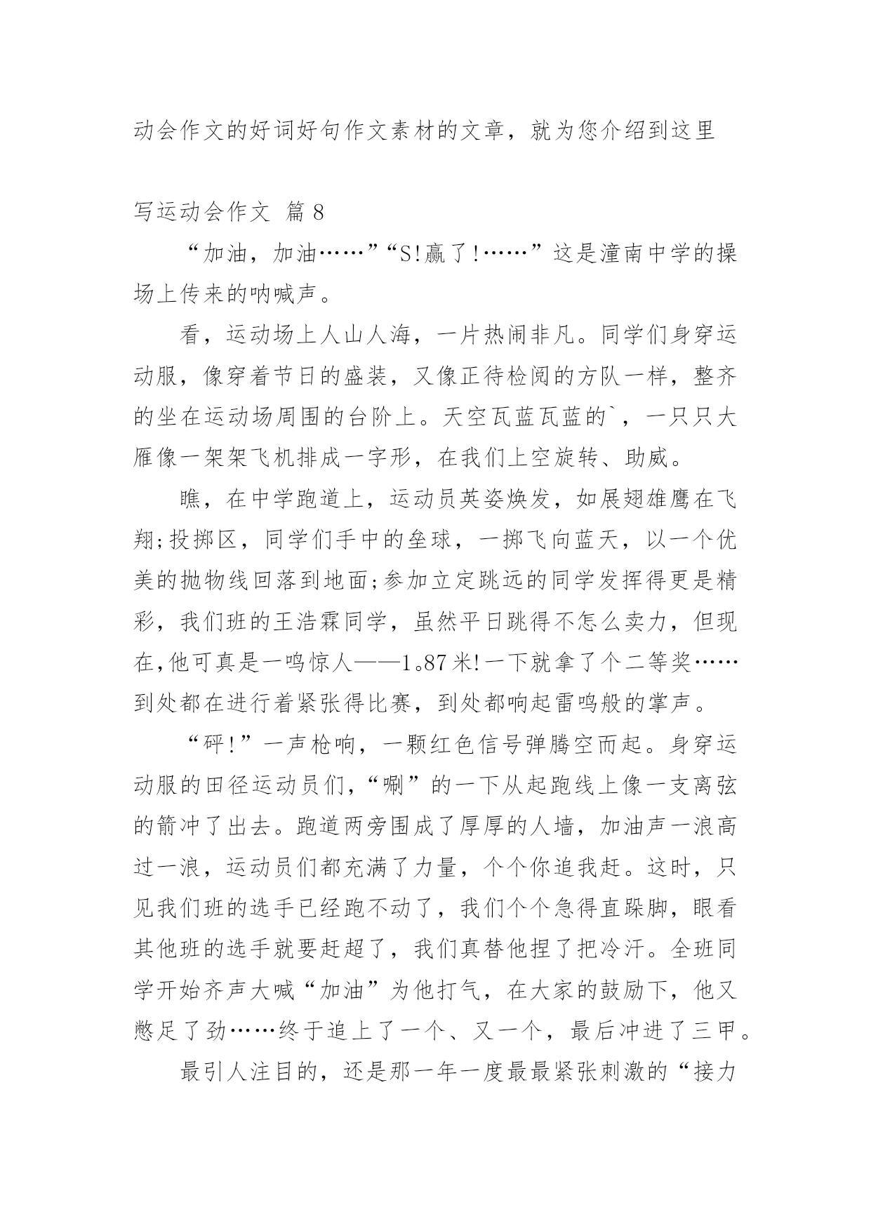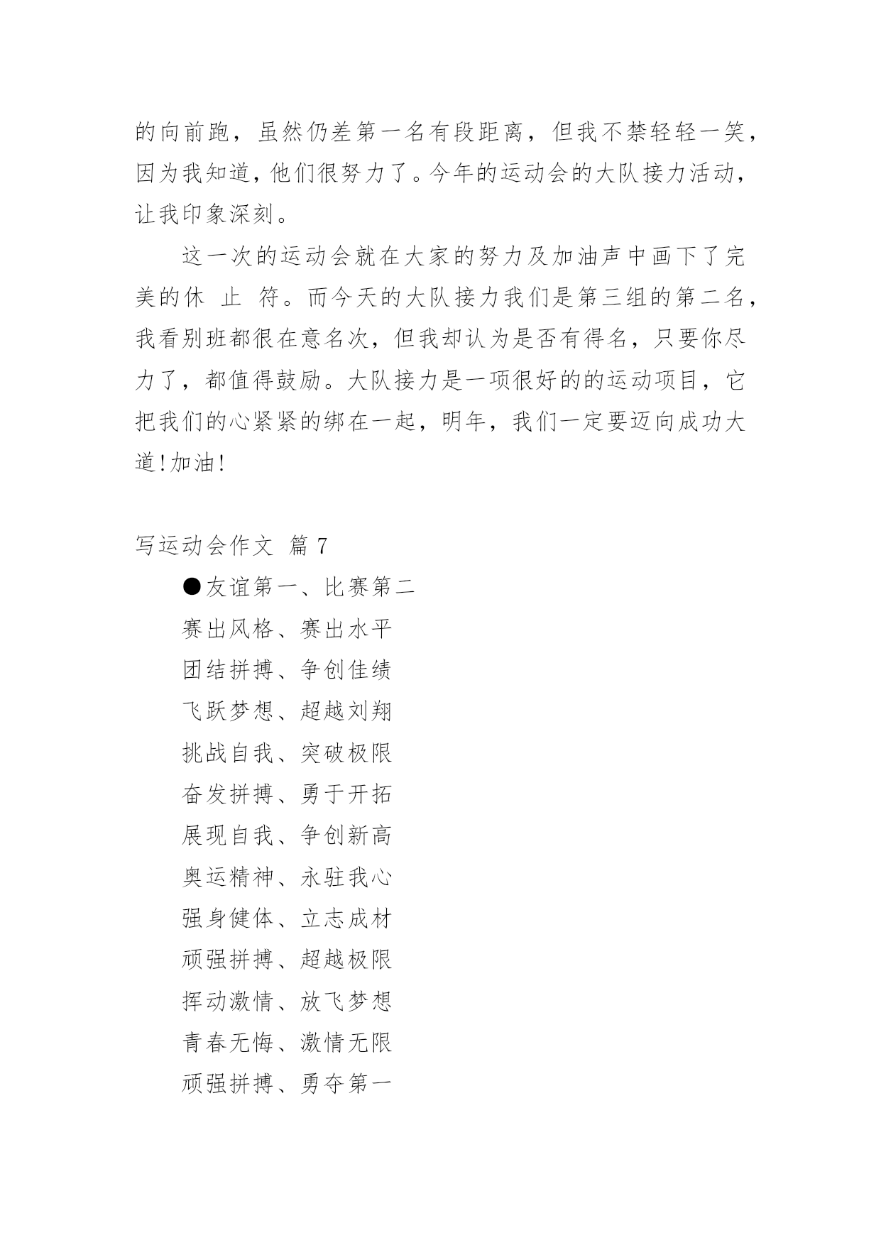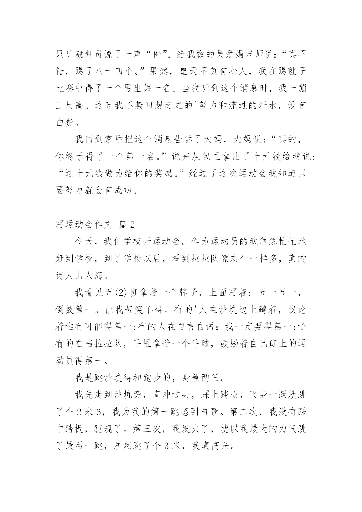 写运动会作文写运动会作文【精华】无论在学习、工作或是生活中,大家总免不了要接触或使用作文吧,根据写作命题的特点,作文可以分为命题作文和非命题作文。作文的注意事项有许多,你确定会写吗?下面是小编精心整理的写运动会作文9篇,欢迎大家分享。写运动会作文篇1“加油!加油!”咦同学们在干什么呢?哦,原来今天我们学校在开趣味运动会,大家都在为自己班的同学呐喊助威。这次趣味运动会有七、八个项目,给我印象最深的是广播操和踢毽子比赛。因为这两个项目都有我的份。一开始是广播操比赛。我们排着整齐的队伍向前走去,嘴里喊着:“大雁、大雁团结守纪,五一、五一勇往直前。”这样洪亮的口号,齐步走到了指定的位置。当我做到最后一节时我犯了一个小错误,那一节我的脚应该不用动的,可我却动了,我不禁有点自责、内疚。经过了紧张的广播操比赛,马上迎来了踢毽子比赛。比赛前老师还特别和我说:“踢毽子时不要把毽子踢得太高,这样会浪费时间,另外毽子掉地上要马上捡起接着踢。”我上场时心里有些紧张,我对自己说:“不要紧张,如果你紧张了就不能为班级争光了。”我深吸了一口气。然后依着老师跟我说的话去做。“八十一、八十、八十三、八十四……”只听裁判员说了一声“停”。给我数的吴爱娟老师说:“真不错,踢了八十四个。”果然,皇天不负有心人,我在踢毽子比赛中得了一个男生第一名。当我听到这个消息时,我一蹦三尺高。这时我不禁回想起之的`努力和流过的汗水,没有白费。我回到家后把这个消息告诉了大妈,大妈说:“真的,你终于得了一个第一名。”说完从包里拿出了十元钱给我说:“这十元钱做为给你的奖励。”经过了这次运动会我知道只要努力就会有成功。写运动会作文篇2今天,我们学校开运动会。作为运动员的我急急忙忙地赶到学校,到了学校以后,看到拉拉队像灰尘一样多,真的诗人山人海。我看见五(2)班拿着一个牌子,上面写着:五一五一,倒数第一。让我苦笑不得。有的'人在沙坑边上蹲着,议论着谁有可能得第一;有的人在自言自语:我一定要得第一;还有的在当拉拉队,手里拿着一个毛球,鼓励着自己班上的运动员得第一。我是跳沙坑得和跑步的,身兼两任。我先走到沙坑旁,直冲过去,踩上踏板,飞身一跃就跳了个2米6,我为我的第一跳感到自豪。第二次,我没有踩中踏板,犯规了。第三次,我发火了,就以我最大的力气跳了最后一跳,居然跳了个3米,我真高兴。得了个中段跳远第一之后,我怀着高兴得心情小跑到了运动场。“预备——跑!”象征胜利的哨声吹响了,我以光速(夸张)向前跑去,“滴答滴答。”几秒中过了,我冲过了终点,可惜还是第三名。“呜——”运动会上的高手数都数不清,希望你来给我助威。写运动会作文篇3星期五,我们学校隆重地举行了第21届冬季田径运动会。这天,操场上热闹非凡,加油声、欢呼声、鼓掌声此起彼伏。瞧,300米跑步比赛马上就要开始了,场上的运动员蓄势待发,就像战场上的勇士,一个个雄心勃勃,因为他们要为集体的荣誉而战。“啪”随着一声哨响,运动员们就像离弦的箭向终点冲去,从我们面前飞速地“过”。“加油,加油!”拉拉队的喊声震耳欲聋,全场一片沸腾。你瞧,我们班的跑步健将卢俊宇,只见他摆动着双臂,双脚生风似的,总算跑在最前面。可别班同学也不甘示弱,紧追着卢俊宇使劲往前跑。离终点越来越近时,还是不分上下,拉拉队的喊声更是一浪高过一浪。同学们的心绷得紧紧的我的心简直提到了嗓子眼,真想过去推卢俊宇一把。卢俊宇果然没有辜负我们的的希望,他听到拉拉队在为自己喊加油,双脚就像踩着风火轮,最后终于第一个冲过了终点。“我们赢了,我们胜利了!”我们班的同学欢呼起来,那股高兴的'劲儿真是无法形容。这次运动会,卢俊宇还得了一个立定跳远第三名,李丁子是150米的第一名,5米的第二名是余美慧……这些同学为我们班争得了荣誉,是我们班的骄傲。这次田径运动会真激烈!真精彩!写运动会作文篇4我们盼望已久的春季运动会终于在这个星期五召开了。我和所有的同学一样,心情非常激动。一大早,我们穿着整洁的校服,迎着和煦的阳光,来到运动场。各班级都排着非常整齐的方队,精神抖擞地迈着整齐的.步伐按次序入场。这次运动会最让我记忆深刻的是:我们三年级的双棒接力赛。我和张雅晴跑第一棒,当我们拿着接力棒站在起跑线上时,我心里非常紧张,心想:“这第一棒可千万别出意外呀!我可要拼命跑,不能落到别人后面。”此时只听到老师喊:“预备!好!”我和张雅晴就像离弦的箭一样冲出去。我们快速地绕过两个障碍物后,迅速返回,将接力棒成功交给下两个同学时,我们班是第一。接下来紧张忐忑的心情逐渐平静下来,开始为我们班加油呐喊。同学们跑得都很卖力,我们班仍然保持第一,八班是第二,对我们班紧追不舍,距离一直没有拉开。运动场上的呐喊声盖住了一切声音。之后,意外发生了,我们班的两个同学掉棒了,此时我们的心都要跳出来了。八班趁机超过了我们。我们后面的同学尽管竭