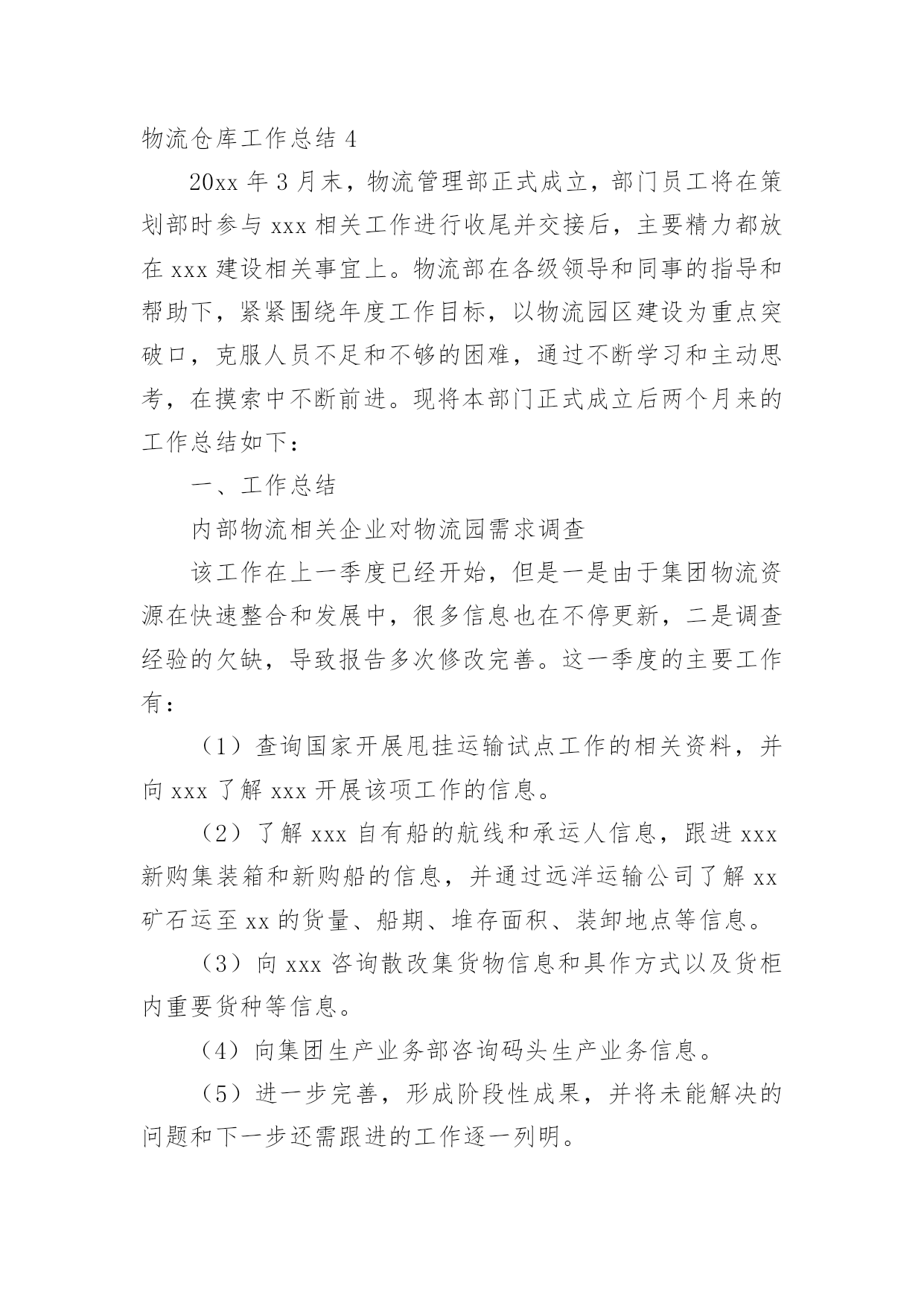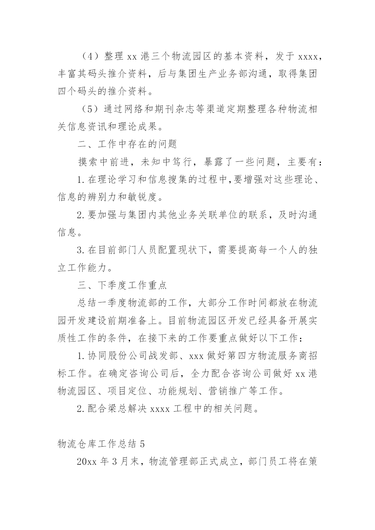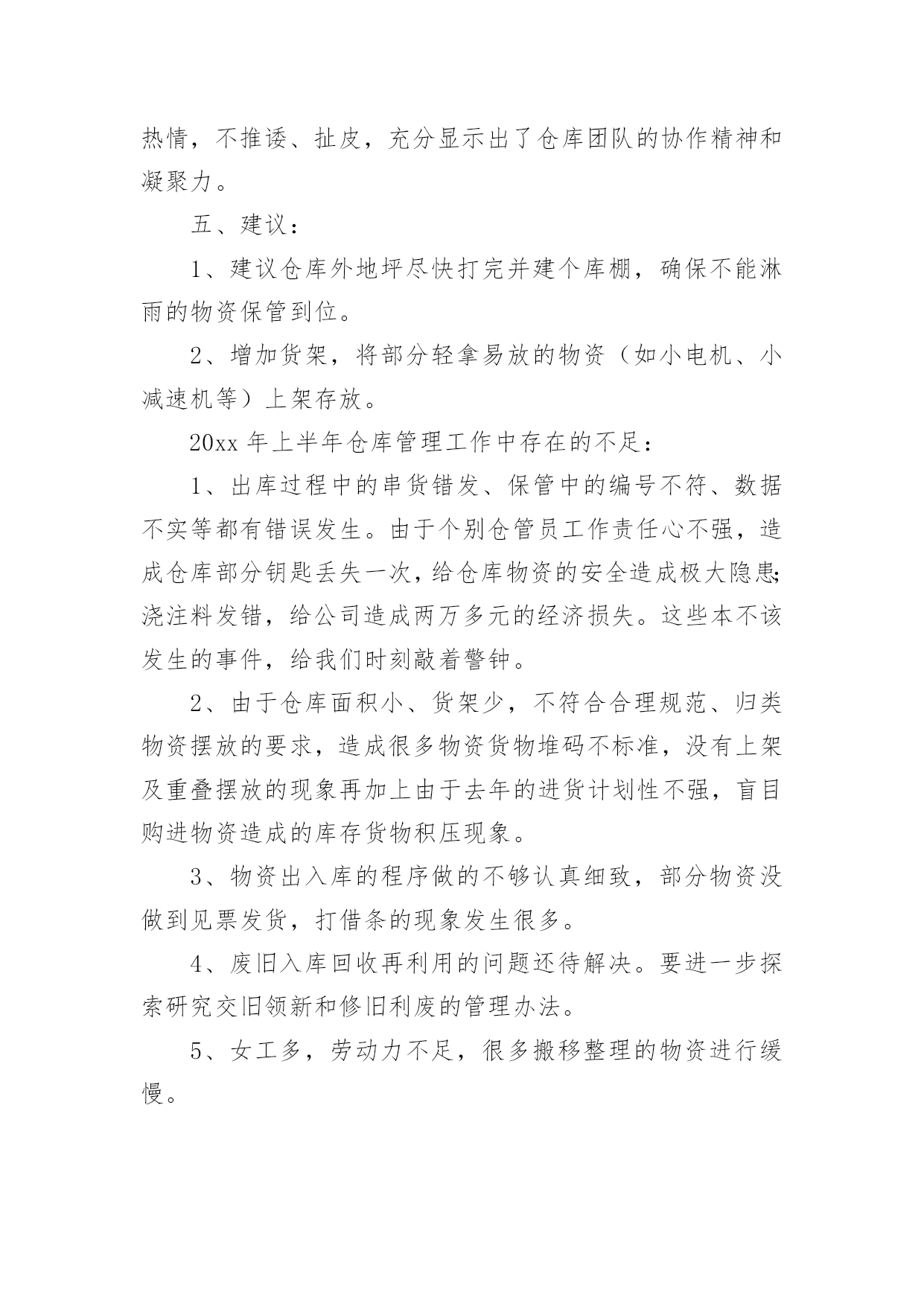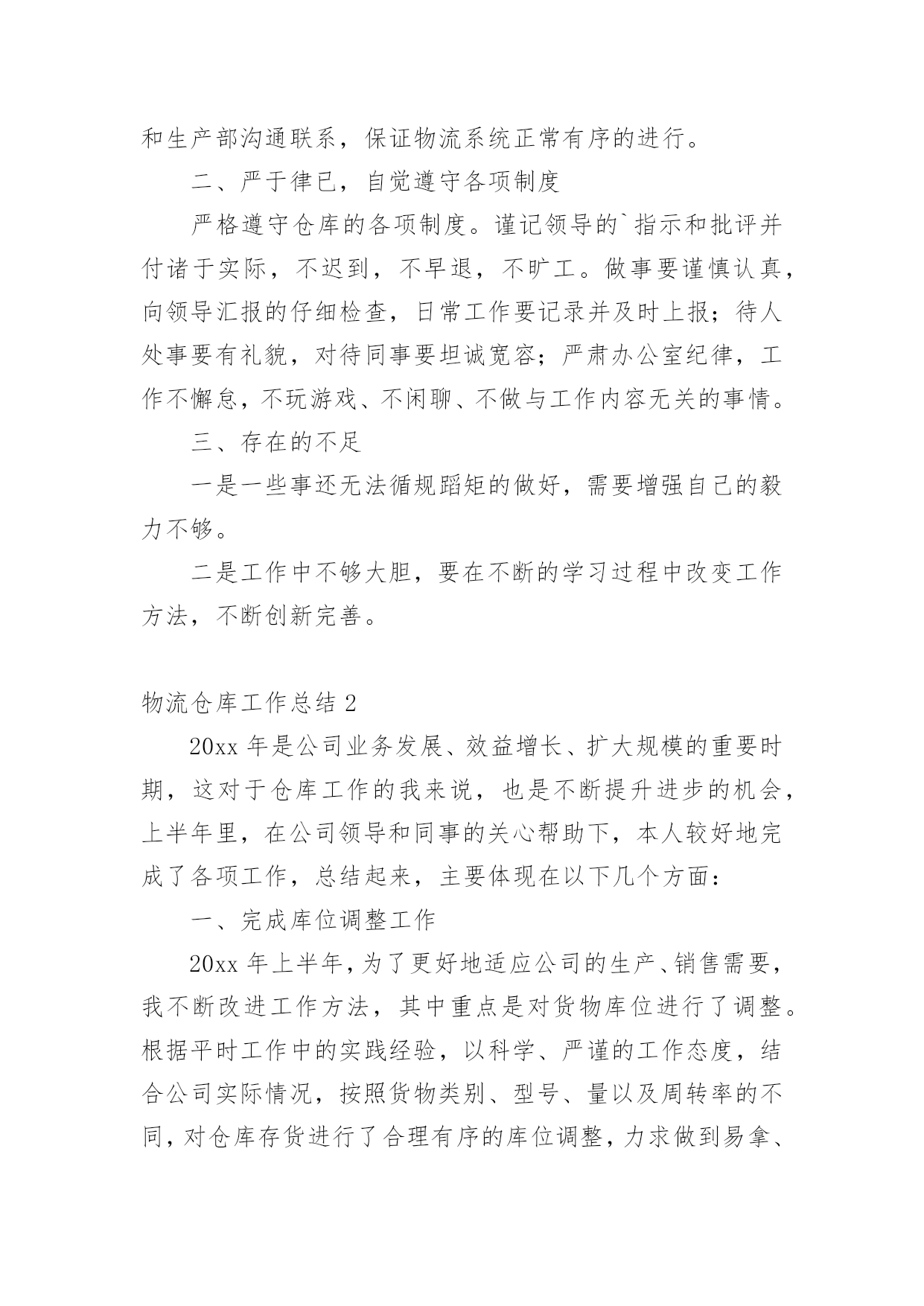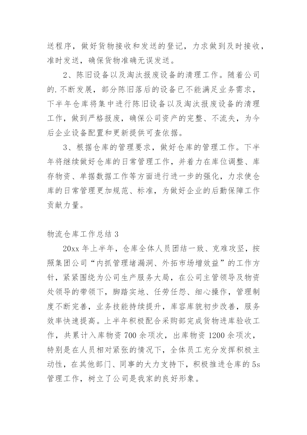 物流仓库工作总结总结是把一定阶段内的有关情况分析研究,做出有指导性的经验方法以及结论的书面材料,它可以明确下一步的工作方向,少走弯路,少犯错误,提高工作效益,为此我们要做好回顾,写好总结。我们该怎么去写总结呢?下面是小编收集整理的物流仓库工作总结,希望对大家有所帮助。物流仓库工作总结1光阴如梭,20xx年已过了半年,在这将近半年里我学到了很多,非常感谢公司提供给我一个成长的平台,让我在工作中不断的学习,不断的进步,慢慢的提升自身的素质和才能。回首过去的半年当中,公司陪伴我走过很重要的一个阶段,使我懂得了很多。在此我向公司尊敬的领导以及亲爱的同事们表示衷心的感谢,有你们的协助才能使我在工作中得心应手,也因有你们的帮助,才能令我在公司的发展上一个台阶。下面我将这半来的具体工作情况汇总如下:一、认认真真,做好本职工作。一是遵从仓库岗位职责,坚持做好出货工作,保证发货的准确无误,尽量完善工作以保证零投诉;二是做好入库接受,保证库存数据的准确,确保库存数据达到实实在在的百分百;三是完成二位领班临时安排的工作与积极参与整理工作,深化工作安全意识,提出各项合理化意见。及时与业务和生产部沟通联系,保证物流系统正常有序的进行。二、严于律已,自觉遵守各项制度严格遵守仓库的各项制度。谨记领导的`指示和批评并付诸于实际,不迟到,不早退,不旷工。做事要谨慎认真,向领导汇报的仔细检查,日常工作要记录并及时上报;待人处事要有礼貌,对待同事要坦诚宽容;严肃办公室纪律,工作不懈怠,不玩游戏、不闲聊、不做与工作内容无关的事情。三、存在的不足一是一些事还无法循规蹈矩的做好,需要增强自己的毅力不够。二是工作中不够大胆,要在不断的学习过程中改变工作方法,不断创新完善。物流仓库工作总结220xx年是公司业务发展、效益增长、扩大规模的重要时期,这对于仓库工作的我来说,也是不断提升进步的机会,上半年里,在公司领导和同事的关心帮助下,本人较好地完成了各项工作,总结起来,主要体现在以下几个方面:一、完成库位调整工作20xx年上半年,为了更好地适应公司的生产、销售需要,我不断改进工作方法,其中重点是对货物库位进行了调整。根据平时工作中的实践经验,以科学、严谨的工作态度,结合公司实际情况,按照货物类别、型号、量以及周转率的不同,对仓库存货进行了合理有序的库位调整,力求做到易拿、易放、易看、易点的堆积方式,坚持货物先进先出原则,加强了仓库货物的科学化管理。二、科学控制库存物资随着公司的不断发展,仓库来货数量也进一步增多,工作量也随之增大。在此基础上,我积极采取有效措施和科学的方法,努力探讨,让进入仓库的货物有序存放,力求做到使库存物资合理安排,货物不多占用库位,并尽可能满足各项目公司的生产需要。三、坚持学习,业务水平学习是进步的推动力。在上半年里,我在做好本职工作的同时,利用工余时间坚持学习,努力提高自身的综合能力和理论水平。并且,我积极钻研业务技术,经常与有经验的同事交流经验,互相学习、互相进步,共同探讨把仓库管理工作搞好的新方法、新技术。四、保持整洁的库容库貌库容库貌是仓库管理质量如何的最直观体现,如果保持不好,也会对存储物资造成不利影响。公司的仓库面积较大,周边环境较差,容易积累灰尘。因此,上半年我加强了仓库卫生的清理工作,坚持每天一次小检查,每周一次大检查,一经发现有积灰或凌乱现象,就及时整改。通过这样的方式,我基本上保持了公司仓库整洁有序的库容库貌,也为自己创造了良好的工作环境,使仓库达到可视化管理的要求。五、下半年工作计划1、主要是货物接收与发送。进一步完善货物接收及发送程序,做好货物接收和发送的登记,力求做到及时接收,准时发送,确保货物准确无误发送。2、陈旧设备以及淘汰报废设备的清理工作。随着公司的.不断发展,部分陈旧落后的设备已不能满足业务需求,下半年仓库将集中进行陈旧设备以及淘汰报废设备的清理工作,做到严格报废,确保公司资产的完整、不流失,为今后企业设备配置和更新提供可查依据。3、根据仓库的管理要求,做好仓库的管理工作。下半年将继续做好仓库的日常管理工作,并着力在库位调整、库存物资、单据数据工作等方面进行进一步的强化,力求使仓库的日常管理更加规范、标准,为做好企业的后勤保障工作贡献力量。物流仓库工作总结320xx年上半年,仓库全体人员团结一致、克难攻坚,按照集团公司“内抓管理堵漏洞、外拓市场增效益”的工作方针,紧紧围绕为公司生产服务大局,在公司主管领导及物资处领导的带领下,脚踏实地、任劳任怨、细心操作,管理制度不断完善,业务技能持续提升,库容库貌初步改善,服务效率快速提高。上半年积极配合采购部完成货物进库验收工作,共累计入库物资700余项次,出库物资1200余项次,特别是在人员相对紧张的情况下,全体员工充分发挥积极主动性,在其他部门、同事的大力支持下,积极推进仓
