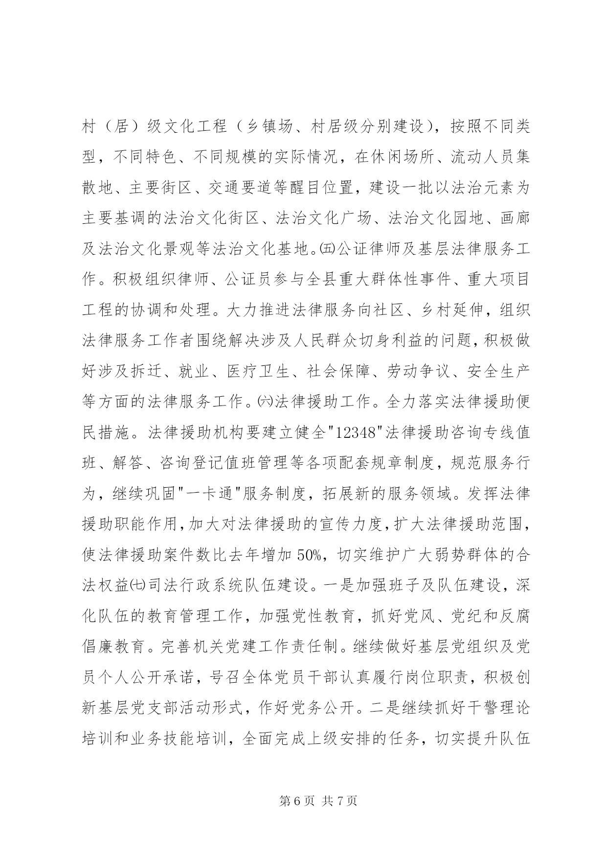 第PAGE\*Arabic\*MERGEFORMAT7页共NUMPAGES\*MERGEFORMAT7页乡镇司法局年度工作计划2015年,全县司法行政工作总的要求是:深入学习贯彻党的十八大精神,以邓小平理论、"三个代表"重要思想、科学发展观为指导,坚持融入中心、服务大局、服务群众,紧紧围绕推进平安阿克塞、和谐阿克塞和过硬队伍建设的总目标,求真务实,开拓创新,全面提高司法行政服务管理水平,为我县全面建成小康社会、率先基本实现现代化提供优质高效的法律服务和保障。重点做好以下几项工作:㈠人民调解不断推进。进一步加强专业性、行业性调委会建设。按照"四化要求"(调解组织正规化、调解队伍专业化、工作机制规范化、日常管理制度化)全面加强行业性专业调委会规范化建设。建立健全乡镇、村两级基层人民调解委员会;建立专业性人民调委会7个,人民调解员54人。一是重点建立协调协作机制,加强对调解组织之间的协作配合,实现资源共享,整体联动,健全联系会议制度、排查制度、联合调解制度、工作报告制度、回访制度、责任追究制度等,规范行业性、专业性领域矛盾纠纷调解程序和协议文书制作。二是全面贯彻《人民调解法》,推进人民调解组织、队伍、业务建设,加大基层矛盾纠纷调处信息采集力度。同时做好人民调解工作经验及典型案例的宣传报送工作。㈡社区矫正务实创新。一是规范社区矫正工作程序,创新工作机制。二是探索建立社区矫正基地、加强对社区服刑人员的教育矫正、监督管理和帮困扶助,进一步促进社区矫正工作制度化、规范化、法制化。三是加大对司法所助理员及社区矫正工作者的培训教育力度,着力提高其专业素质、服务水平。同时加大对社区矫正志愿者相关知识培训,提高志愿者的工作热情和积极性。四是加强社区矫正工作宣传力度,营造良好的社会氛围。要动员社会各方面力量,利用各种载体,积极向社会、广大群众进行宣传,加强社区矫正和政策的宣传普及,使广大群众成为社区矫正工作的重要支持力量。五是继续推进"能管住、可转化"有效工作机制,防止脱管、漏管,避免重新犯罪。㈢安置帮教重在帮扶。一是加强过渡性安置帮教基地、社会帮教志愿者协会、职业技能培训基地建设。二是建立健全安置帮教工作激励机制,落实安帮工作责任制,将其纳入社会治安综合治理考核指标,奖优罚劣。三是从制度上保障安置帮教经费的落实,一直以来,工作经费落实不到位,严重制约了安置帮教工作的开展,必须强化安置帮教工作的财政保障。四是要加大安置帮教工作宣传力度,发现和培育典型经验,营造开展安置帮教工作的良好氛围。即注重发现和培育开展安置帮教工作的典型经验,及时总结并加以推广;注重对那些回归社会后走向勤劳致富、奉献社会的刑释解教人员的典型事例进行总结和宣传。㈣提升普法依法治理工作水平,营造良好的法治氛围。1、深入学习宣传宪法和中国特色社会主义法律体系。坚持把学习宪法放在首位,深入学习宣传宪法的基本原则和基本精神,深入学习宣传中国特色社会主义法律体系形成的重大意义和基本构成,深入学习宣传国家基本法律的主要内容,扎实开展社会主义法治理念教育和公民意识教育,引导党员干部和人民群众牢固树立党的领导、依法治国、执法为民、公平正义、服务大局的理念。充分发挥法律在经济社会发展中的规范、引导和保障作用,增强各级政府机关和各类社会组织依法办事意识,努力化解社会矛盾,维护社会和谐稳定,进一步形成全社会人人学法尊法守法用法和依法行政、公正司法的社会环境。2.深入学习宣传与加强和创新社会管理相关的法律法规。围绕加强和创新社会管理,深入开展维护国家安全、社会稳定、促进民族团结相关法律法规的学习宣传,深入开展社会管理、维权、信访、投诉、调解、突发事件应对等相关法律法规的学习宣传,引导群众依法参与社会管理、依法表达利益诉求、依法解决矛盾纠纷3.深入学习宣传与保障和改善民生以及反腐倡廉相关的法律法规。围绕各族群众关心关注的热点、难点问题,深入学习宣传与城市建设、土地征收、收入分配、社会保障、安全生产、医疗卫生、食品安全和社会救助等相关的法律法规,深入开展《公务员法》、《行政监察法》、《审计法》和《中国共产党党员领导干部廉洁从政若干准则》等相关法律法规和党纪条规的学习宣传,把反腐倡廉法制宣传教育与政治理论教育、理想信念教育、职业道德教育、党的优良传统和作风教育相结合,充分发挥各类廉政、法制教育基地的作用,不断提高各级领导干部和公务员廉洁自律的自觉性。4.抓好领导干部法制宣传教育。充分发挥领导干部学法用法带头作用,结合典型案例,加强对领导干部和国家机关工作人员的法治培训,以领导干部结合实际讲法、接受监督守法、以身作则用法、改进方式考法,努力增强领导干部用法治思维、法治方式,深化改革、推进发展、化解矛盾、维护稳定的能力。5.抓好青少年法制宣传教育工作。继续抓好法制教育向学科渗透试点工作,总