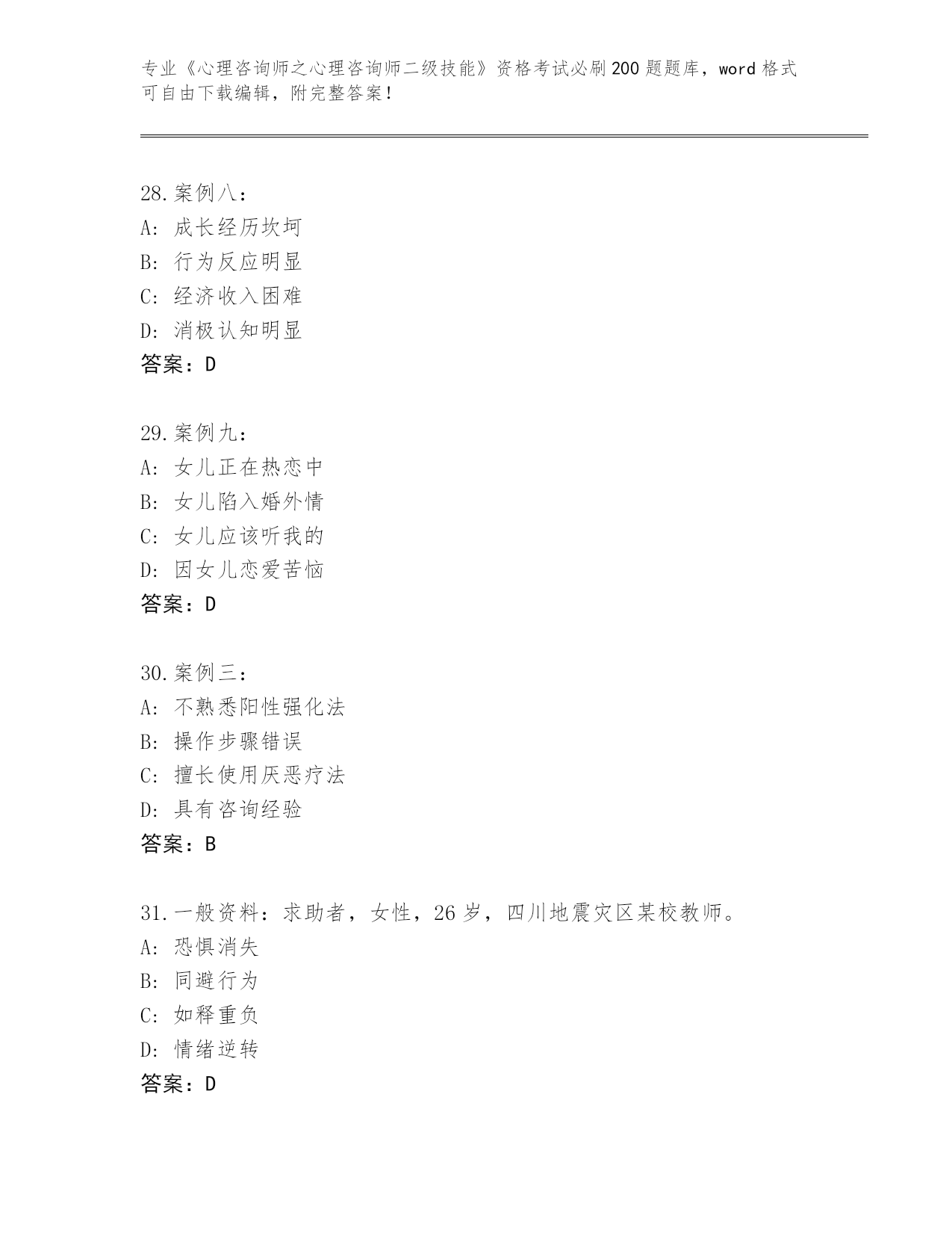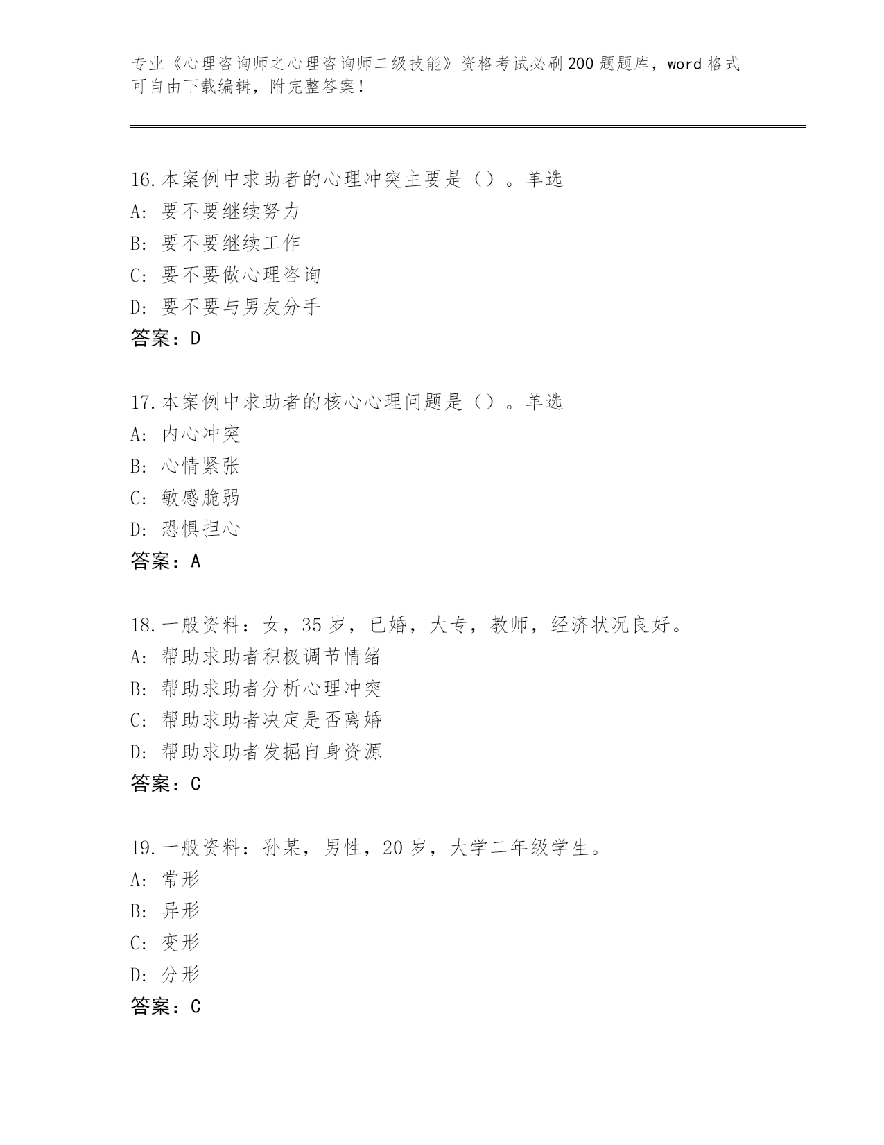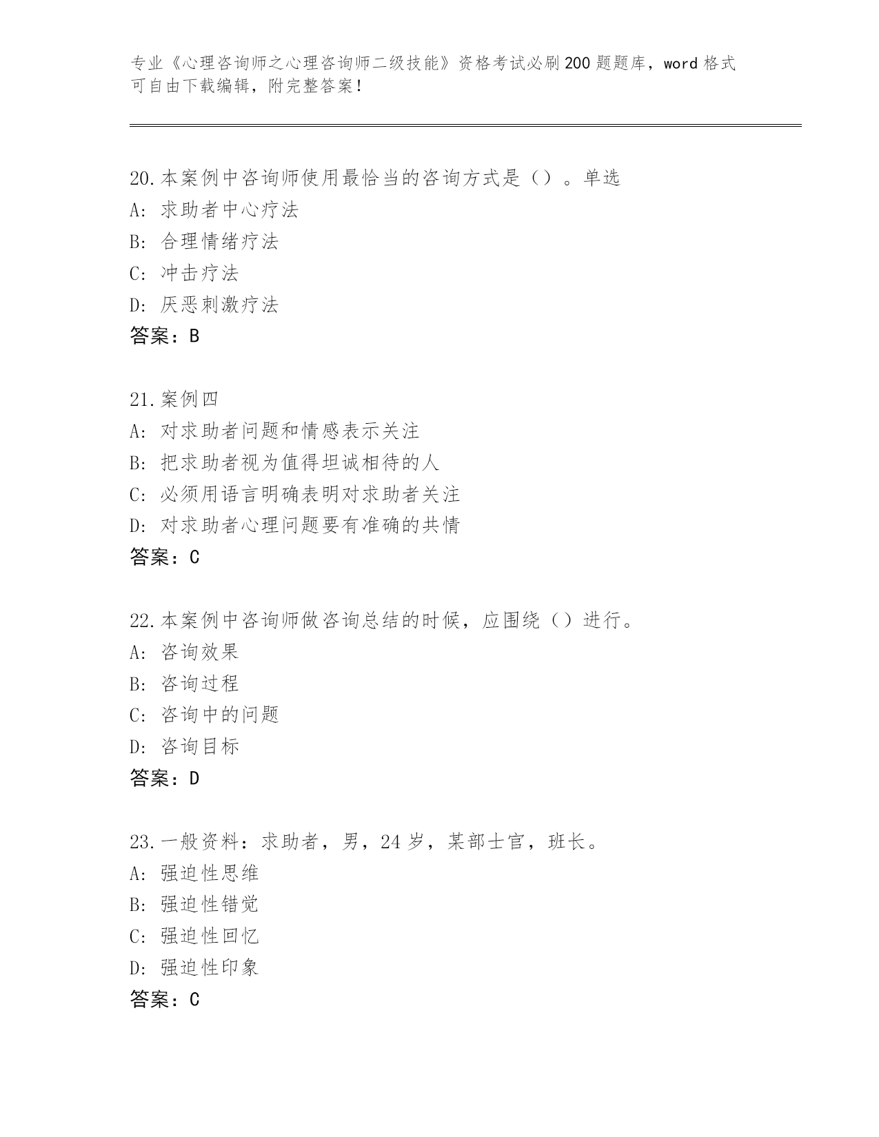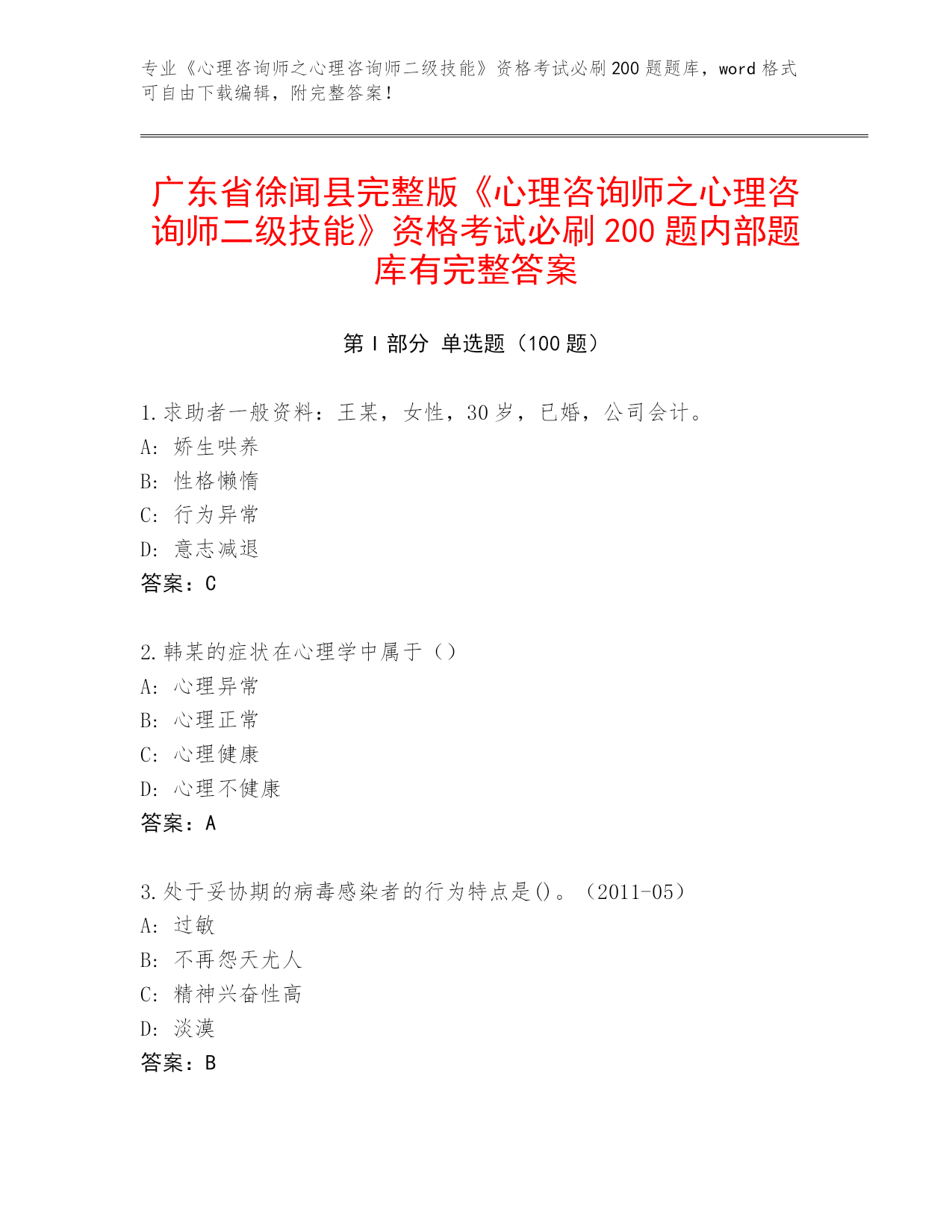 广东省徐闻县完整版《心理咨询师之心理咨询师二级技能》资格考试必刷200题内部题库有完整答案