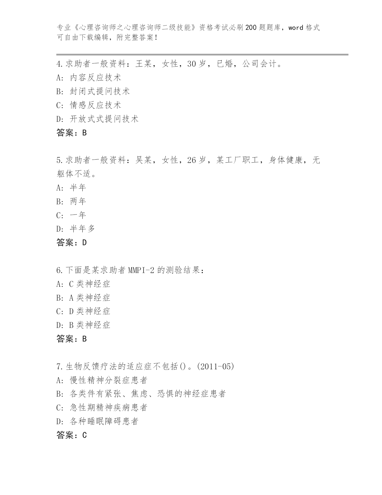 广东省徐闻县内部使用《心理咨询师之心理咨询师二级技能》考试必刷200题加答案