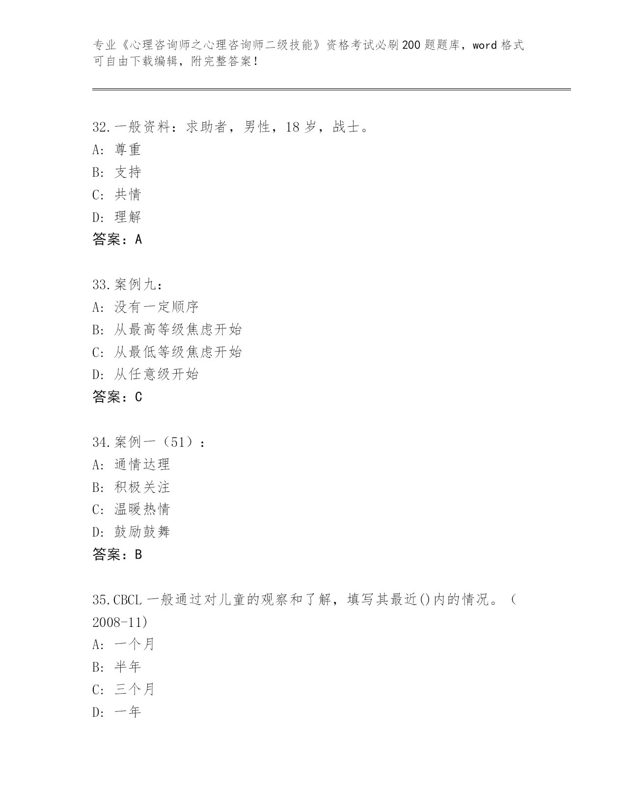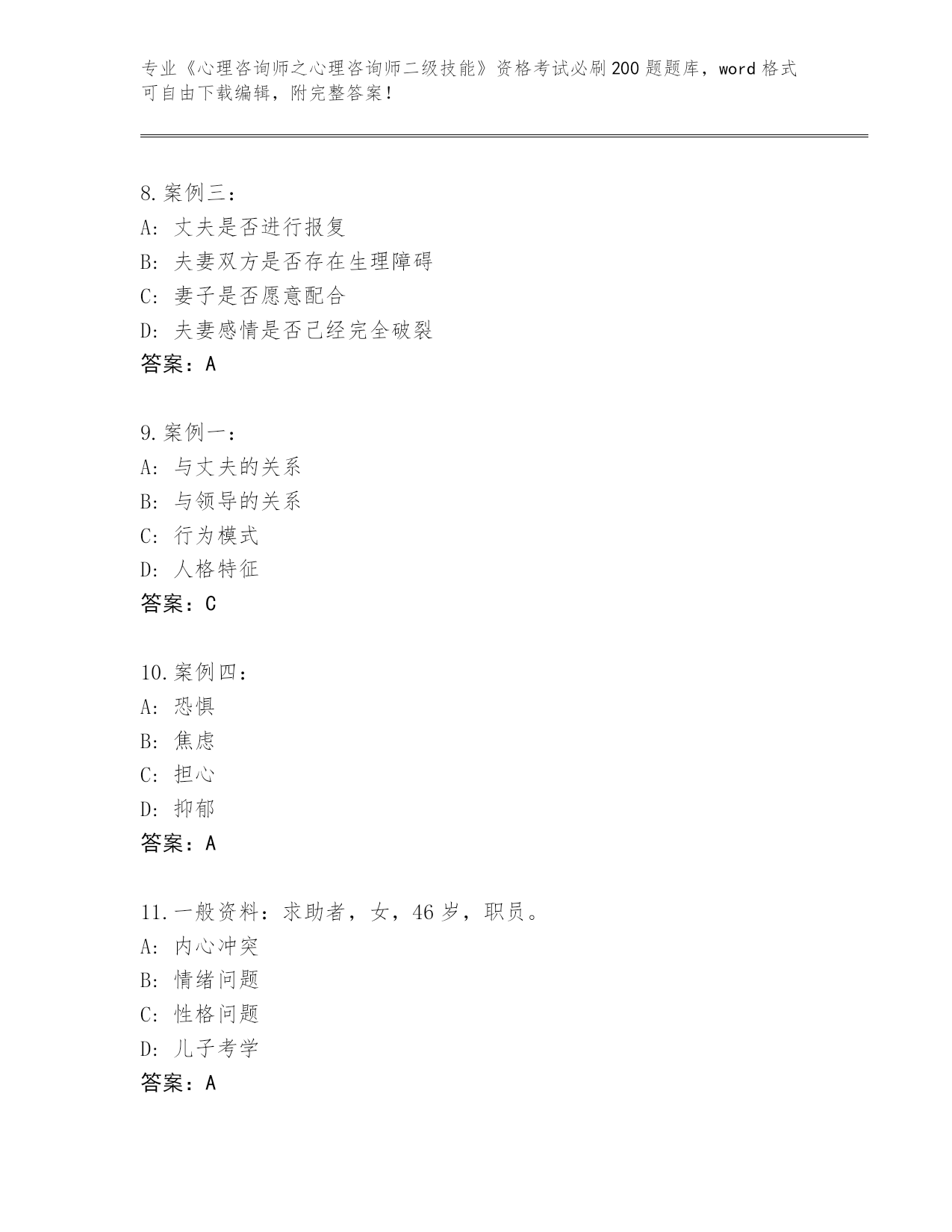 广东省内部使用《心理咨询师之心理咨询师二级技能》资格考试必刷200题内部题库附参考答案(完整版)