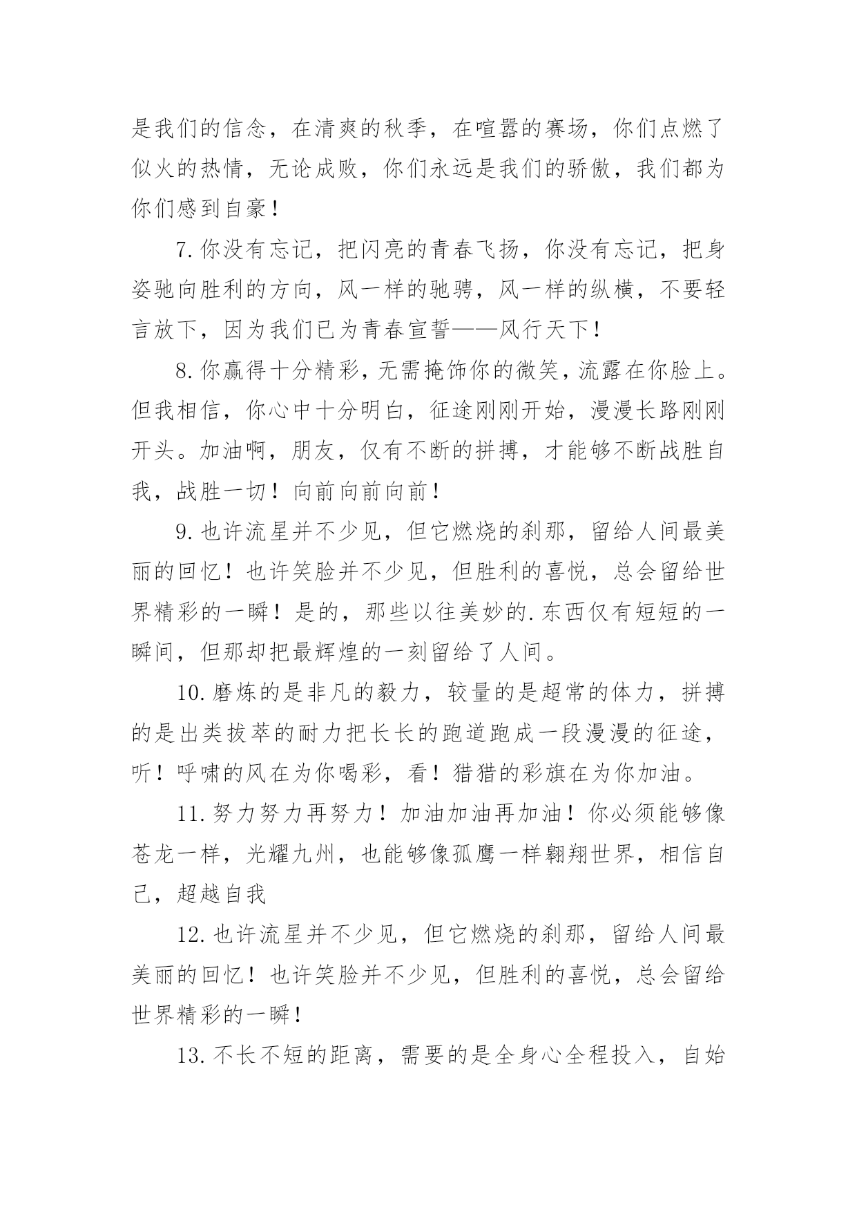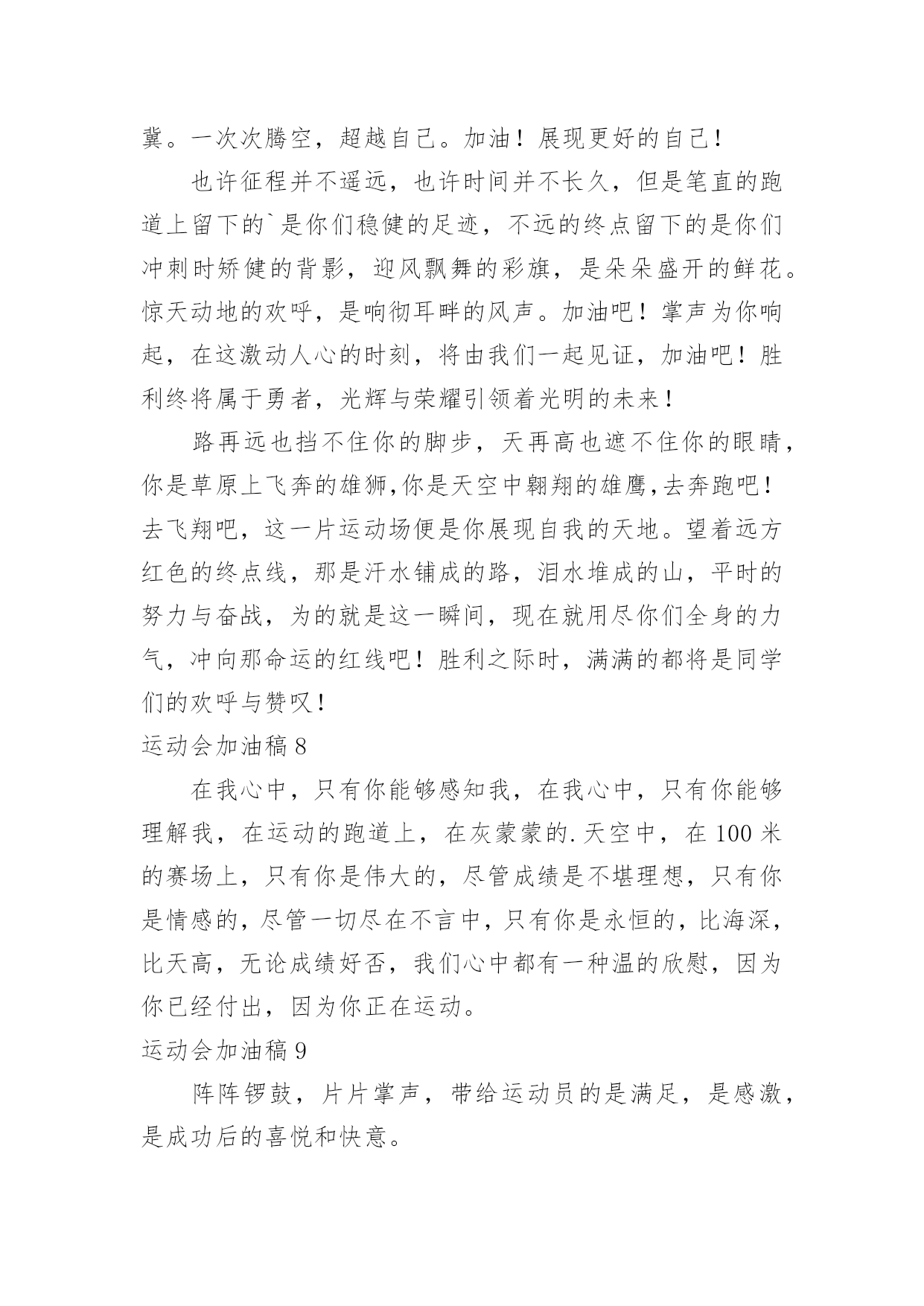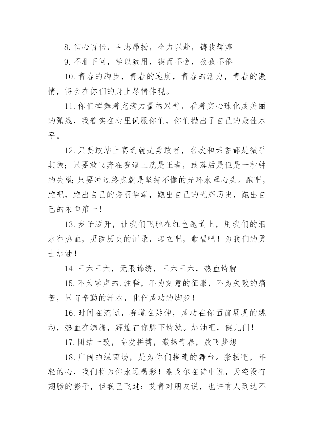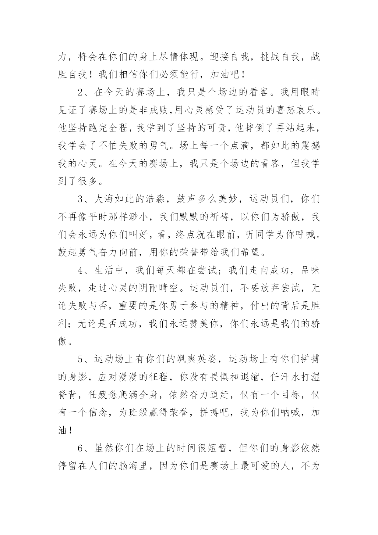 运动会加油稿运动会加油稿在社会发展不断提速的今天,越来越多人会去使用加油稿,加油稿可以强化人们的自我认知,给予人正向的激励作用。写起加油稿来就毫无头绪?以下是小编帮大家整理的运动会加油稿,仅供参考,欢迎大家阅读。运动会加油稿1曾经你很失意;曾经你很彷徨,失意的你没有信心;彷徨的`你没有目标,你好担心;我们好心疼,但踏上运动场的那一刻,你变了,你找到了自己的使命与重任,你拥有了自信和自强,你说:既然来了,就努力奋斗,载誉而归,我有实力;好样的,你是对的,我们永远支持你,心儿为你跳动;青春为你骄傲。加油!运动会加油稿2运动会不仅是比赛,更是一种精神,一种拼搏和坚持的精神,让我们一起为他们加油!在比赛中,每一位运动员都在全力以赴,为自己和团队争取更好的成绩,让我们为他们喝彩!每一个运动员都有自己的特点和优势,发挥出来,一定会有惊人的`表现,让我们为他们加油!运动会是一个检验实力和毅力的场所,让我们一起为参赛选手们加油,为他们助威!不管是个人项目还是团体项目,我们都要团结一心,齐心协力,共同为胜利而努力,让我们为他们加油!在比赛中,只有全力以赴,才能取得的成绩,让我们一起为参赛选手们加油,为他们打气!运动会加油稿31.不为鲜花的围绕,不为刹那的荣耀,只有执着的信念,化作不停的奔跑,心中燃烧着梦想,脚下不停的步伐。2.真彩青春,活力焕发,勤俭有度,为梦奋发3.信息信息,码农苦逼,修个电脑,开机关机。4.踏上跑道,是一种选择。离开起点,是一种勇气。驰骋赛场,是一种胜利。5.人生的路,有坦途,也有坎坷;做过的岁月,有欢笑,也有苦涩,泪水告诉我一个跌倒的故事,汗水使我多了一份沉重,几多成熟。6.何谓光辉?在生命最无奈时,迸发出最强大的力量。何谓光辉?在身体承受重大力量下,仍然向前。何谓光辉?用上自己全部力量,创出一个新的纪录。何谓光辉?拼搏就是光辉,努力就是光辉。何谓光辉?运动员们就是光辉!为什么?因为他们努力过,奋斗过,付出过!7.时间在流逝,赛道在延伸,成功在你面前展现心脏的跳动,热血在沸腾,辉煌在你脚下铸就加油吧,健儿们。8.信心百倍,斗志昂扬,全力以赴,铸我辉煌9.不耻下问,学以致用,锲而不舍,孜孜不倦10.青春的脚步,青春的速度,青春的活力,青春的激情,将会在你们的身上尽情体现。11.你们挥舞着充满力量的双臂,看着实心球化成美丽的弧线,我着实在心里佩服你们,你们抛出了自己的最佳水平。12.只要敢站上赛道就是勇敢者,名次和荣誉都是微乎其微;只要敢飞奔在赛道上就是王者,或落后是但是一秒钟的失望;只要冲过终点就是坚持不懈的光环永罩心头。跑吧,跑吧,跑出自己的秀丽华章,跑出自己的光辉历史,跑出自己的永恒第一!13.步子迈开,让我们飞驰在红色跑道上,用我们的泪水和热血,更改历史的记录,起立吧,歌唱吧!为我们的勇士加油!14.三六三六,无限锦绣,三六三六,热血铸就15.不为掌声的.注释,不为刻意的征服,不为失败的痛苦,只有辛勤的汗水,化作成功的脚步!16.时间在流逝,赛道在延伸,成功在你面前展现的跳动,热血在沸腾,辉煌在你脚下铸就。加油吧,健儿们!17.团结一致,奋发拼搏,激扬青春,放飞梦想18.广阔的绿茵场,是为你们搭建的舞台。张扬吧,年轻的心,我们将为你永远喝彩!泰戈尔在诗中说,天空没有翅膀的影子,但我已飞过;艾青对朋友说,也许有人到达不了彼岸,但我们共同拥有大海。也许你们没有显赫的成绩,但运动场上留下了你们的足迹。也许你们没有奖品,但我们心中留下了你们拼搏的身影。所有的努力都是为了迎接这一刹那,所有的拼搏都是为了这一声令下。运动会加油稿41.今日的你们英姿飒爽,今日的你们朝气蓬勃,今日的你们一马当先。相信自己,你是最棒的!不要放弃,不要气馁。成功永远属于你们。米运动员啊!加油啊。2.看!那一面面迎风飘舞的彩旗,是一朵朵盛开的鲜花;听!那一阵阵惊天动地的欢呼,是回响在耳边胜利的风声。运动场上的你们,是胜利的标志,运动场上的你们,是青春的赞叹。去吧!去迎接那伟大的挑战,去吧!去做一名追风的少年。3.心中坚定的信念,脚下沉稳的步伐,你用行动告诉我们一个不变之理,没有走不完的路,没有过不了的山,成功正在终点冲着你高高的招手,用你那顽强的意志去努力,去迎接终点的鲜花与掌声,相信成功必属于你。4.大海如此的浩淼,鼓声多么美妙,运动员们,你们不再像平时那样渺小,我们默默的祈祷,以你们为骄傲,我们会永远为你们叫好5.坚定,执着,耐力与期望,在延伸的白色跑道中点点凝聚!力量,信念,拼搏与奋斗,在遥远的终点线上渐渐明亮!时代的强音正在你的脚下踏响。6.超越对手,更要超越自我,追求卓越是我们的目标,是我们的信念,在清爽的秋季,在喧嚣的赛场,你们点燃了似火的热情,无论成败,你们永远是我们的骄傲,我们都为你们感到自豪!7.你没有忘记,把闪亮的青春飞扬,你没有忘