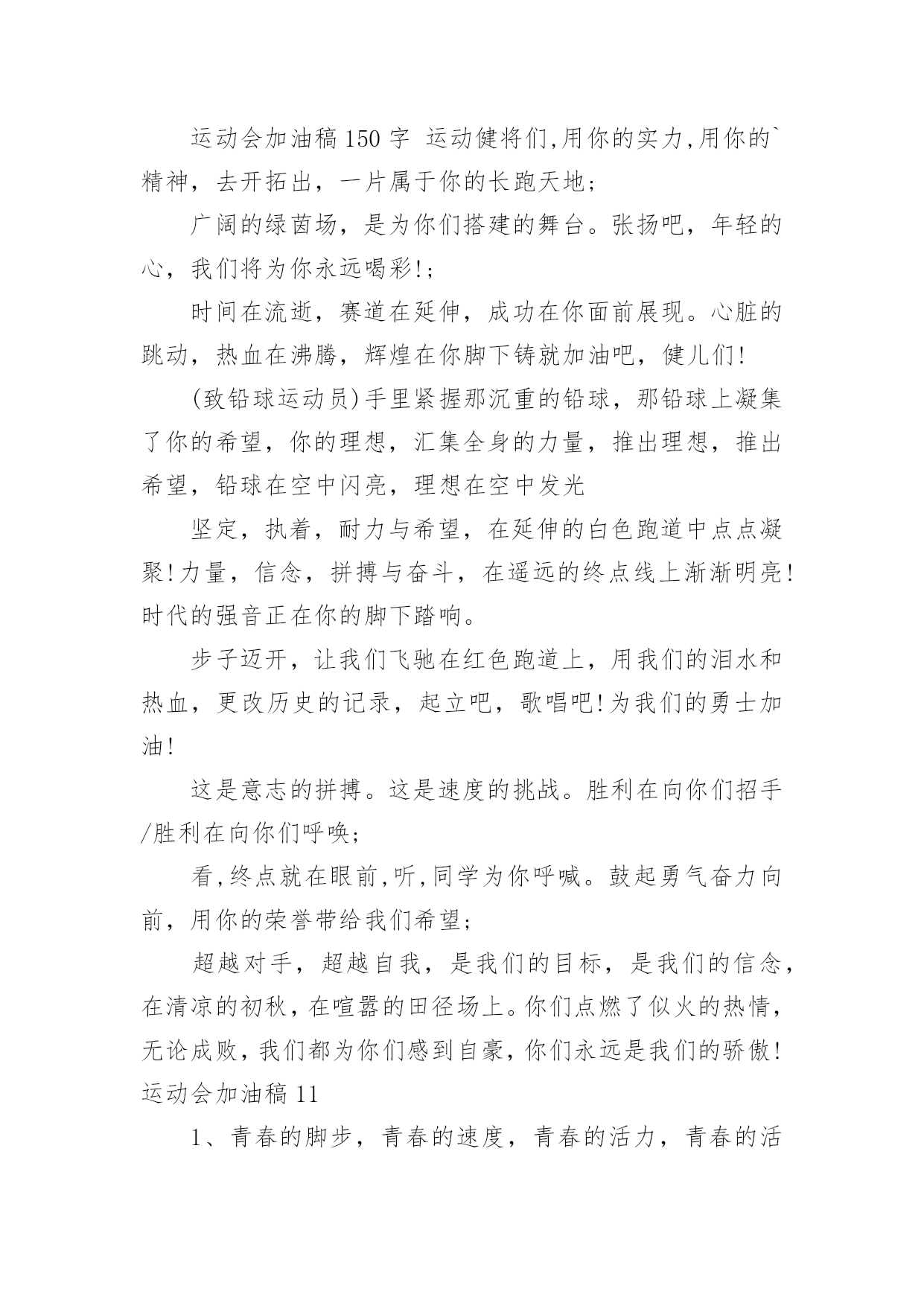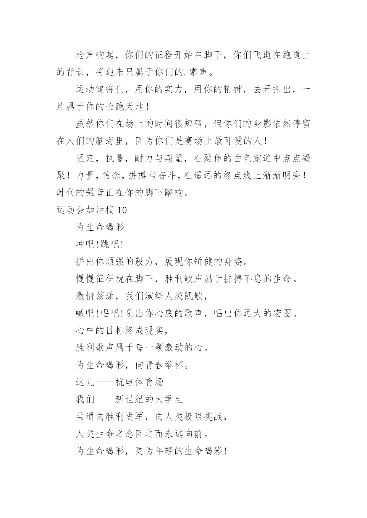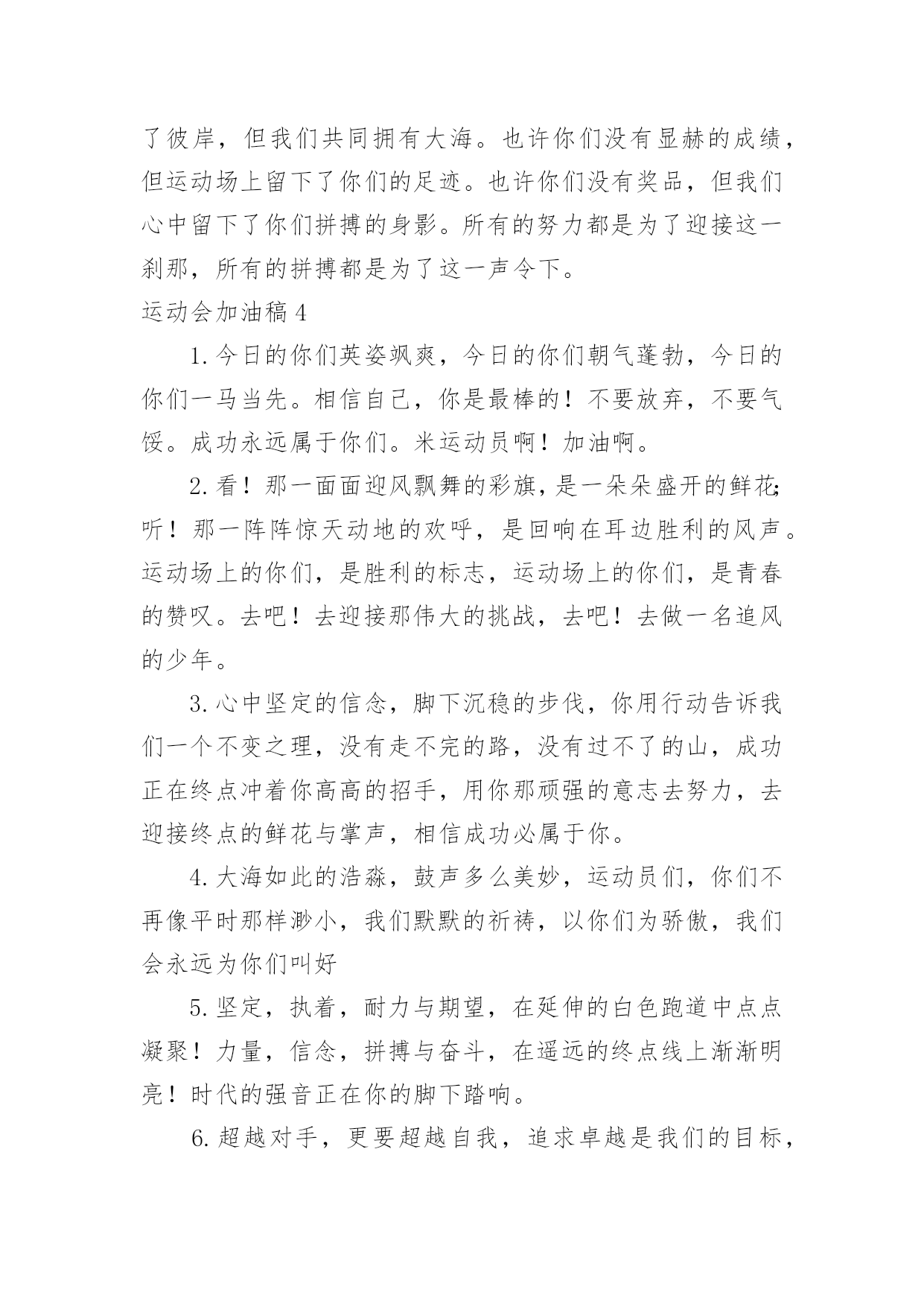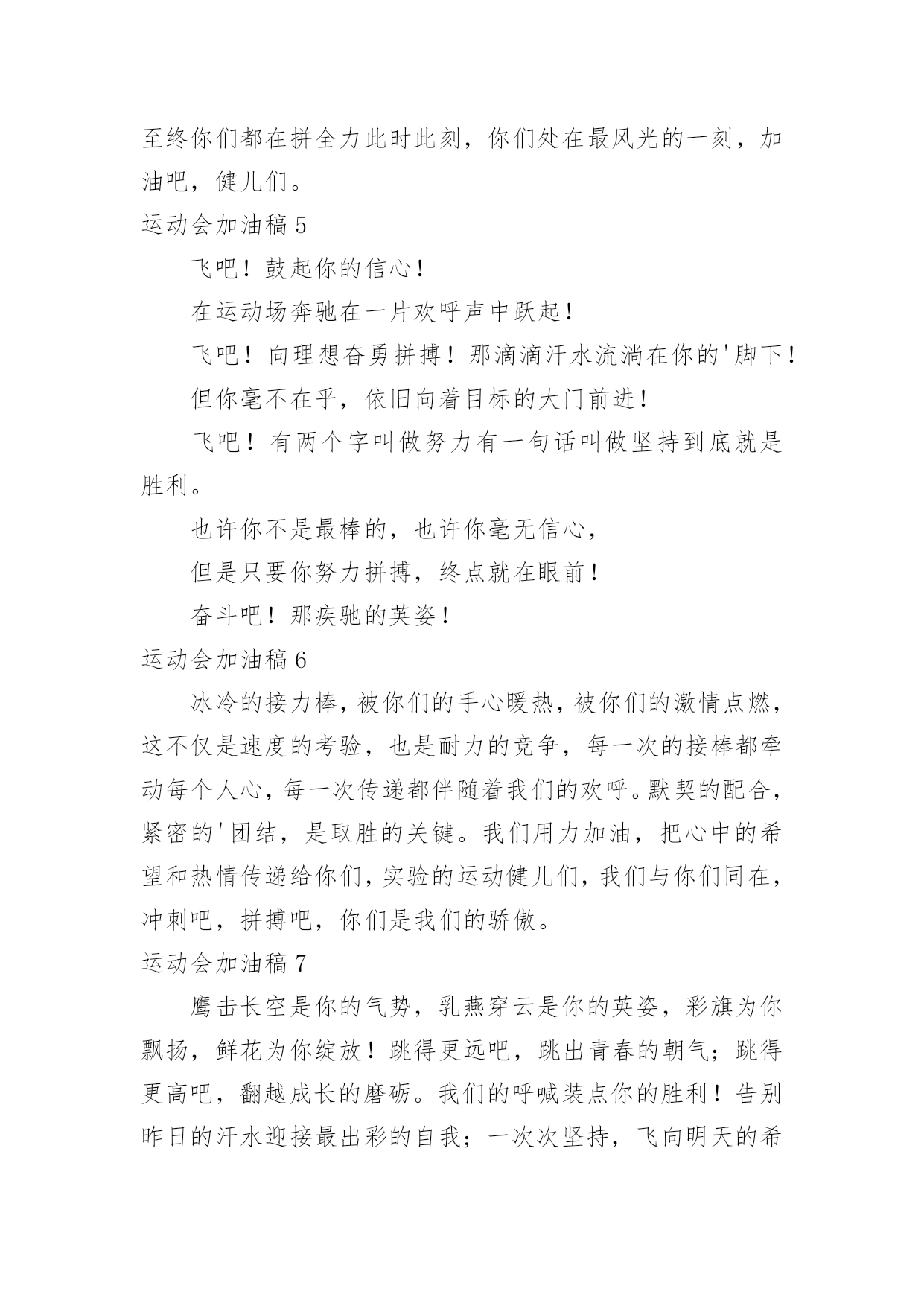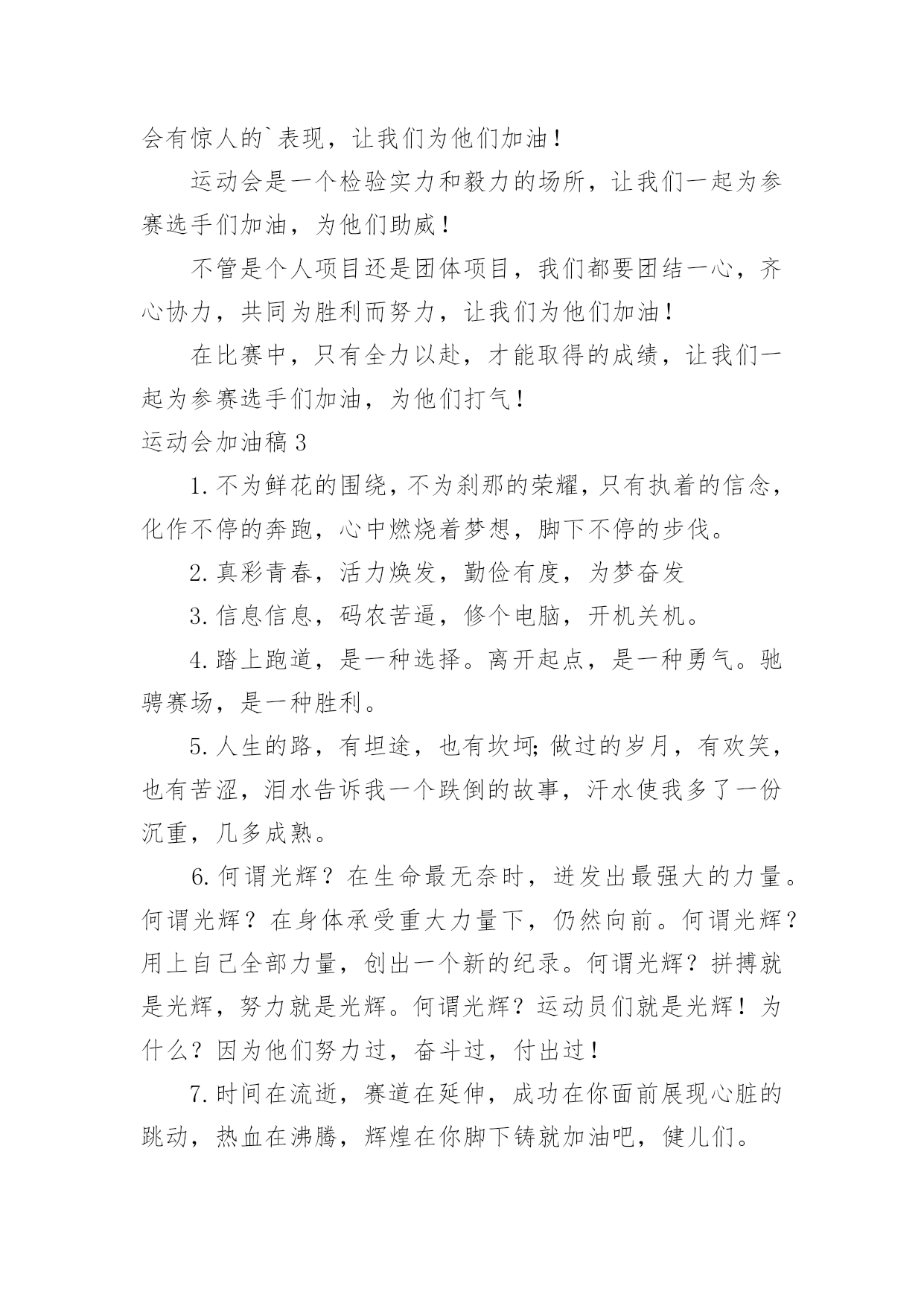 运动会加油稿运动会加油稿在社会发展不断提速的今天,越来越多人会去使用加油稿,加油稿可以强化人们的自我认知,给予人正向的激励作用。写起加油稿来就毫无头绪?以下是小编帮大家整理的运动会加油稿,仅供参考,欢迎大家阅读。运动会加油稿1曾经你很失意;曾经你很彷徨,失意的你没有信心;彷徨的`你没有目标,你好担心;我们好心疼,但踏上运动场的那一刻,你变了,你找到了自己的使命与重任,你拥有了自信和自强,你说:既然来了,就努力奋斗,载誉而归,我有实力;好样的,你是对的,我们永远支持你,心儿为你跳动;青春为你骄傲。加油!运动会加油稿2运动会不仅是比赛,更是一种精神,一种拼搏和坚持的精神,让我们一起为他们加油!在比赛中,每一位运动员都在全力以赴,为自己和团队争取更好的成绩,让我们为他们喝彩!每一个运动员都有自己的特点和优势,发挥出来,一定会有惊人的`表现,让我们为他们加油!运动会是一个检验实力和毅力的场所,让我们一起为参赛选手们加油,为他们助威!不管是个人项目还是团体项目,我们都要团结一心,齐心协力,共同为胜利而努力,让我们为他们加油!在比赛中,只有全力以赴,才能取得的成绩,让我们一起为参赛选手们加油,为他们打气!运动会加油稿31.不为鲜花的围绕,不为刹那的荣耀,只有执着的信念,化作不停的奔跑,心中燃烧着梦想,脚下不停的步伐。2.真彩青春,活力焕发,勤俭有度,为梦奋发3.信息信息,码农苦逼,修个电脑,开机关机。4.踏上跑道,是一种选择。离开起点,是一种勇气。驰骋赛场,是一种胜利。5.人生的路,有坦途,也有坎坷;做过的岁月,有欢笑,也有苦涩,泪水告诉我一个跌倒的故事,汗水使我多了一份沉重,几多成熟。6.何谓光辉?在生命最无奈时,迸发出最强大的力量。何谓光辉?在身体承受重大力量下,仍然向前。何谓光辉?用上自己全部力量,创出一个新的纪录。何谓光辉?拼搏就是光辉,努力就是光辉。何谓光辉?运动员们就是光辉!为什么?因为他们努力过,奋斗过,付出过!7.时间在流逝,赛道在延伸,成功在你面前展现心脏的跳动,热血在沸腾,辉煌在你脚下铸就加油吧,健儿们。8.信心百倍,斗志昂扬,全力以赴,铸我辉煌9.不耻下问,学以致用,锲而不舍,孜孜不倦10.青春的脚步,青春的速度,青春的活力,青春的激情,将会在你们的身上尽情体现。11.你们挥舞着充满力量的双臂,看着实心球化成美丽的弧线,我着实在心里佩服你们,你们抛出了自己的最佳水平。12.只要敢站上赛道就是勇敢者,名次和荣誉都是微乎其微;只要敢飞奔在赛道上就是王者,或落后是但是一秒钟的失望;只要冲过终点就是坚持不懈的光环永罩心头。跑吧,跑吧,跑出自己的秀丽华章,跑出自己的光辉历史,跑出自己的永恒第一!13.步子迈开,让我们飞驰在红色跑道上,用我们的泪水和热血,更改历史的记录,起立吧,歌唱吧!为我们的勇士加油!14.三六三六,无限锦绣,三六三六,热血铸就15.不为掌声的.注释,不为刻意的征服,不为失败的痛苦,只有辛勤的汗水,化作成功的脚步!16.时间在流逝,赛道在延伸,成功在你面前展现的跳动,热血在沸腾,辉煌在你脚下铸就。加油吧,健儿们!17.团结一致,奋发拼搏,激扬青春,放飞梦想18.广阔的绿茵场,是为你们搭建的舞台。张扬吧,年轻的心,我们将为你永远喝彩!泰戈尔在诗中说,天空没有翅膀的影子,但我已飞过;艾青对朋友说,也许有人到达不了彼岸,但我们共同拥有大海。也许你们没有显赫的成绩,但运动场上留下了你们的足迹。也许你们没有奖品,但我们心中留下了你们拼搏的身影。所有的努力都是为了迎接这一刹那,所有的拼搏都是为了这一声令下。运动会加油稿41.今日的你们英姿飒爽,今日的你们朝气蓬勃,今日的你们一马当先。相信自己,你是最棒的!不要放弃,不要气馁。成功永远属于你们。米运动员啊!加油啊。2.看!那一面面迎风飘舞的彩旗,是一朵朵盛开的鲜花;听!那一阵阵惊天动地的欢呼,是回响在耳边胜利的风声。运动场上的你们,是胜利的标志,运动场上的你们,是青春的赞叹。去吧!去迎接那伟大的挑战,去吧!去做一名追风的少年。3.心中坚定的信念,脚下沉稳的步伐,你用行动告诉我们一个不变之理,没有走不完的路,没有过不了的山,成功正在终点冲着你高高的招手,用你那顽强的意志去努力,去迎接终点的鲜花与掌声,相信成功必属于你。4.大海如此的浩淼,鼓声多么美妙,运动员们,你们不再像平时那样渺小,我们默默的祈祷,以你们为骄傲,我们会永远为你们叫好5.坚定,执着,耐力与期望,在延伸的白色跑道中点点凝聚!力量,信念,拼搏与奋斗,在遥远的终点线上渐渐明亮!时代的强音正在你的脚下踏响。6.超越对手,更要超越自我,追求卓越是我们的目标,是我们的信念,在清爽的秋季,在喧嚣的赛场,你们点燃了似火的热情,无论成败,你们永远是我们的骄傲,我们都为你们感到自豪!7.你没有忘记,把闪亮的青春飞扬,你没有忘
