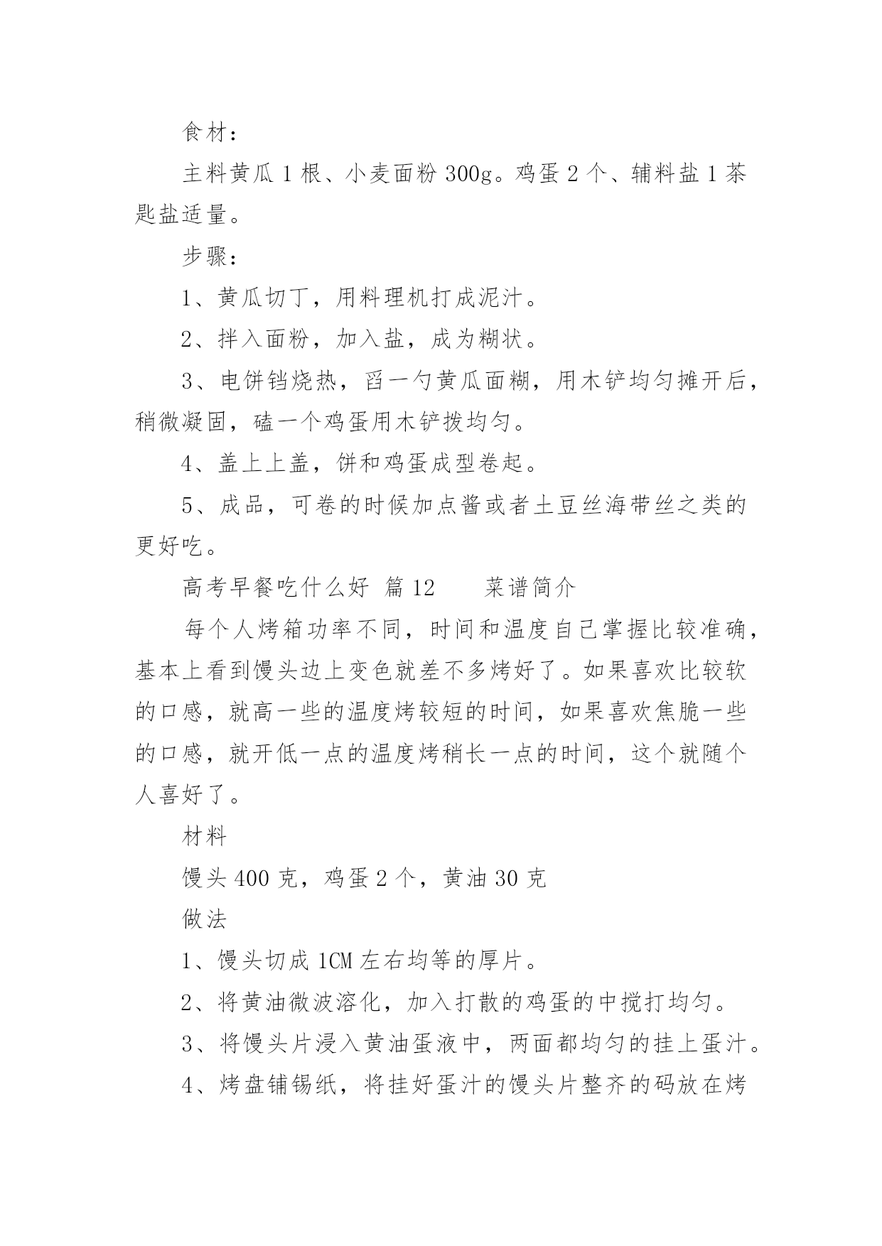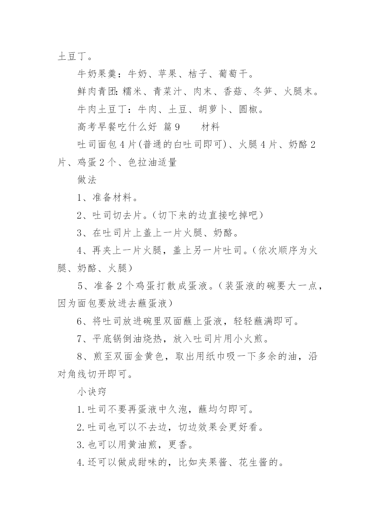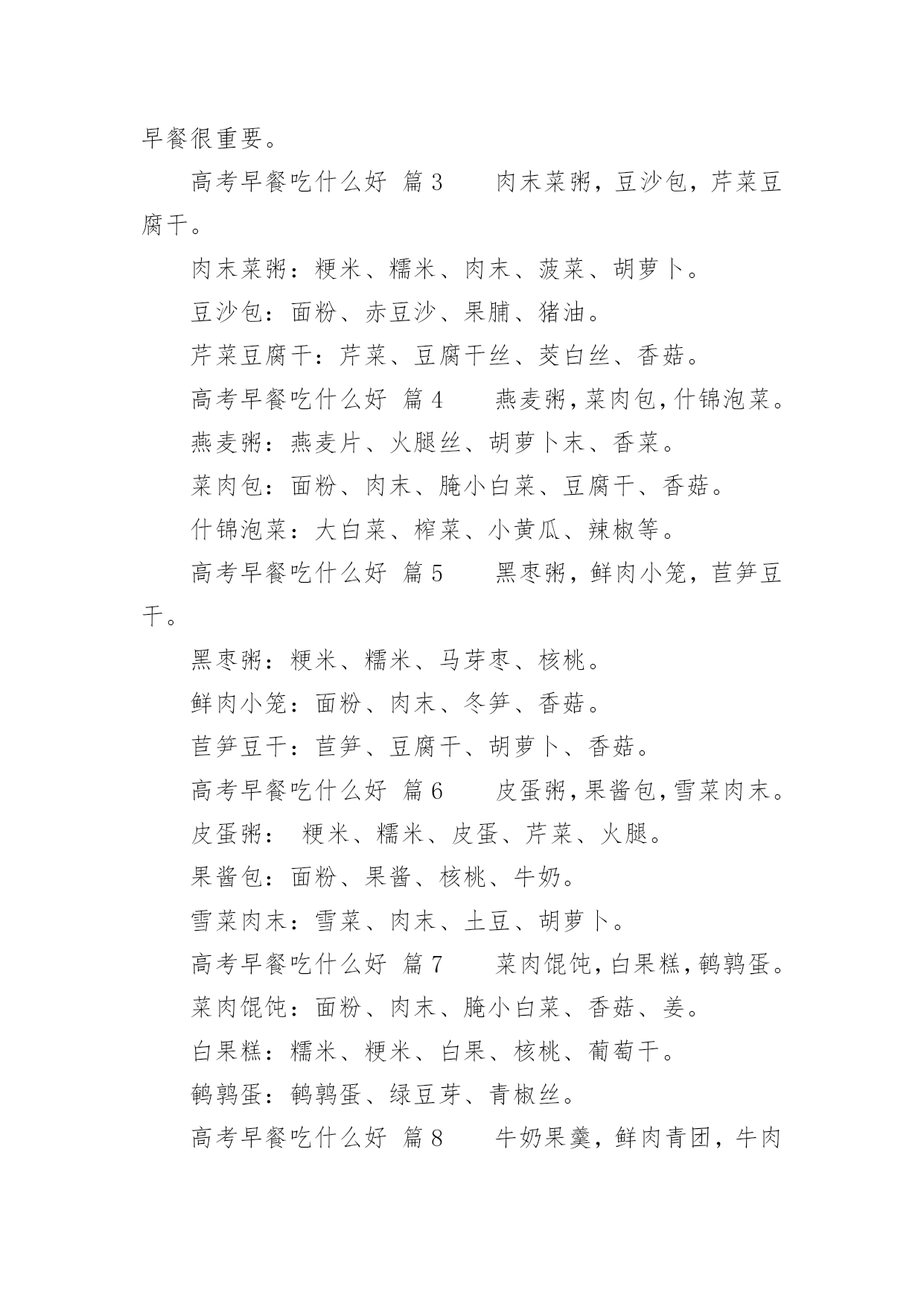 高考早餐吃什么好高考早餐吃什么好(精选12篇)导语:俗话说早餐要吃得好、午餐要吃得饱、晚餐要吃得少,尤其是高考将至,饮食方面尤为重要。早上起床需要营养物质充实,为大脑的思考提供源源不断的动力。高考饮食是父母最为关心的时期,那么高考早餐吃什么好?天百分网小编为您介绍高考早餐食谱大全(最营养)。复习劳累之余可别忽略了吃早餐哦!高考早餐吃什么好篇1高考吃早餐补充血糖稳定起床后活动30分钟再吃早餐最为适宜,因为这时人的食欲最旺盛。早餐不但要注意数量,而且还要讲究质量,因为早餐的质量直接影响考试发挥。据其分析,高考饮食中早餐吃不好,考生容易在高度紧张的情况下在短时间内产生饥饿感,从而分散注意力。早餐的组合搭配中碳水化合物和蛋白质都要有,而且最好吃复合型的碳水化合物,它们可使血糖比较稳定。高考吃早餐需要哪些营养食物?早餐应含有鸡蛋、脱脂牛奶、酸奶和粮食制品,比如:粥、燕麦片、全麦面包、果汁、几片面包夹一个煎鸡蛋,配一点西红柿、黄瓜或其他水果等,也可以喝一些诸如核桃粉、黑芝麻糊等,不仅可以调剂口味,还可以抵抗因高度紧张的学习所造成的脑疲劳。早餐中,如果淀粉食物、高蛋白质食物和蔬菜水果三类食物齐备,就是合格的早餐了。如果再加上一小把坚果仁,就是优质的早餐了。至于早餐是中式还是西式,并不那么讲究,只要营养充足又能吃得舒服就可以。高考早餐吃什么好篇2高考早餐吃什么好:皮蛋粥,果酱包,雪菜肉末。主要成分:1.皮蛋粥:粳米、糯米、皮蛋、芹菜、火腿。2.果酱包:面粉、果酱、核桃、牛奶。3.雪菜肉末:雪菜、肉末、土豆、胡萝卜。高考早餐吃什么好:黑枣粥,鲜肉小笼,苣笋豆干。主要成分:1.黑枣粥:粳米、糯米、马芽枣、核桃。2.鲜肉小笼:面粉、肉末、冬笋、香菇。3.苣笋豆干:苣笋、豆腐干、胡萝卜、香菇。高考早餐吃什么好:菜肉馄饨,白果糕,鹌鹑蛋。主要成分:1.菜肉馄饨:面粉、肉末、腌小白菜、香菇、姜。2.白果糕:糯米、粳米、白果、核桃、葡萄干。3.鹌鹑蛋:鹌鹑蛋、绿豆芽、青椒丝。高考早餐吃什么好::燕麦粥,菜肉包,什锦泡菜。主要成分:1.燕麦粥:燕麦片、火腿丝、胡萝卜末、香菜。2.菜肉包:面粉、肉末、腌小白菜、豆腐干、香菇。3.什锦泡菜:大白菜、榨菜、小黄瓜、辣椒等。我们知道,考试之前需要侧重营养补充,蓄积能量,而考试当日则要侧重能量保证,精力充沛,而早餐就是考试当日保证能量的重中之重。经过一夜的新陈代谢,早晨人体血糖处于一天中的较低水平,如果早餐不能保证充足的热量摄入,就会影响到大脑功能及其他身体功能,所以考试当天的早餐很重要。高考早餐吃什么好篇3肉末菜粥,豆沙包,芹菜豆腐干。肉末菜粥:粳米、糯米、肉末、菠菜、胡萝卜。豆沙包:面粉、赤豆沙、果脯、猪油。芹菜豆腐干:芹菜、豆腐干丝、茭白丝、香菇。高考早餐吃什么好篇4燕麦粥,菜肉包,什锦泡菜。燕麦粥:燕麦片、火腿丝、胡萝卜末、香菜。菜肉包:面粉、肉末、腌小白菜、豆腐干、香菇。什锦泡菜:大白菜、榨菜、小黄瓜、辣椒等。高考早餐吃什么好篇5黑枣粥,鲜肉小笼,苣笋豆干。黑枣粥:粳米、糯米、马芽枣、核桃。鲜肉小笼:面粉、肉末、冬笋、香菇。苣笋豆干:苣笋、豆腐干、胡萝卜、香菇。高考早餐吃什么好篇6皮蛋粥,果酱包,雪菜肉末。皮蛋粥:粳米、糯米、皮蛋、芹菜、火腿。果酱包:面粉、果酱、核桃、牛奶。雪菜肉末:雪菜、肉末、土豆、胡萝卜。高考早餐吃什么好篇7菜肉馄饨,白果糕,鹌鹑蛋。菜肉馄饨:面粉、肉末、腌小白菜、香菇、姜。白果糕:糯米、粳米、白果、核桃、葡萄干。鹌鹑蛋:鹌鹑蛋、绿豆芽、青椒丝。高考早餐吃什么好篇8牛奶果羹,鲜肉青团,牛肉土豆丁。牛奶果羹:牛奶、苹果、桔子、葡萄干。鲜肉青团:糯米、青菜汁、肉末、香菇、冬笋、火腿末。牛肉土豆丁:牛肉、土豆、胡萝卜、圆椒。高考早餐吃什么好篇9材料吐司面包4片(普通的白吐司即可)、火腿4片、奶酪2片、鸡蛋2个、色拉油适量做法1、准备材料。2、吐司切去片。(切下来的边直接吃掉吧)3、在吐司片上盖上一片火腿、奶酪。4、再夹上一片火腿,盖上另一片吐司。(依次顺序为火腿、奶酪、火腿)5、准备2个鸡蛋打散成蛋液。(装蛋液的碗要大一点,因为面包要放进去蘸蛋液)6、将吐司放进碗里双面蘸上蛋液,轻轻蘸满即可。7、平底锅倒油烧热,放入吐司片用小火煎。8、煎至双面金黄色,取出用纸巾吸一下多余的油,沿对角线切开即可。小诀窍1.吐司不要再蛋液中久泡,蘸均匀即可。2.吐司也可以不去边,切边效果会更好看。3.也可以用黄油煎,更香。4.还可以做成甜味的,比如夹果酱、花生酱的。高考早餐吃什么好篇10一、营养早餐:营养最关键早餐中的碳水化合物一定要充足,蛋白质和脂肪则要适量。早餐能量和各种营养素的供给量应占全日供给量的30%左右。推荐食谱:鲜牛奶一杯,煮鸡蛋一个,鲜肉包一个,蔬菜沙拉一份(生菜、青椒、小西红柿、豆芽、洋葱等