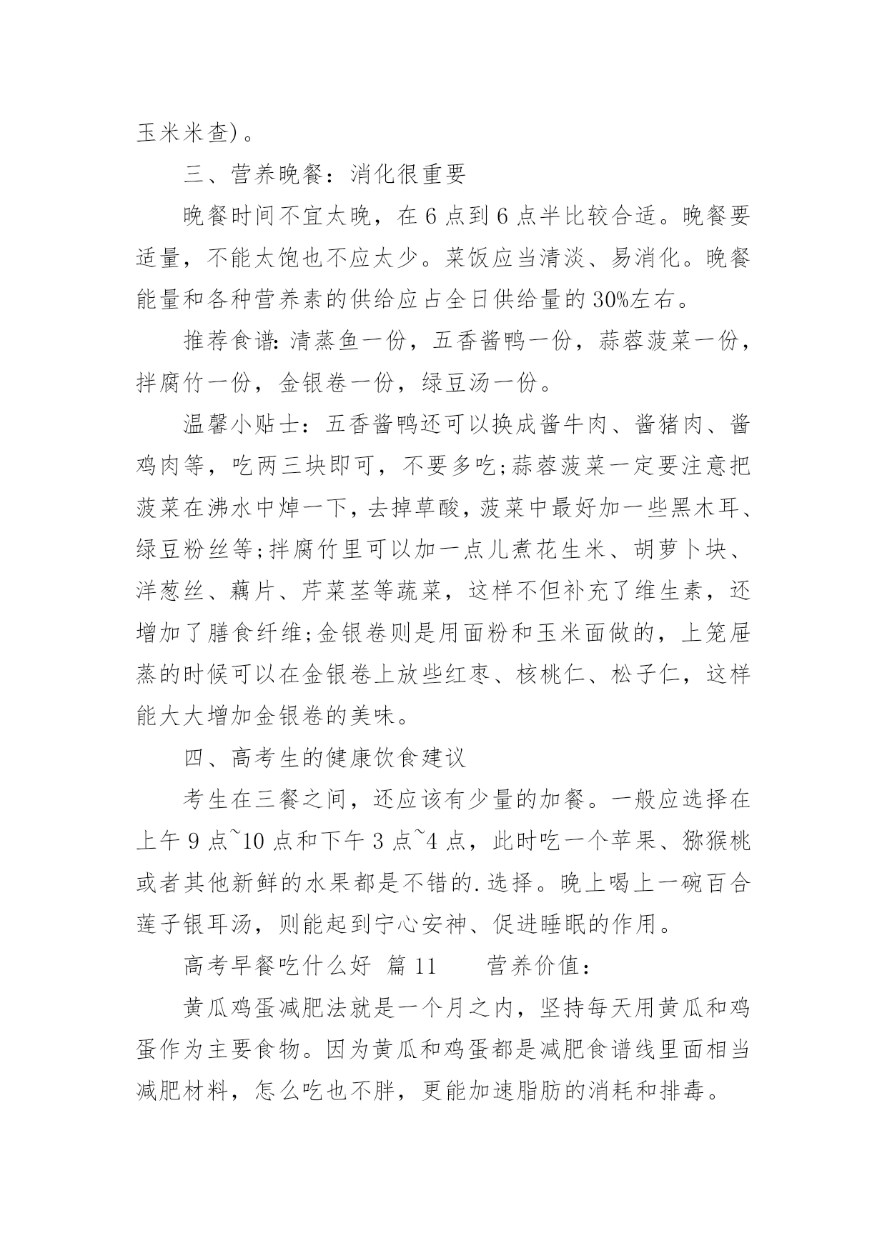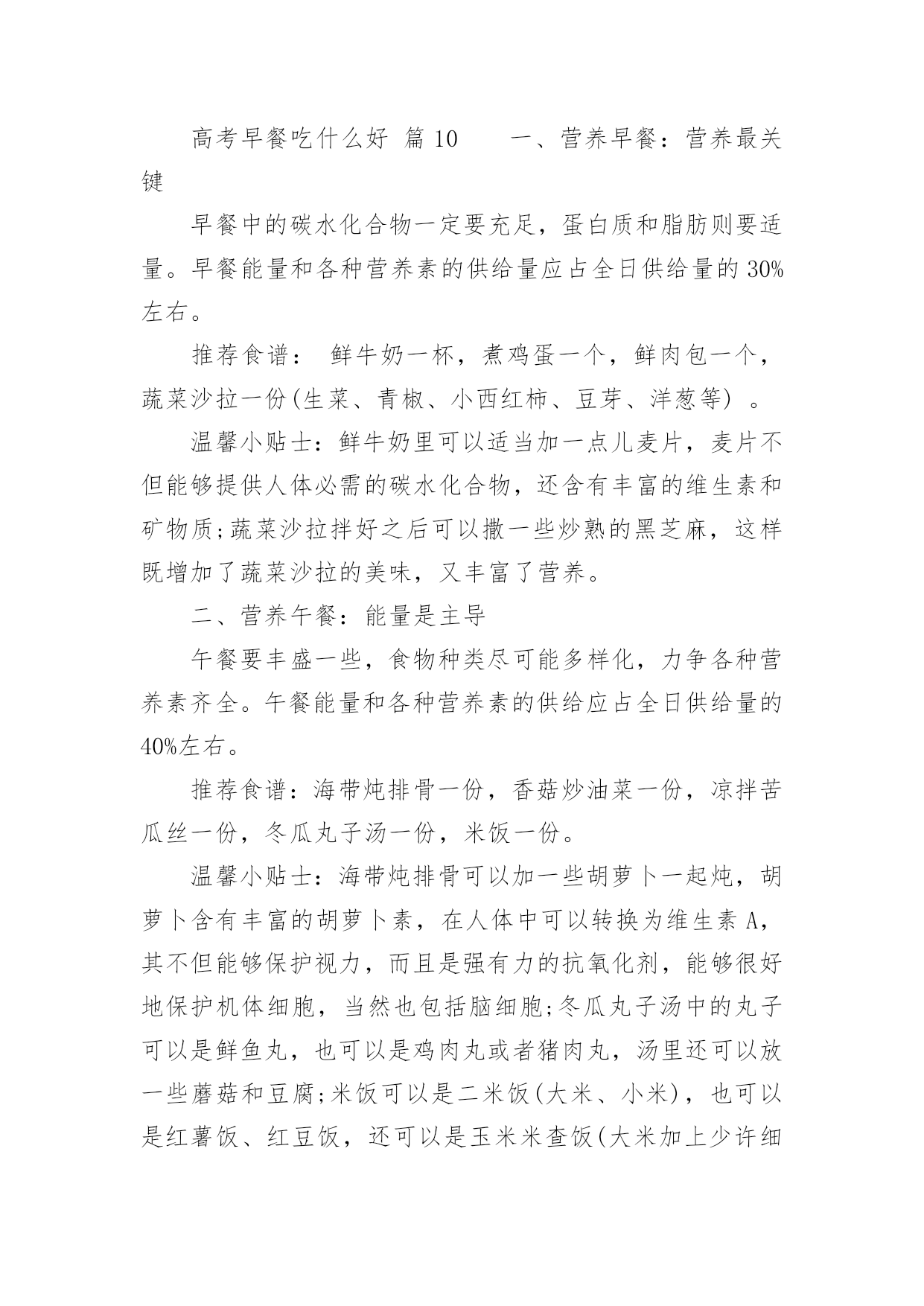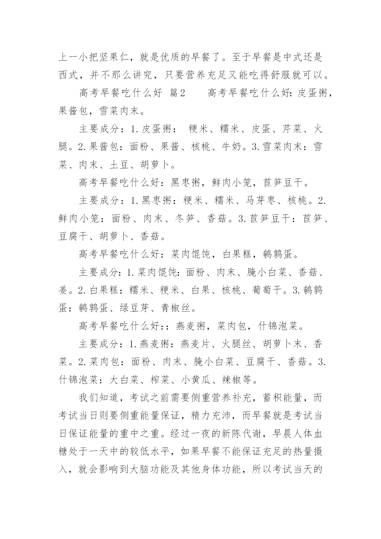 高考早餐吃什么好高考早餐吃什么好(精选12篇)导语:俗话说早餐要吃得好、午餐要吃得饱、晚餐要吃得少,尤其是高考将至,饮食方面尤为重要。早上起床需要营养物质充实,为大脑的思考提供源源不断的动力。高考饮食是父母最为关心的时期,那么高考早餐吃什么好?天百分网小编为您介绍高考早餐食谱大全(最营养)。复习劳累之余可别忽略了吃早餐哦!高考早餐吃什么好篇1高考吃早餐补充血糖稳定起床后活动30分钟再吃早餐最为适宜,因为这时人的食欲最旺盛。早餐不但要注意数量,而且还要讲究质量,因为早餐的质量直接影响考试发挥。据其分析,高考饮食中早餐吃不好,考生容易在高度紧张的情况下在短时间内产生饥饿感,从而分散注意力。早餐的组合搭配中碳水化合物和蛋白质都要有,而且最好吃复合型的碳水化合物,它们可使血糖比较稳定。高考吃早餐需要哪些营养食物?早餐应含有鸡蛋、脱脂牛奶、酸奶和粮食制品,比如:粥、燕麦片、全麦面包、果汁、几片面包夹一个煎鸡蛋,配一点西红柿、黄瓜或其他水果等,也可以喝一些诸如核桃粉、黑芝麻糊等,不仅可以调剂口味,还可以抵抗因高度紧张的学习所造成的脑疲劳。早餐中,如果淀粉食物、高蛋白质食物和蔬菜水果三类食物齐备,就是合格的早餐了。如果再加上一小把坚果仁,就是优质的早餐了。至于早餐是中式还是西式,并不那么讲究,只要营养充足又能吃得舒服就可以。高考早餐吃什么好篇2高考早餐吃什么好:皮蛋粥,果酱包,雪菜肉末。主要成分:1.皮蛋粥:粳米、糯米、皮蛋、芹菜、火腿。2.果酱包:面粉、果酱、核桃、牛奶。3.雪菜肉末:雪菜、肉末、土豆、胡萝卜。高考早餐吃什么好:黑枣粥,鲜肉小笼,苣笋豆干。主要成分:1.黑枣粥:粳米、糯米、马芽枣、核桃。2.鲜肉小笼:面粉、肉末、冬笋、香菇。3.苣笋豆干:苣笋、豆腐干、胡萝卜、香菇。高考早餐吃什么好:菜肉馄饨,白果糕,鹌鹑蛋。主要成分:1.菜肉馄饨:面粉、肉末、腌小白菜、香菇、姜。2.白果糕:糯米、粳米、白果、核桃、葡萄干。3.鹌鹑蛋:鹌鹑蛋、绿豆芽、青椒丝。高考早餐吃什么好::燕麦粥,菜肉包,什锦泡菜。主要成分:1.燕麦粥:燕麦片、火腿丝、胡萝卜末、香菜。2.菜肉包:面粉、肉末、腌小白菜、豆腐干、香菇。3.什锦泡菜:大白菜、榨菜、小黄瓜、辣椒等。我们知道,考试之前需要侧重营养补充,蓄积能量,而考试当日则要侧重能量保证,精力充沛,而早餐就是考试当日保证能量的重中之重。经过一夜的新陈代谢,早晨人体血糖处于一天中的较低水平,如果早餐不能保证充足的热量摄入,就会影响到大脑功能及其他身体功能,所以考试当天的早餐很重要。高考早餐吃什么好篇3肉末菜粥,豆沙包,芹菜豆腐干。肉末菜粥:粳米、糯米、肉末、菠菜、胡萝卜。豆沙包:面粉、赤豆沙、果脯、猪油。芹菜豆腐干:芹菜、豆腐干丝、茭白丝、香菇。高考早餐吃什么好篇4燕麦粥,菜肉包,什锦泡菜。燕麦粥:燕麦片、火腿丝、胡萝卜末、香菜。菜肉包:面粉、肉末、腌小白菜、豆腐干、香菇。什锦泡菜:大白菜、榨菜、小黄瓜、辣椒等。高考早餐吃什么好篇5黑枣粥,鲜肉小笼,苣笋豆干。黑枣粥:粳米、糯米、马芽枣、核桃。鲜肉小笼:面粉、肉末、冬笋、香菇。苣笋豆干:苣笋、豆腐干、胡萝卜、香菇。高考早餐吃什么好篇6皮蛋粥,果酱包,雪菜肉末。皮蛋粥:粳米、糯米、皮蛋、芹菜、火腿。果酱包:面粉、果酱、核桃、牛奶。雪菜肉末:雪菜、肉末、土豆、胡萝卜。高考早餐吃什么好篇7菜肉馄饨,白果糕,鹌鹑蛋。菜肉馄饨:面粉、肉末、腌小白菜、香菇、姜。白果糕:糯米、粳米、白果、核桃、葡萄干。鹌鹑蛋:鹌鹑蛋、绿豆芽、青椒丝。高考早餐吃什么好篇8牛奶果羹,鲜肉青团,牛肉土豆丁。牛奶果羹:牛奶、苹果、桔子、葡萄干。鲜肉青团:糯米、青菜汁、肉末、香菇、冬笋、火腿末。牛肉土豆丁:牛肉、土豆、胡萝卜、圆椒。高考早餐吃什么好篇9材料吐司面包4片(普通的白吐司即可)、火腿4片、奶酪2片、鸡蛋2个、色拉油适量做法1、准备材料。2、吐司切去片。(切下来的边直接吃掉吧)3、在吐司片上盖上一片火腿、奶酪。4、再夹上一片火腿,盖上另一片吐司。(依次顺序为火腿、奶酪、火腿)5、准备2个鸡蛋打散成蛋液。(装蛋液的碗要大一点,因为面包要放进去蘸蛋液)6、将吐司放进碗里双面蘸上蛋液,轻轻蘸满即可。7、平底锅倒油烧热,放入吐司片用小火煎。8、煎至双面金黄色,取出用纸巾吸一下多余的油,沿对角线切开即可。小诀窍1.吐司不要再蛋液中久泡,蘸均匀即可。2.吐司也可以不去边,切边效果会更好看。3.也可以用黄油煎,更香。4.还可以做成甜味的,比如夹果酱、花生酱的。高考早餐吃什么好篇10一、营养早餐:营养最关键早餐中的碳水化合物一定要充足,蛋白质和脂肪则要适量。早餐能量和各种营养素的供给量应占全日供给量的30%左右。推荐食谱:鲜牛奶一杯,煮鸡蛋一个,鲜肉包一个,蔬菜沙拉一份(生菜、青椒、小西红柿、豆芽、洋葱等