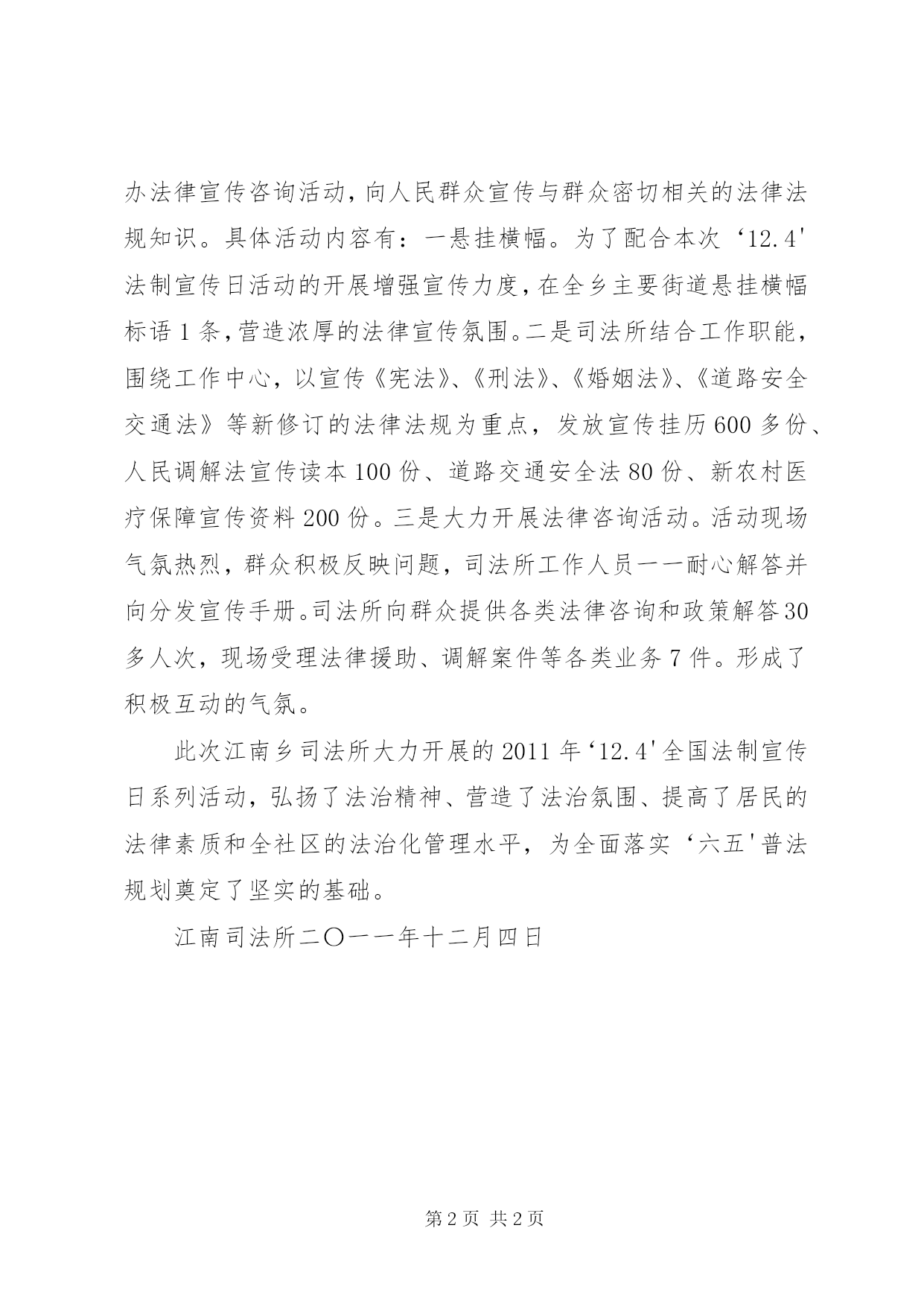 第PAGE\*Arabic\*MERGEFORMAT2页共NUMPAGES\*MERGEFORMAT2页司法所法制宣传总结江南司法所12.4法制宣传日活动总结全国普法依法治理规划将每年的12月4日确定为全国法制宣传日,我乡司法所以胡总书记‘科学发展观'为指导,全面落实普法依法治理的各项任务,不断推进依法治理工作,为我乡两个文明建设创造良好的法制环境。各单位、村、居委会紧紧围绕宣传主题,采取多种形式,开展法制宣传日活动,取得了很好的效果。‘12.4'法制宣传日正逐步成为全乡公民熟悉法律、认知法律、维护权益的有效载体。现将我乡法制宣传日活动情况汇报如下:一、活动主题和指导思想今年‘12.4'法制宣传日的活动主题是‘落实‘六五’普法规划、促进和谐社会构建'。指导思想是:全面落实科学发展观,深入贯彻党的十七大全会精神,以开展‘12.4'法制宣传日活动为载体,动员全乡干部职工集中开展以宪法为核心的法律法规宣传教育活动,进一步增强广大干部职工的宪法意识和法治观念,提高依法行政能力,促进依法治国、依法治乡的进程,为构建和谐社会营造良好的社会氛围。二、活动开展情况:江南乡党政领导高度重视本次‘12.4'法制宣传日活动,12月4日上午8时,乡人民政府联合乡综治办、安委办、派出所、社保所、派出所等职能部门在江南集市举办法律宣传咨询活动,向人民群众宣传与群众密切相关的法律法规知识。具体活动内容有:一悬挂横幅。为了配合本次‘12.4'法制宣传日活动的开展增强宣传力度,在全乡主要街道悬挂横幅标语1条,营造浓厚的法律宣传氛围。二是司法所结合工作职能,围绕工作中心,以宣传《宪法》、《刑法》、《婚姻法》、《道路安全交通法》等新修订的法律法规为重点,发放宣传挂历600多份、人民调解法宣传读本100份、道路交通安全法80份、新农村医疗保障宣传资料200份。三是大力开展法律咨询活动。活动现场气氛热烈,群众积极反映问题,司法所工作人员一一耐心解答并向分发宣传手册。司法所向群众提供各类法律咨询和政策解答30多人次,现场受理法律援助、调解案件等各类业务7件。形成了积极互动的气氛。此次江南乡司法所大力开展的2011年‘12.4'全国法制宣传日系列活动,弘扬了法治精神、营造了法治氛围、提高了居民的法律素质和全社区的法治化管理水平,为全面落实‘六五'普法规划奠定了坚实的基础。江南司法所二〇一一年十二月四日