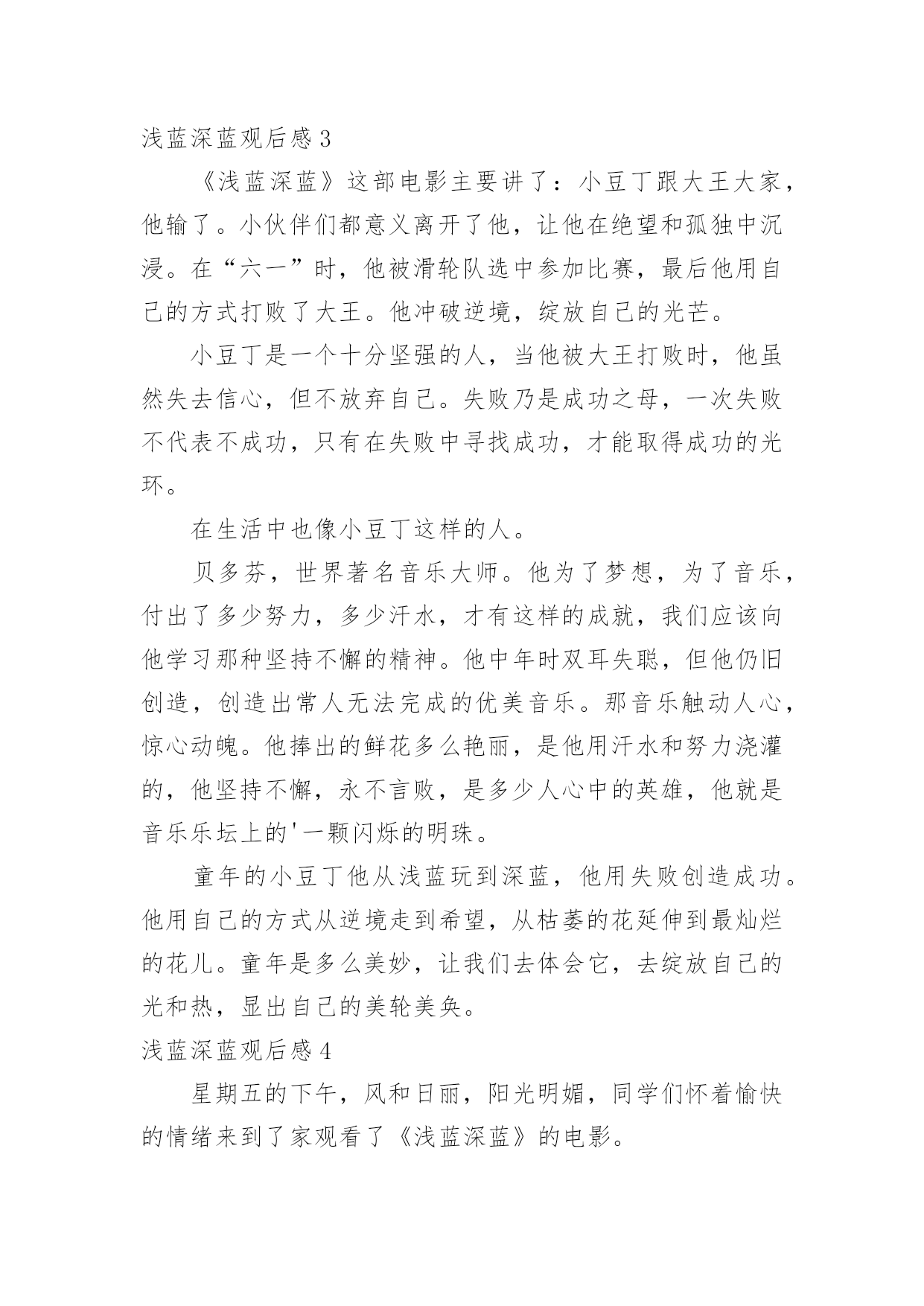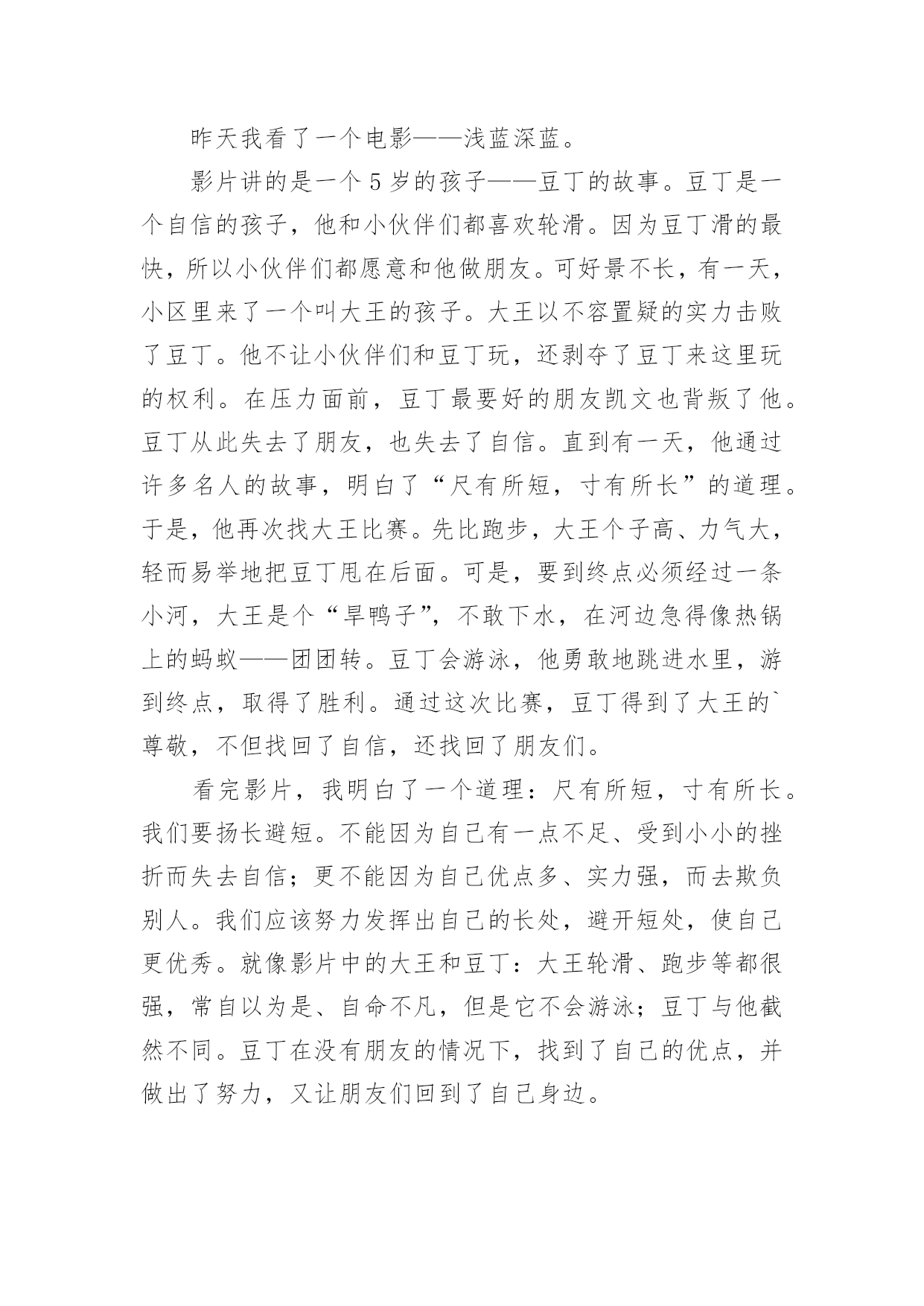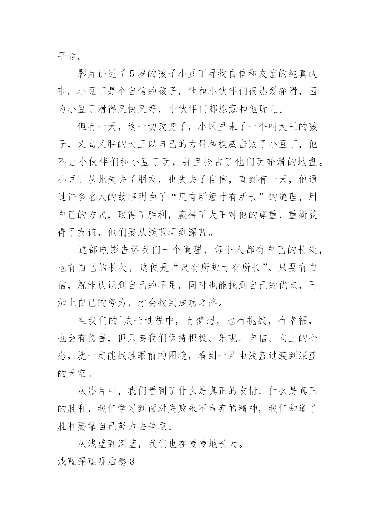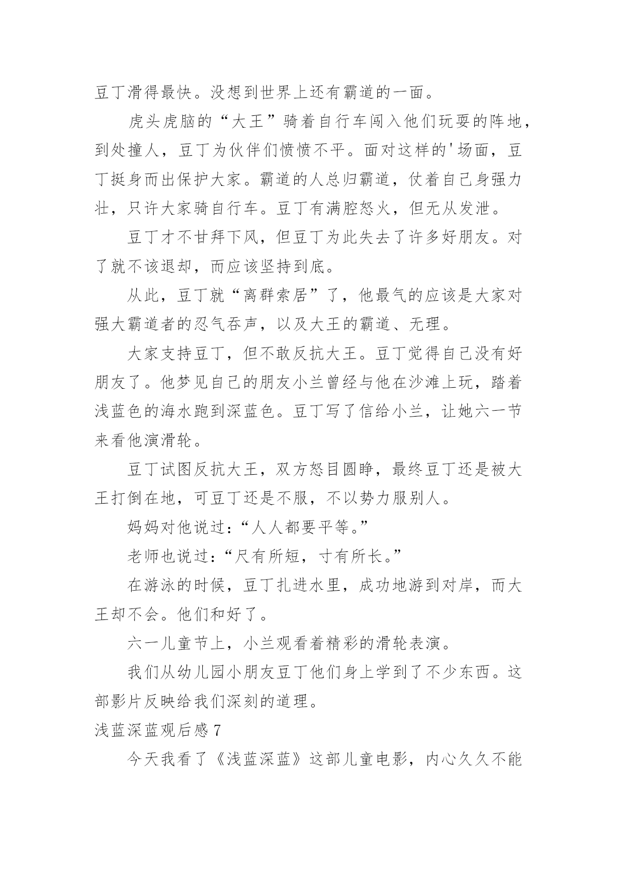 浅蓝深蓝观后感浅蓝深蓝观后感当品味完一部作品后,这次观看让你有什么体会呢?记录下来很重要哦,一起来写一篇观后感吧。快来参考观后感是怎么写的吧,下面是小编收集整理的浅蓝深蓝观后感,希望能够帮助到大家。浅蓝深蓝观后感1这部电影主要是在讲述一个小孩子通过自己的努力来战胜困难的故事。电影的主角是一个名叫“豆丁”的小男孩。他是幼儿园里的孩子,特别喜欢轮滑,每天过得开开心心的,从没有烦恼。可是,自从班里转来了一个大男孩——大王,一切都变了。大王个头很高、力气很强大。他命令所有小朋友不能跟豆丁在一起玩,要是谁跟豆丁玩,大王就要揍他。凯文是豆丁最要好的朋大王弱,但是豆丁比较机灵,而且会游泳。豆丁按照了自己的`方法去向大王挑战:谁先到终点,谁就胜利。首先是跑步,豆丁慢了一点,大王领先,但到终点必须要经过游泳池。大王是个旱鸭子,在游泳池边徘徊了许久,还是不敢下水。豆丁到了游泳池迅速换上了游泳衣,迫不及待地跳下水,轻轻松松过了岸,赢得了胜利。豆丁用自己的勇气和智慧赢得了这场比赛,也赢得了伙伴们的赞许和信任。当大王要让豆丁当老大时,豆丁却说:“朋友之间是平等的。”并和大王成了好朋友。看了这部电影后,我明白了:在生活中每个人都会有自己存在的缺点和优点,我们应该克服生活中的困难,勇敢面对。而不能因为自己的优势,而欺负弱小群体。俗话说得好:“尺有所短,寸有所长。”同学之间要和睦相处。互相帮助、取长补短、才能共同进步。浅蓝深蓝观后感2失败是成功之母,有失败就能看到成功的希望。这是我看了电影《浅蓝、深蓝》后所感悟到。《浅蓝深蓝》讲了这样一个故事:在一个平凡的小区里,住着一群小朋友,其中有一个叫豆丁的男孩。他的滑轮技术很棒,这使他非常自信。可是有一天,来了一个自称“大王”的胖男孩,以不容置疑的实力击败了豆丁,占据了整个篮球场。在强大的.势力面前,豆丁最好的朋友——凯文背叛了他。从此,豆丁的情绪隐入低谷。后来,豆丁明白了“尺有所短,寸有所成”的含义,以自己擅长的游泳战胜了大王,不应该是美迪也意识到了自己的错误,决定让豆丁当“大王”,没想到豆丁却对大家说:“我们之间没有大王,大家既然是朋友,就应该平等相待。”轮滑鞋终于又穿在豆丁脚上,小区又可以看见一群活泼可爱的滑轮少年……剧中,豆丁的坚强使我感动、虽然他一直生活在“大王”的压迫下,朋友背叛下,可他并不畏缩,而且以惊人的毅力独自一人战胜利困难。所以,我们要牢记,失败是成功之母,一次失败不代表没有成功的希望,只有在失败中寻找原因,努力改正,胜和的光环才会在我们头上闪耀。浅蓝深蓝观后感3《浅蓝深蓝》这部电影主要讲了:小豆丁跟大王大家,他输了。小伙伴们都意义离开了他,让他在绝望和孤独中沉浸。在“六一”时,他被滑轮队选中参加比赛,最后他用自己的方式打败了大王。他冲破逆境,绽放自己的光芒。小豆丁是一个十分坚强的人,当他被大王打败时,他虽然失去信心,但不放弃自己。失败乃是成功之母,一次失败不代表不成功,只有在失败中寻找成功,才能取得成功的光环。在生活中也像小豆丁这样的人。贝多芬,世界著名音乐大师。他为了梦想,为了音乐,付出了多少努力,多少汗水,才有这样的成就,我们应该向他学习那种坚持不懈的精神。他中年时双耳失聪,但他仍旧创造,创造出常人无法完成的优美音乐。那音乐触动人心,惊心动魄。他捧出的鲜花多么艳丽,是他用汗水和努力浇灌的,他坚持不懈,永不言败,是多少人心中的英雄,他就是音乐乐坛上的'一颗闪烁的明珠。童年的小豆丁他从浅蓝玩到深蓝,他用失败创造成功。他用自己的方式从逆境走到希望,从枯萎的花延伸到最灿烂的花儿。童年是多么美妙,让我们去体会它,去绽放自己的光和热,显出自己的美轮美奂。浅蓝深蓝观后感4星期五的下午,风和日丽,阳光明媚,同学们怀着愉快的情绪来到了家观看了《浅蓝深蓝》的电影。电影主要讲述了一伙小朋友玩游戏的故事。以豆丁为主的一伙小朋友都在滑单排轮,但是有一天,一个骑自行车大王来到了滑单排轮的`场地,在场地中一点儿也不懂规矩,横冲直撞,豆丁在忍无可忍的状况下,冲上去一把抓住大王的自行车,大王停了下来,用那高傲的口气说道:“你凭什么拦住我!”“我就是不许你在那里乱骑!”“那我到要看看是谁能够在这滑!”“好!那我们就来比比!怎样样!”“来就来!谁怕你呦!裁判呢?”“我在这儿呢!”“预备!开始!”在滑的时候,豆丁不留意被石头给拌了一跤,最后大王取得了胜利,他就当了大王,他规定其他人以后不许在滑单排轮,只许骑自行车。从那以后,豆丁就和大王结下了“深仇大恨”。许多天后,豆丁又一次跟大王比赛———争夺大王之位,比的是跑步、游泳,开始了,大王就以领先的优势把豆丁甩在了后面,最后还是豆丁赢了……“哦,豆丁赢了!豆丁赢了!”在小朋友的帮忙下,大王跟豆丁和好了,成为了好朋友!看了这部电影,我明白了电影为什么要以《浅蓝深蓝》为题目了:1、是因
