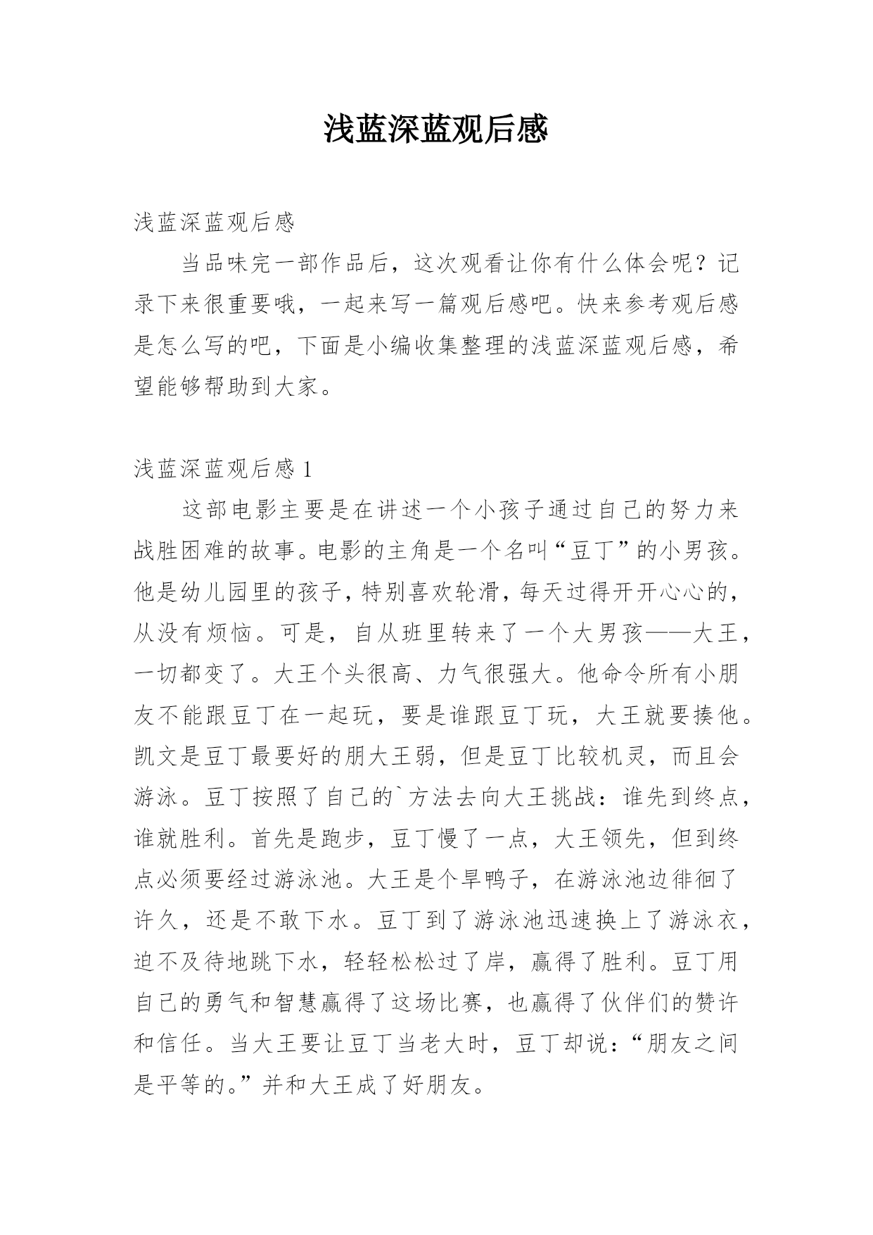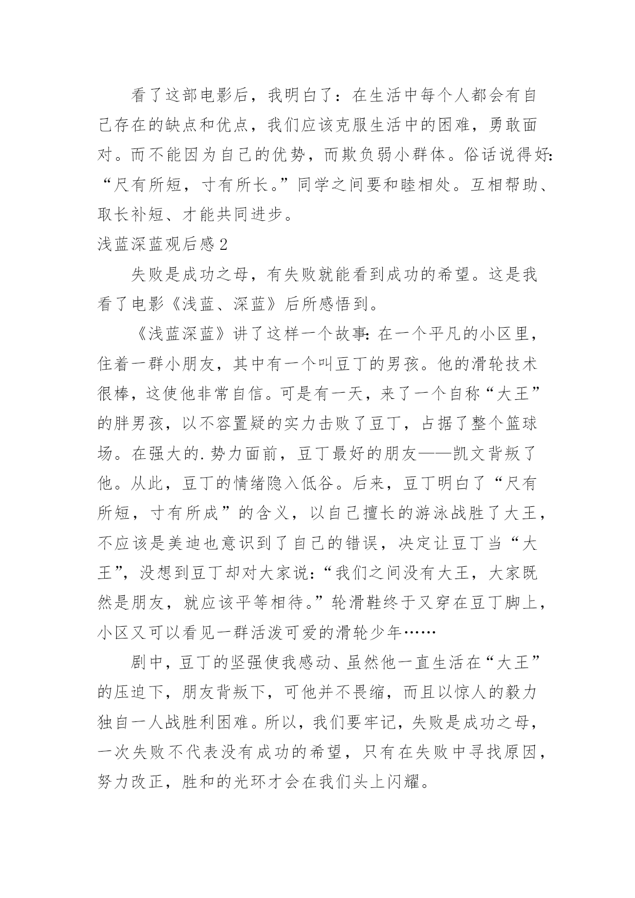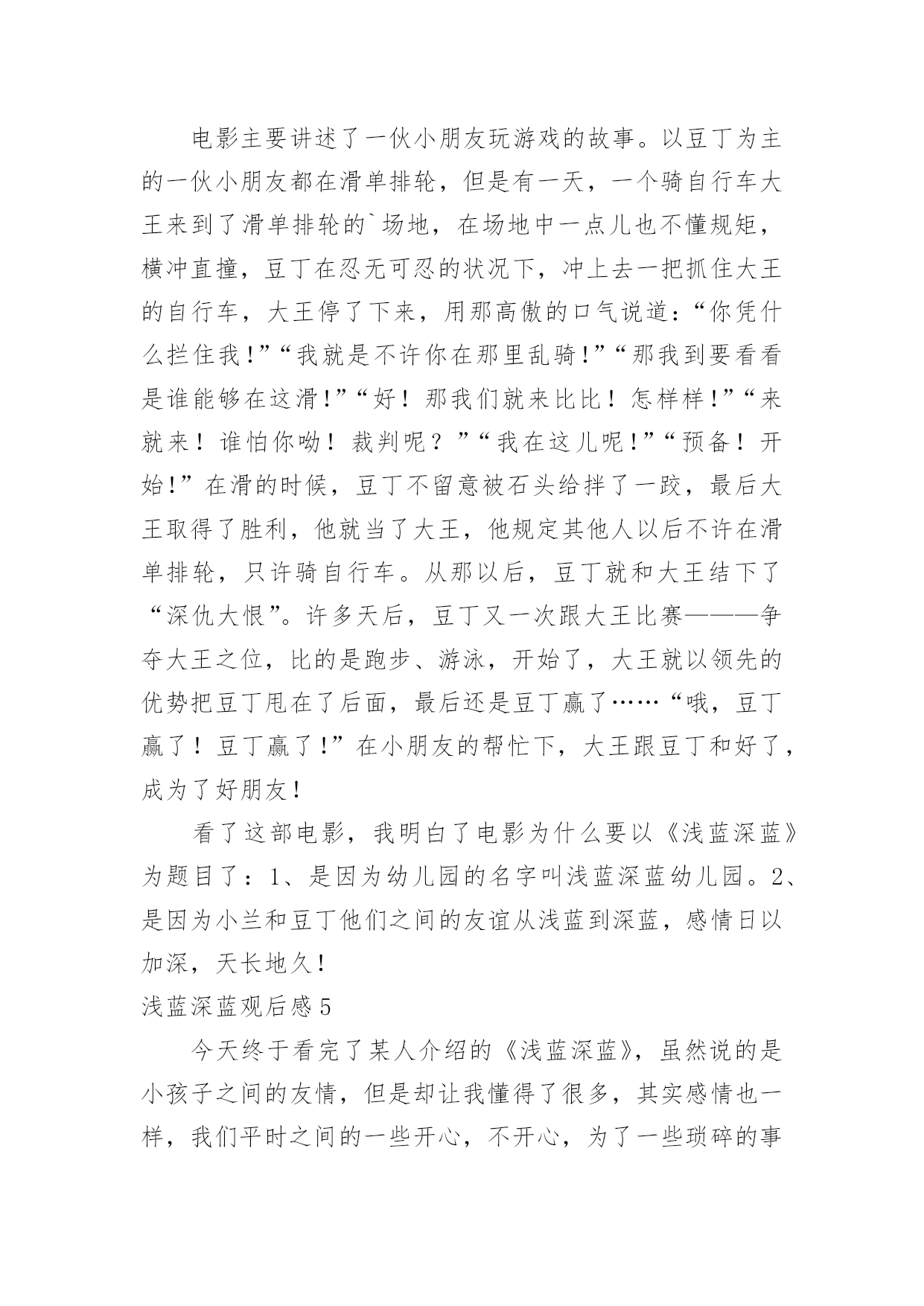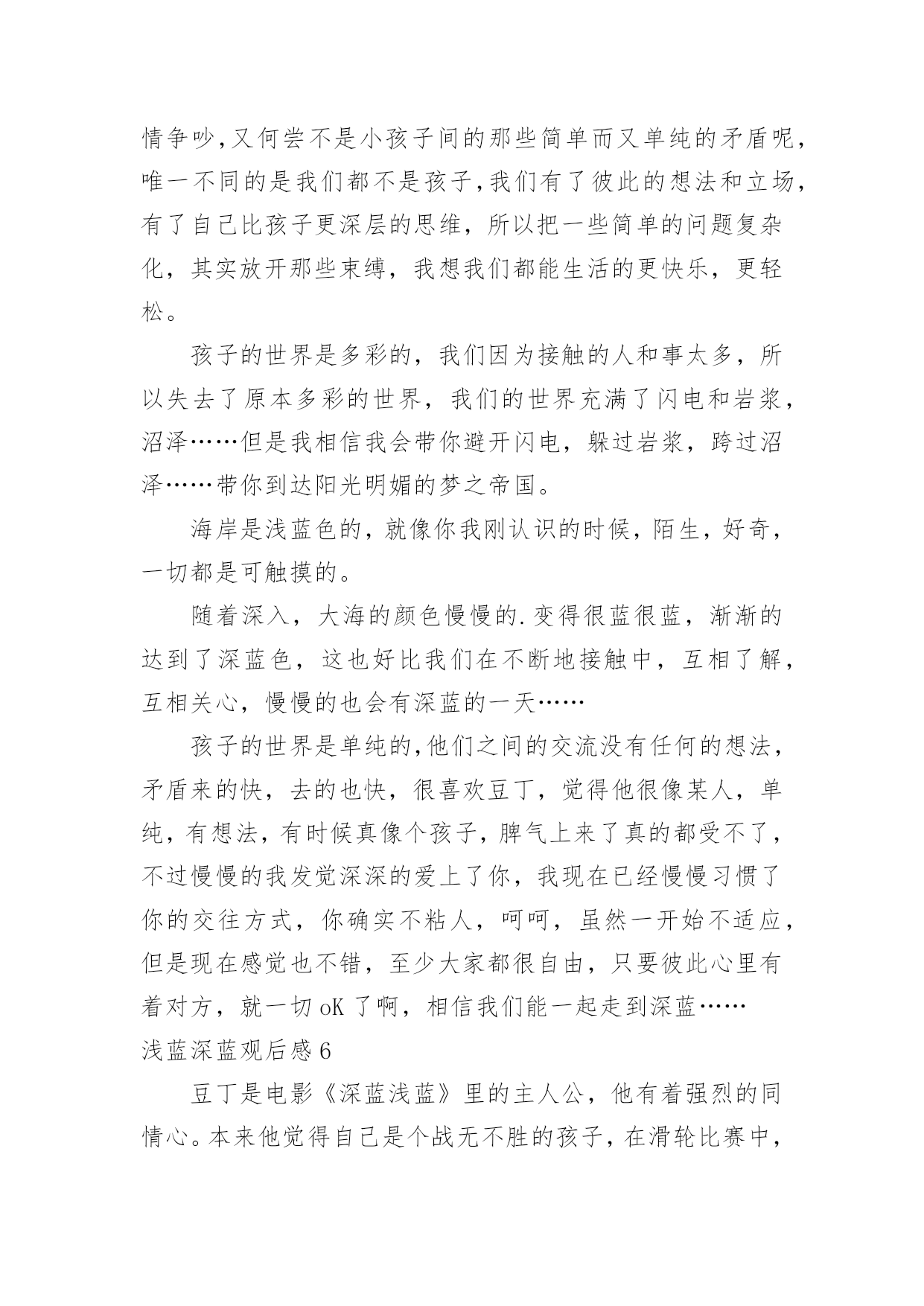 浅蓝深蓝观后感浅蓝深蓝观后感当品味完一部作品后,这次观看让你有什么体会呢?记录下来很重要哦,一起来写一篇观后感吧。快来参考观后感是怎么写的吧,下面是小编收集整理的浅蓝深蓝观后感,希望能够帮助到大家。浅蓝深蓝观后感1这部电影主要是在讲述一个小孩子通过自己的努力来战胜困难的故事。电影的主角是一个名叫“豆丁”的小男孩。他是幼儿园里的孩子,特别喜欢轮滑,每天过得开开心心的,从没有烦恼。可是,自从班里转来了一个大男孩——大王,一切都变了。大王个头很高、力气很强大。他命令所有小朋友不能跟豆丁在一起玩,要是谁跟豆丁玩,大王就要揍他。凯文是豆丁最要好的朋大王弱,但是豆丁比较机灵,而且会游泳。豆丁按照了自己的`方法去向大王挑战:谁先到终点,谁就胜利。首先是跑步,豆丁慢了一点,大王领先,但到终点必须要经过游泳池。大王是个旱鸭子,在游泳池边徘徊了许久,还是不敢下水。豆丁到了游泳池迅速换上了游泳衣,迫不及待地跳下水,轻轻松松过了岸,赢得了胜利。豆丁用自己的勇气和智慧赢得了这场比赛,也赢得了伙伴们的赞许和信任。当大王要让豆丁当老大时,豆丁却说:“朋友之间是平等的。”并和大王成了好朋友。看了这部电影后,我明白了:在生活中每个人都会有自己存在的缺点和优点,我们应该克服生活中的困难,勇敢面对。而不能因为自己的优势,而欺负弱小群体。俗话说得好:“尺有所短,寸有所长。”同学之间要和睦相处。互相帮助、取长补短、才能共同进步。浅蓝深蓝观后感2失败是成功之母,有失败就能看到成功的希望。这是我看了电影《浅蓝、深蓝》后所感悟到。《浅蓝深蓝》讲了这样一个故事:在一个平凡的小区里,住着一群小朋友,其中有一个叫豆丁的男孩。他的滑轮技术很棒,这使他非常自信。可是有一天,来了一个自称“大王”的胖男孩,以不容置疑的实力击败了豆丁,占据了整个篮球场。在强大的.势力面前,豆丁最好的朋友——凯文背叛了他。从此,豆丁的情绪隐入低谷。后来,豆丁明白了“尺有所短,寸有所成”的含义,以自己擅长的游泳战胜了大王,不应该是美迪也意识到了自己的错误,决定让豆丁当“大王”,没想到豆丁却对大家说:“我们之间没有大王,大家既然是朋友,就应该平等相待。”轮滑鞋终于又穿在豆丁脚上,小区又可以看见一群活泼可爱的滑轮少年……剧中,豆丁的坚强使我感动、虽然他一直生活在“大王”的压迫下,朋友背叛下,可他并不畏缩,而且以惊人的毅力独自一人战胜利困难。所以,我们要牢记,失败是成功之母,一次失败不代表没有成功的希望,只有在失败中寻找原因,努力改正,胜和的光环才会在我们头上闪耀。浅蓝深蓝观后感3《浅蓝深蓝》这部电影主要讲了:小豆丁跟大王大家,他输了。小伙伴们都意义离开了他,让他在绝望和孤独中沉浸。在“六一”时,他被滑轮队选中参加比赛,最后他用自己的方式打败了大王。他冲破逆境,绽放自己的光芒。小豆丁是一个十分坚强的人,当他被大王打败时,他虽然失去信心,但不放弃自己。失败乃是成功之母,一次失败不代表不成功,只有在失败中寻找成功,才能取得成功的光环。在生活中也像小豆丁这样的人。贝多芬,世界著名音乐大师。他为了梦想,为了音乐,付出了多少努力,多少汗水,才有这样的成就,我们应该向他学习那种坚持不懈的精神。他中年时双耳失聪,但他仍旧创造,创造出常人无法完成的优美音乐。那音乐触动人心,惊心动魄。他捧出的鲜花多么艳丽,是他用汗水和努力浇灌的,他坚持不懈,永不言败,是多少人心中的英雄,他就是音乐乐坛上的'一颗闪烁的明珠。童年的小豆丁他从浅蓝玩到深蓝,他用失败创造成功。他用自己的方式从逆境走到希望,从枯萎的花延伸到最灿烂的花儿。童年是多么美妙,让我们去体会它,去绽放自己的光和热,显出自己的美轮美奂。浅蓝深蓝观后感4星期五的下午,风和日丽,阳光明媚,同学们怀着愉快的情绪来到了家观看了《浅蓝深蓝》的电影。电影主要讲述了一伙小朋友玩游戏的故事。以豆丁为主的一伙小朋友都在滑单排轮,但是有一天,一个骑自行车大王来到了滑单排轮的`场地,在场地中一点儿也不懂规矩,横冲直撞,豆丁在忍无可忍的状况下,冲上去一把抓住大王的自行车,大王停了下来,用那高傲的口气说道:“你凭什么拦住我!”“我就是不许你在那里乱骑!”“那我到要看看是谁能够在这滑!”“好!那我们就来比比!怎样样!”“来就来!谁怕你呦!裁判呢?”“我在这儿呢!”“预备!开始!”在滑的时候,豆丁不留意被石头给拌了一跤,最后大王取得了胜利,他就当了大王,他规定其他人以后不许在滑单排轮,只许骑自行车。从那以后,豆丁就和大王结下了“深仇大恨”。许多天后,豆丁又一次跟大王比赛———争夺大王之位,比的是跑步、游泳,开始了,大王就以领先的优势把豆丁甩在了后面,最后还是豆丁赢了……“哦,豆丁赢了!豆丁赢了!”在小朋友的帮忙下,大王跟豆丁和好了,成为了好朋友!看了这部电影,我明白了电影为什么要以《浅蓝深蓝》为题目了:1、是因