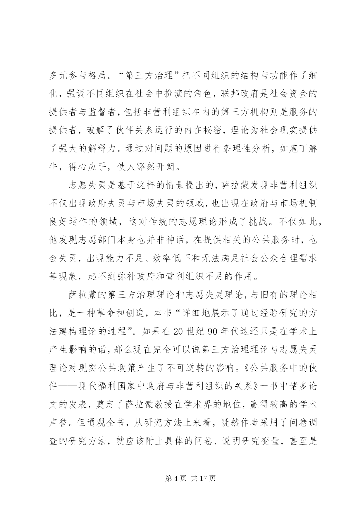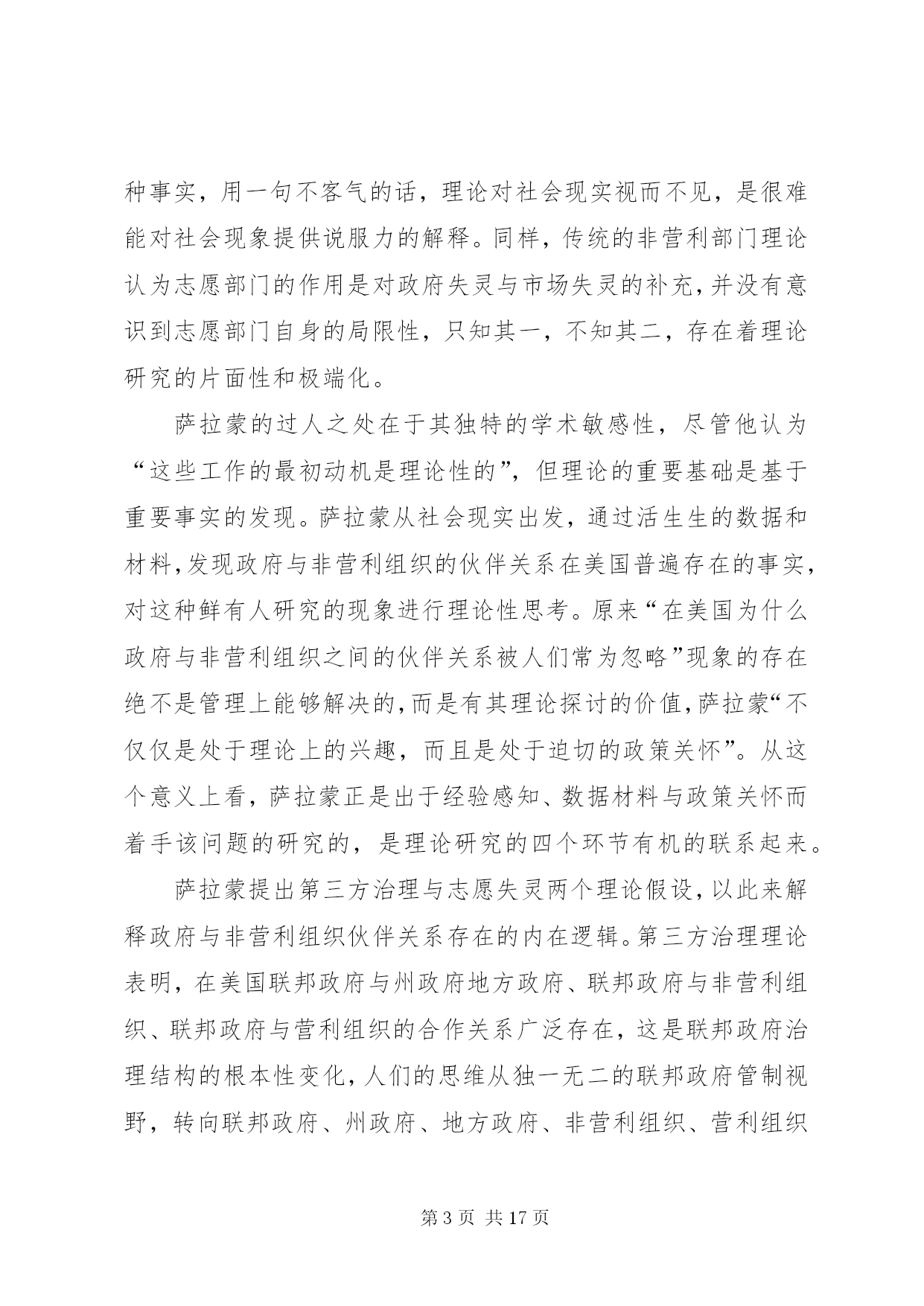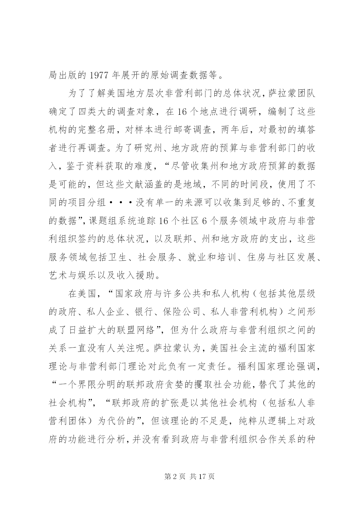第PAGE\*Arabic\*MERGEFORMAT17页共NUMPAGES\*MERGEFORMAT17页读《公共服务中的伙伴》有感514115001923顾溪羽《公共服务中的伙伴——现代福利国家中政府与非营利组织的关系》是由美国著名非营利组织研究专家莱斯特om.萨拉蒙撰写的。整体看来,这本书整合了萨拉蒙在不同时期发表的论文。而我所阅读的田凯翻译的版本除了从严谨的研究方法选择、新理论的提出、进一步探讨的问题及对中国的启示四方面展开以外,还在这本书的最后章节结合萨拉蒙教授的一些核心观点,结合中国非营利组织现状。对其独立性、绩效与合作机制提出了一些思考,发人深思。萨拉蒙教授是专攻非营利组织与公民社会、非营利组织国际比较、政府治理工具等研究的专家。本书是他的著作之一,主要关注福利国家中政府与非营利组织之间的关系,研究对象主要为20世纪30年代至80年代的美国社会,政府与非营利组织之间的关系贯彻全书的主线,主要讨论了美国非营利部门的规模、特征、结构及其与政府合作方式等论题。实证研究是本书的研究特色,书中大量采用定量研究的方法,在文献研究的基础上,还同时使用了问卷调查方法。萨拉蒙的书也证明了文献研究是问卷调查的基础这一说法:萨拉蒙的团队在编制16个地点完整名册前,首先“利用美国收入署的记录以及地方的目录和其他信息资源”;在测量美国美国的非营利部门范围时,运用了1981年美国普查局出版的1977年展开的原始调查数据等。为了了解美国地方层次非营利部门的总体状况,萨拉蒙团队确定了四类大的调查对象,在16个地点进行调研,编制了这些机构的完整名册,对样本进行邮寄调查,两年后,对最初的填答者进行再调查。为了研究州、地方政府的预算与非营利部门的收入,鉴于资料获取的难度,“尽管收集州和地方政府预算的数据是可能的,但这些文献涵盖的是地域,不同的时间段,使用了不同的项目分组···没有单一的来源可以收集到足够的、不重复的数据”,课题组系统追踪16个社区6个服务领域中政府与非营利组织签约的总体状况,以及联邦、州和地方政府的支出,这些服务领域包括卫生、社会服务、就业和培训、住房与社区发展、艺术与娱乐以及收入援助。在美国,“国家政府与许多公共和私人机构(包括其他层级的政府、私人企业、银行、保险公司、私人非营利机构)之间形成了日益扩大的联盟网络”,但为什么政府与非营利组织之间的关系一直没有人关注呢。萨拉蒙认为,美国社会主流的福利国家理论与非营利部门理论对此负有一定责任。福利国家理论强调,“一个界限分明的联邦政府贪婪的攫取社会功能,替代了其他的社会机构”,“联邦政府的扩张是以其他社会机构(包括私人非营利团体)为代价的”,但该理论的不足是,纯粹从逻辑上对政府的功能进行分析,并没有看到政府与非营利组织合作关系的种种事实,用一句不客气的话,理论对社会现实视而不见,是很难能对社会现象提供说服力的解释。同样,传统的非营利部门理论认为志愿部门的作用是对政府失灵与市场失灵的补充,并没有意识到志愿部门自身的局限性,只知其一,不知其二,存在着理论研究的片面性和极端化。萨拉蒙的过人之处在于其独特的学术敏感性,尽管他认为“这些工作的最初动机是理论性的”,但理论的重要基础是基于重要事实的发现。萨拉蒙从社会现实出发,通过活生生的数据和材料,发现政府与非营利组织的伙伴关系在美国普遍存在的事实,对这种鲜有人研究的现象进行理论性思考。原来“在美国为什么政府与非营利组织之间的伙伴关系被人们常为忽略”现象的存在绝不是管理上能够解决的,而是有其理论探讨的价值,萨拉蒙“不仅仅是处于理论上的兴趣,而且是处于迫切的政策关怀”。从这个意义上看,萨拉蒙正是出于经验感知、数据材料与政策关怀而着手该问题的研究的,是理论研究的四个环节有机的联系起来。萨拉蒙提出第三方治理与志愿失灵两个理论假设,以此来解释政府与非营利组织伙伴关系存在的内在逻辑。第三方治理理论表明,在美国联邦政府与州政府地方政府、联邦政府与非营利组织、联邦政府与营利组织的合作关系广泛存在,这是联邦政府治理结构的根本性变化,人们的思维从独一无二的联邦政府管制视野,转向联邦政府、州政府、地方政府、非营利组织、营利组织多元参与格局。“第三方治理”把不同组织的结构与功能作了细化,强调不同组织在社会中扮演的角色,联邦政府是社会资金的提供者与监督者,包括非营利组织在内的第三方机构则是服务的提供者,破解了伙伴关系运行的内在秘密,理论为社会现实提供了强大的解释力。通过对问题的原因进行条理性分析,如庖丁解牛,得心应手,使人豁然开朗。志愿失灵是基于这样的情景提出的,萨拉蒙发现非营利组织不仅出现政府失灵与市场失灵的领域,也出现在政府与市场机制良好运作的领域,这对传统的志愿理论形成了挑战。不仅如此,他发现志愿部门本身也并非神话,在提供相关的公共服务时,也