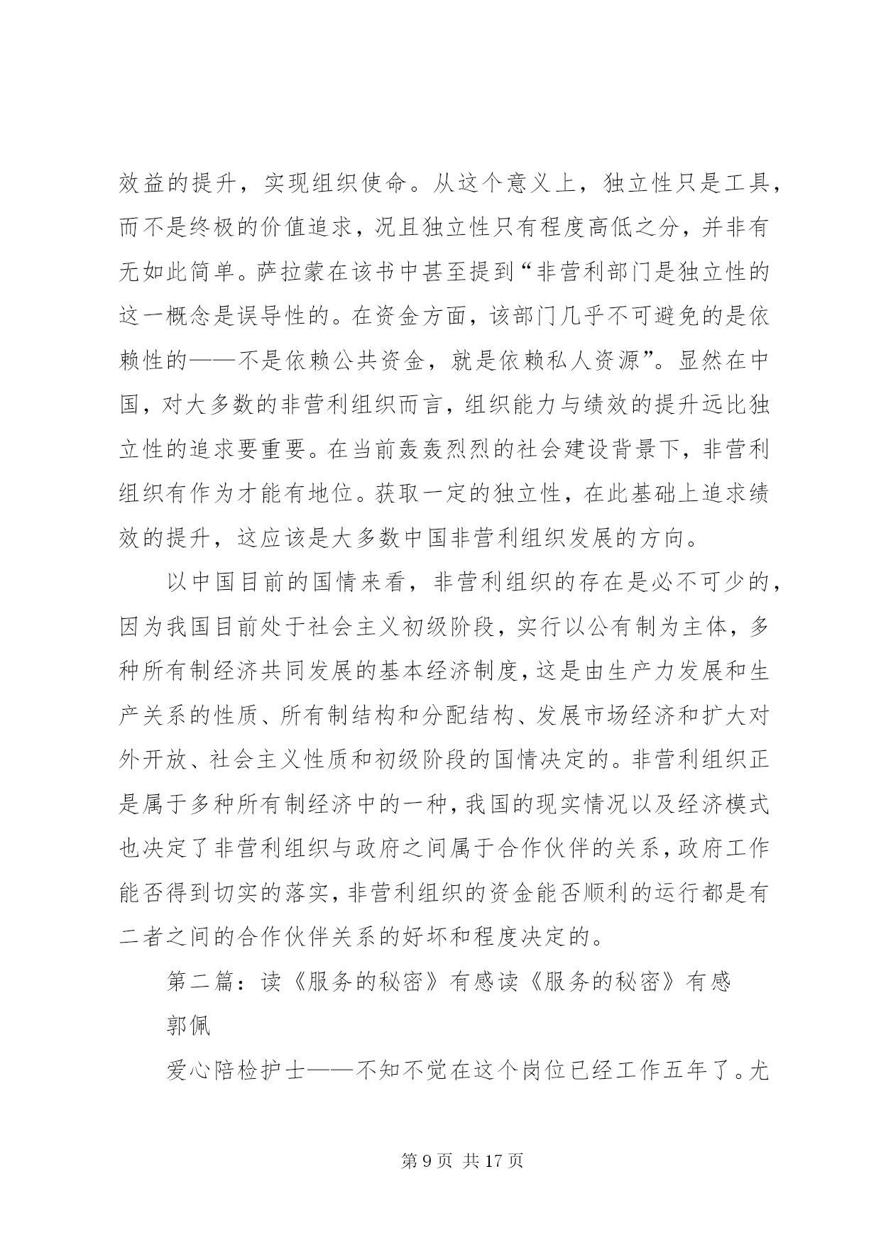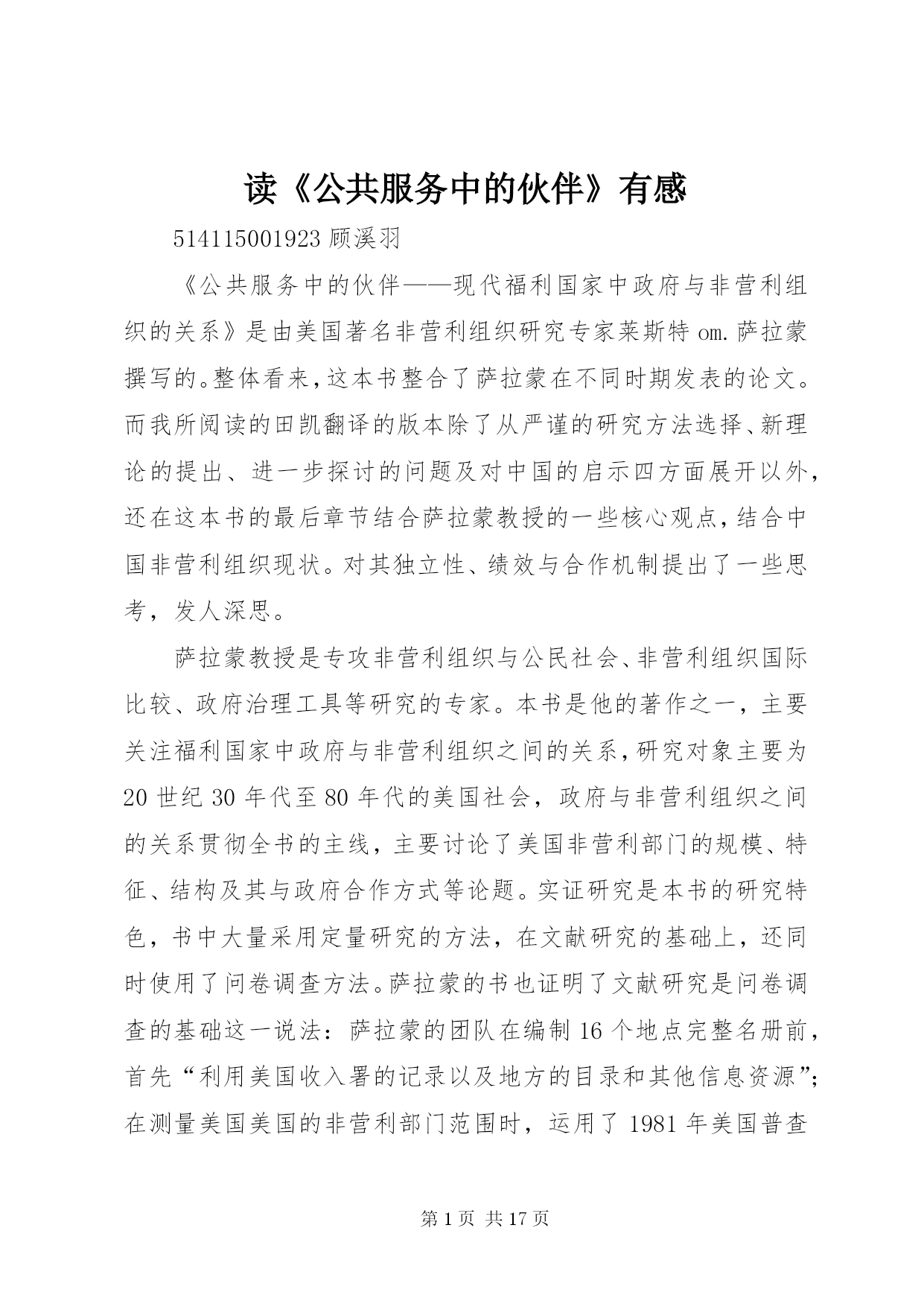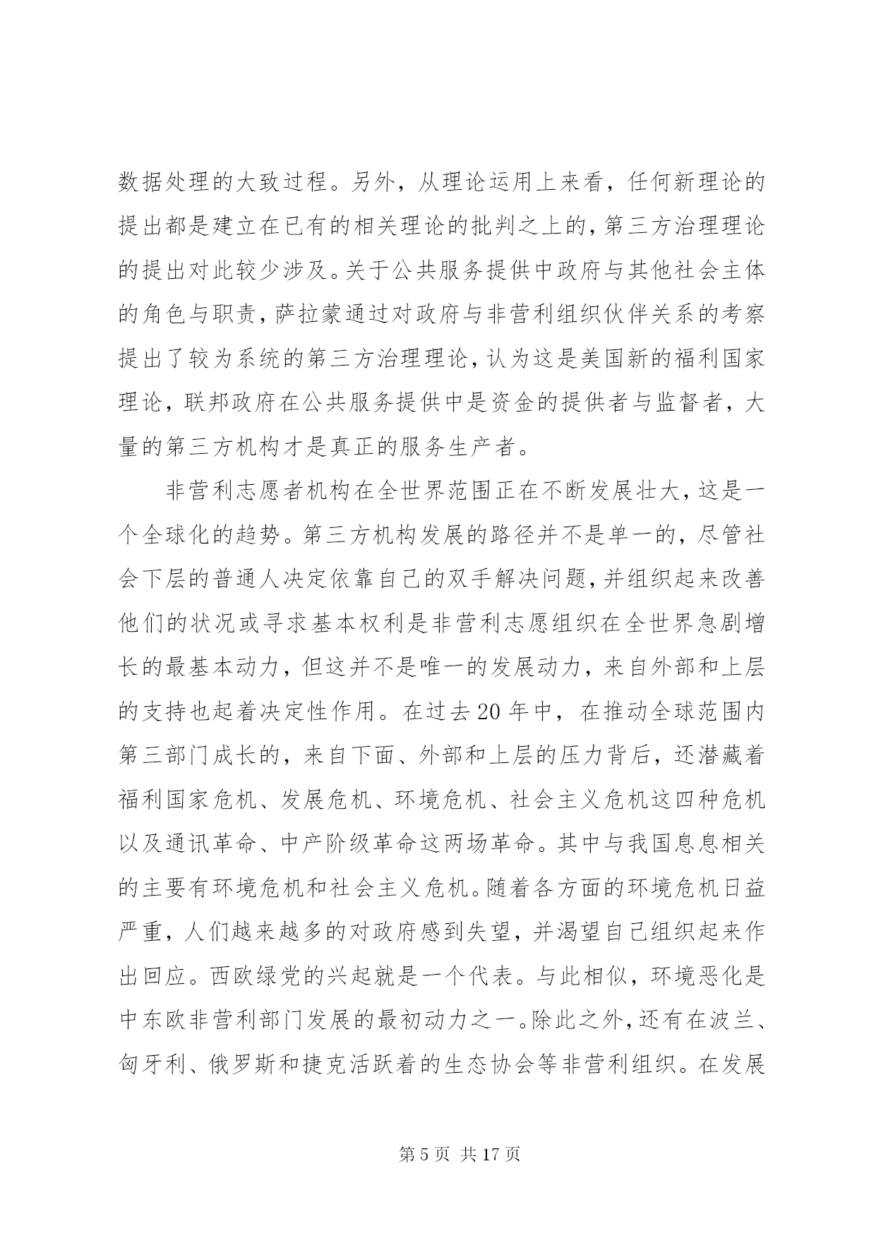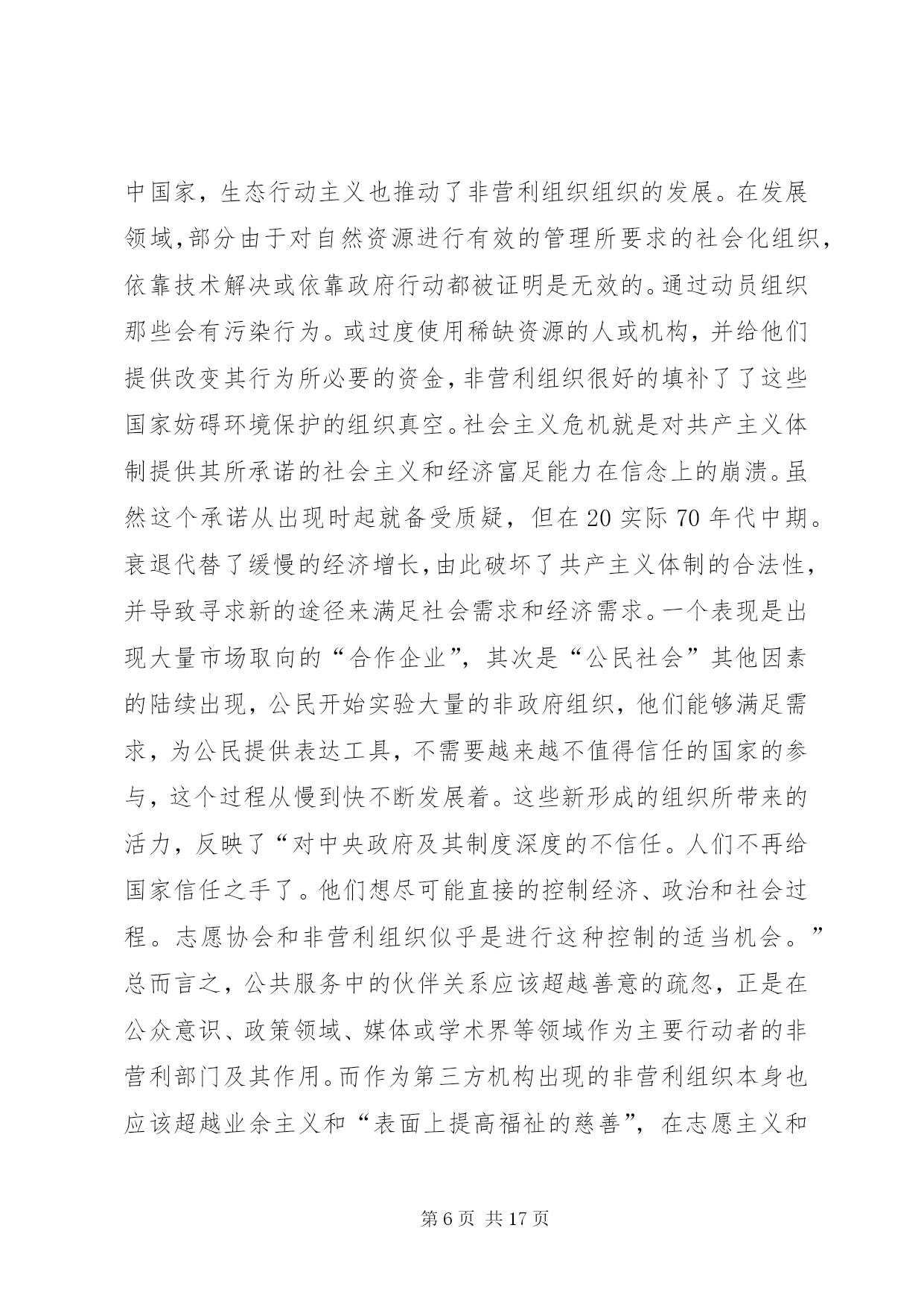 第PAGE\*Arabic\*MERGEFORMAT17页共NUMPAGES\*MERGEFORMAT17页读《公共服务中的伙伴》有感514115001923顾溪羽《公共服务中的伙伴——现代福利国家中政府与非营利组织的关系》是由美国著名非营利组织研究专家莱斯特om.萨拉蒙撰写的。整体看来,这本书整合了萨拉蒙在不同时期发表的论文。而我所阅读的田凯翻译的版本除了从严谨的研究方法选择、新理论的提出、进一步探讨的问题及对中国的启示四方面展开以外,还在这本书的最后章节结合萨拉蒙教授的一些核心观点,结合中国非营利组织现状。对其独立性、绩效与合作机制提出了一些思考,发人深思。萨拉蒙教授是专攻非营利组织与公民社会、非营利组织国际比较、政府治理工具等研究的专家。本书是他的著作之一,主要关注福利国家中政府与非营利组织之间的关系,研究对象主要为20世纪30年代至80年代的美国社会,政府与非营利组织之间的关系贯彻全书的主线,主要讨论了美国非营利部门的规模、特征、结构及其与政府合作方式等论题。实证研究是本书的研究特色,书中大量采用定量研究的方法,在文献研究的基础上,还同时使用了问卷调查方法。萨拉蒙的书也证明了文献研究是问卷调查的基础这一说法:萨拉蒙的团队在编制16个地点完整名册前,首先“利用美国收入署的记录以及地方的目录和其他信息资源”;在测量美国美国的非营利部门范围时,运用了1981年美国普查局出版的1977年展开的原始调查数据等。为了了解美国地方层次非营利部门的总体状况,萨拉蒙团队确定了四类大的调查对象,在16个地点进行调研,编制了这些机构的完整名册,对样本进行邮寄调查,两年后,对最初的填答者进行再调查。为了研究州、地方政府的预算与非营利部门的收入,鉴于资料获取的难度,“尽管收集州和地方政府预算的数据是可能的,但这些文献涵盖的是地域,不同的时间段,使用了不同的项目分组···没有单一的来源可以收集到足够的、不重复的数据”,课题组系统追踪16个社区6个服务领域中政府与非营利组织签约的总体状况,以及联邦、州和地方政府的支出,这些服务领域包括卫生、社会服务、就业和培训、住房与社区发展、艺术与娱乐以及收入援助。在美国,“国家政府与许多公共和私人机构(包括其他层级的政府、私人企业、银行、保险公司、私人非营利机构)之间形成了日益扩大的联盟网络”,但为什么政府与非营利组织之间的关系一直没有人关注呢。萨拉蒙认为,美国社会主流的福利国家理论与非营利部门理论对此负有一定责任。福利国家理论强调,“一个界限分明的联邦政府贪婪的攫取社会功能,替代了其他的社会机构”,“联邦政府的扩张是以其他社会机构(包括私人非营利团体)为代价的”,但该理论的不足是,纯粹从逻辑上对政府的功能进行分析,并没有看到政府与非营利组织合作关系的种种事实,用一句不客气的话,理论对社会现实视而不见,是很难能对社会现象提供说服力的解释。同样,传统的非营利部门理论认为志愿部门的作用是对政府失灵与市场失灵的补充,并没有意识到志愿部门自身的局限性,只知其一,不知其二,存在着理论研究的片面性和极端化。萨拉蒙的过人之处在于其独特的学术敏感性,尽管他认为“这些工作的最初动机是理论性的”,但理论的重要基础是基于重要事实的发现。萨拉蒙从社会现实出发,通过活生生的数据和材料,发现政府与非营利组织的伙伴关系在美国普遍存在的事实,对这种鲜有人研究的现象进行理论性思考。原来“在美国为什么政府与非营利组织之间的伙伴关系被人们常为忽略”现象的存在绝不是管理上能够解决的,而是有其理论探讨的价值,萨拉蒙“不仅仅是处于理论上的兴趣,而且是处于迫切的政策关怀”。从这个意义上看,萨拉蒙正是出于经验感知、数据材料与政策关怀而着手该问题的研究的,是理论研究的四个环节有机的联系起来。萨拉蒙提出第三方治理与志愿失灵两个理论假设,以此来解释政府与非营利组织伙伴关系存在的内在逻辑。第三方治理理论表明,在美国联邦政府与州政府地方政府、联邦政府与非营利组织、联邦政府与营利组织的合作关系广泛存在,这是联邦政府治理结构的根本性变化,人们的思维从独一无二的联邦政府管制视野,转向联邦政府、州政府、地方政府、非营利组织、营利组织多元参与格局。“第三方治理”把不同组织的结构与功能作了细化,强调不同组织在社会中扮演的角色,联邦政府是社会资金的提供者与监督者,包括非营利组织在内的第三方机构则是服务的提供者,破解了伙伴关系运行的内在秘密,理论为社会现实提供了强大的解释力。通过对问题的原因进行条理性分析,如庖丁解牛,得心应手,使人豁然开朗。志愿失灵是基于这样的情景提出的,萨拉蒙发现非营利组织不仅出现政府失灵与市场失灵的领域,也出现在政府与市场机制良好运作的领域,这对传统的志愿理论形成了挑战。不仅如此,他发现志愿部门本身也并非神话,在提供相关的公共服务时,也