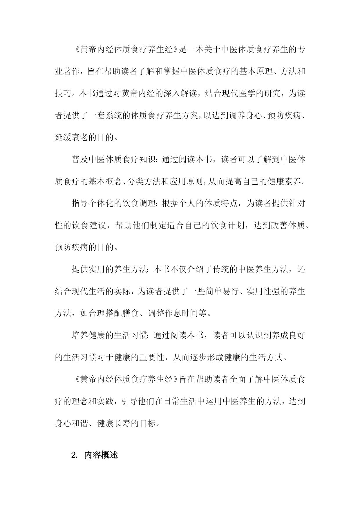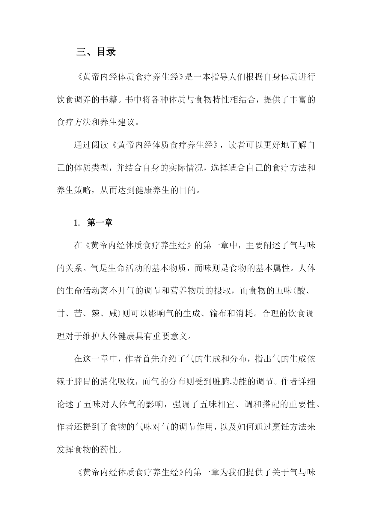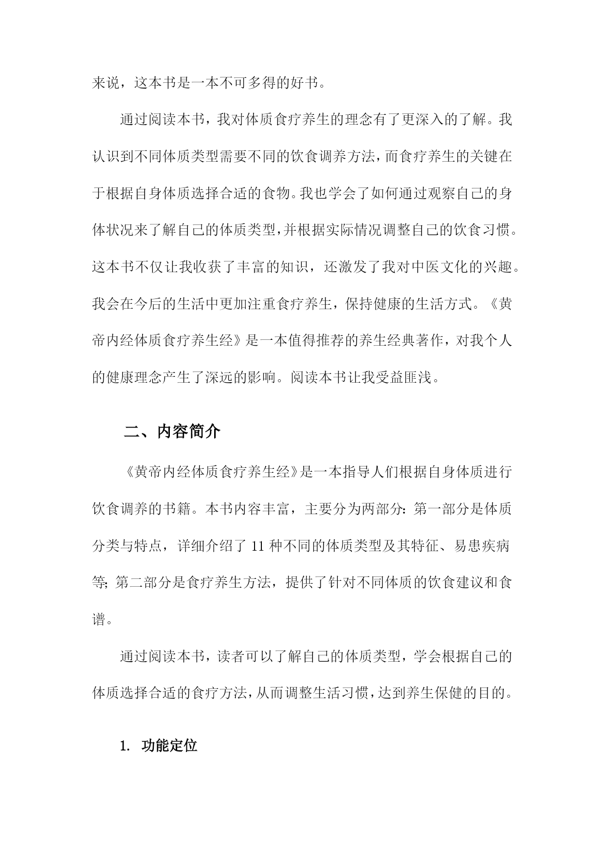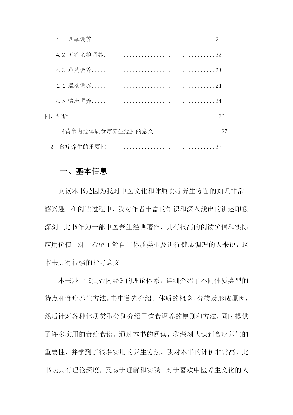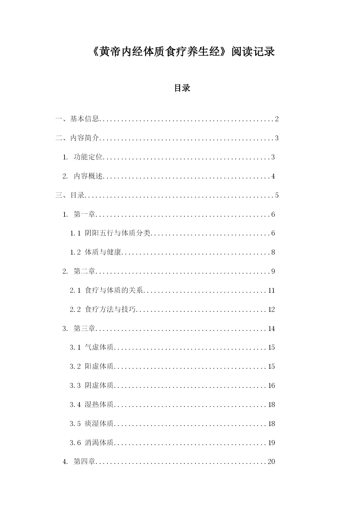 《黄帝内经体质食疗养生经》阅读记录目录一、基本信息................................................2二、内容简介................................................31.功能定位..............................................32.内容概述..............................................4三、目录....................................................51.第一章................................................61.1阴阳五行与体质分类.................................61.2体质与健康.........................................82.第二章................................................92.1食疗与体质的关系..................................112.2食疗方法与技巧....................................123.第三章...............................................143.1气虚体质..........................................153.2阳虚体质..........................................153.3阴虚体质..........................................163.4湿热体质..........................................183.5痰湿体质..........................................183.6消渴体质..........................................194.第四章...............................................204.1四季调养..........................................214.2五谷杂粮调养......................................224.3草药调养..........................................234.4运动调养..........................................244.5情志调养..........................................24四、结语...................................................261.《黄帝内经体质食疗养生经》的意义.......................272.食疗养生的重要性.....................................27一、基本信息阅读本书是因为我对中医文化和体质食疗养生方面的知识非常感兴趣。在阅读过程中,我对作者丰富的知识和深入浅出的讲述印象深刻。此书作为一部中医养生经典著作,具有很高的阅读价值和实际应用价值。对于希望了解自己体质类型及进行健康调理的人来说,这本书具有很强的指导意义。本书基于《黄帝内经》的理论体系,详细介绍了不同体质类型的特点和食疗养生方法。书中首先介绍了体质的概念、分类及形成原因,然后针对各种体质类型分别介绍了饮食调养的原则和方法,同时提供了许多实用的食疗食谱。通过本书的阅读,我深刻认识到食疗养生的重要性,并学到了很多实用的养生方法。我对本书的评价非常高,此书既具有理论深度,又易于理解和实践。对于喜欢中医养生文化的人来说,这本书是一本不可多得的好书。通过阅读本书,我对体质食疗养生的理念有了更深入的了解。我认识到不同体质类型需要不同的饮食调养方法,而食疗养生的关键在于根据自身体质选择合适的食物。我也学会了如何通过观察自己的身体状况来了解自己的体质类型,并根据实际情况调整自己的饮食习惯。这本书不仅让我收获了丰富的知识,还激发了我对中医文化的兴趣。我会在今后的生活中更加注重食疗养生,保持健康的生活方式。《黄帝内经体质食疗养生经》是一本值得推荐的养生经典著作,对我个人的健康理念产生了深远的影响。阅读本书让我受