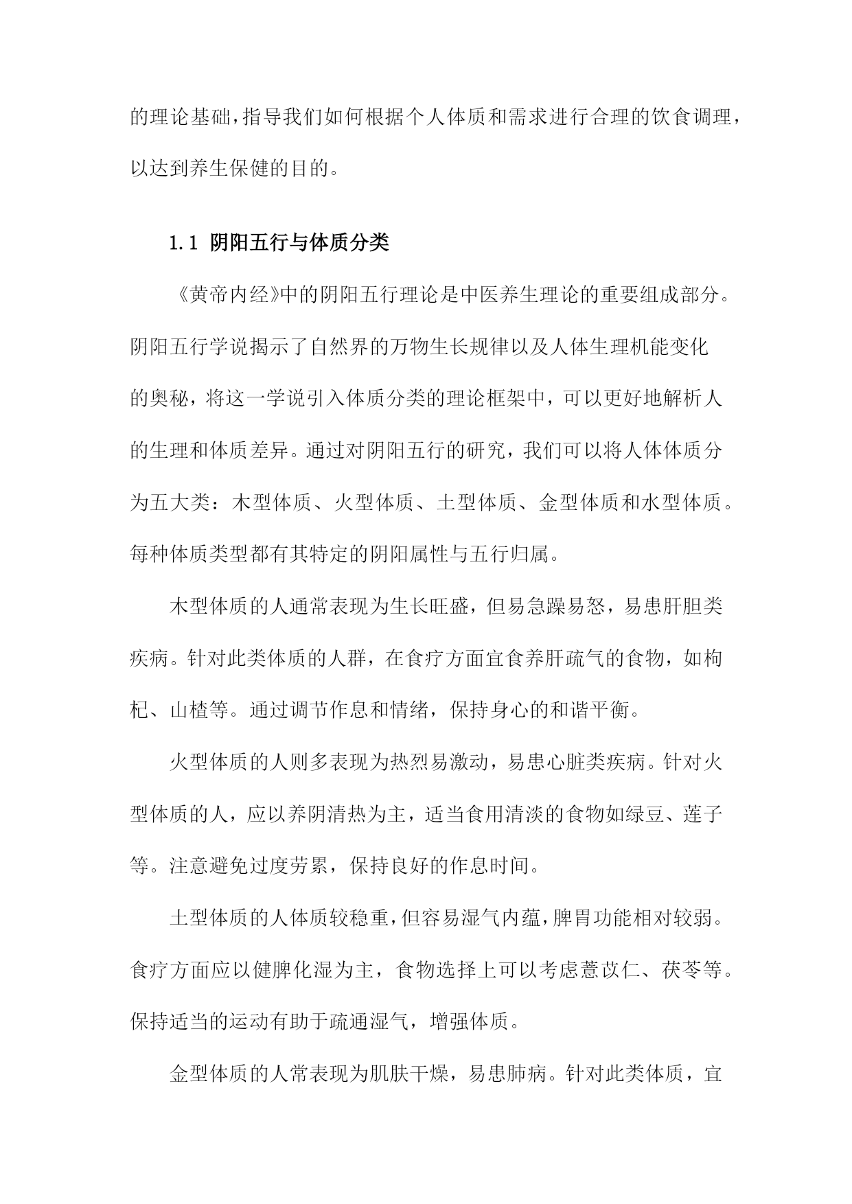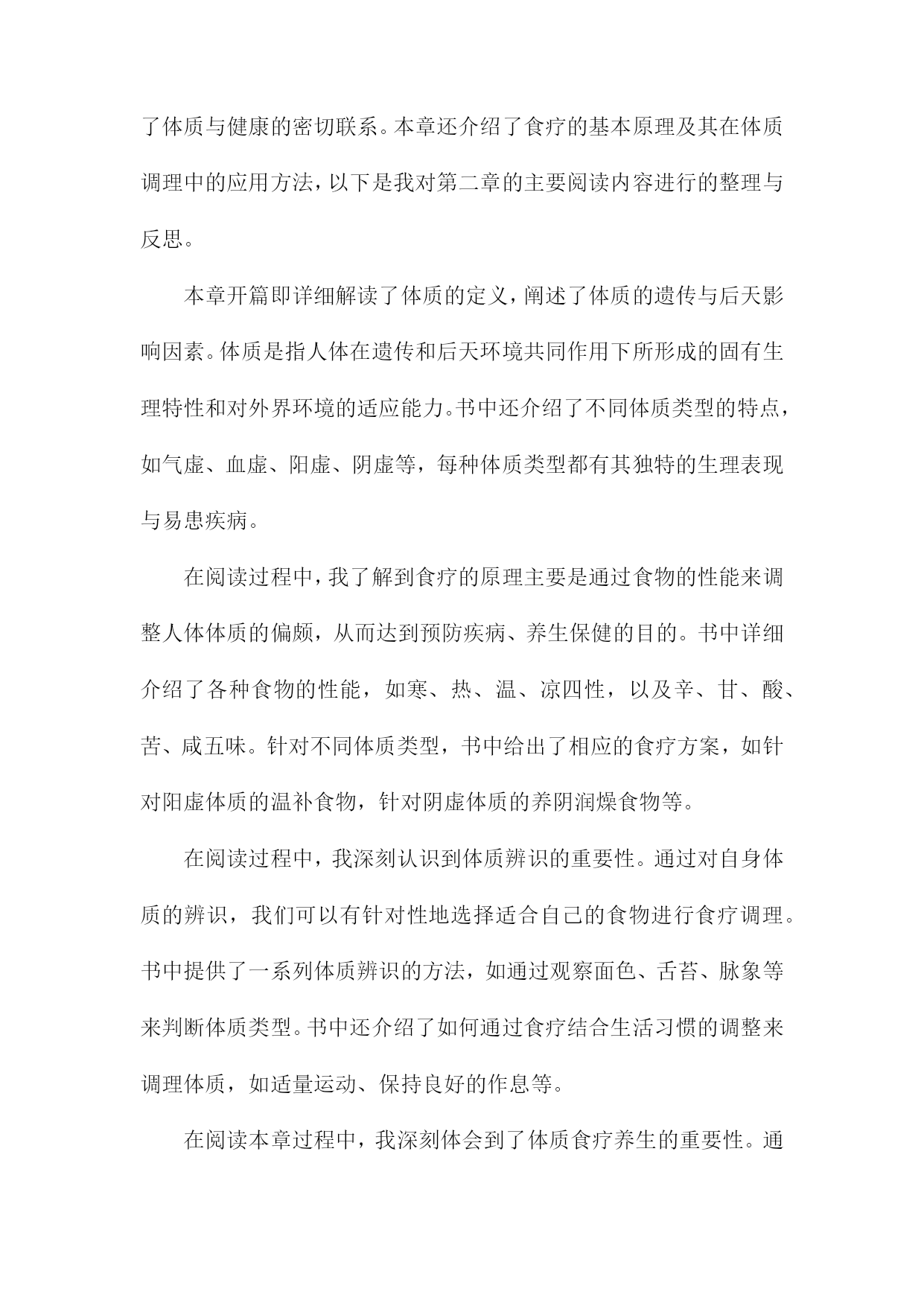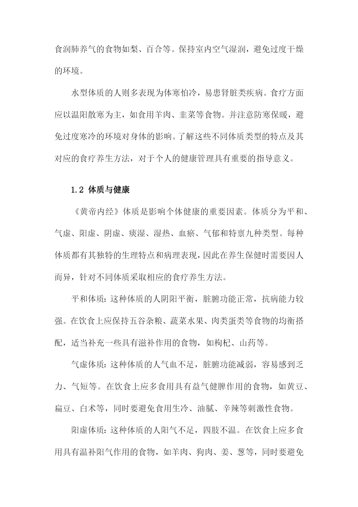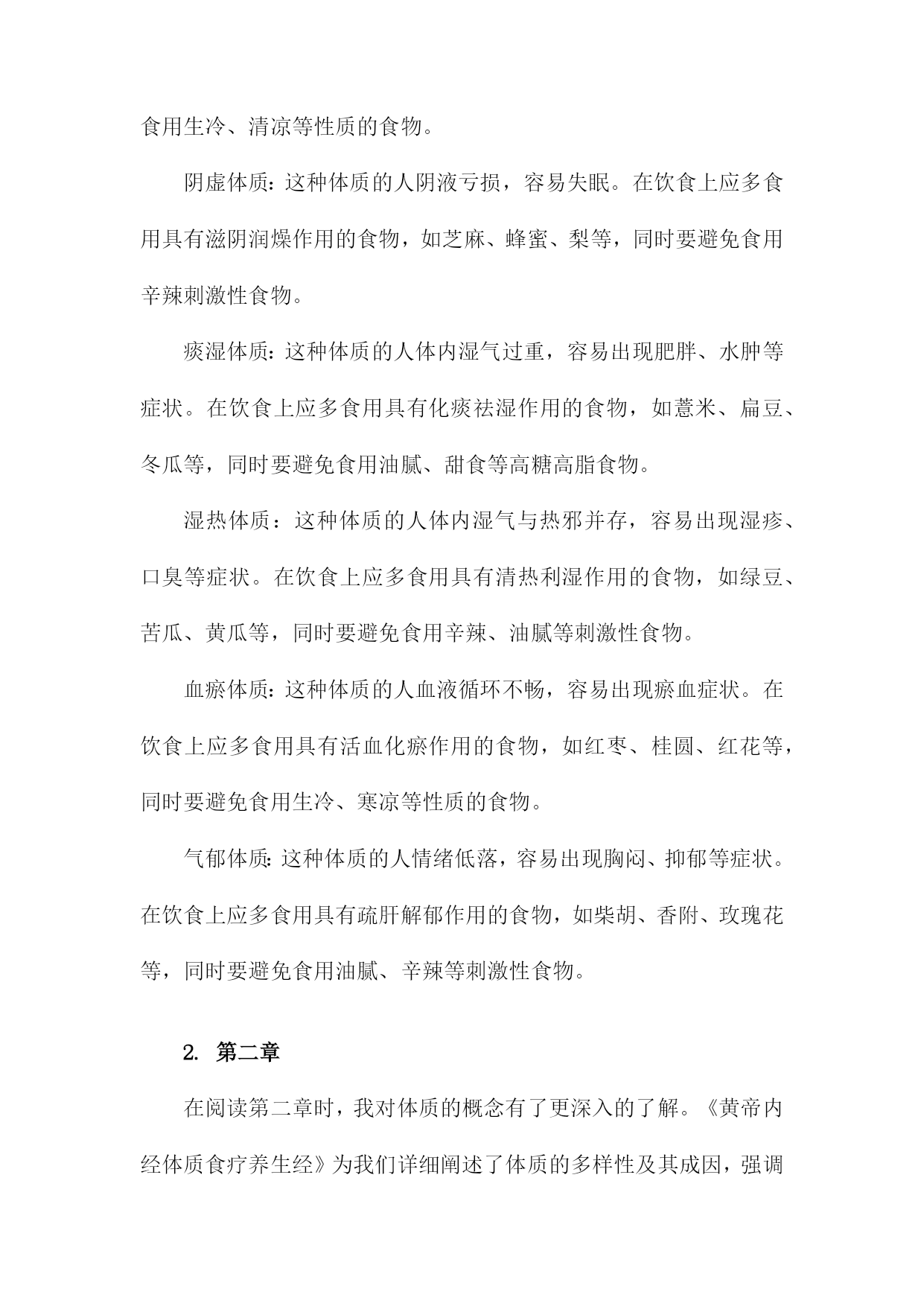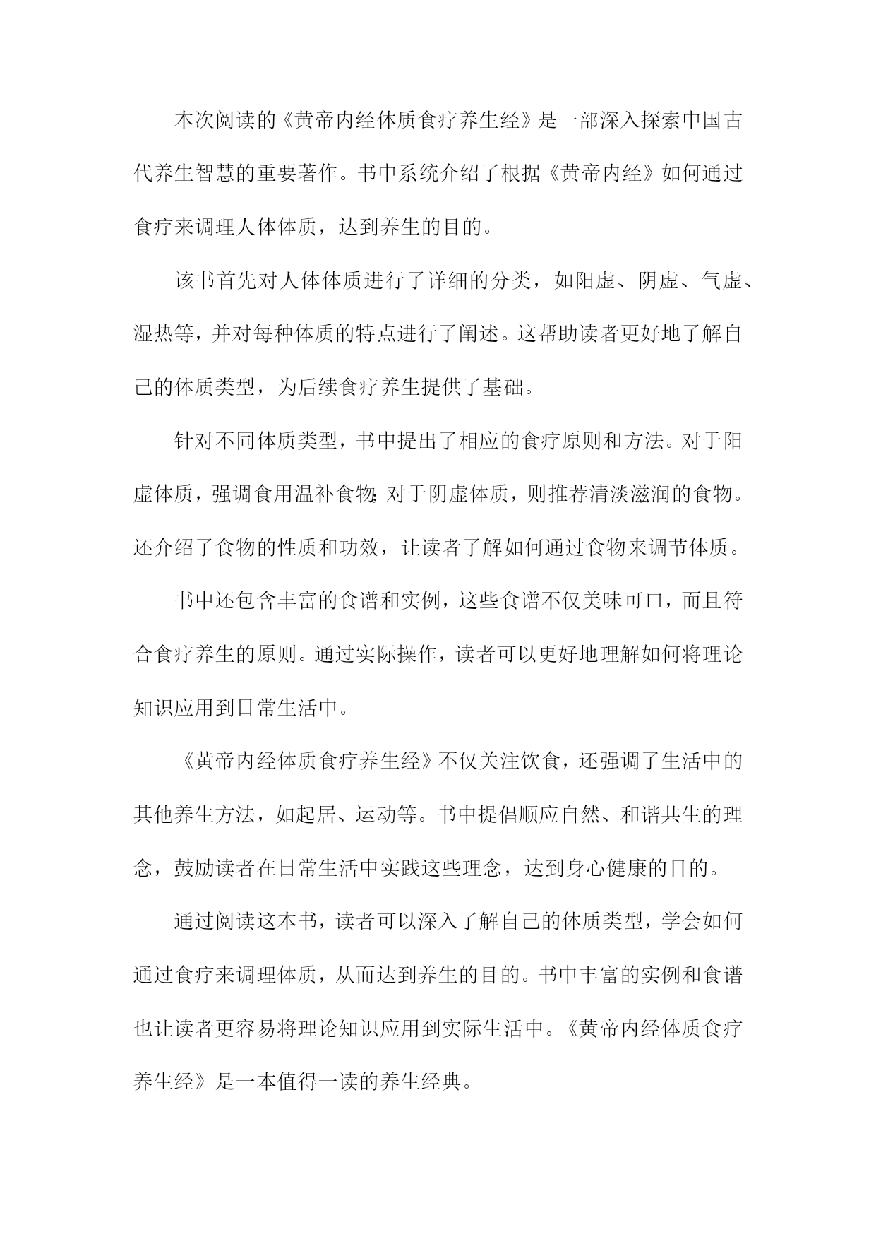 《黄帝内经体质食疗养生经》阅读记录目录一、基本信息................................................2二、内容简介................................................31.功能定位..............................................32.内容概述..............................................4三、目录....................................................51.第一章................................................61.1阴阳五行与体质分类.................................61.2体质与健康.........................................82.第二章................................................92.1食疗与体质的关系..................................112.2食疗方法与技巧....................................123.第三章...............................................143.1气虚体质..........................................153.2阳虚体质..........................................153.3阴虚体质..........................................163.4湿热体质..........................................183.5痰湿体质..........................................183.6消渴体质..........................................194.第四章...............................................204.1四季调养..........................................214.2五谷杂粮调养......................................224.3草药调养..........................................234.4运动调养..........................................244.5情志调养..........................................24四、结语...................................................261.《黄帝内经体质食疗养生经》的意义.......................272.食疗养生的重要性.....................................27一、基本信息阅读本书是因为我对中医文化和体质食疗养生方面的知识非常感兴趣。在阅读过程中,我对作者丰富的知识和深入浅出的讲述印象深刻。此书作为一部中医养生经典著作,具有很高的阅读价值和实际应用价值。对于希望了解自己体质类型及进行健康调理的人来说,这本书具有很强的指导意义。本书基于《黄帝内经》的理论体系,详细介绍了不同体质类型的特点和食疗养生方法。书中首先介绍了体质的概念、分类及形成原因,然后针对各种体质类型分别介绍了饮食调养的原则和方法,同时提供了许多实用的食疗食谱。通过本书的阅读,我深刻认识到食疗养生的重要性,并学到了很多实用的养生方法。我对本书的评价非常高,此书既具有理论深度,又易于理解和实践。对于喜欢中医养生文化的人来说,这本书是一本不可多得的好书。通过阅读本书,我对体质食疗养生的理念有了更深入的了解。我认识到不同体质类型需要不同的饮食调养方法,而食疗养生的关键在于根据自身体质选择合适的食物。我也学会了如何通过观察自己的身体状况来了解自己的体质类型,并根据实际情况调整自己的饮食习惯。这本书不仅让我收获了丰富的知识,还激发了我对中医文化的兴趣。我会在今后的生活中更加注重食疗养生,保持健康的生活方式。《黄帝内经体质食疗养生经》是一本值得推荐的养生经典著作,对我个人的健康理念产生了深远的影响。阅读本书让我受