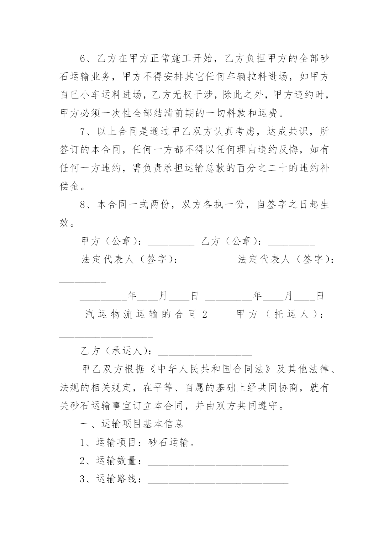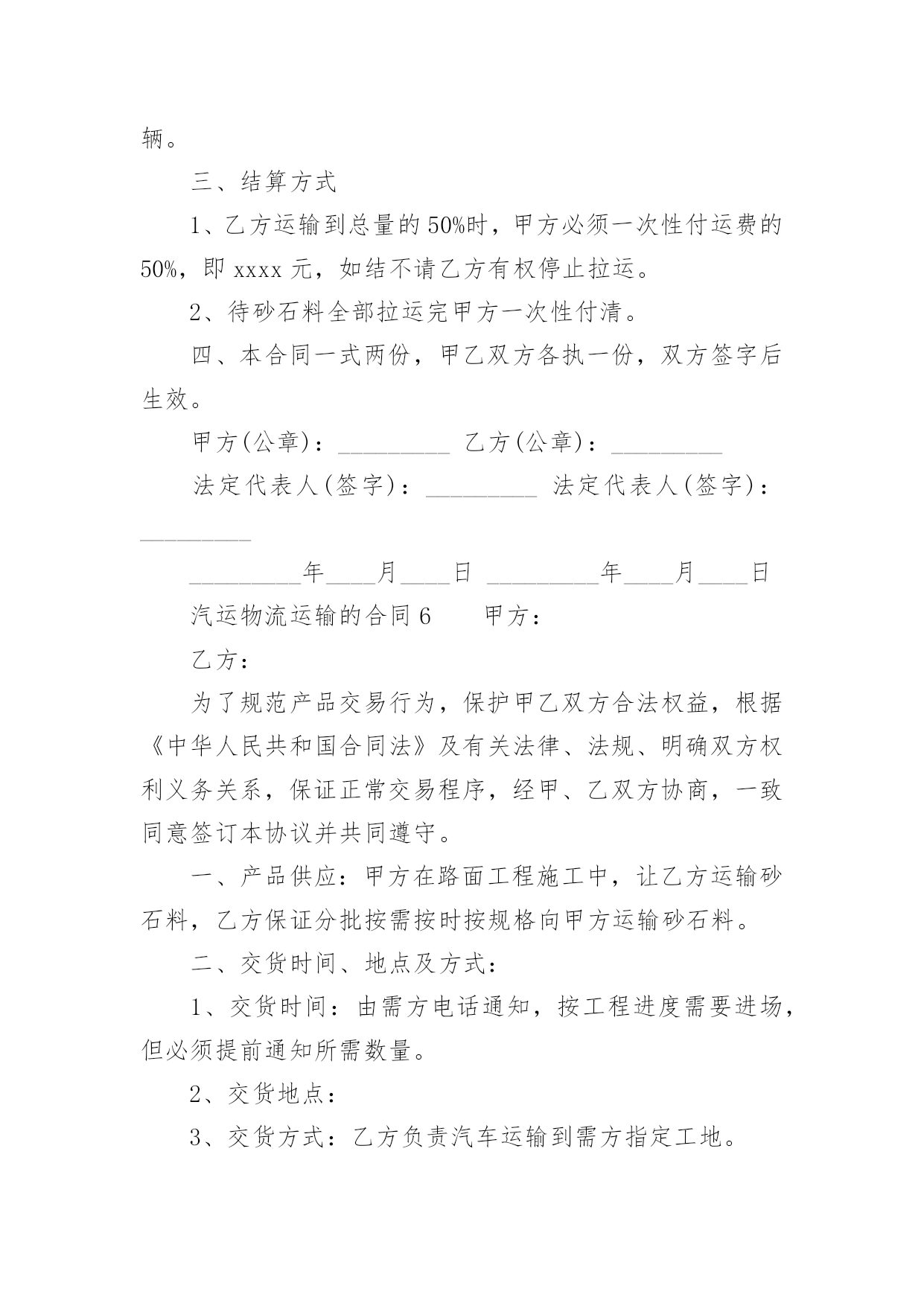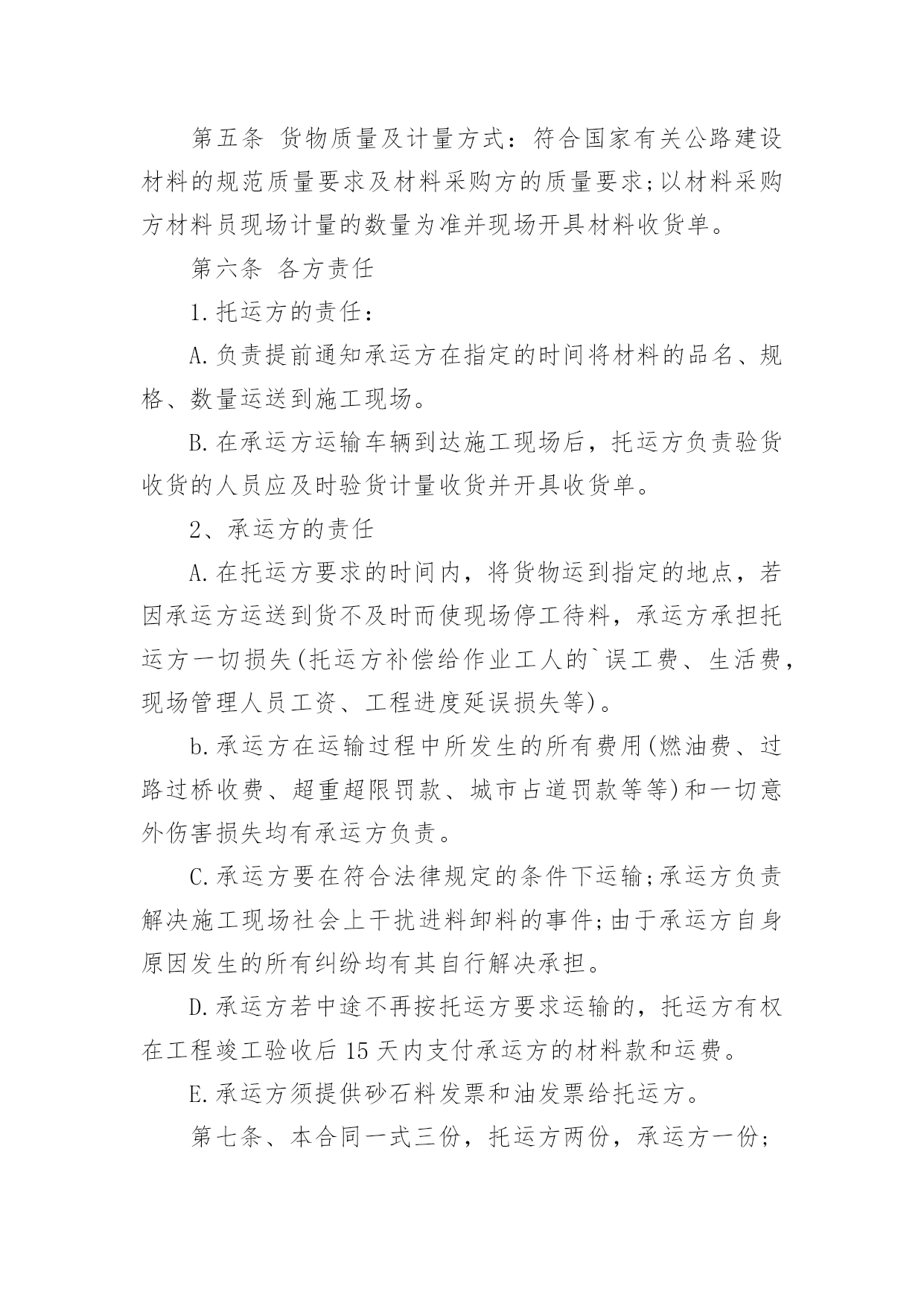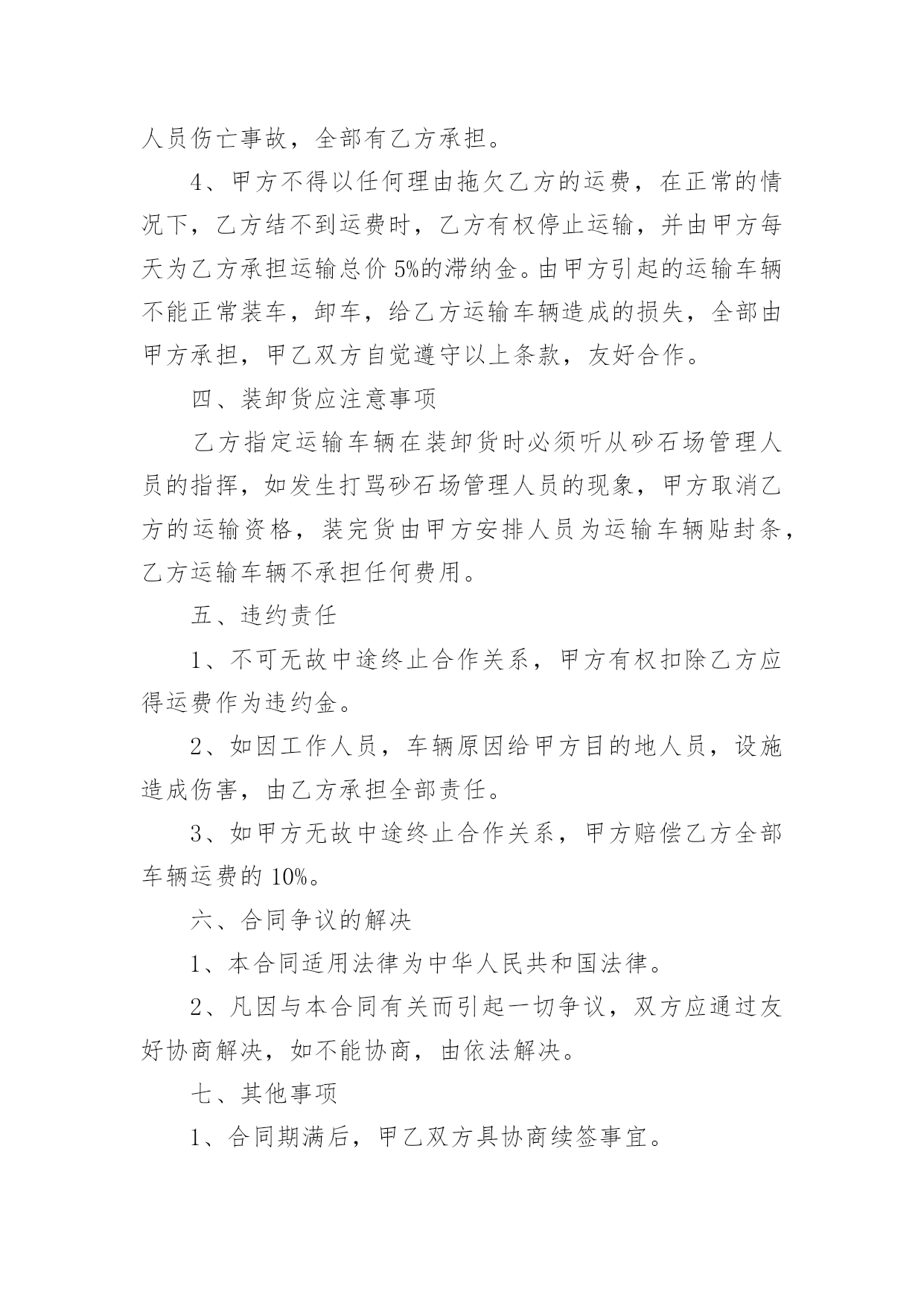 汽运物流运输的合同汽运物流运输的合同(精选7篇)现今社会公众的法律意识不断增强,合同起到的作用越来越大,合同能够促使双方正确行使权力,严格履行义务。那么一般合同是怎么起草的呢?下面是小编收集整理的汽运物流运输的合同(精选7篇),仅供参考,希望能够帮助到大家。汽运物流运输的合同1甲方(以下简称甲方):乙方(以下简称乙方):一、甲方型双桥车辆可供甲方砂石运输使用,经甲乙双方多次协商达成共识,甲方同意使用乙方车辆运输甲方全部砂石,现达成协议如下:二、具体协商细节项目条款如下:1、甲方所需用砂石料由乙方提供,乙方运到甲方使用料场,按河砂每立方元人民币结算。2、甲方所使用石子,乙方运到料场按每立方3、付款办法:乙方给甲方每运输满一万元钱的材料和运费,甲方按百分之五十当场结算清楚。4、乙方给甲方所运输的所下欠的百分之五十余款,甲方必须在20xx年12月31日之内全部给乙方结算清楚款项。5、甲方邀请乙方担任的砂石运输,乙方不得以任何理由拖延甲方拖工用料,否则,造成停工待料,由乙方负责担任。6、乙方在甲方正常施工开始,乙方负担甲方的全部砂石运输业务,甲方不得安排其它任何车辆拉料进场,如甲方自已小车运料进场,乙方无权干涉,除此之外,甲方违约时,甲方必须一次性全部结清前期的一切料款和运费。7、以上合同是通过甲乙双方认真考虑,达成共识,所签订的本合同,任何一方都不得以任何理由违约反悔,如有任何一方违约,需负责承担运输总款的百分之二十的违约补偿金。8、本合同一式两份,双方各执一份,自签字之日起生效。甲方(公章):_________乙方(公章):_________法定代表人(签字):_________法定代表人(签字):__________________年____月____日_________年____月____日汽运物流运输的合同2甲方(托运人):__________________乙方(承运人):__________________甲乙双方根据《中华人民共和国合同法》及其他法律、法规的相关规定,在平等、自愿的基础上经共同协商,就有关砂石运输事宜订立本合同,并由双方共同遵守。一、运输项目基本信息1、运输项目:砂石运输。2、运输数量:___________________________3、运输路线:___________________________4、运输时间:___________________________二、运输价格、结算方式及损耗1、运输价格:_____元/吨(不含税),运输方式为_________运输,在乙方按照甲方指定的时间、地点卸完货。2、结算方式1)甲方验收后,乙方提供支付运费的所有票据,到甲方结算支付运费。2)乙方应出具磅单及运输发生的所有费用票据,作为运费的结算依据,货物亏损限额在单车_________公斤以内,超出部分按所货物价值折款扣除每吨_________元。3)甲方不得有任何理由不予结算(除节假日外,甲乙双方共同协商)。3、损耗:给予乙方在运输过程中的正常损耗为_________公斤,超出正常损耗的_________元/吨赔付甲方。三、甲乙双方的责任和义务1、乙方在运输途中,不得给货物浇水,如有管理人员发现,取消该车的运输资格。到达卸货地点,由甲方安排人员,过磅,验收,出具过磅单并签字。验收时,如发现封条有损毁现象,甲方有权扣留该车,查清原因,方可卸车,不为乙方承担任何停车费用。2、在验收时,如发现有换砂石的现象,甲方有权扣留该车,并处以砂石总价5倍的罚款,甲方不承担任何停车费用。并取消乙方的的运输资格。3、在运输途中发生的交通事故,以及装卸场地发生的人员伤亡事故,全部有乙方承担。4、甲方不得以任何理由拖欠乙方的运费,在正常的情况下,乙方结不到运费时,乙方有权停止运输,并由甲方每天为乙方承担运输总价5%的滞纳金。由甲方引起的运输车辆不能正常装车,卸车,给乙方运输车辆造成的损失,全部由甲方承担,甲乙双方自觉遵守以上条款,友好合作。四、装卸货应注意事项乙方指定运输车辆在装卸货时必须听从砂石场管理人员的指挥,如发生打骂砂石场管理人员的现象,甲方取消乙方的运输资格,装完货由甲方安排人员为运输车辆贴封条,乙方运输车辆不承担任何费用。五、违约责任1、不可无故中途终止合作关系,甲方有权扣除乙方应得运费作为违约金。2、如因工作人员,车辆原因给甲方目的地人员,设施造成伤害,由乙方承担全部责任。3、如甲方无故中途终止合作关系,甲方赔偿乙方全部车辆运费的10%。六、合同争议的解决1、本合同适用法律为中华人民共和国法律。2、凡因与本合同有关而引起一切争议,双方应通过友好协商解决,如不能协商,由依法解决。七、其他事项1、合同期满后,甲乙双方具协商续签事宜。2、未尽事宜,双方另行协商。3、本合同有效期:自______年______月__