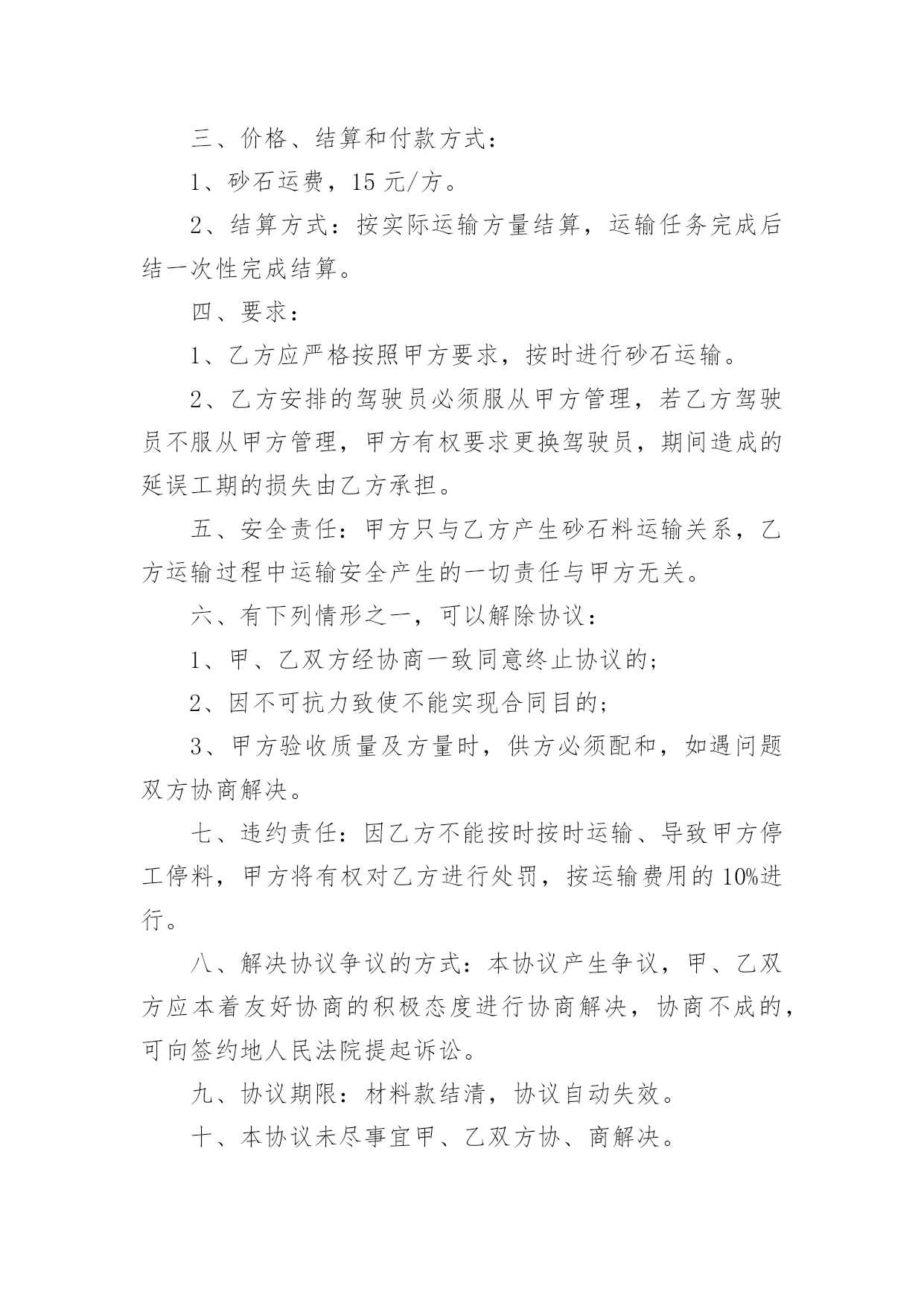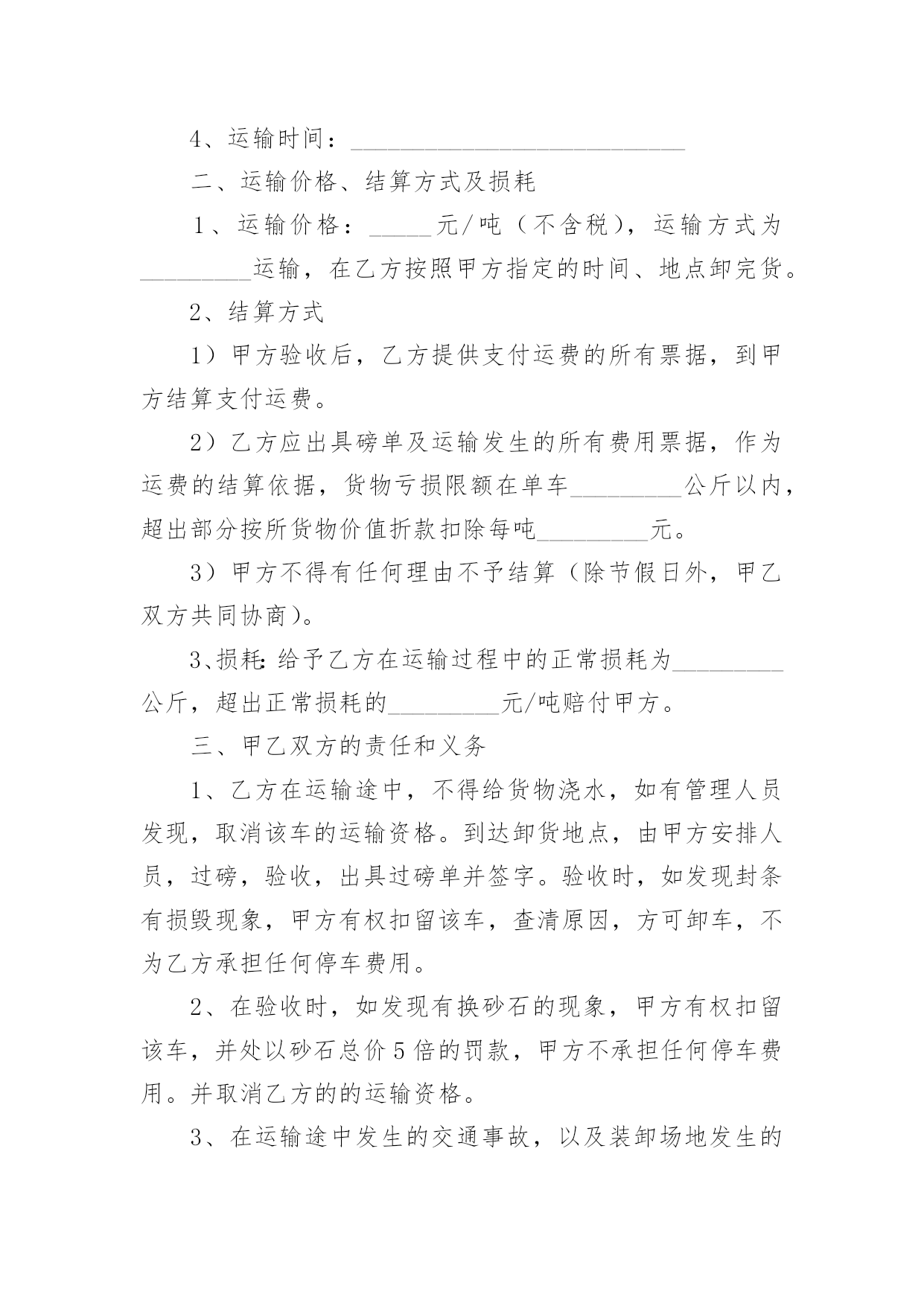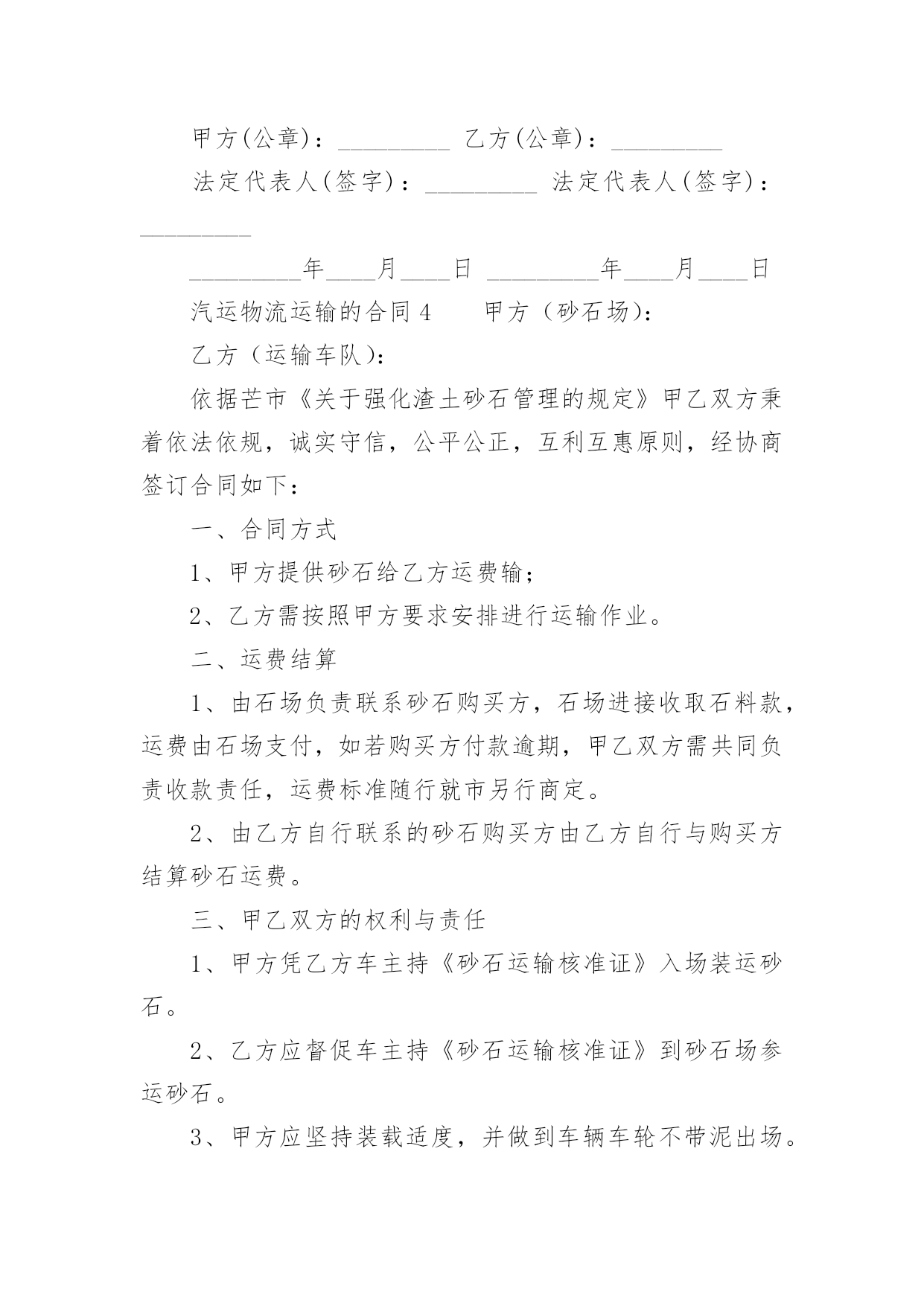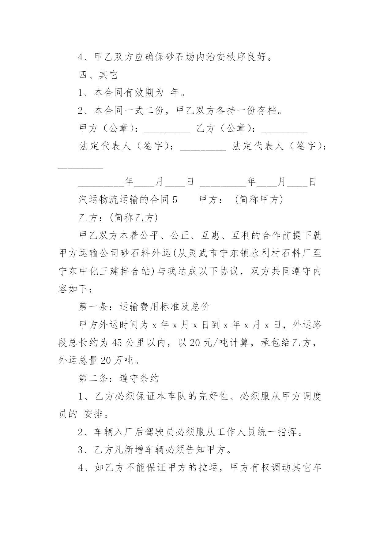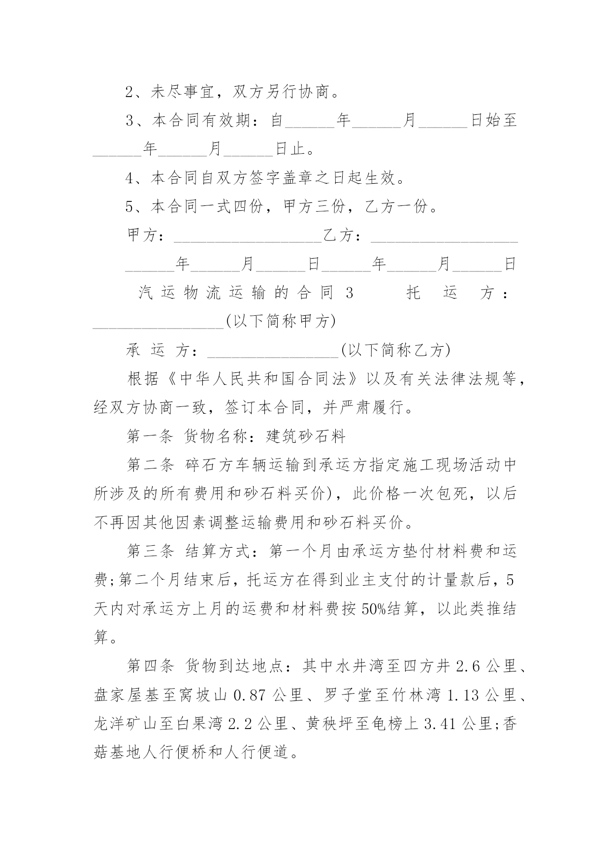 汽运物流运输的合同汽运物流运输的合同(精选7篇)现今社会公众的法律意识不断增强,合同起到的作用越来越大,合同能够促使双方正确行使权力,严格履行义务。那么一般合同是怎么起草的呢?下面是小编收集整理的汽运物流运输的合同(精选7篇),仅供参考,希望能够帮助到大家。汽运物流运输的合同1甲方(以下简称甲方):乙方(以下简称乙方):一、甲方型双桥车辆可供甲方砂石运输使用,经甲乙双方多次协商达成共识,甲方同意使用乙方车辆运输甲方全部砂石,现达成协议如下:二、具体协商细节项目条款如下:1、甲方所需用砂石料由乙方提供,乙方运到甲方使用料场,按河砂每立方元人民币结算。2、甲方所使用石子,乙方运到料场按每立方3、付款办法:乙方给甲方每运输满一万元钱的材料和运费,甲方按百分之五十当场结算清楚。4、乙方给甲方所运输的所下欠的百分之五十余款,甲方必须在20xx年12月31日之内全部给乙方结算清楚款项。5、甲方邀请乙方担任的砂石运输,乙方不得以任何理由拖延甲方拖工用料,否则,造成停工待料,由乙方负责担任。6、乙方在甲方正常施工开始,乙方负担甲方的全部砂石运输业务,甲方不得安排其它任何车辆拉料进场,如甲方自已小车运料进场,乙方无权干涉,除此之外,甲方违约时,甲方必须一次性全部结清前期的一切料款和运费。7、以上合同是通过甲乙双方认真考虑,达成共识,所签订的本合同,任何一方都不得以任何理由违约反悔,如有任何一方违约,需负责承担运输总款的百分之二十的违约补偿金。8、本合同一式两份,双方各执一份,自签字之日起生效。甲方(公章):_________乙方(公章):_________法定代表人(签字):_________法定代表人(签字):__________________年____月____日_________年____月____日汽运物流运输的合同2甲方(托运人):__________________乙方(承运人):__________________甲乙双方根据《中华人民共和国合同法》及其他法律、法规的相关规定,在平等、自愿的基础上经共同协商,就有关砂石运输事宜订立本合同,并由双方共同遵守。一、运输项目基本信息1、运输项目:砂石运输。2、运输数量:___________________________3、运输路线:___________________________4、运输时间:___________________________二、运输价格、结算方式及损耗1、运输价格:_____元/吨(不含税),运输方式为_________运输,在乙方按照甲方指定的时间、地点卸完货。2、结算方式1)甲方验收后,乙方提供支付运费的所有票据,到甲方结算支付运费。2)乙方应出具磅单及运输发生的所有费用票据,作为运费的结算依据,货物亏损限额在单车_________公斤以内,超出部分按所货物价值折款扣除每吨_________元。3)甲方不得有任何理由不予结算(除节假日外,甲乙双方共同协商)。3、损耗:给予乙方在运输过程中的正常损耗为_________公斤,超出正常损耗的_________元/吨赔付甲方。三、甲乙双方的责任和义务1、乙方在运输途中,不得给货物浇水,如有管理人员发现,取消该车的运输资格。到达卸货地点,由甲方安排人员,过磅,验收,出具过磅单并签字。验收时,如发现封条有损毁现象,甲方有权扣留该车,查清原因,方可卸车,不为乙方承担任何停车费用。2、在验收时,如发现有换砂石的现象,甲方有权扣留该车,并处以砂石总价5倍的罚款,甲方不承担任何停车费用。并取消乙方的的运输资格。3、在运输途中发生的交通事故,以及装卸场地发生的人员伤亡事故,全部有乙方承担。4、甲方不得以任何理由拖欠乙方的运费,在正常的情况下,乙方结不到运费时,乙方有权停止运输,并由甲方每天为乙方承担运输总价5%的滞纳金。由甲方引起的运输车辆不能正常装车,卸车,给乙方运输车辆造成的损失,全部由甲方承担,甲乙双方自觉遵守以上条款,友好合作。四、装卸货应注意事项乙方指定运输车辆在装卸货时必须听从砂石场管理人员的指挥,如发生打骂砂石场管理人员的现象,甲方取消乙方的运输资格,装完货由甲方安排人员为运输车辆贴封条,乙方运输车辆不承担任何费用。五、违约责任1、不可无故中途终止合作关系,甲方有权扣除乙方应得运费作为违约金。2、如因工作人员,车辆原因给甲方目的地人员,设施造成伤害,由乙方承担全部责任。3、如甲方无故中途终止合作关系,甲方赔偿乙方全部车辆运费的10%。六、合同争议的解决1、本合同适用法律为中华人民共和国法律。2、凡因与本合同有关而引起一切争议,双方应通过友好协商解决,如不能协商,由依法解决。七、其他事项1、合同期满后,甲乙双方具协商续签事宜。2、未尽事宜,双方另行协商。3、本合同有效期:自______年______月__