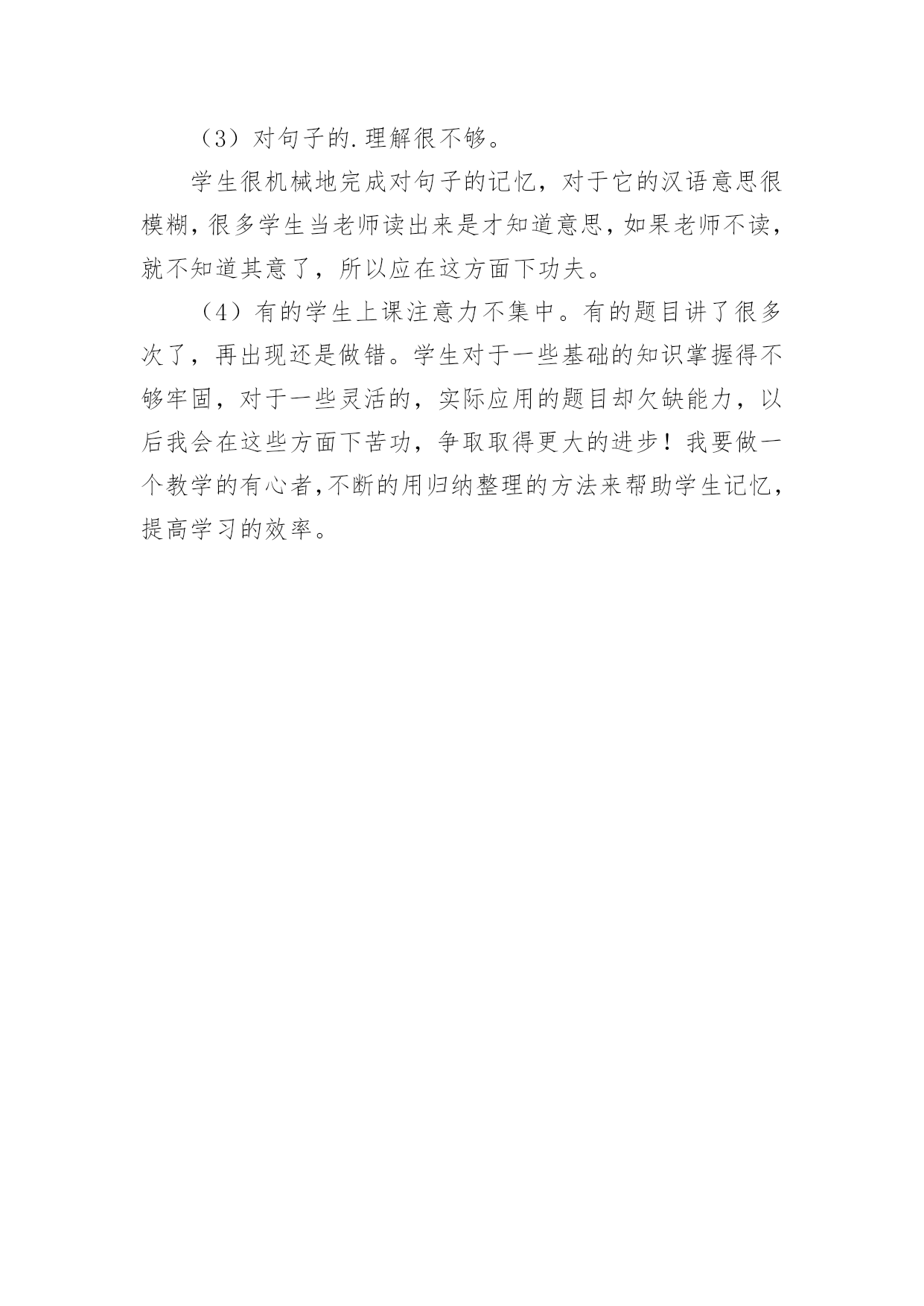 对期中考试反思对期中考试反思不知不觉期中就过去了,作为本学期学生学习情况和教师劳动成果的检验,本人对本阶段的教学做一反思,第12周多反思多进步期中考试反思。我觉得,知识的积累还是要靠平时一朝一夕点滴的积累,它讲求的是一个过程,课前预习,平时上课,课后复习,这都很重要。其实,期中检测也只是进行适当的整理与归纳,最关键的还是在平时。在这次期中检测中,我发现了四年级三个班普遍存在以下问题:(1)四会内容掌握不够熟练。据初步统计,全年级有百分之80%左右的学生在默写四会单词的时候有错误,这是最不应该的,也是最应该引起我们任课老师注意的地方,更是老师平时最应该注意的地基础的东西没有学会,那么学其他的东西都是空的,教学反思《第12周多反思多进步期中考试反思》。(2)对某些单词的具体意思理解不到位。平时高年级的老师也经常说,学生对于she和her,he和his等等单词是最容易混淆的。学生只理解单词字面的意思,没有把单词结合到句子整体性地理解,这也就失去了学习英语的真正意义。我们老师平时应加强单词和句子结合的练习,更应该结合生活,合理贴切。让学生理解学习英语真正含义,学以至用。(3)对句子的.理解很不够。学生很机械地完成对句子的记忆,对于它的汉语意思很模糊,很多学生当老师读出来是才知道意思,如果老师不读,就不知道其意了,所以应在这方面下功夫。(4)有的学生上课注意力不集中。有的题目讲了很多次了,再出现还是做错。学生对于一些基础的知识掌握得不够牢固,对于一些灵活的,实际应用的题目却欠缺能力,以后我会在这些方面下苦功,争取取得更大的进步!我要做一个教学的有心者,不断的用归纳整理的方法来帮助学生记忆,提高学习的效率。