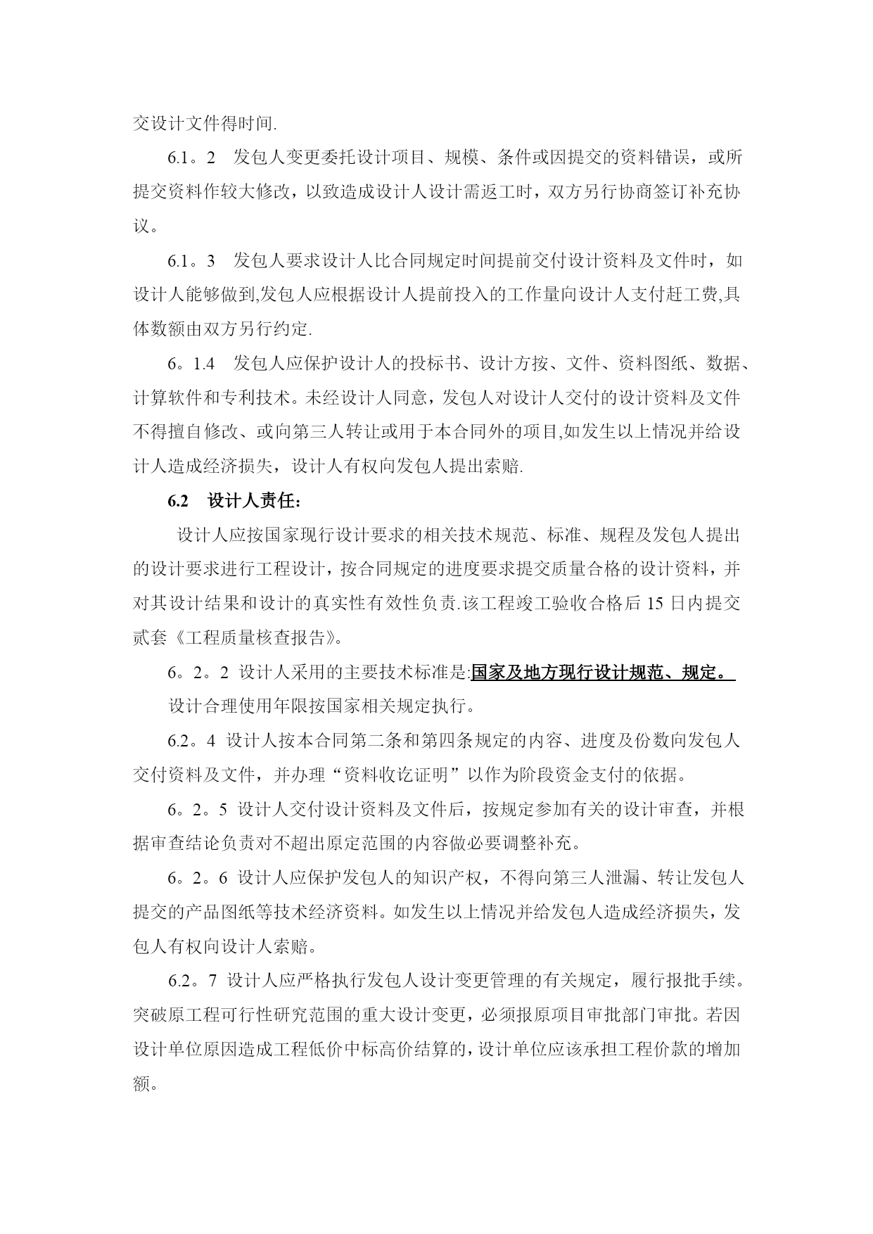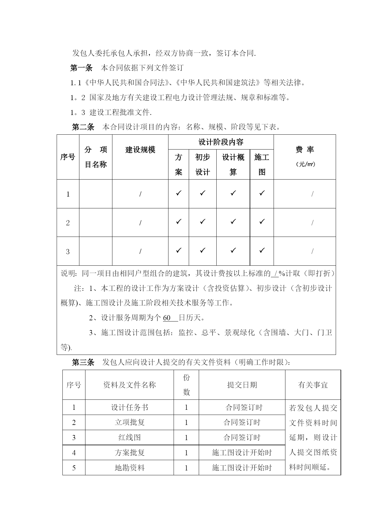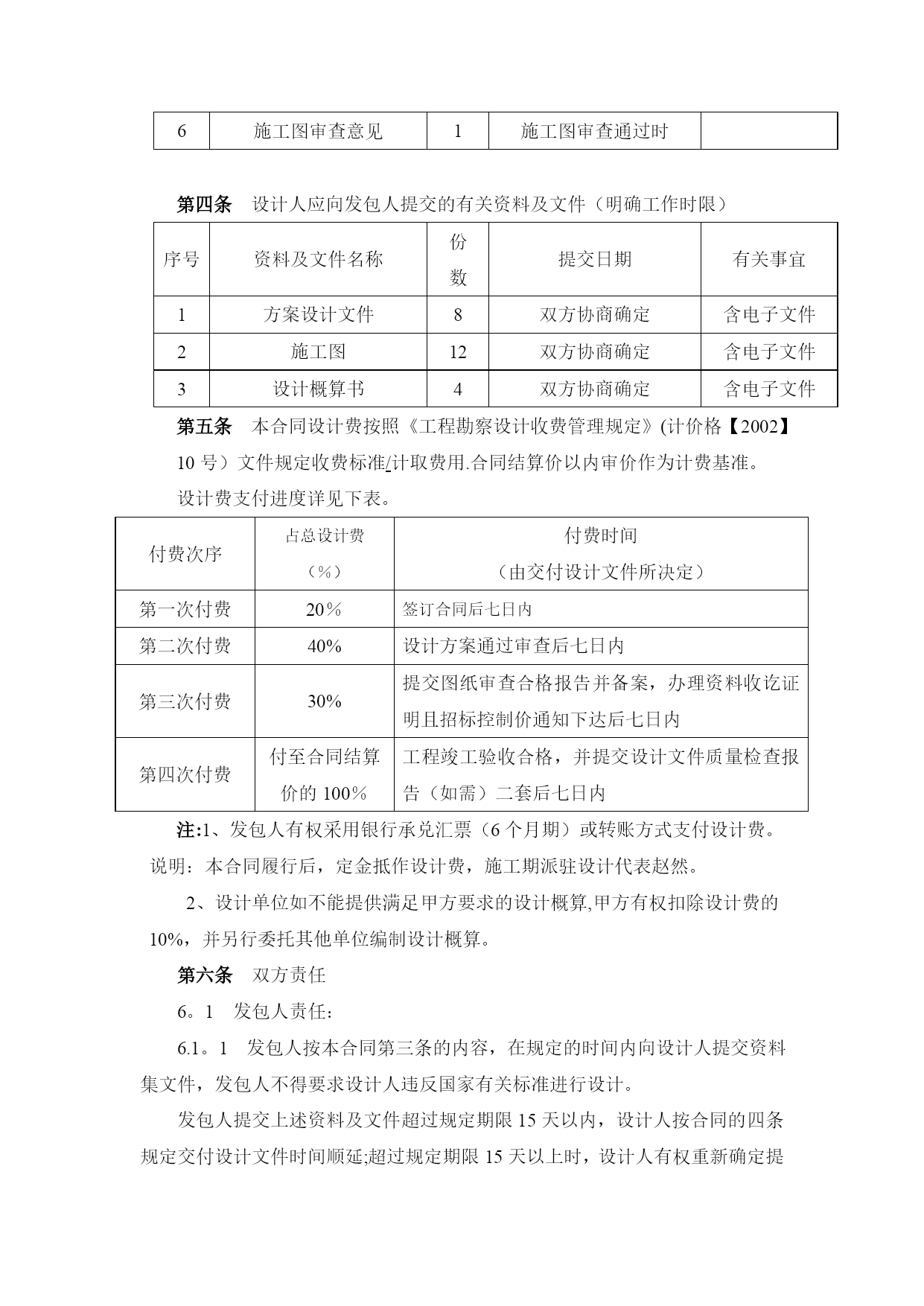 项目设计合同实用文档(实用文档,可以直接使用,可编辑优秀版资料,欢迎下载)建设工程设计合同合同编号:项目名称:发包人:承包人:签订日期:发包人委托承包人承担,经双方协商一致,签订本合同.第一条本合同依据下列文件签订1.1《中华人民共和国合同法》、《中华人民共和国建筑法》等相关法律。1。2国家及地方有关建设工程电力设计管理法规、规章和标准等。1。3建设工程批准文件.第二条本合同设计项目的内容:名称、规模、阶段等见下表。序号分项目名称建设规模设计阶段内容费率(元/㎡)方案初步设计设计概算施工图1//2//3//说明:同一项目由相同户型组合的建筑,其设计费按以上标准的/%计取(即打折)注:1、本工程的设计工作为方案设计(含投资估算)、初步设计(含初步设计概算)、施工图设计及施工阶段相关技术服务等工作。2、设计服务周期为个60日历天。3、施工图设计范围包括:监控、总平、景观绿化(含围墙、大门、门卫等).第三条发包人应向设计人提交的有关文件资料(明确工作时限):序号资料及文件名称份数提交日期有关事宜1设计任务书1合同签订时若发包人提交文件资料时间延期,则设计人提交图纸资料时间顺延。2立项批复1合同签订时3红线图1合同签订时4方案批复1施工图设计开始时5地勘资料1施工图设计开始时6施工图审查意见1施工图审查通过时第四条设计人应向发包人提交的有关资料及文件(明确工作时限)序号资料及文件名称份数提交日期有关事宜1方案设计文件8双方协商确定含电子文件2施工图12双方协商确定含电子文件3设计概算书4双方协商确定含电子文件第五条本合同设计费按照《工程勘察设计收费管理规定》(计价格【2002】10号)文件规定收费标准/计取费用.合同结算价以内审价作为计费基准。设计费支付进度详见下表。付费次序占总设计费(%)付费时间(由交付设计文件所决定)第一次付费20%签订合同后七日内第二次付费40%设计方案通过审查后七日内第三次付费30%提交图纸审查合格报告并备案,办理资料收讫证明且招标控制价通知下达后七日内第四次付费付至合同结算价的100%工程竣工验收合格,并提交设计文件质量检查报告(如需)二套后七日内注:1、发包人有权采用银行承兑汇票(6个月期)或转账方式支付设计费。说明:本合同履行后,定金抵作设计费,施工期派驻设计代表赵然。2、设计单位如不能提供满足甲方要求的设计概算,甲方有权扣除设计费的10%,并另行委托其他单位编制设计概算。第六条双方责任6。1发包人责任:6.1。1发包人按本合同第三条的内容,在规定的时间内向设计人提交资料集文件,发包人不得要求设计人违反国家有关标准进行设计。发包人提交上述资料及文件超过规定期限15天以内,设计人按合同的四条规定交付设计文件时间顺延;超过规定期限15天以上时,设计人有权重新确定提交设计文件得时间.6.1。2发包人变更委托设计项目、规模、条件或因提交的资料错误,或所提交资料作较大修改,以致造成设计人设计需返工时,双方另行协商签订补充协议。6.1。3发包人要求设计人比合同规定时间提前交付设计资料及文件时,如设计人能够做到,发包人应根据设计人提前投入的工作量向设计人支付赶工费,具体数额由双方另行约定.6。1.4发包人应保护设计人的投标书、设计方按、文件、资料图纸、数据、计算软件和专利技术。未经设计人同意,发包人对设计人交付的设计资料及文件不得擅自修改、或向第三人转让或用于本合同外的项目,如发生以上情况并给设计人造成经济损失,设计人有权向发包人提出索赔.6.2设计人责任:设计人应按国家现行设计要求的相关技术规范、标准、规程及发包人提出的设计要求进行工程设计,按合同规定的进度要求提交质量合格的设计资料,并对其设计结果和设计的真实性有效性负责.该工程竣工验收合格后15日内提交贰套《工程质量核查报告》。6。2。2设计人采用的主要技术标准是:国家及地方现行设计规范、规定。设计合理使用年限按国家相关规定执行。6.2。4设计人按本合同第二条和第四条规定的内容、进度及份数向发包人交付资料及文件,并办理“资料收讫证明”以作为阶段资金支付的依据。6。2。5设计人交付设计资料及文件后,按规定参加有关的设计审查,并根据审查结论负责对不超出原定范围的内容做必要调整补充。6。2。6设计人应保护发包人的知识产权,不得向第三人泄漏、转让发包人提交的产品图纸等技术经济资料。如发生以上情况并给发包人造成经济损失,发包人有权向设计人索赔。6.2。7设计人应严格执行发包人设计变更管理的有关规定,履行报批手续。突破原工程可行性研究范围的重大设计变更,必须报原项目审批部门审批。若因设计单位原因造成工程低价中标高价结算的,设计单