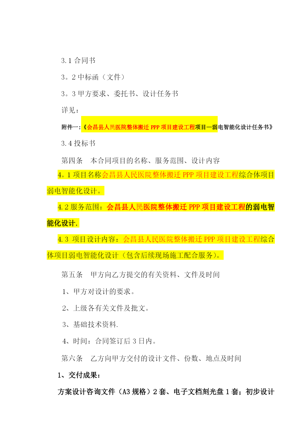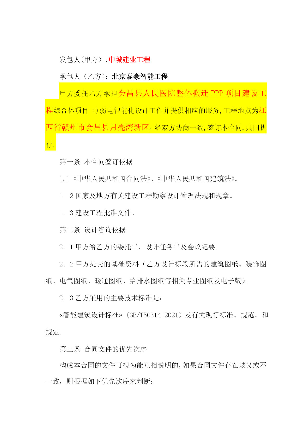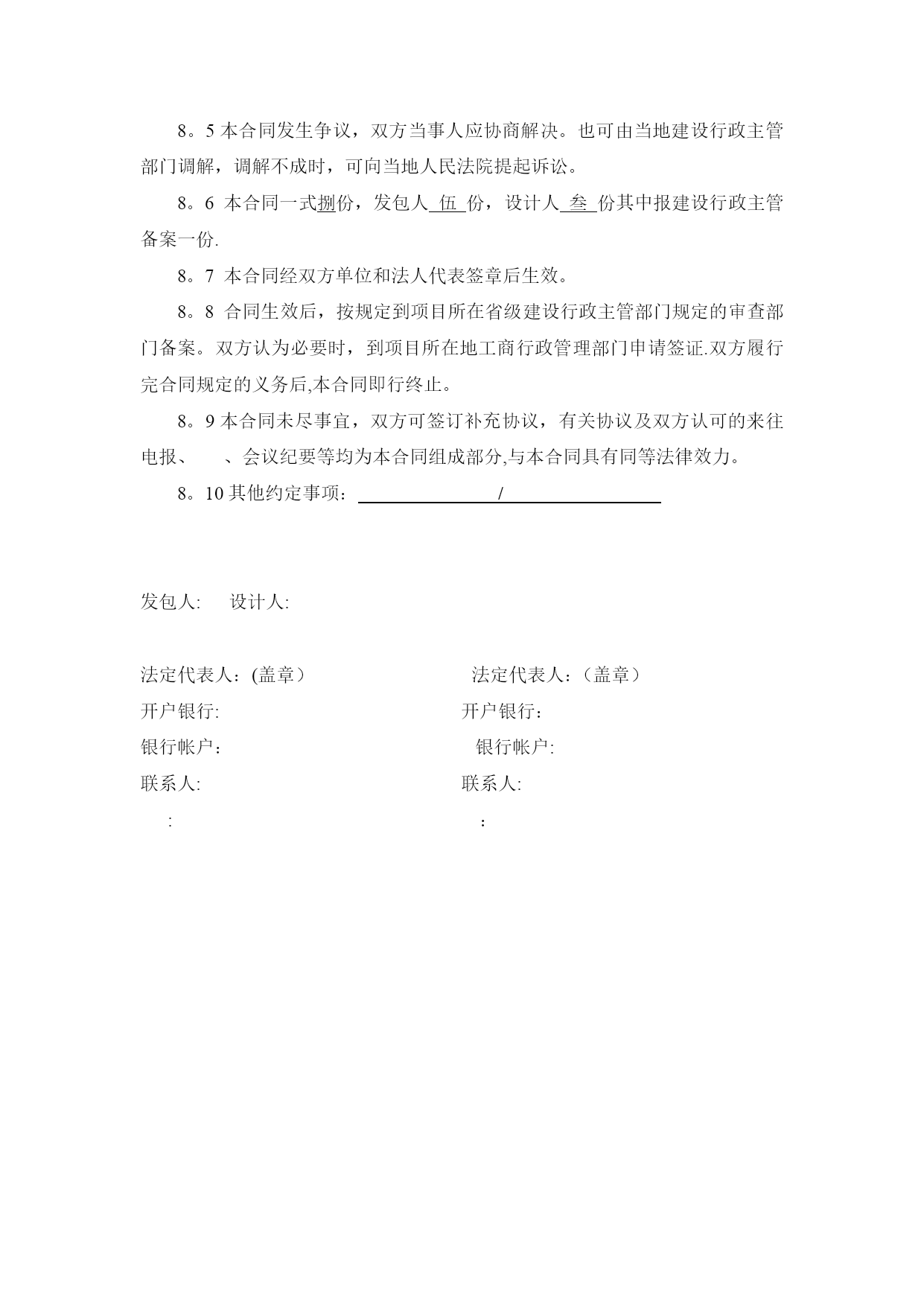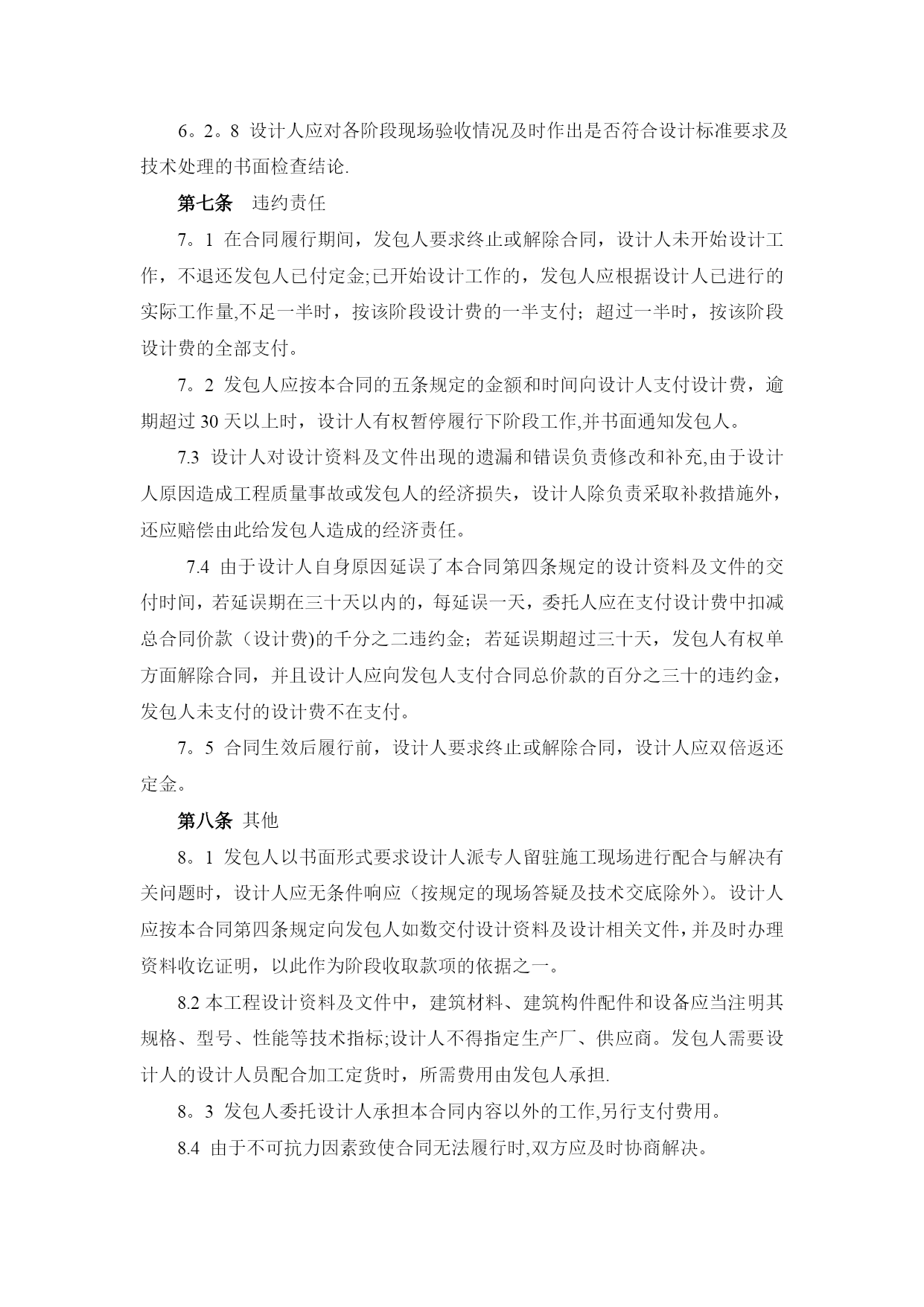 项目设计合同实用文档(实用文档,可以直接使用,可编辑优秀版资料,欢迎下载)建设工程设计合同合同编号:项目名称:发包人:承包人:签订日期:发包人委托承包人承担,经双方协商一致,签订本合同.第一条本合同依据下列文件签订1.1《中华人民共和国合同法》、《中华人民共和国建筑法》等相关法律。1。2国家及地方有关建设工程电力设计管理法规、规章和标准等。1。3建设工程批准文件.第二条本合同设计项目的内容:名称、规模、阶段等见下表。序号分项目名称建设规模设计阶段内容费率(元/㎡)方案初步设计设计概算施工图1//2//3//说明:同一项目由相同户型组合的建筑,其设计费按以上标准的/%计取(即打折)注:1、本工程的设计工作为方案设计(含投资估算)、初步设计(含初步设计概算)、施工图设计及施工阶段相关技术服务等工作。2、设计服务周期为个60日历天。3、施工图设计范围包括:监控、总平、景观绿化(含围墙、大门、门卫等).第三条发包人应向设计人提交的有关文件资料(明确工作时限):序号资料及文件名称份数提交日期有关事宜1设计任务书1合同签订时若发包人提交文件资料时间延期,则设计人提交图纸资料时间顺延。2立项批复1合同签订时3红线图1合同签订时4方案批复1施工图设计开始时5地勘资料1施工图设计开始时6施工图审查意见1施工图审查通过时第四条设计人应向发包人提交的有关资料及文件(明确工作时限)序号资料及文件名称份数提交日期有关事宜1方案设计文件8双方协商确定含电子文件2施工图12双方协商确定含电子文件3设计概算书4双方协商确定含电子文件第五条本合同设计费按照《工程勘察设计收费管理规定》(计价格【2002】10号)文件规定收费标准/计取费用.合同结算价以内审价作为计费基准。设计费支付进度详见下表。付费次序占总设计费(%)付费时间(由交付设计文件所决定)第一次付费20%签订合同后七日内第二次付费40%设计方案通过审查后七日内第三次付费30%提交图纸审查合格报告并备案,办理资料收讫证明且招标控制价通知下达后七日内第四次付费付至合同结算价的100%工程竣工验收合格,并提交设计文件质量检查报告(如需)二套后七日内注:1、发包人有权采用银行承兑汇票(6个月期)或转账方式支付设计费。说明:本合同履行后,定金抵作设计费,施工期派驻设计代表赵然。2、设计单位如不能提供满足甲方要求的设计概算,甲方有权扣除设计费的10%,并另行委托其他单位编制设计概算。第六条双方责任6。1发包人责任:6.1。1发包人按本合同第三条的内容,在规定的时间内向设计人提交资料集文件,发包人不得要求设计人违反国家有关标准进行设计。发包人提交上述资料及文件超过规定期限15天以内,设计人按合同的四条规定交付设计文件时间顺延;超过规定期限15天以上时,设计人有权重新确定提交设计文件得时间.6.1。2发包人变更委托设计项目、规模、条件或因提交的资料错误,或所提交资料作较大修改,以致造成设计人设计需返工时,双方另行协商签订补充协议。6.1。3发包人要求设计人比合同规定时间提前交付设计资料及文件时,如设计人能够做到,发包人应根据设计人提前投入的工作量向设计人支付赶工费,具体数额由双方另行约定.6。1.4发包人应保护设计人的投标书、设计方按、文件、资料图纸、数据、计算软件和专利技术。未经设计人同意,发包人对设计人交付的设计资料及文件不得擅自修改、或向第三人转让或用于本合同外的项目,如发生以上情况并给设计人造成经济损失,设计人有权向发包人提出索赔.6.2设计人责任:设计人应按国家现行设计要求的相关技术规范、标准、规程及发包人提出的设计要求进行工程设计,按合同规定的进度要求提交质量合格的设计资料,并对其设计结果和设计的真实性有效性负责.该工程竣工验收合格后15日内提交贰套《工程质量核查报告》。6。2。2设计人采用的主要技术标准是:国家及地方现行设计规范、规定。设计合理使用年限按国家相关规定执行。6.2。4设计人按本合同第二条和第四条规定的内容、进度及份数向发包人交付资料及文件,并办理“资料收讫证明”以作为阶段资金支付的依据。6。2。5设计人交付设计资料及文件后,按规定参加有关的设计审查,并根据审查结论负责对不超出原定范围的内容做必要调整补充。6。2。6设计人应保护发包人的知识产权,不得向第三人泄漏、转让发包人提交的产品图纸等技术经济资料。如发生以上情况并给发包人造成经济损失,发包人有权向设计人索赔。6.2。7设计人应严格执行发包人设计变更管理的有关规定,履行报批手续。突破原工程可行性研究范围的重大设计变更,必须报原项目审批部门审批。若因设计单位原因造成工程低价中标高价结算的,设计单