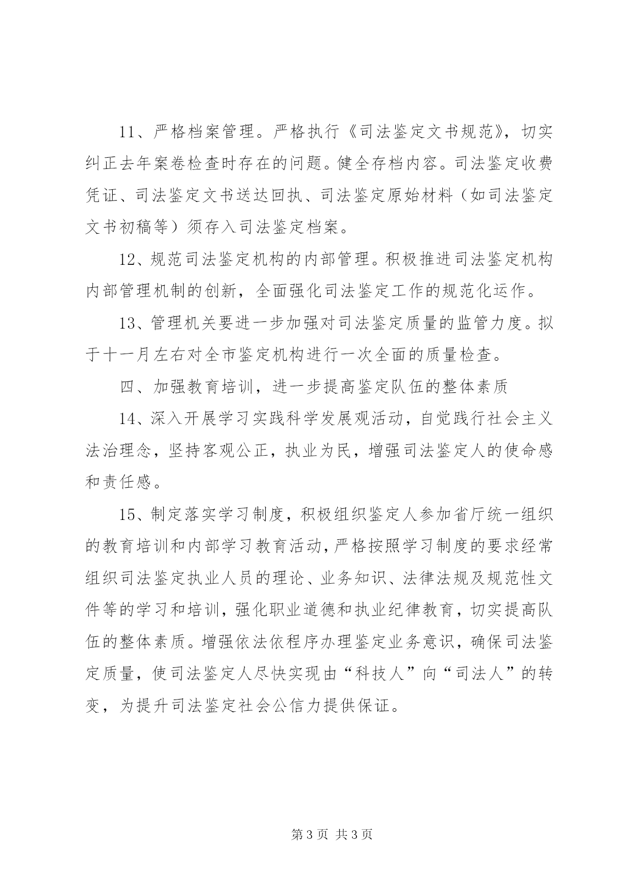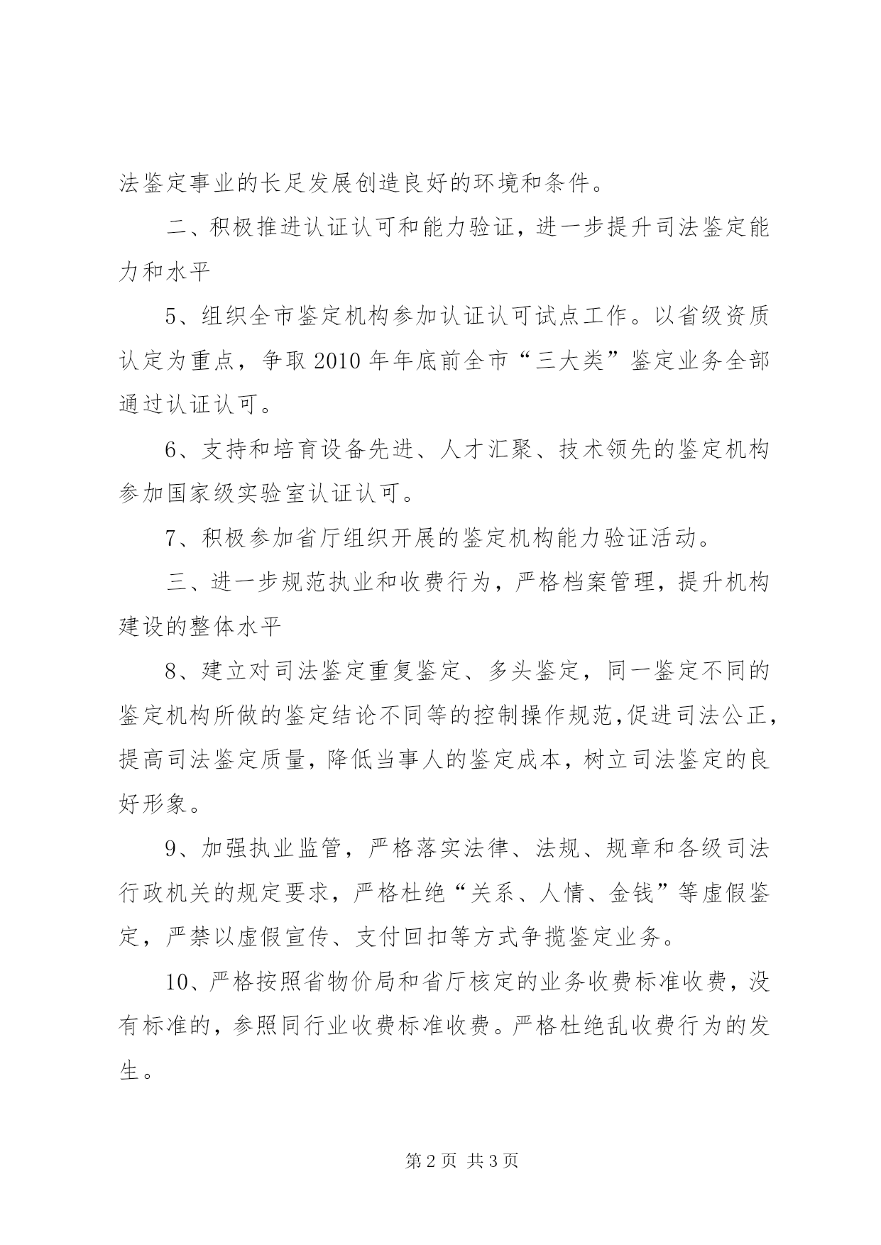 第PAGE\*Arabic\*MERGEFORMAT3页共NUMPAGES\*MERGEFORMAT3页司法鉴定工作要点2009年司法鉴定工作的总体思路是。以邓小平理论和“三个代表”重要思想为指导,全面贯彻落实科学发展观,认真贯彻全省司法行政工作会议精神,以提高和保障司法鉴定质量为核心,以推进司法鉴定机构认证认可为切入点,全面加强队伍建设、业务建设,强化质量管理,充分发挥司法鉴定服务科学发展,促进社会和谐稳定的职能作用,努力实现司法鉴定行业又好又快地发展。一、深入学习实践科学发展观,进一步推进司法鉴定管理体制改革1、深入开展学习实践科学发展观活动,认真查找司法鉴定工作在贯彻落实科学发展观方面存在的问题,积极探索符合司法鉴定工作长远发展的思路,研究制定司法鉴定工作发展规划,明确现阶段目标、任务和工作重点,加快我市司法鉴定科学发展的步伐。2、按照省司法厅部署做好省人大常委会对贯彻落实全国人大常委会《关于司法鉴定管理问题的决定》情况检查的准备工作。3、进一步加强与人民法院的联系,建立信息通报、工作协商等机制,积极协调解决司法鉴定管理与使用相关的问题。4、进一步增强竞争和发展意识,积极主动地协调好与(当地和外地)法院、公安、劳动、保险等部门和单位的关系,为司法鉴定事业的长足发展创造良好的环境和条件。二、积极推进认证认可和能力验证,进一步提升司法鉴定能力和水平5、组织全市鉴定机构参加认证认可试点工作。以省级资质认定为重点,争取2010年年底前全市“三大类”鉴定业务全部通过认证认可。6、支持和培育设备先进、人才汇聚、技术领先的鉴定机构参加国家级实验室认证认可。7、积极参加省厅组织开展的鉴定机构能力验证活动。三、进一步规范执业和收费行为,严格档案管理,提升机构建设的整体水平8、建立对司法鉴定重复鉴定、多头鉴定,同一鉴定不同的鉴定机构所做的鉴定结论不同等的控制操作规范,促进司法公正,提高司法鉴定质量,降低当事人的鉴定成本,树立司法鉴定的良好形象。9、加强执业监管,严格落实法律、法规、规章和各级司法行政机关的规定要求,严格杜绝“关系、人情、金钱”等虚假鉴定,严禁以虚假宣传、支付回扣等方式争揽鉴定业务。10、严格按照省物价局和省厅核定的业务收费标准收费,没有标准的,参照同行业收费标准收费。严格杜绝乱收费行为的发生。11、严格档案管理。严格执行《司法鉴定文书规范》,切实纠正去年案卷检查时存在的问题。健全存档内容。司法鉴定收费凭证、司法鉴定文书送达回执、司法鉴定原始材料(如司法鉴定文书初稿等)须存入司法鉴定档案。12、规范司法鉴定机构的内部管理。积极推进司法鉴定机构内部管理机制的创新,全面强化司法鉴定工作的规范化运作。13、管理机关要进一步加强对司法鉴定质量的监管力度。拟于十一月左右对全市鉴定机构进行一次全面的质量检查。四、加强教育培训,进一步提高鉴定队伍的整体素质14、深入开展学习实践科学发展观活动,自觉践行社会主义法治理念,坚持客观公正,执业为民,增强司法鉴定人的使命感和责任感。15、制定落实学习制度,积极组织鉴定人参加省厅统一组织的教育培训和内部学习教育活动,严格按照学习制度的要求经常组织司法鉴定执业人员的理论、业务知识、法律法规及规范性文件等的学习和培训,强化职业道德和执业纪律教育,切实提高队伍的整体素质。增强依法依程序办理鉴定业务意识,确保司法鉴定质量,使司法鉴定人尽快实现由“科技人”向“司法人”的转变,为提升司法鉴定社会公信力提供保证。