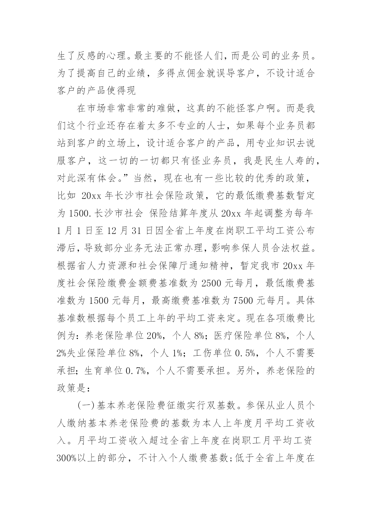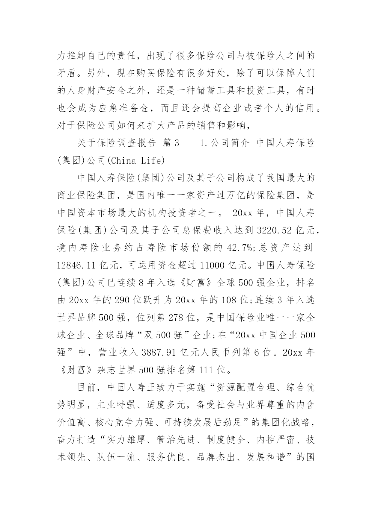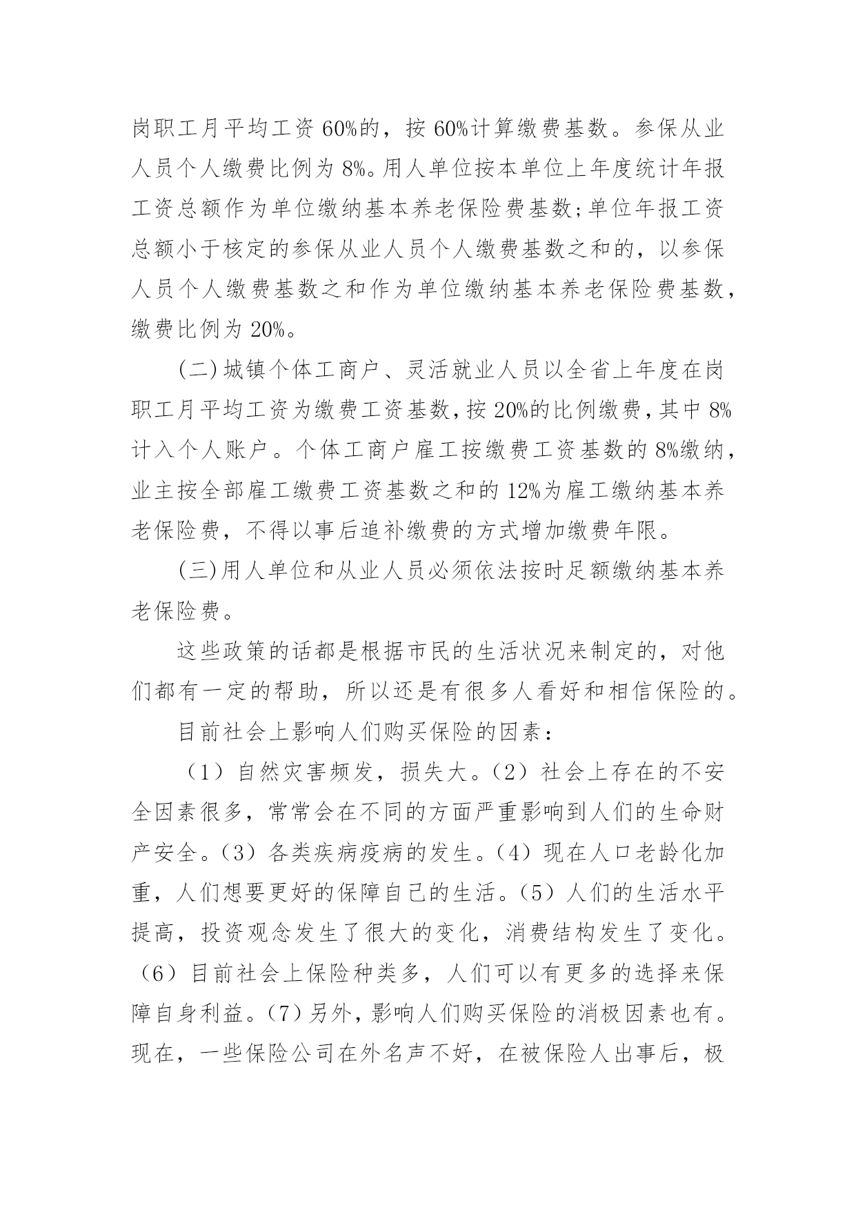 保险调查报告关于保险调查报告在日常生活和工作中,我们都不可避免地要接触到报告,不同种类的报告具有不同的用途。相信许多人会觉得报告很难写吧,以下是小编为大家收集的关于保险调查报告,供大家参考借鉴,希望可以帮助到有需要的朋友。关于保险调查报告篇1调研时间:20xx-10-2615:00调研地点:就业指导中心201公司简介:公司简介:中国平安保险股份有限公司是中国第一家以保险为核心的,融证券、信托、银行、资产管理、企业年金等多元金融业务为一体的紧密、高效、多元的综合金融服务集团。四川分公司简介:中国平安财产保险股份有限公司四川分公司是平安设在四川负责财产保险业务的省级分公司,成立于xxxx年,成为全省第二大财产保险公司。所获荣誉:连续五年进入“全球五百强”20xx年《福布斯》排行榜排名141名在中国内地上榜企业中排名第8。三度蝉联非国有企业第一名。连续十年被评为“中国最受尊敬的企业”。公司涉及业务:招聘岗位:工科学生的大致去向为财产保险的核保以及理赔岗位。招聘条件:性情品格:心理健康、承压能力职业精神:诚实守信、求真务实、动手能力、正面思维专业技能:办公软件、外语表达、核心技能:执行导向、团队协作、沟通协调、求知愿望工作环境:核保类:一般工作于公司办公室内理赔类:一般是奔波于各施工或事发现场公司中有健身房,员工休息区工资及福利:工资:以岗定薪,岗位不同,薪酬不同。结合个人绩效确定岗位薪酬,采用激励绩效,反映市场的政策。(绩效为主导),年底后10%的员工警戒,第二年还是后10%的员工面临淘汰。福利:薪酬福利:节日费,取暖/降温费,住房公积金,异地交流干部补贴社会保险:基本养老,医疗保险,工伤保险,失业保险,生育保险保障计划:员工综合福利保障计划,商业补充养老计划休假福利:假期强制休假,年休假,义务献血假,特殊奖励假(旅游),民族假等薪酬激励:考核激励,晋升调薪,季度、年度奖金,旅游、活动激励个人发展:员工成长轨迹:招聘---实习培训(系统培训)---规划成长(专人指导)---价值实现(竞争淘汰)员工升迁:管理发展:中层管理干部、初级管理干部、基层管理干部渠道发展:渠道发展总监。渠道经理、渠道服务专员技术发展:高级技术顾问、中级技术专家、初级技术人员(工科发展方向)(附:收入横向可比,投入倾斜渠道,人员横向流动)员工培训体系:平安形成了国内企业培训体系规模最大、覆盖面最广、课程体系最健全的企业人才发展平台。平安设有中国一流的企业大学—平安金融培训学院;其拥有一整套培训体系,为员工提供全方面的知识、培训技能。员工精英公司派来两名新员工讲解对公司的理解及感受,其中两个全部来自于水利水电工程专业。一名女学姐在市场营销部门工作,另一名男学长就职于国际业务部。问题提问:1请问贵公司具体招多少工科类的学生?答:大约招60名产险的员工。2请问贵公司招非211院校的学生吗?答:我们对学生的学科不看重,我们不要求最好,只要求最合适,所以非211院校没问题。只要有学位证和毕业证就行。四、六级不过也没关系。3请问贵公司最看重应聘的学生的什么素质?是不是在学生会工作的会有优势呢?答:学生会的`主席可能表达能力或者其他能力强一点,但是这是把双刃剑,我们随之对他的期望也会更高,到时面试的时侯达不到我们的预期值,那也不是件好事。4我暑假曾经在贵公司做过假期实习,请问应聘的话是否会有优势?答:这个问题也是一样,也是把双刃剑,我们对你的期望值会更高,但是你在我们公司实习过,相信你会对我们公司的文化、节奏、工作会更加熟悉,应该会更有胜算。个人感想:培训多,竞争大,重业绩,招聘流程:宣讲会—笔试(东三教)--筛选简历—初试—复试—体检—评议—录用调研人:张涛调研时间:20xx-10-26关于保险调查报告篇2现在,保险开始渐渐成小康生活所需必备的新“三大件”之一,与住房、汽车平起平坐。许多专业人士认为,人生需要的保障层次为:第一安全,第二健康,第三子女得到良好的教育,第四老人得到良好的赡养,第五规避职业风险。因此,对于一个家庭而言,最具有经济价值的人是家庭的经济支柱。因而,家庭支柱最需要保险。如果我们是家庭支柱,那么保险对我们而言是爱心、责任以及一如既往的承诺,里面有对父母的反哺之情、有对子女的殷殷期盼、有对配偶的绵绵爱意、更有对生命尊严的无限尊崇。保险是一种非常好的理财工具。理财首先是保证既有财产安全性,比如说现代社会有很多的理财方式,包括银行储蓄、股票投资、基金产品、房产投资、外汇、期权、期货古玩等等,而保险作为一种理财产品唯一不可替代的是对既有资产的一种保全。这种“既有资产”甚至包括人本身,从某种意义来说,每个人都有两个生命,一个是“自然的生命”,另一个就是“经济生命”。每个生活在这个世界上的人都对家人承担一种责任,这种责任可以有很多的表现方式。保险就是一种很好的体