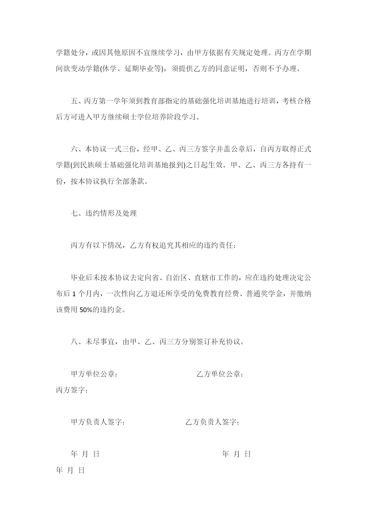 硕士学位研究生定向协议书格式甲方(招生单位):乙方(定向省、自治区、直辖市教育行政部门):丙方(定向生本人):根据《20年“少数民族高层次骨干人才计划”招生管理办法》,就丙方攻读硕士学位研究生事宜,甲、乙、丙三方经协商达成如下协议:一、甲方为乙方录取丙方为20年____________专业攻读硕士学位研究生。二、甲方根据《普通高等学校学生管理规定》对丙方进行管理,按培养方案对丙方进行培养。甲方按学校规定向丙方发放硕士研究生普通奖助学金。丙方学习期满、符合硕士研究生毕业条件,甲方准予毕业,符合硕士学位授予条件,甲方授予硕士学位。丙方学习结束离校后,甲方将丙方的毕业证书、学位证书、硕士期间档案等一并直接寄送乙方,乙方负责指导丙方就业。三、丙方人事档案、户口转入甲方。党、团组织关系转入基础培训学校,基础培训结业考核合格后转入甲方,丙方在甲方的学习结束后必须回到乙方所在省、自治区、直辖市就业,且服务年限不得少于5年。甲方在丙方毕业后负责将其人事档案、户口及党、团组织关系直接转回到乙方。四、丙方必须遵守学籍管理规定等各项规章制度,按时完成学业。丙方在校期间受警告、记过、留校察看等处分,由甲方通知乙方。丙方中途退学、受开除学籍处分,或因其他原因不宜继续学习,由甲方依据有关规定处理。丙方在学期间欲变动学籍(休学、延期毕业等),须提供乙方的同意证明,否则不予办理。五、丙方第一学年须到教育部指定的基础强化培训基地进行培训,考核合格后方可进入甲方继续硕士学位培养阶段学习。六、本协议一式三份,经甲、乙、丙三方签字并盖公章后,自丙方取得正式学籍(到民族硕士基础强化培训基地报到)之日起生效。甲、乙、丙三方各持有一份,按本协议执行全部条款。七、违约情形及处理丙方有以下情况,乙方有权追究其相应的违约责任:毕业后未按本协议去定向省、自治区、直辖市工作的,应在违约处理决定公布后1个月内,一次性向乙方退还所享受的免费教育经费、普通奖学金,并缴纳该费用50%的违约金。八、未尽事宜,由甲、乙、丙三方分别签订补充协议。甲方单位公章:乙方单位公章:丙方签字:甲方负责人签字:乙方负责人签字:年月日年月日年月日