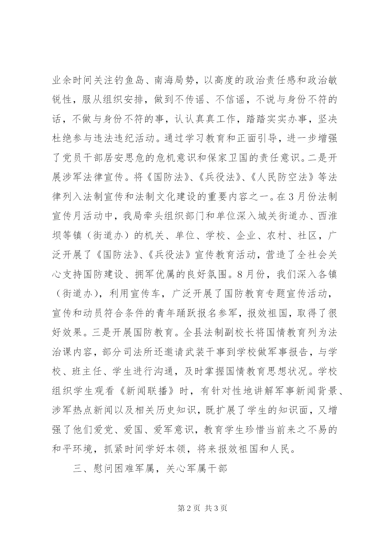 第PAGE\*Arabic\*MERGEFORMAT3页共NUMPAGES\*MERGEFORMAT3页司法局年双拥工作总结现将我局《2015年“双拥”工作总结》随文报来,请审阅。2015年12月2日2015年“双拥”工作总结2015年,我局“双拥”工作在县委、政府的正确领导下,认真学习贯彻党十八届四中、五中全会精神,结合实际,立足本职,服务大局,积极开展形式多样的“双拥”活动,巩固和加强军民团结,营造了“拥军优属、拥政爱民”的浓厚氛围,取得了一定成绩。现总结如下:一、加强组织领导,夯实工作责任我局高度重视“双拥”工作,将双拥工作纳入重要议事日程,成立了由局长任组长、副局长任副组长,局属单位和科室负责人为成员的双拥工作领导小组,明确职责,夯实任务,定期督导,严格考核,为圆满完成双拥工作打下坚实的基础。二、开展国防教育,提高国防意识一是组织学习国防知识。利用全体干警大会,组织系统干警职工认真学习了习总书记《在中央军委深化国防和军队改革领导小组举行第一次全体会议上的讲话》精神和“2015年征兵政策”。组织干警利用报刊、杂志和网络,学习了钓鱼岛、反恐、南海等问题的历史渊源、争议背景和现状,并以此开展国情教育,使广大干警对国防安全有了明晰的认识。在平时,引导干警利用业余时间关注钓鱼岛、南海局势,以高度的政治责任感和政治敏锐性,服从组织安排,做到不传谣、不信谣,不说与身份不符的话,不做与身份不符的事,认认真真工作,踏踏实实办事,坚决杜绝参与违法违纪活动。通过学习教育和正面引导,进一步增强了党员干部居安思危的危机意识和保家卫国的责任意识。二是开展涉军法律宣传。将《国防法》、《兵役法》、《人民防空法》等法律列入法制宣传和法制文化建设的重要内容之一。在3月份法制宣传月活动中,我局牵头组织部门和单位深入城关街道办、西淮坝等镇(街道办)的机关、单位、学校、企业、农村、社区,广泛开展了《国防法》、《兵役法》宣传教育活动,营造了全社会关心支持国防建设、拥军优属的良好氛围。8月份,我们深入各镇(街道办),利用宣传车,广泛开展了国防教育专题宣传活动,宣传和动员符合条件的青年踊跃报名参军,报效祖国,取得了很好效果。三是开展国防教育。全县法制副校长将国情教育列为法治课内容,部分司法所还邀请武装干事到学校做军事报告,与学校、班主任、学生进行沟通,及时掌握国情教育思想状况。学校组织学生观看《新闻联播》时,有针对性地讲解军事新闻背景、涉军热点新闻以及相关历史知识,既扩展了学生的知识面,又增强了他们爱党、爱国、爱军意识,教育学生珍惜当前来之不易的和平环境,抓紧时间学好本领,将来报效祖国和人民。三、慰问困难军属,关心军属干部春节前后,局领导深入结对帮扶的仙台坝镇娘娘坝村,走访、慰问了2户困难军属家庭,把党的温暖送到军属家中,还详细了解他们的生产生活状况,帮助他们解决生活中遇到的困难;深入系统军属家中,看望了3名军转老干部,受到了军属的好评。在开展“结对帮扶”工作中,将包扶村军烈属家庭作为帮扶重点,局领导下乡时,经常关心、过问军烈属家庭生产生活状况,使他们感受到党和政府的温暖。局工会十分重视系统军转干部和离退休干部军属工作生活,军属干部遇到困难和生病时,工会都要安排专人进行慰问和关照,使他们深切体会军人的自豪感和责任感。一年来,虽然我局“双拥”工作取得了一些成效,但与县委、政府的要求和“双拥”工作的需要还有一定差距。今后,我们将在巩固工作成效的同时,再接再厉,不断拓宽工作渠道,扎实认真地做好双拥工作,为全县经济社会发展做出应有贡献。