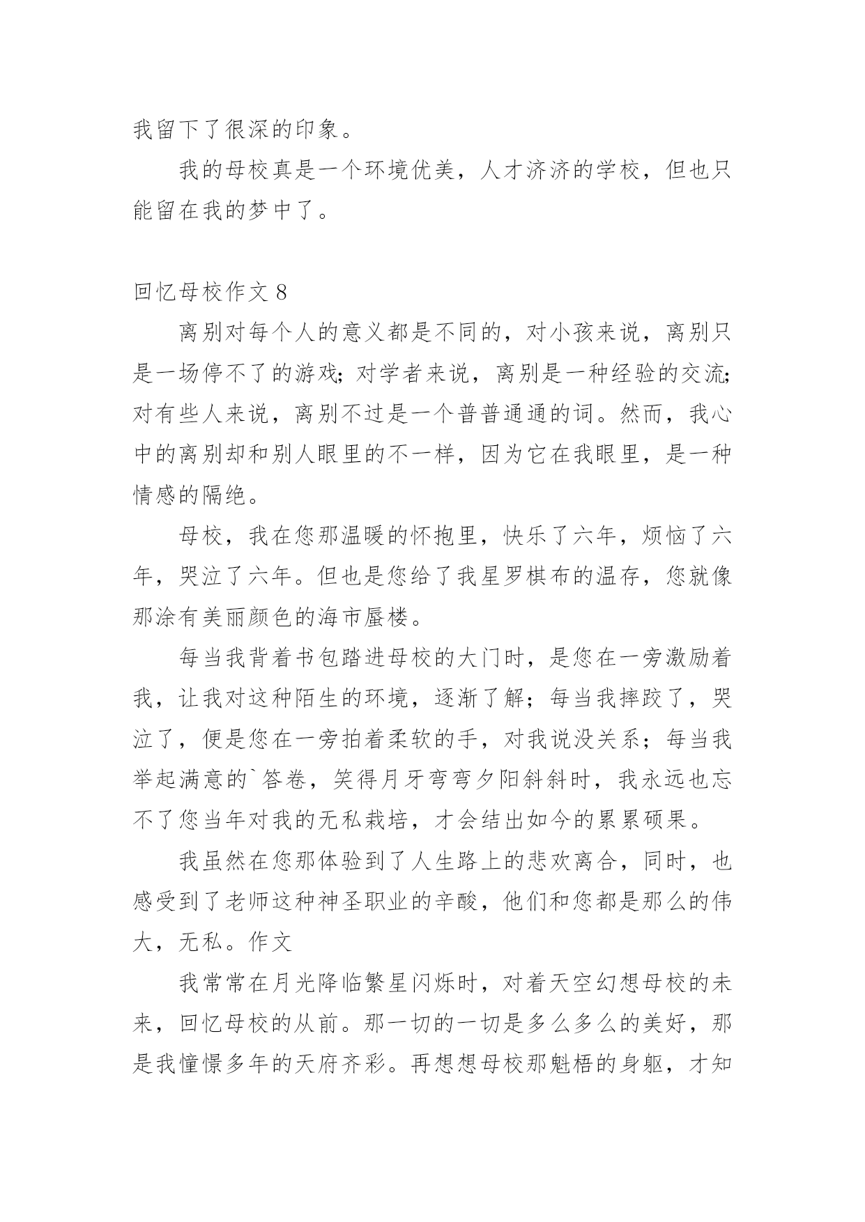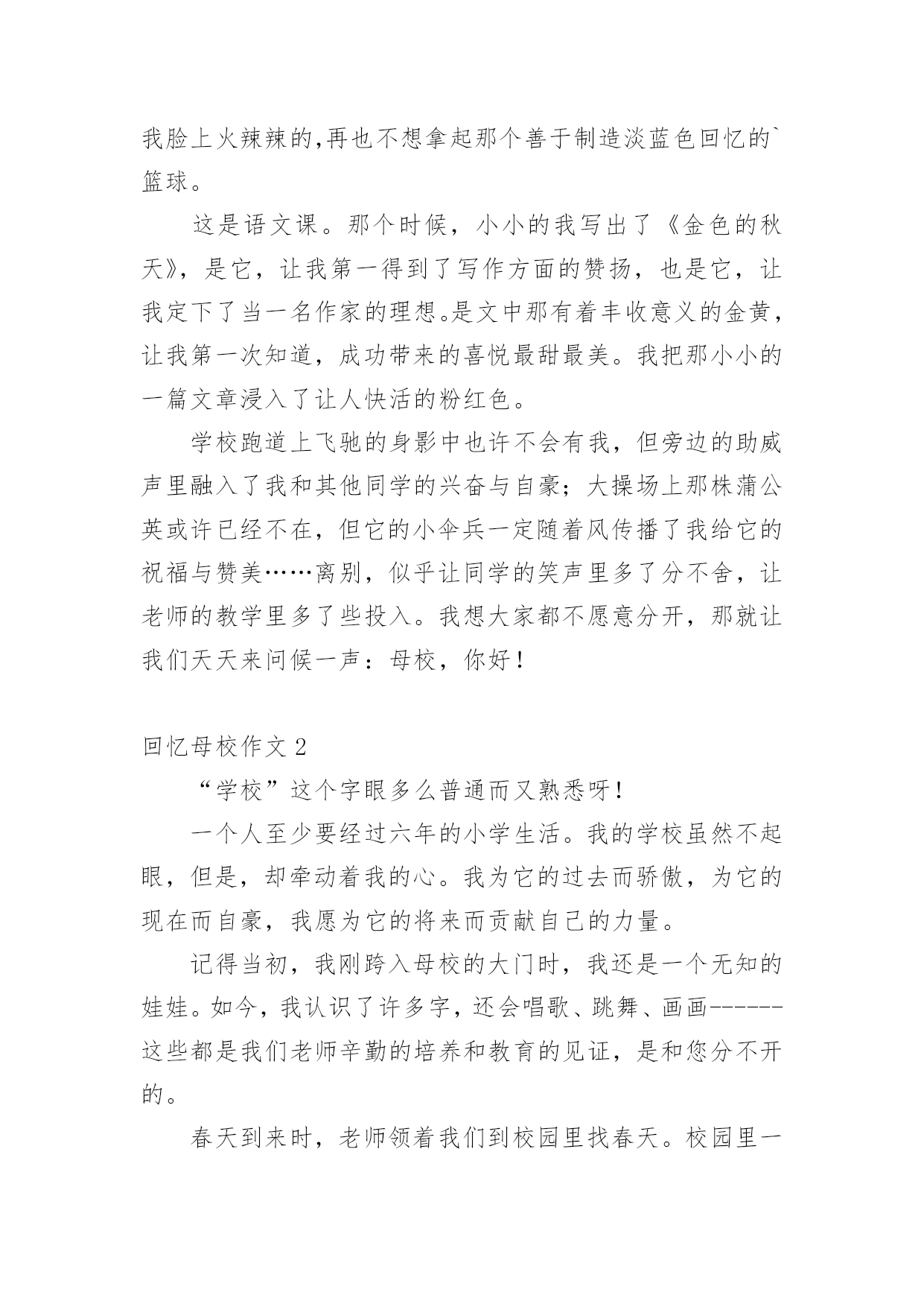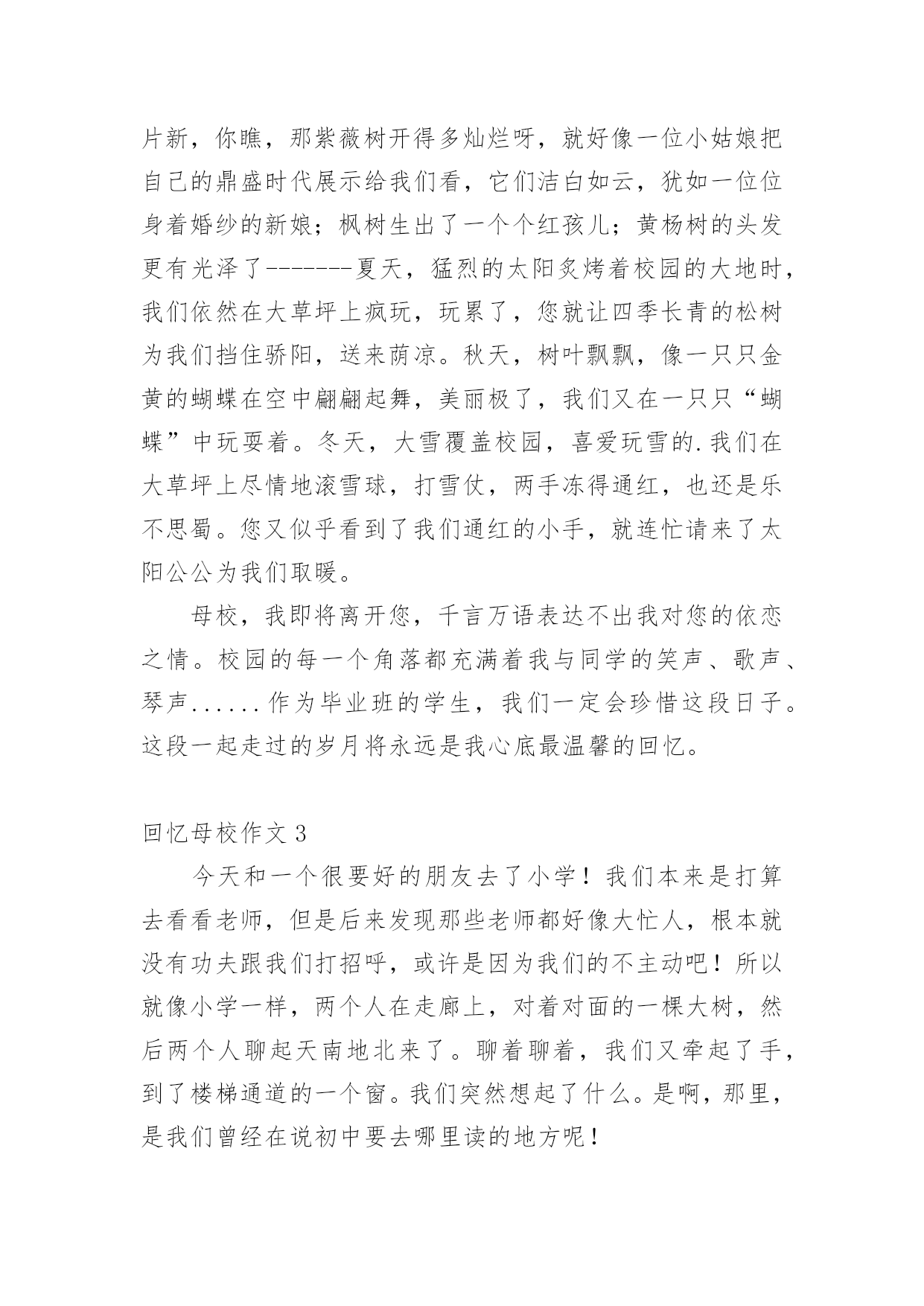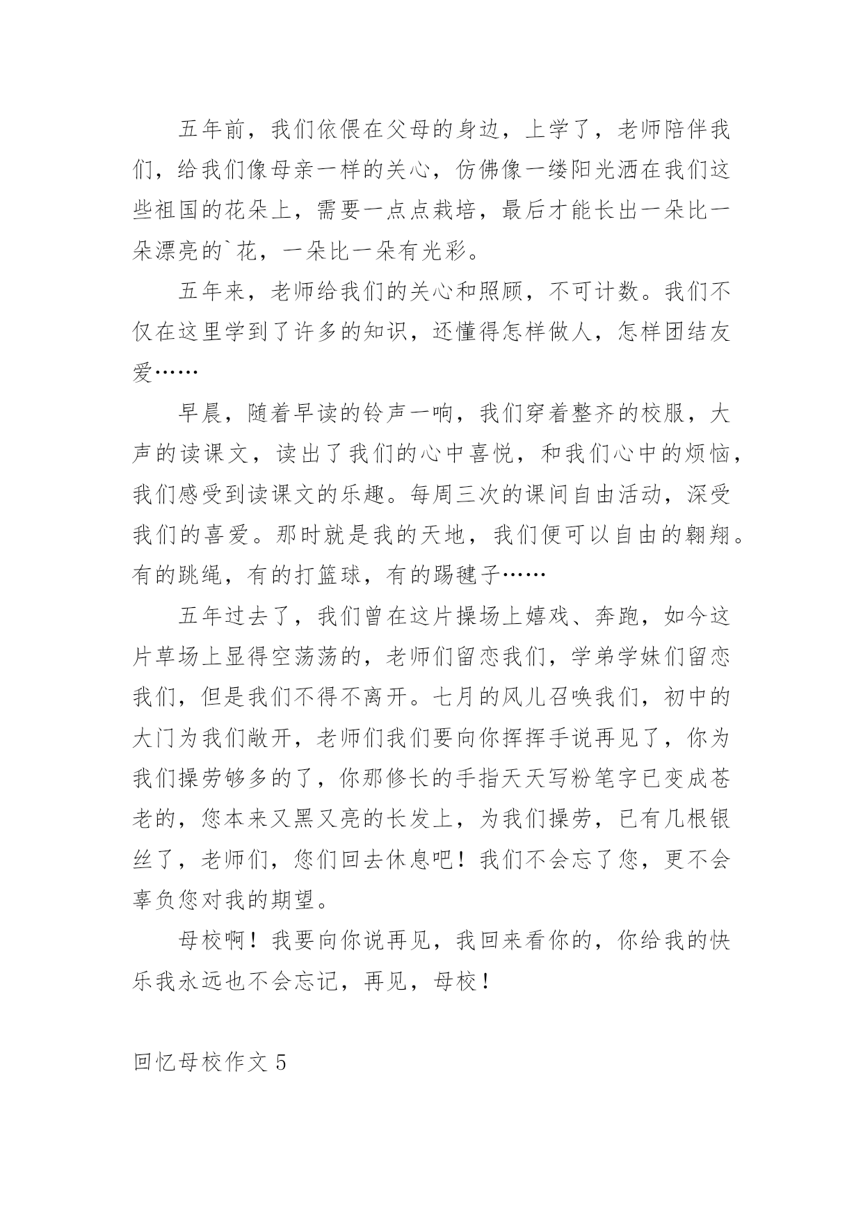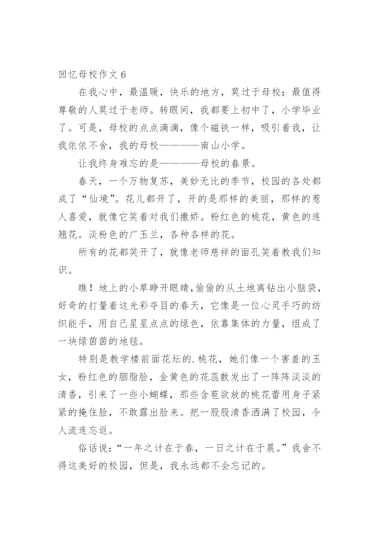 回忆母校作文回忆母校作文15篇在日常学习、工作抑或是生活中,许多人都有过写作文的经历,对作文都不陌生吧,作文一定要做到主题集中,围绕同一主题作深入阐述,切忌东拉西扯,主题涣散甚至无主题。如何写一篇有思想、有文采的作文呢?下面是小编帮大家整理的回忆母校作文,仅供参考,欢迎大家阅读。回忆母校作文1要毕业了。六年的等待,六年的积累,好像包装好的礼花,即将燃放。这次,会是小学里最盛大的“礼花会”,它告诉你,你的“礼花”是否“受潮”,你的“礼花”是否装满了“火药”。我想,随着一个个大大小小、朴素或华丽的“礼花”飞向空中,随之弥漫在我们之间的将是不舍与怀念。在这个盛着我们童年的地方,有过太多太多的回忆——有着小小沮丧和不快的淡蓝色回忆,捧着开心和成功的粉红色回忆……这些小精灵在离别前夕光顾我们的心房,让人那样希望时光可以走得慢些,再慢些。我好想再体会那些浅蓝色回忆带给我的教训和经验,也想再回味一下粉红色回忆里的快乐与幸福。那是体育课上,我们开心地投篮。信心十足的我抱起球就扔,结果球上到了一半,急速落下。一次失败可不会给我带来不快。可是接着二次、三次,最多也只能让球挨到篮筐。我脸上火辣辣的,再也不想拿起那个善于制造淡蓝色回忆的`篮球。这是语文课。那个时候,小小的我写出了《金色的秋天》,是它,让我第一得到了写作方面的赞扬,也是它,让我定下了当一名作家的理想。是文中那有着丰收意义的金黄,让我第一次知道,成功带来的喜悦最甜最美。我把那小小的一篇文章浸入了让人快活的粉红色。学校跑道上飞驰的身影中也许不会有我,但旁边的助威声里融入了我和其他同学的兴奋与自豪;大操场上那株蒲公英或许已经不在,但它的小伞兵一定随着风传播了我给它的祝福与赞美……离别,似乎让同学的笑声里多了分不舍,让老师的教学里多了些投入。我想大家都不愿意分开,那就让我们天天来问候一声:母校,你好!回忆母校作文2“学校”这个字眼多么普通而又熟悉呀!一个人至少要经过六年的小学生活。我的学校虽然不起眼,但是,却牵动着我的心。我为它的过去而骄傲,为它的现在而自豪,我愿为它的将来而贡献自己的力量。记得当初,我刚跨入母校的大门时,我还是一个无知的娃娃。如今,我认识了许多字,还会唱歌、跳舞、画画------这些都是我们老师辛勤的培养和教育的见证,是和您分不开的。春天到来时,老师领着我们到校园里找春天。校园里一片新,你瞧,那紫薇树开得多灿烂呀,就好像一位小姑娘把自己的鼎盛时代展示给我们看,它们洁白如云,犹如一位位身着婚纱的新娘;枫树生出了一个个红孩儿;黄杨树的头发更有光泽了-------夏天,猛烈的太阳炙烤着校园的大地时,我们依然在大草坪上疯玩,玩累了,您就让四季长青的松树为我们挡住骄阳,送来荫凉。秋天,树叶飘飘,像一只只金黄的蝴蝶在空中翩翩起舞,美丽极了,我们又在一只只“蝴蝶”中玩耍着。冬天,大雪覆盖校园,喜爱玩雪的.我们在大草坪上尽情地滚雪球,打雪仗,两手冻得通红,也还是乐不思蜀。您又似乎看到了我们通红的小手,就连忙请来了太阳公公为我们取暖。母校,我即将离开您,千言万语表达不出我对您的依恋之情。校园的每一个角落都充满着我与同学的笑声、歌声、琴声......作为毕业班的学生,我们一定会珍惜这段日子。这段一起走过的岁月将永远是我心底最温馨的回忆。回忆母校作文3今天和一个很要好的朋友去了小学!我们本来是打算去看看老师,但是后来发现那些老师都好像大忙人,根本就没有功夫跟我们打招呼,或许是因为我们的不主动吧!所以就像小学一样,两个人在走廊上,对着对面的一棵大树,然后两个人聊起天南地北来了。聊着聊着,我们又牵起了手,到了楼梯通道的一个窗。我们突然想起了什么。是啊,那里,是我们曾经在说初中要去哪里读的地方呢!原来时间过得如此的快!那是我们曾经说过要在哪里读的地方!我说了,如果时间可以重来,我会说,我只想走一步算一步!因为曾经说的学校,我没有去,反倒来了今天这个曾经想都没想过的学校!反倒所有的想法都成了泡沫!我们说起了老师们,突然说起了二年级的额老师,好吧,其实我们一直都很想他,真的很好!但是后来就没教啊哦我们了!所以!啊!那是二年级的'了,然后我那个朋友说她还欠我们那么多的笔呢!是啊!突然间就笑了起来,我也开始抱怨她还欠我们二零二班所有人的一瓶风油精呢!是啊!说着说着,就想起了小学二年级的一个很搞笑的同学,说起了他的小熊在课堂上被老师没收了,说起了他曾经在公开课上办青蛙跳被其他老师骂,说起了他后来就转学了!现在才想起来,曾经我们还飞吻呢,曾经我们还一起放学呢!那个傻呢!只是都多少年了,现在我们都是初二,和当初的二年级。现在看看二年级的学生,真的有一种说不出的感觉,我们当初二年级像现在二年级学生那么大的时候真的就懂得那么多吗?为什么我们对二年级的事情还记忆犹新呢!母校,回忆!回忆母校作文4我们小学生活得母校是不同
