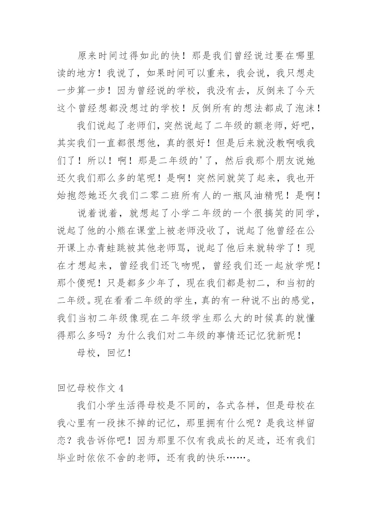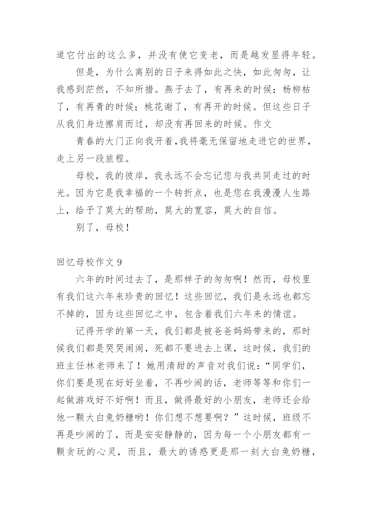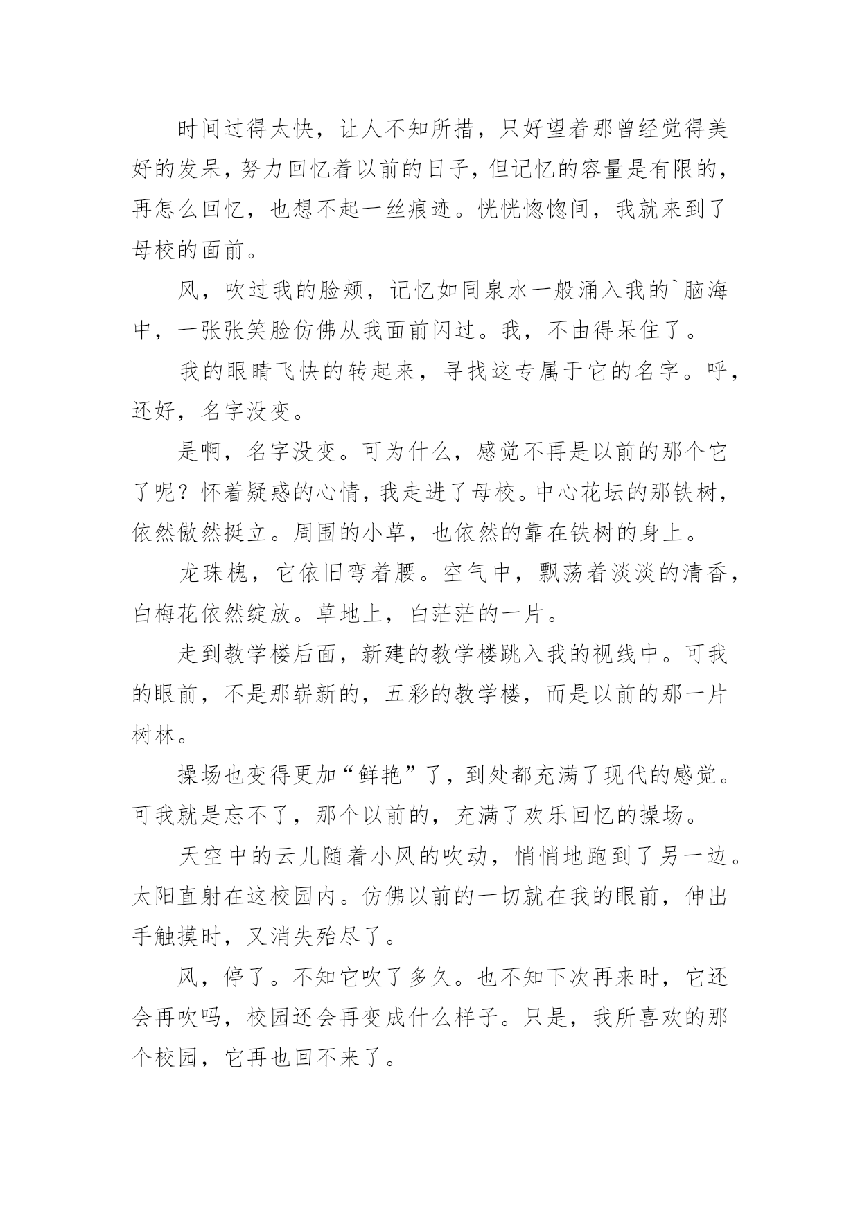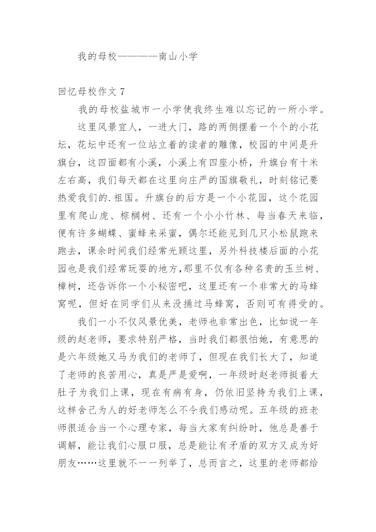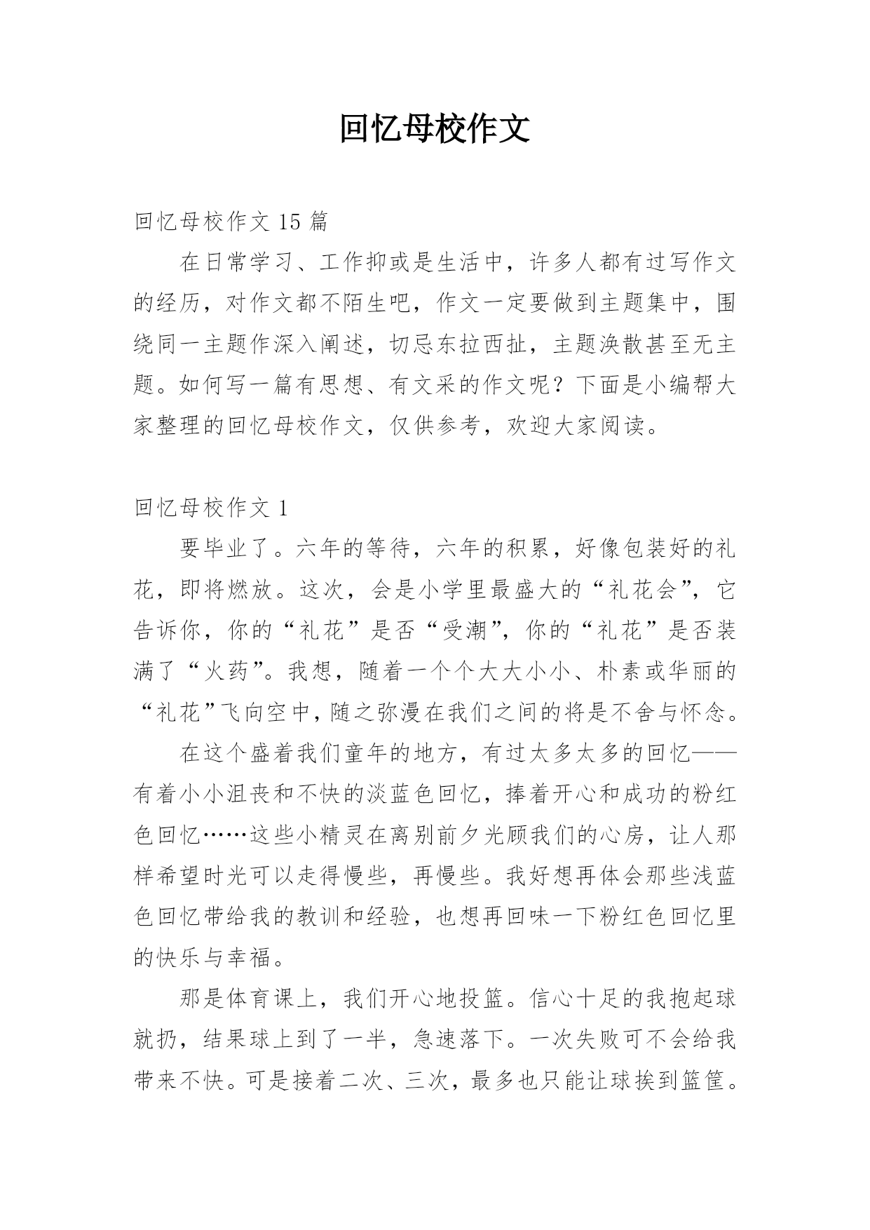 回忆母校作文回忆母校作文15篇在日常学习、工作抑或是生活中,许多人都有过写作文的经历,对作文都不陌生吧,作文一定要做到主题集中,围绕同一主题作深入阐述,切忌东拉西扯,主题涣散甚至无主题。如何写一篇有思想、有文采的作文呢?下面是小编帮大家整理的回忆母校作文,仅供参考,欢迎大家阅读。回忆母校作文1要毕业了。六年的等待,六年的积累,好像包装好的礼花,即将燃放。这次,会是小学里最盛大的“礼花会”,它告诉你,你的“礼花”是否“受潮”,你的“礼花”是否装满了“火药”。我想,随着一个个大大小小、朴素或华丽的“礼花”飞向空中,随之弥漫在我们之间的将是不舍与怀念。在这个盛着我们童年的地方,有过太多太多的回忆——有着小小沮丧和不快的淡蓝色回忆,捧着开心和成功的粉红色回忆……这些小精灵在离别前夕光顾我们的心房,让人那样希望时光可以走得慢些,再慢些。我好想再体会那些浅蓝色回忆带给我的教训和经验,也想再回味一下粉红色回忆里的快乐与幸福。那是体育课上,我们开心地投篮。信心十足的我抱起球就扔,结果球上到了一半,急速落下。一次失败可不会给我带来不快。可是接着二次、三次,最多也只能让球挨到篮筐。我脸上火辣辣的,再也不想拿起那个善于制造淡蓝色回忆的`篮球。这是语文课。那个时候,小小的我写出了《金色的秋天》,是它,让我第一得到了写作方面的赞扬,也是它,让我定下了当一名作家的理想。是文中那有着丰收意义的金黄,让我第一次知道,成功带来的喜悦最甜最美。我把那小小的一篇文章浸入了让人快活的粉红色。学校跑道上飞驰的身影中也许不会有我,但旁边的助威声里融入了我和其他同学的兴奋与自豪;大操场上那株蒲公英或许已经不在,但它的小伞兵一定随着风传播了我给它的祝福与赞美……离别,似乎让同学的笑声里多了分不舍,让老师的教学里多了些投入。我想大家都不愿意分开,那就让我们天天来问候一声:母校,你好!回忆母校作文2“学校”这个字眼多么普通而又熟悉呀!一个人至少要经过六年的小学生活。我的学校虽然不起眼,但是,却牵动着我的心。我为它的过去而骄傲,为它的现在而自豪,我愿为它的将来而贡献自己的力量。记得当初,我刚跨入母校的大门时,我还是一个无知的娃娃。如今,我认识了许多字,还会唱歌、跳舞、画画------这些都是我们老师辛勤的培养和教育的见证,是和您分不开的。春天到来时,老师领着我们到校园里找春天。校园里一片新,你瞧,那紫薇树开得多灿烂呀,就好像一位小姑娘把自己的鼎盛时代展示给我们看,它们洁白如云,犹如一位位身着婚纱的新娘;枫树生出了一个个红孩儿;黄杨树的头发更有光泽了-------夏天,猛烈的太阳炙烤着校园的大地时,我们依然在大草坪上疯玩,玩累了,您就让四季长青的松树为我们挡住骄阳,送来荫凉。秋天,树叶飘飘,像一只只金黄的蝴蝶在空中翩翩起舞,美丽极了,我们又在一只只“蝴蝶”中玩耍着。冬天,大雪覆盖校园,喜爱玩雪的.我们在大草坪上尽情地滚雪球,打雪仗,两手冻得通红,也还是乐不思蜀。您又似乎看到了我们通红的小手,就连忙请来了太阳公公为我们取暖。母校,我即将离开您,千言万语表达不出我对您的依恋之情。校园的每一个角落都充满着我与同学的笑声、歌声、琴声......作为毕业班的学生,我们一定会珍惜这段日子。这段一起走过的岁月将永远是我心底最温馨的回忆。回忆母校作文3今天和一个很要好的朋友去了小学!我们本来是打算去看看老师,但是后来发现那些老师都好像大忙人,根本就没有功夫跟我们打招呼,或许是因为我们的不主动吧!所以就像小学一样,两个人在走廊上,对着对面的一棵大树,然后两个人聊起天南地北来了。聊着聊着,我们又牵起了手,到了楼梯通道的一个窗。我们突然想起了什么。是啊,那里,是我们曾经在说初中要去哪里读的地方呢!原来时间过得如此的快!那是我们曾经说过要在哪里读的地方!我说了,如果时间可以重来,我会说,我只想走一步算一步!因为曾经说的学校,我没有去,反倒来了今天这个曾经想都没想过的学校!反倒所有的想法都成了泡沫!我们说起了老师们,突然说起了二年级的额老师,好吧,其实我们一直都很想他,真的很好!但是后来就没教啊哦我们了!所以!啊!那是二年级的'了,然后我那个朋友说她还欠我们那么多的笔呢!是啊!突然间就笑了起来,我也开始抱怨她还欠我们二零二班所有人的一瓶风油精呢!是啊!说着说着,就想起了小学二年级的一个很搞笑的同学,说起了他的小熊在课堂上被老师没收了,说起了他曾经在公开课上办青蛙跳被其他老师骂,说起了他后来就转学了!现在才想起来,曾经我们还飞吻呢,曾经我们还一起放学呢!那个傻呢!只是都多少年了,现在我们都是初二,和当初的二年级。现在看看二年级的学生,真的有一种说不出的感觉,我们当初二年级像现在二年级学生那么大的时候真的就懂得那么多吗?为什么我们对二年级的事情还记忆犹新呢!母校,回忆!回忆母校作文4我们小学生活得母校是不同