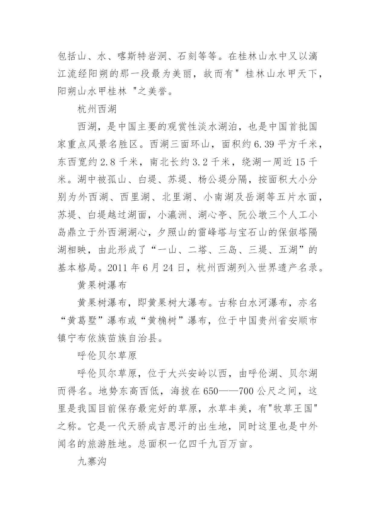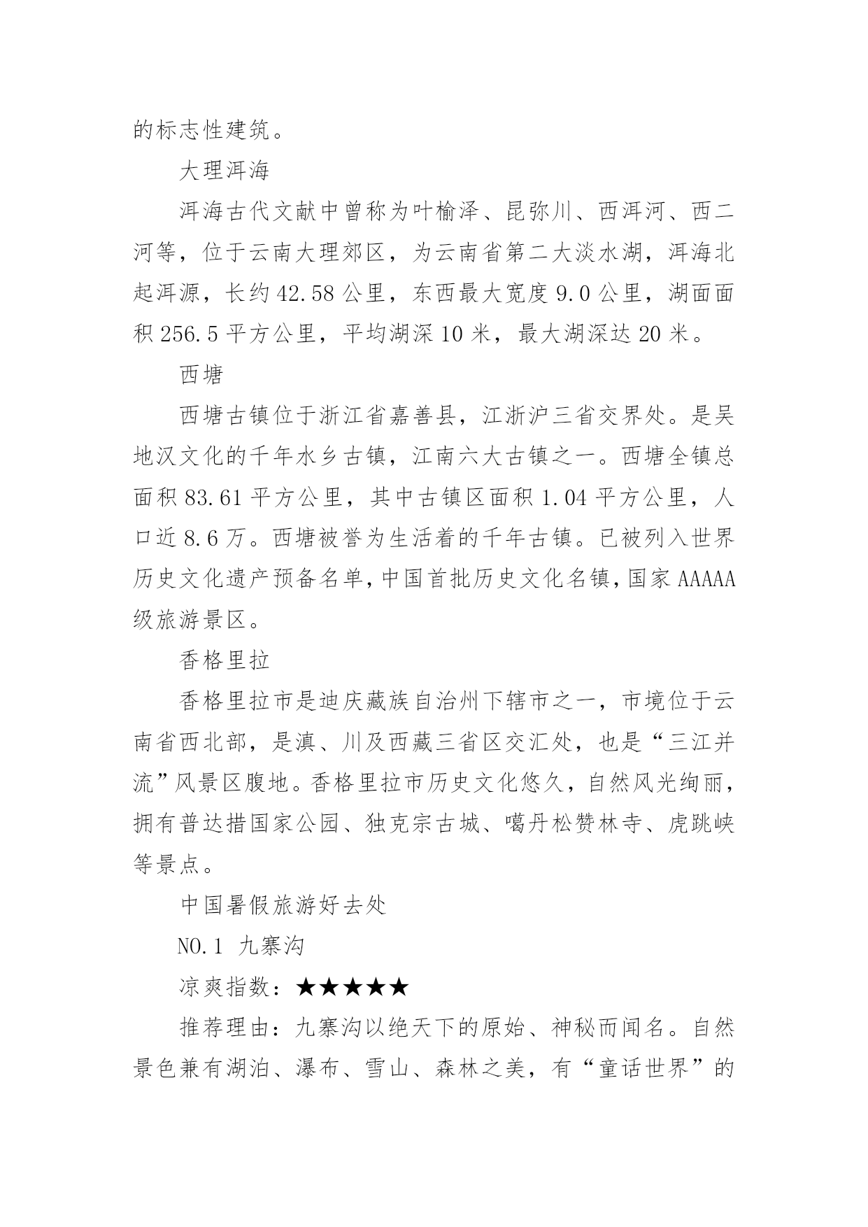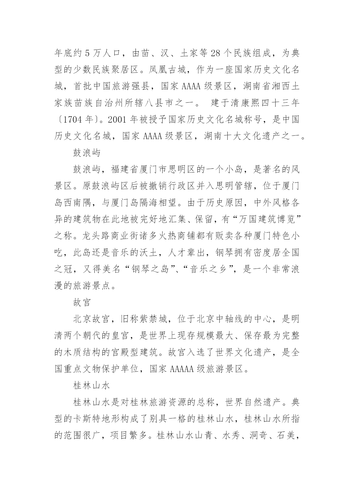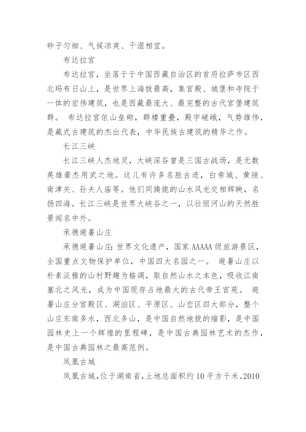 中国暑假旅游胜地随着夏日的脚步渐近,期待已久的暑假终于来临。在这个充满活力和希望的季节里,一场精心策划的旅行不仅能让人们暂时摆脱繁忙的学业和工作,还能在旅途中感受大自然的美,以下是小编整理的中国暑假旅游胜地,希望对大家有所帮助。中国暑假旅游胜地趵突泉趵突泉位于济南市历下区,南靠千佛山,东临泉城广场,北望大明湖,五龙潭。面积158亩,是以泉为主的国家AAAAA级特色园林,国家首批重点公园。该泉位居济南七十二名泉之首,被誉为"天下第一泉",也是最早见于古代文献的济南明泉。北戴河北戴河海滨地处河北省秦皇岛市的西部,距北京、天津等地只有2-3小时车程。这里有美丽的沙滩和凉爽的气候,是中国最著名的避暑、疗养胜地。这里夏无酷暑、冬无严寒。背靠树木葱郁的联峰山,自然环境优美,与北京,天津,秦皇岛,兴城,葫芦岛构成一条黄金旅游带,北戴河处于旅游带的节点。北戴河海滩沙质较好,坡度也比较平缓,是一个优良的天然海水浴场。北戴河除了避暑当然少不了美味的海鲜,皮皮虾、面条鱼、螃蟹、牡蛎各类海鲜琳琅满目,但要品尝到新鲜美味的海鲜得春秋两季来。这里海水洁净、砂子匀细、气候凉爽、干湿相宜。布达拉宫布达拉宫,坐落于于中国西藏自治区的首府拉萨市区西北玛布日山上,是世界上海拔最高,集宫殿、城堡和寺院于一体的宏伟建筑,也是西藏最庞大、最完整的古代宫堡建筑群。布达拉宫依山垒砌,群楼重叠,殿宇嵯峨,气势雄伟,是藏式古建筑的杰出代表,中华民族古建筑的精华之作。长江三峡长江三峡人杰地灵,大峡深谷曾是三国古战场,是无数英雄豪杰用武之地。这儿有许多名胜古迹,白帝城、黄陵、南津关、孙夫人庙等。他们同旖旎的山水风光交相辉映,名扬四海。长江三峡是世界大峡谷之一,以壮丽河山的天然胜景闻名中外。承德避暑山庄承德避暑山庄:世界文化遗产,国家AAAAA级旅游景区,全国重点文物保护单位,中国四大名园之一。避暑山庄以朴素淡雅的山村野趣为格调,取自然山水之本色,吸收江南塞北之风光,成为中国现存占地最大的古代帝王宫苑。避暑山庄分宫殿区、湖泊区、平原区、山峦区四大部分,整个山庄东南多水,西北多山,是中国自然地貌的缩影,是中国园林史上一个辉煌的里程碑,是中国古典园林艺术的杰作,是中国古典园林之最高范例。凤凰古城凤凰古城,位于湖南省,土地总面积约10平方千米。2010年底约5万人口,由苗、汉、土家等28个民族组成,为典型的少数民族聚居区。凤凰古城,作为一座国家历史文化名城,首批中国旅游强县,国家AAAA级景区,湖南省湘西土家族苗族自治州所辖八县市之一。建于清康熙四十三年〔1704年〕。2001年被授予国家历史文化名城称号,是中国历史文化名城,国家AAAA级景区,湖南十大文化遗产之一。鼓浪屿鼓浪屿,福建省厦门市思明区的一个小岛,是著名的风景区。原鼓浪屿区后被撤销行政区并入思明管辖,位于厦门岛西南隅,与厦门岛隔海相望。由于历史原因,中外风格各异的建筑物在此地被完好地汇集、保留,有“万国建筑博览”之称。龙头路商业街诸多火热商铺都有贩卖各种厦门特色小吃,此岛还是音乐的沃土,人才辈出,钢琴拥有密度居全国之冠,又得美名“钢琴之岛”、“音乐之乡”,是一个非常浪漫的旅游景点。故宫北京故宫,旧称紫禁城,位于北京中轴线的中心,是明清两个朝代的皇宫,是世界上现存规模最大、保存最为完整的木质结构的宫殿型建筑。故宫入选了世界文化遗产,是全国重点文物保护单位,国家AAAAA级旅游景区。桂林山水桂林山水是对桂林旅游资源的总称,世界自然遗产。典型的卡斯特地形构成了别具一格的桂林山水,桂林山水所指的范围很广,项目繁多。桂林山水山青、水秀、洞奇、石美,包括山、水、喀斯特岩洞、石刻等等。在桂林山水中又以漓江流经阳朔的那一段最为美丽,故而有"桂林山水甲天下,阳朔山水甲桂林"之美誉。杭州西湖西湖,是中国主要的观赏性淡水湖泊,也是中国首批国家重点风景名胜区。西湖三面环山,面积约6.39平方千米,东西宽约2.8千米,南北长约3.2千米,绕湖一周近15千米。湖中被孤山、白堤、苏堤、杨公堤分隔,按面积大小分别为外西湖、西里湖、北里湖、小南湖及岳湖等五片水面,苏堤、白堤越过湖面,小瀛洲、湖心亭、阮公墩三个人工小岛鼎立于外西湖湖心,夕照山的雷峰塔与宝石山的保俶塔隔湖相映,由此形成了“一山、二塔、三岛、三堤、五湖”的基本格局。2011年6月24日,杭州西湖列入世界遗产名录。黄果树瀑布黄果树瀑布,即黄果树大瀑布。古称白水河瀑布,亦名“黄葛墅”瀑布或“黄桷树”瀑布,位于中国贵州省安顺市镇宁布依族苗族自治县。呼伦贝尔草原呼伦贝尔草原,位于大兴安岭以西,由呼伦湖、贝尔湖而得名。地势东高西低,海拔在650——700公尺之间,这里是我国目前保存最完好的草原,水草丰美,有"牧草王国"之称。它是一代天骄成吉思汗的出生地,同时这里也是中外闻名的旅游胜地。总面积一亿四千九百万