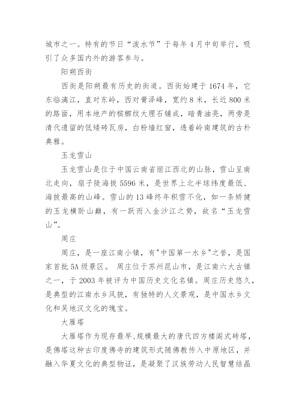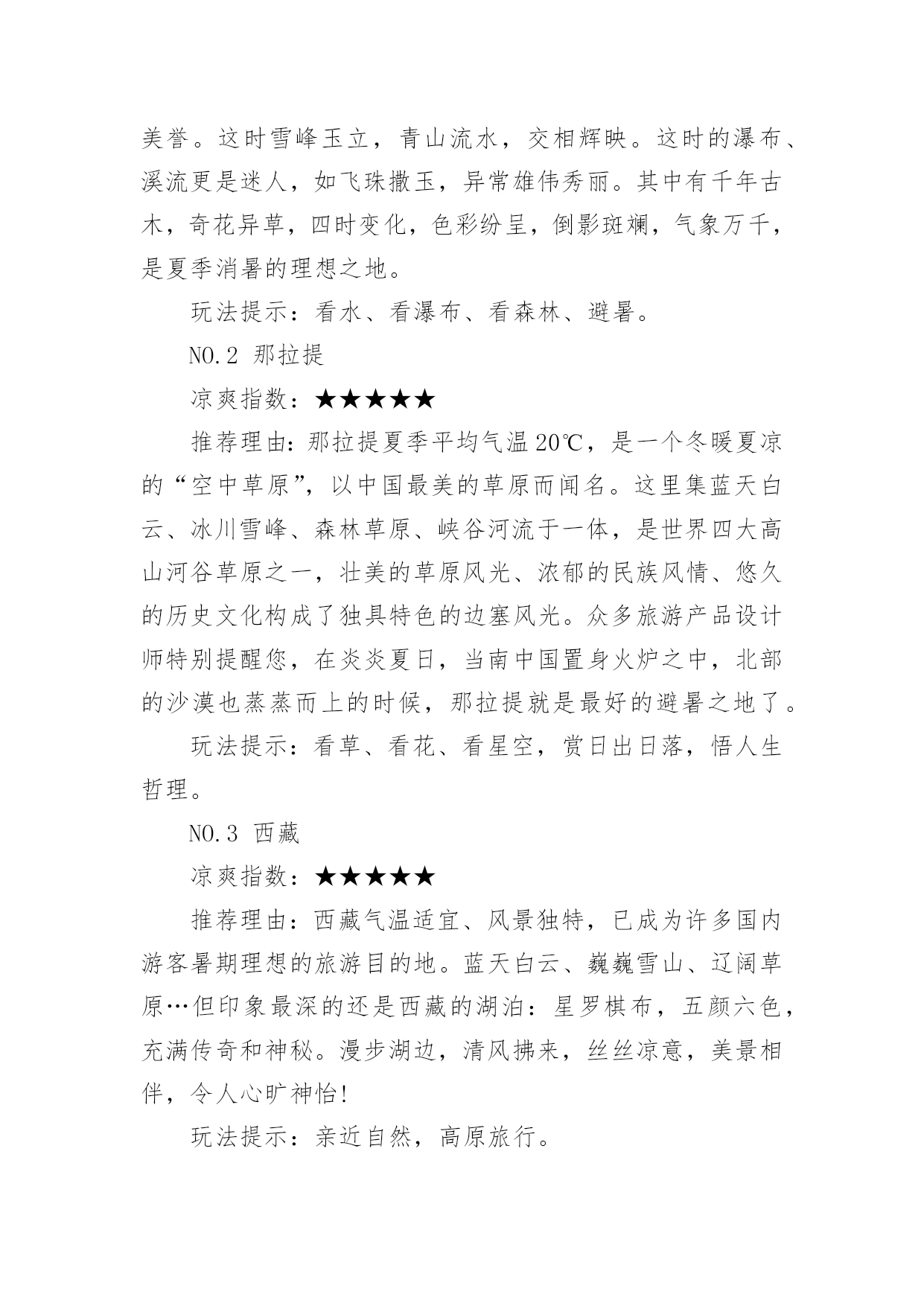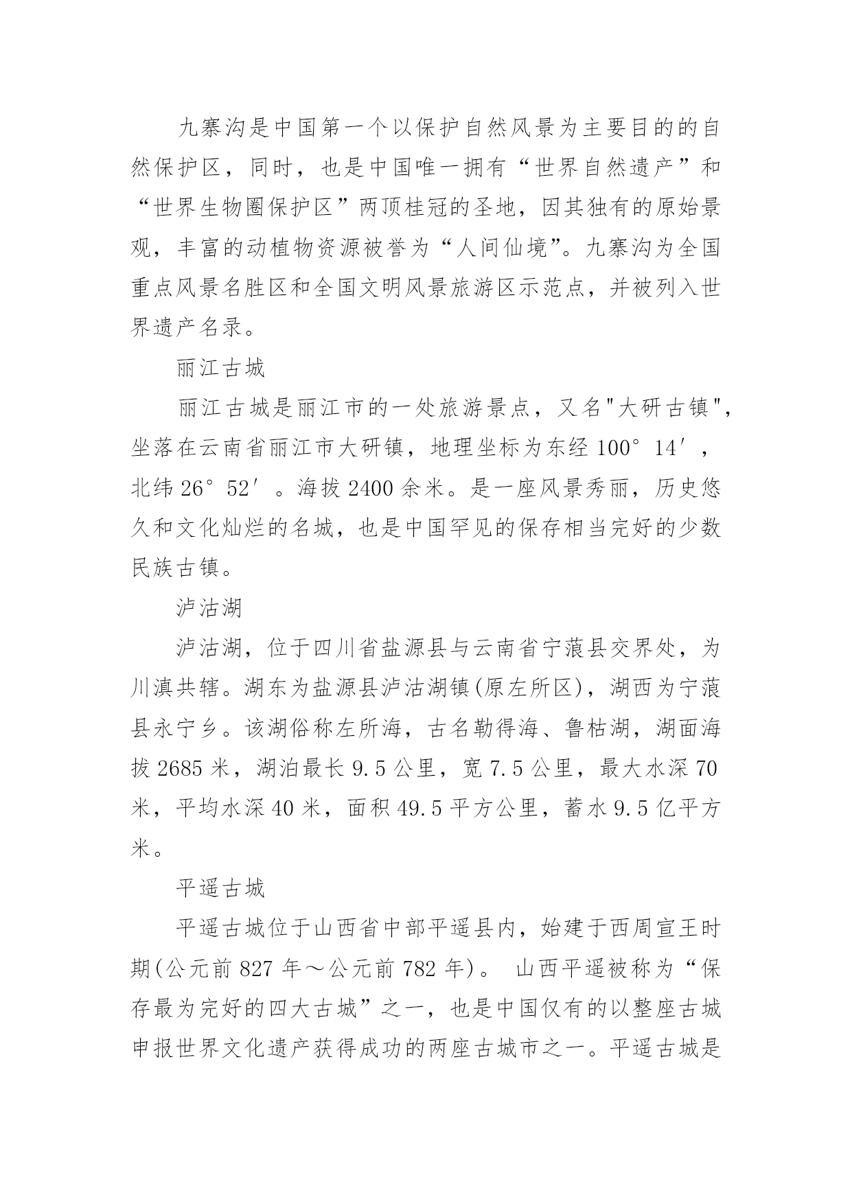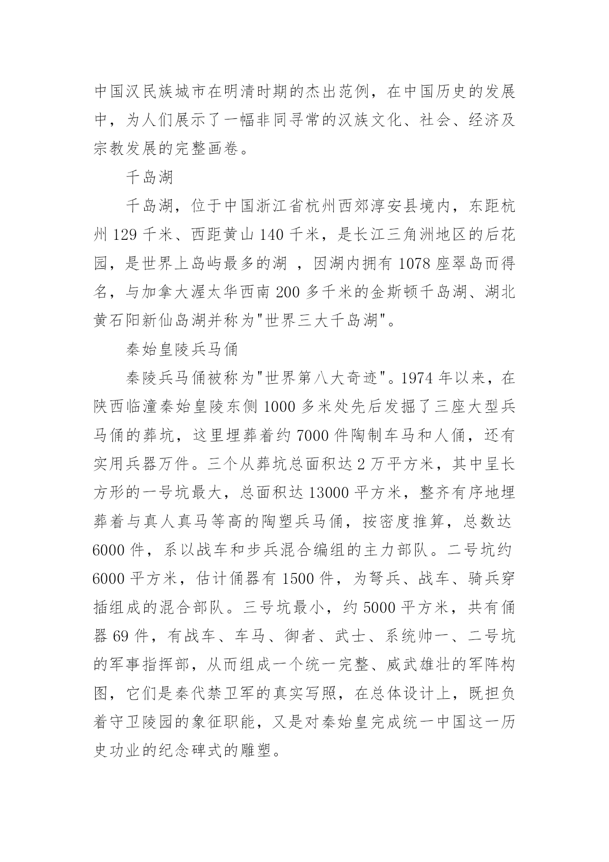 中国暑假旅游胜地随着夏日的脚步渐近,期待已久的暑假终于来临。在这个充满活力和希望的季节里,一场精心策划的旅行不仅能让人们暂时摆脱繁忙的学业和工作,还能在旅途中感受大自然的美,以下是小编整理的中国暑假旅游胜地,希望对大家有所帮助。中国暑假旅游胜地趵突泉趵突泉位于济南市历下区,南靠千佛山,东临泉城广场,北望大明湖,五龙潭。面积158亩,是以泉为主的国家AAAAA级特色园林,国家首批重点公园。该泉位居济南七十二名泉之首,被誉为"天下第一泉",也是最早见于古代文献的济南明泉。北戴河北戴河海滨地处河北省秦皇岛市的西部,距北京、天津等地只有2-3小时车程。这里有美丽的沙滩和凉爽的气候,是中国最著名的避暑、疗养胜地。这里夏无酷暑、冬无严寒。背靠树木葱郁的联峰山,自然环境优美,与北京,天津,秦皇岛,兴城,葫芦岛构成一条黄金旅游带,北戴河处于旅游带的节点。北戴河海滩沙质较好,坡度也比较平缓,是一个优良的天然海水浴场。北戴河除了避暑当然少不了美味的海鲜,皮皮虾、面条鱼、螃蟹、牡蛎各类海鲜琳琅满目,但要品尝到新鲜美味的海鲜得春秋两季来。这里海水洁净、砂子匀细、气候凉爽、干湿相宜。布达拉宫布达拉宫,坐落于于中国西藏自治区的首府拉萨市区西北玛布日山上,是世界上海拔最高,集宫殿、城堡和寺院于一体的宏伟建筑,也是西藏最庞大、最完整的古代宫堡建筑群。布达拉宫依山垒砌,群楼重叠,殿宇嵯峨,气势雄伟,是藏式古建筑的杰出代表,中华民族古建筑的精华之作。长江三峡长江三峡人杰地灵,大峡深谷曾是三国古战场,是无数英雄豪杰用武之地。这儿有许多名胜古迹,白帝城、黄陵、南津关、孙夫人庙等。他们同旖旎的山水风光交相辉映,名扬四海。长江三峡是世界大峡谷之一,以壮丽河山的天然胜景闻名中外。承德避暑山庄承德避暑山庄:世界文化遗产,国家AAAAA级旅游景区,全国重点文物保护单位,中国四大名园之一。避暑山庄以朴素淡雅的山村野趣为格调,取自然山水之本色,吸收江南塞北之风光,成为中国现存占地最大的古代帝王宫苑。避暑山庄分宫殿区、湖泊区、平原区、山峦区四大部分,整个山庄东南多水,西北多山,是中国自然地貌的缩影,是中国园林史上一个辉煌的里程碑,是中国古典园林艺术的杰作,是中国古典园林之最高范例。凤凰古城凤凰古城,位于湖南省,土地总面积约10平方千米。2010年底约5万人口,由苗、汉、土家等28个民族组成,为典型的少数民族聚居区。凤凰古城,作为一座国家历史文化名城,首批中国旅游强县,国家AAAA级景区,湖南省湘西土家族苗族自治州所辖八县市之一。建于清康熙四十三年〔1704年〕。2001年被授予国家历史文化名城称号,是中国历史文化名城,国家AAAA级景区,湖南十大文化遗产之一。鼓浪屿鼓浪屿,福建省厦门市思明区的一个小岛,是著名的风景区。原鼓浪屿区后被撤销行政区并入思明管辖,位于厦门岛西南隅,与厦门岛隔海相望。由于历史原因,中外风格各异的建筑物在此地被完好地汇集、保留,有“万国建筑博览”之称。龙头路商业街诸多火热商铺都有贩卖各种厦门特色小吃,此岛还是音乐的沃土,人才辈出,钢琴拥有密度居全国之冠,又得美名“钢琴之岛”、“音乐之乡”,是一个非常浪漫的旅游景点。故宫北京故宫,旧称紫禁城,位于北京中轴线的中心,是明清两个朝代的皇宫,是世界上现存规模最大、保存最为完整的木质结构的宫殿型建筑。故宫入选了世界文化遗产,是全国重点文物保护单位,国家AAAAA级旅游景区。桂林山水桂林山水是对桂林旅游资源的总称,世界自然遗产。典型的卡斯特地形构成了别具一格的桂林山水,桂林山水所指的范围很广,项目繁多。桂林山水山青、水秀、洞奇、石美,包括山、水、喀斯特岩洞、石刻等等。在桂林山水中又以漓江流经阳朔的那一段最为美丽,故而有"桂林山水甲天下,阳朔山水甲桂林"之美誉。杭州西湖西湖,是中国主要的观赏性淡水湖泊,也是中国首批国家重点风景名胜区。西湖三面环山,面积约6.39平方千米,东西宽约2.8千米,南北长约3.2千米,绕湖一周近15千米。湖中被孤山、白堤、苏堤、杨公堤分隔,按面积大小分别为外西湖、西里湖、北里湖、小南湖及岳湖等五片水面,苏堤、白堤越过湖面,小瀛洲、湖心亭、阮公墩三个人工小岛鼎立于外西湖湖心,夕照山的雷峰塔与宝石山的保俶塔隔湖相映,由此形成了“一山、二塔、三岛、三堤、五湖”的基本格局。2011年6月24日,杭州西湖列入世界遗产名录。黄果树瀑布黄果树瀑布,即黄果树大瀑布。古称白水河瀑布,亦名“黄葛墅”瀑布或“黄桷树”瀑布,位于中国贵州省安顺市镇宁布依族苗族自治县。呼伦贝尔草原呼伦贝尔草原,位于大兴安岭以西,由呼伦湖、贝尔湖而得名。地势东高西低,海拔在650——700公尺之间,这里是我国目前保存最完好的草原,水草丰美,有"牧草王国"之称。它是一代天骄成吉思汗的出生地,同时这里也是中外闻名的旅游胜地。总面积一亿四千九百万
