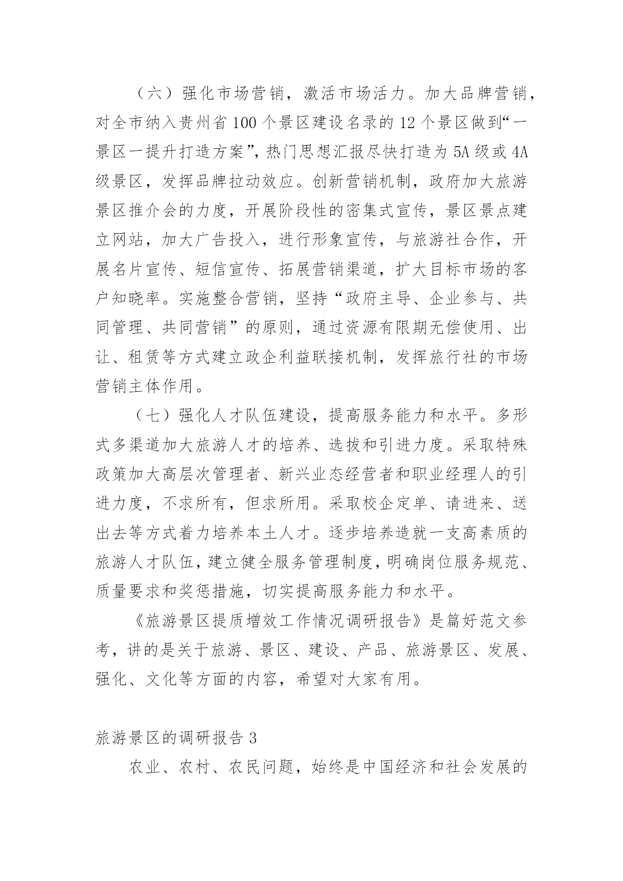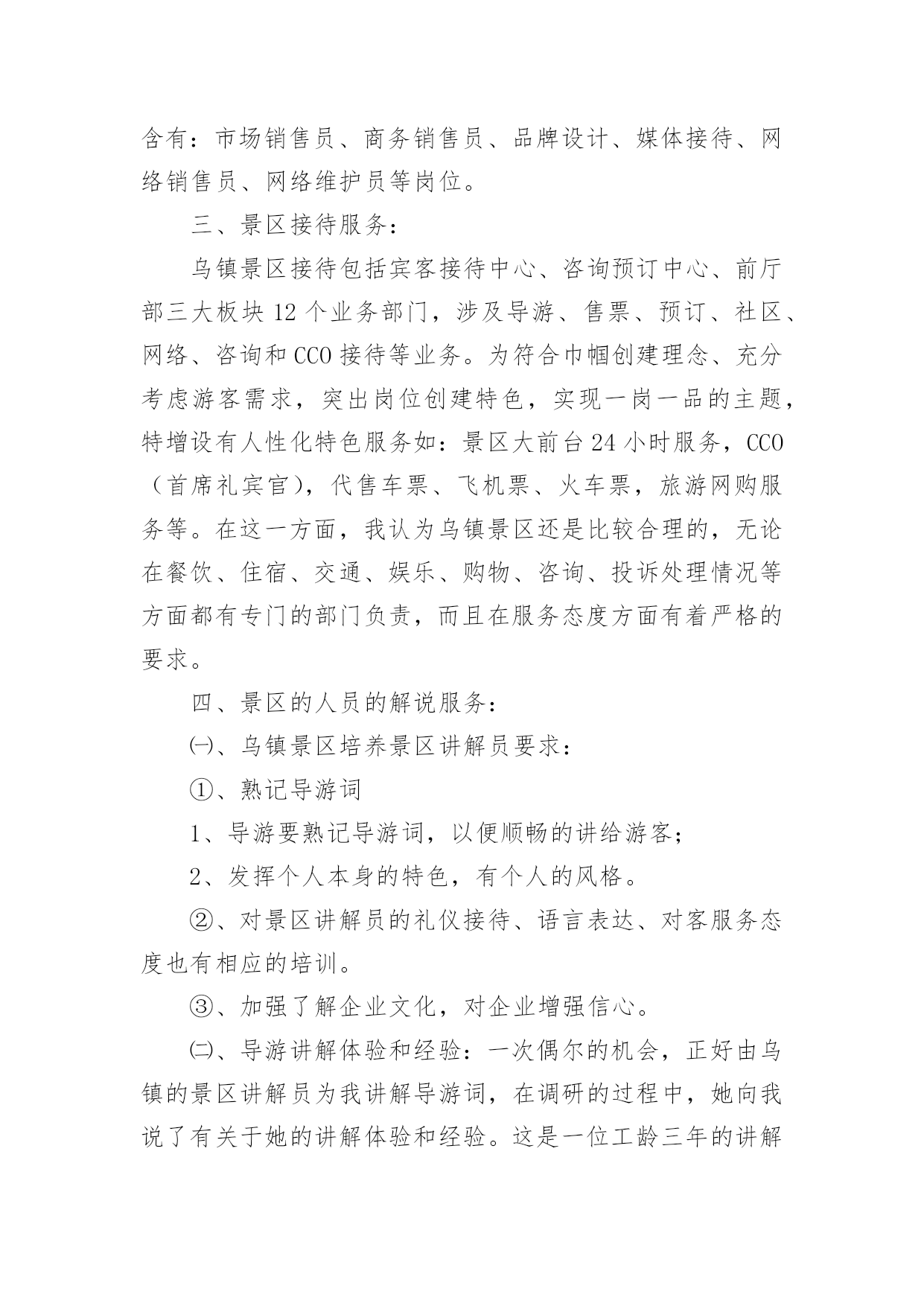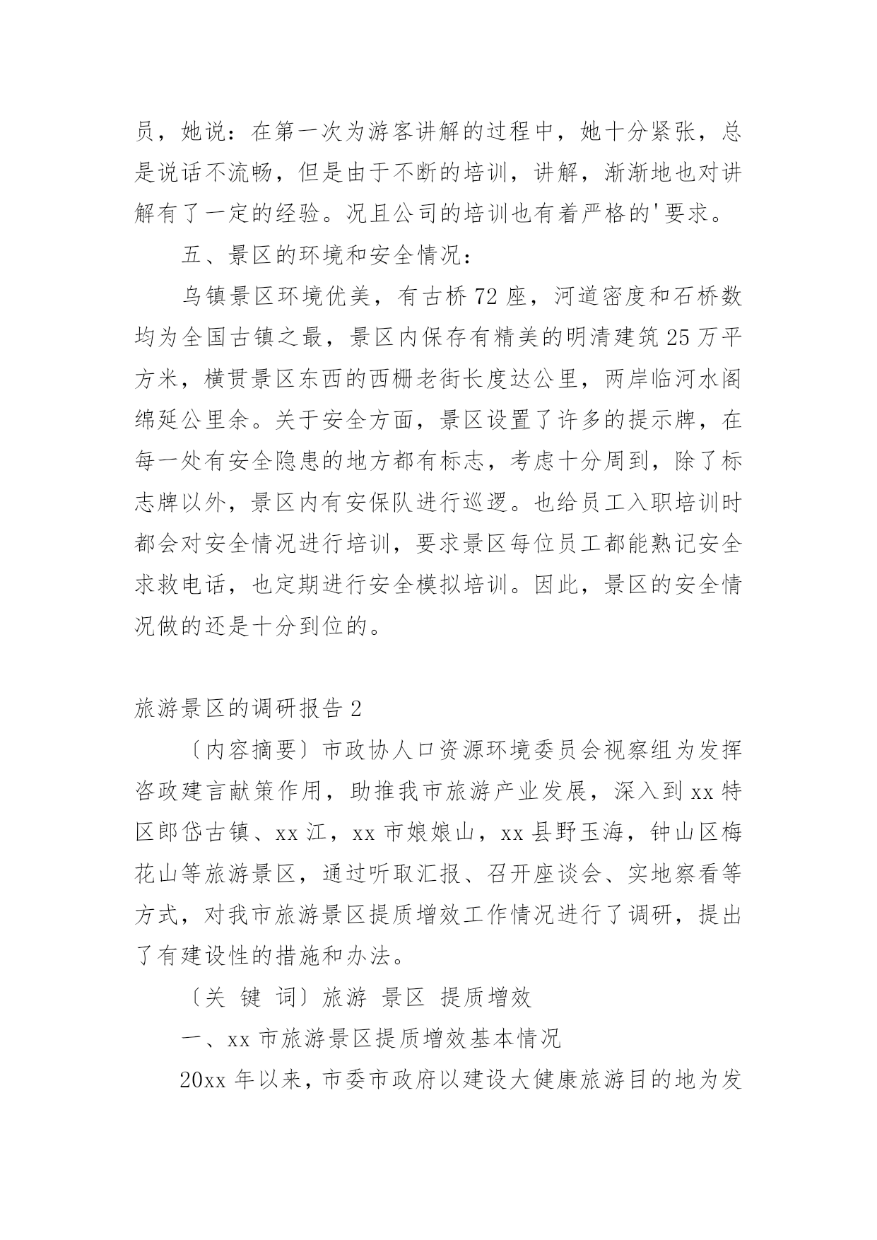 旅游景区的调研报告在现在社会,需要使用报告的情况越来越多,通常情况下,报告的内容含量大、篇幅较长。那么什么样的报告才是有效的呢?以下是小编精心整理的旅游景区的调研报告,欢迎阅读与收藏。旅游景区的调研报告1一、景区旅游资源:乌镇拥有两大成熟型景区:东栅景区和西栅景区是国家五A级景区,占地面积平方公里;其中东栅景区主要以“一日观光游”为主,西栅景区主要以“休闲度假商务游”为主。其中著名旅游景点有江南百床馆、江南民俗馆、江南木雕陈列馆、余榴梁钱币馆、文昌阁、宏源泰染坊、茅盾故居、古戏台、昭明书院、汇源当铺、乌镇大戏院等。二、部门概括乌镇旅游景区下属现有景区销售公司、景区管理公司、景区经营公司、景区配套建设公司及其他行政职能部门。景区销售公司分为四大中心:酒店管理中心、咨询预订中心、宾客接待中心、市场营销中心。酒店管理中心含有:前厅接待员、厨师、餐饮服务员、酒水收银员、客房服务员、礼宾、传菜员、PA等岗位;咨询预订中心含有:前厅接待员、话务员、咨询员、网络预订员、计调、行李员、PA等岗位;宾客接待中心含有:导游、售票、接待员等岗位;市场营销中心含有:市场销售员、商务销售员、品牌设计、媒体接待、网络销售员、网络维护员等岗位。三、景区接待服务:乌镇景区接待包括宾客接待中心、咨询预订中心、前厅部三大板块12个业务部门,涉及导游、售票、预订、社区、网络、咨询和CCO接待等业务。为符合巾帼创建理念、充分考虑游客需求,突出岗位创建特色,实现一岗一品的主题,特增设有人性化特色服务如:景区大前台24小时服务,CCO(首席礼宾官),代售车票、飞机票、火车票,旅游网购服务等。在这一方面,我认为乌镇景区还是比较合理的,无论在餐饮、住宿、交通、娱乐、购物、咨询、投诉处理情况等方面都有专门的部门负责,而且在服务态度方面有着严格的要求。四、景区的人员的解说服务:㈠、乌镇景区培养景区讲解员要求:①、熟记导游词1、导游要熟记导游词,以便顺畅的讲给游客;2、发挥个人本身的特色,有个人的风格。②、对景区讲解员的礼仪接待、语言表达、对客服务态度也有相应的培训。③、加强了解企业文化,对企业增强信心。㈡、导游讲解体验和经验:一次偶尔的机会,正好由乌镇的景区讲解员为我讲解导游词,在调研的过程中,她向我说了有关于她的讲解体验和经验。这是一位工龄三年的讲解员,她说:在第一次为游客讲解的过程中,她十分紧张,总是说话不流畅,但是由于不断的培训,讲解,渐渐地也对讲解有了一定的经验。况且公司的培训也有着严格的'要求。五、景区的环境和安全情况:乌镇景区环境优美,有古桥72座,河道密度和石桥数均为全国古镇之最,景区内保存有精美的明清建筑25万平方米,横贯景区东西的西栅老街长度达公里,两岸临河水阁绵延公里余。关于安全方面,景区设置了许多的提示牌,在每一处有安全隐患的地方都有标志,考虑十分周到,除了标志牌以外,景区内有安保队进行巡逻。也给员工入职培训时都会对安全情况进行培训,要求景区每位员工都能熟记安全求救电话,也定期进行安全模拟培训。因此,景区的安全情况做的还是十分到位的。旅游景区的调研报告2〔内容摘要〕市政协人口资源环境委员会视察组为发挥咨政建言献策作用,助推我市旅游产业发展,深入到xx特区郎岱古镇、xx江,xx市娘娘山,xx县野玉海,钟山区梅花山等旅游景区,通过听取汇报、召开座谈会、实地察看等方式,对我市旅游景区提质增效工作情况进行了调研,提出了有建设性的措施和办法。〔关键词〕旅游景区提质增效一、xx市旅游景区提质增效基本情况20xx年以来,市委市政府以建设大健康旅游目的地为发展目标,坚持把山地特色旅游业作为坚守“三条底线”、决战脱贫攻坚、同步小康的重要举措,抢抓旅游发展机遇,发挥凉都气候优势、深挖潜力、补齐短板、做强长板,大力推进山地特色旅游景区建设,旅游产业实现了“井喷式”增长。xx江、郞岱古镇、廻龙溪、妥乐、乌蒙大草原、哒啦仙谷、娘娘山、菲菜坪等一批3A和4A级旅游景区相继建成。个人简历旅游收入增速连续五年位居全省第一,实现了xx从“江南煤都”到“中国凉都”的华丽转身。游客量由2011年的470万人次增长到2016年的1901.41万人次,旅游总收入由32.88亿元增加到124.65亿元,年均分别增长48.3%和50.1%。2017年1至9月,我市接待游客2427.72万人次,同比增长64.9%;实现旅游总收入192.44亿元,同比增长70%,其中接待外省游客1417.06万人,同比增长126.24%。经过全市上下几年的持续投入和努力,xx旅游在基础设施、产品业态,体制创新、服务环境、品牌形象等方面实现了大提升、大发展,景区提质增效工作取得到较大的进展,初步形成了xx康养胜地和南国冰雪城的品牌。(一)逐步完善旅游功能。紧紧围绕规划,突出休闲、运动、康养、野奢、度假等主题和强化旅游功