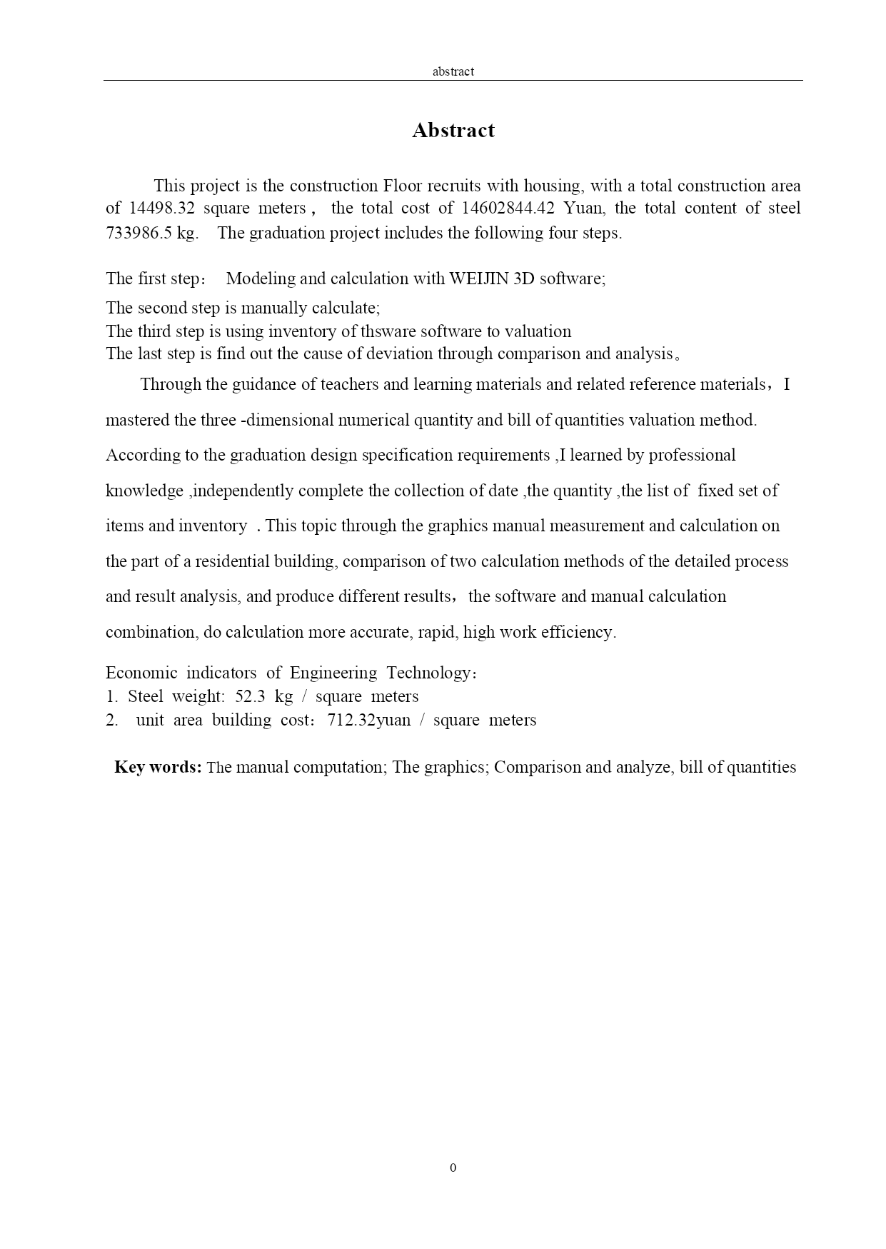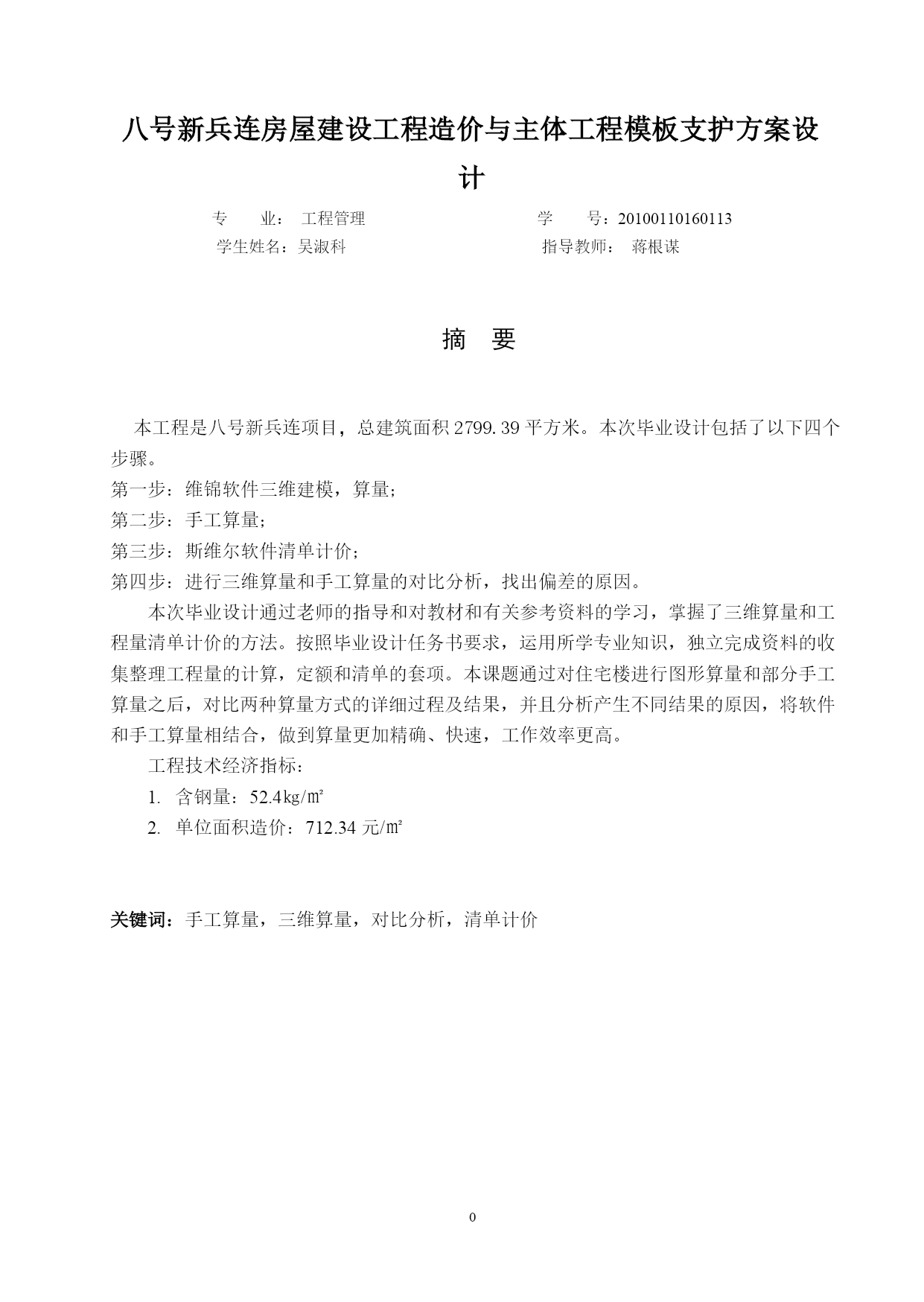 华东交通大学EastChinaJiaotongUniversity毕业设计GraduationDesign(2010—2014年)题目:新兵连6层框架工程预算造价计算及其主体标准层模板支护设计及计算分院:土木建筑学院专业:工程管理班级:工管2010-1学号:20100110160113学生姓名:吴淑科指导教师:蒋根谋起讫日期:2014.3—2014.6华东交通大学毕业设计(论文)任务书姓名学号毕业届别专业毕业设计(论文)题目指导教师学历职称具体要求:进度安排:指导教师签字:年月日教研室意见:教研室主任签字:年月日题目发出日期设计(论文)起止时间附注:华东交通大学毕业设计(论文)开题报告书课题名称课题来源课题类型导师学生姓名学号专业开题报告内容:方法及预期目的:指导教师签名:日期:课题类型:(1)A—工程设计;B—技术开发;C—软件工程;D—理论研究;(2)X—真实课题;Y—模拟课题;Z—虚拟课题(1)、(2)均要填,如AY、BX等。华东交通大学毕业设计(论文)评阅书(1)姓名学号专业毕业设计(论文)题目指导教师评语:得分指导教师签字:年月日评阅人评语:得分评阅人签字:年月日等级华东交通大学毕业设计(论文)评阅书(2)姓名学号专业毕业设计(论文)题目答辩小组评语:等级组长签字:年月日答辩委员会意见:等级答辩委员会主任签字:年月日(学院公章)注:答辩小组根据评阅人的评阅签署意见、初步评定成绩,交答辩委员会审定,盖学院公章。“等级”用优、良、中、及、不及五级制(可按学院制定的毕业设计(论文)成绩评定办法评定最后成绩)。华东交通大学毕业设计(论文)答辩记录姓名学号毕业届别专业题目答辩时间答辩组成员(签字):答辩记录:记录人(签字):年月日答辩小组组长(签字):年月日附注:摘要PAGE\*MERGEFORMAT0PAGE\*MERGEFORMAT1八号新兵连房屋建设工程造价与主体工程模板支护方案设计专业:工程管理学号:20100110160113学生姓名:吴淑科指导教师:蒋根谋摘要本工程是八号新兵连项目,总建筑面积2799.39平方米。本次毕业设计包括了以下四个步骤。第一步:维锦软件三维建模,算量;第二步:手工算量;第三步:斯维尔软件清单计价;第四步:进行三维算量和手工算量的对比分析,找出偏差的原因。本次毕业设计通过老师的指导和对教材和有关参考资料的学习,掌握了三维算量和工程量清单计价的方法。按照毕业设计任务书要求,运用所学专业知识,独立完成资料的收集整理工程量的计算,定额和清单的套项。本课题通过对住宅楼进行图形算量和部分手工算量之后,对比两种算量方式的详细过程及结果,并且分析产生不同结果的原因,将软件和手工算量相结合,做到算量更加精确、快速,工作效率更高。工程技术经济指标:含钢量:52.4㎏/㎡单位面积造价:712.34元/㎡关键词:手工算量,三维算量,对比分析,清单计价abstractAbstractThisprojectistheconstructionFloorrecruitswithhousing,withatotalconstructionareaof14498.32squaremeters,thetotalcostof14602844.42Yuan,thetotalcontentofsteel733986.5kg.Thegraduationprojectincludesthefollowingfoursteps.Thefirststep:ModelingandcalculationwithWEIJIN3Dsoftware;Thesecondstepismanuallycalculate;ThethirdstepisusinginventoryofthswaresoftwaretovaluationThelaststepisfindoutthecauseofdeviationthroughcomparisonandanalysis。Throughtheguidanceofteachersandlearningmaterialsandrelatedreferencematerials,Imasteredthethree-dimensionalnumericalquantit