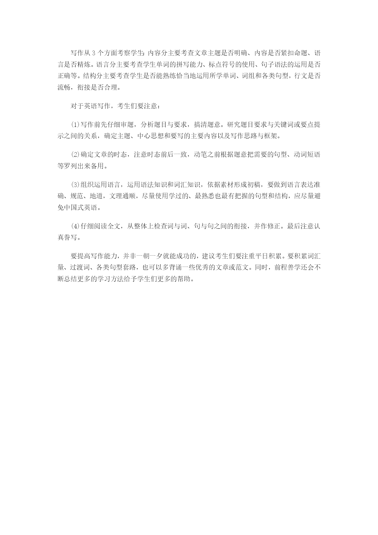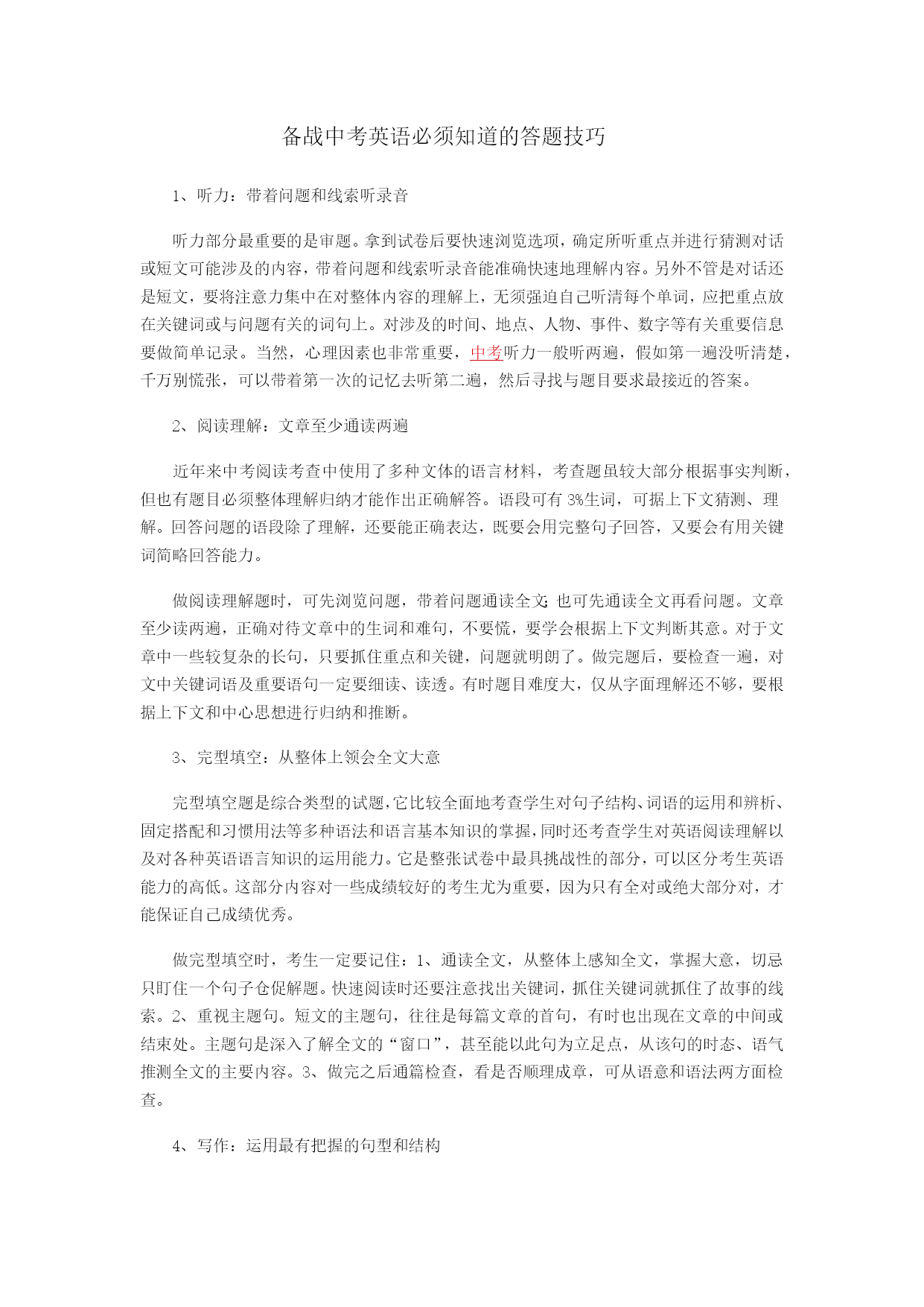 备战中考英语必须知道的答题技巧1、听力:带着问题和线索听录音听力部分最重要的是审题。拿到试卷后要快速浏览选项,确定所听重点并进行猜测对话或短文可能涉及的内容,带着问题和线索听录音能准确快速地理解内容。另外不管是对话还是短文,要将注意力集中在对整体内容的理解上,无须强迫自己听清每个单词,应把重点放在关键词或与问题有关的词句上。对涉及的时间、地点、人物、事件、数字等有关重要信息要做简单记录。当然,心理因素也非常重要,HYPERLINK"http://bj.ambow.com/zk.htm"\t"_blank"中考听力一般听两遍,假如第一遍没听清楚,千万别慌张,可以带着第一次的记忆去听第二遍,然后寻找与题目要求最接近的答案。2、阅读理解:文章至少通读两遍近年来中考阅读考查中使用了多种文体的语言材料,考查题虽较大部分根据事实判断,但也有题目必须整体理解归纳才能作出正确解答。语段可有3%生词,可据上下文猜测、理解。回答问题的语段除了理解,还要能正确表达,既要会用完整句子回答,又要会有用关键词简略回答能力。做阅读理解题时,可先浏览问题,带着问题通读全文;也可先通读全文再看问题。文章至少读两遍,正确对待文章中的生词和难句,不要慌,要学会根据上下文判断其意。对于文章中一些较复杂的长句,只要抓住重点和关键,问题就明朗了。做完题后,要检查一遍,对文中关键词语及重要语句一定要细读、读透。有时题目难度大,仅从字面理解还不够,要根据上下文和中心思想进行归纳和推断。3、完型填空:从整体上领会全文大意完型填空题是综合类型的试题,它比较全面地考查学生对句子结构、词语的运用和辨析、固定搭配和习惯用法等多种语法和语言基本知识的掌握,同时还考查学生对英语阅读理解以及对各种英语语言知识的运用能力。它是整张试卷中最具挑战性的部分,可以区分考生英语能力的高低。这部分内容对一些成绩较好的考生尤为重要,因为只有全对或绝大部分对,才能保证自己成绩优秀。做完型填空时,考生一定要记住:1、通读全文,从整体上感知全文,掌握大意,切忌只盯住一个句子仓促解题。快速阅读时还要注意找出关键词,抓住关键词就抓住了故事的线索。2、重视主题句。短文的主题句,往往是每篇文章的首句,有时也出现在文章的中间或结束处。主题句是深入了解全文的“窗口”,甚至能以此句为立足点,从该句的时态、语气推测全文的主要内容。3、做完之后通篇检查,看是否顺理成章,可从语意和语法两方面检查。4、写作:运用最有把握的句型和结构写作从3个方面考察学生:内容分主要考查文章主题是否明确、内容是否紧扣命题、语言是否精炼。语言分主要考查学生单词的拼写能力、标点符号的使用、句子语法的运用是否正确等。结构分主要考查学生是否能熟练恰当地运用所学单词、词组和各类句型,行文是否流畅,衔接是否合理。对于英语写作,考生们要注意:(1)写作前先仔细审题,分析题目与要求,搞清题意。研究题目要求与关键词或要点提示之间的关系,确定主题、中心思想和要写的主要内容以及写作思路与框架。(2)确定文章的时态,注意时态前后一致,动笔之前根据题意把需要的句型、动词短语等罗列出来备用。(3)组织运用语言,运用语法知识和词汇知识,依据素材形成初稿,要做到语言表达准确、规范、地道,文理通顺,尽量使用学过的、最熟悉也最有把握的句型和结构,应尽量避免中国式英语。(4)仔细阅读全文,从整体上检查词与词、句与句之间的衔接,并作修正。最后注意认真誊写。要提高写作能力,并非一朝一夕就能成功的,建议考生们要注重平日积累。要积累词汇量、过渡词、各类句型套路,也可以多背诵一些优秀的文章或范文。同时,前程善学还会不断总结更多的学习方法给予学生们更多的帮助。