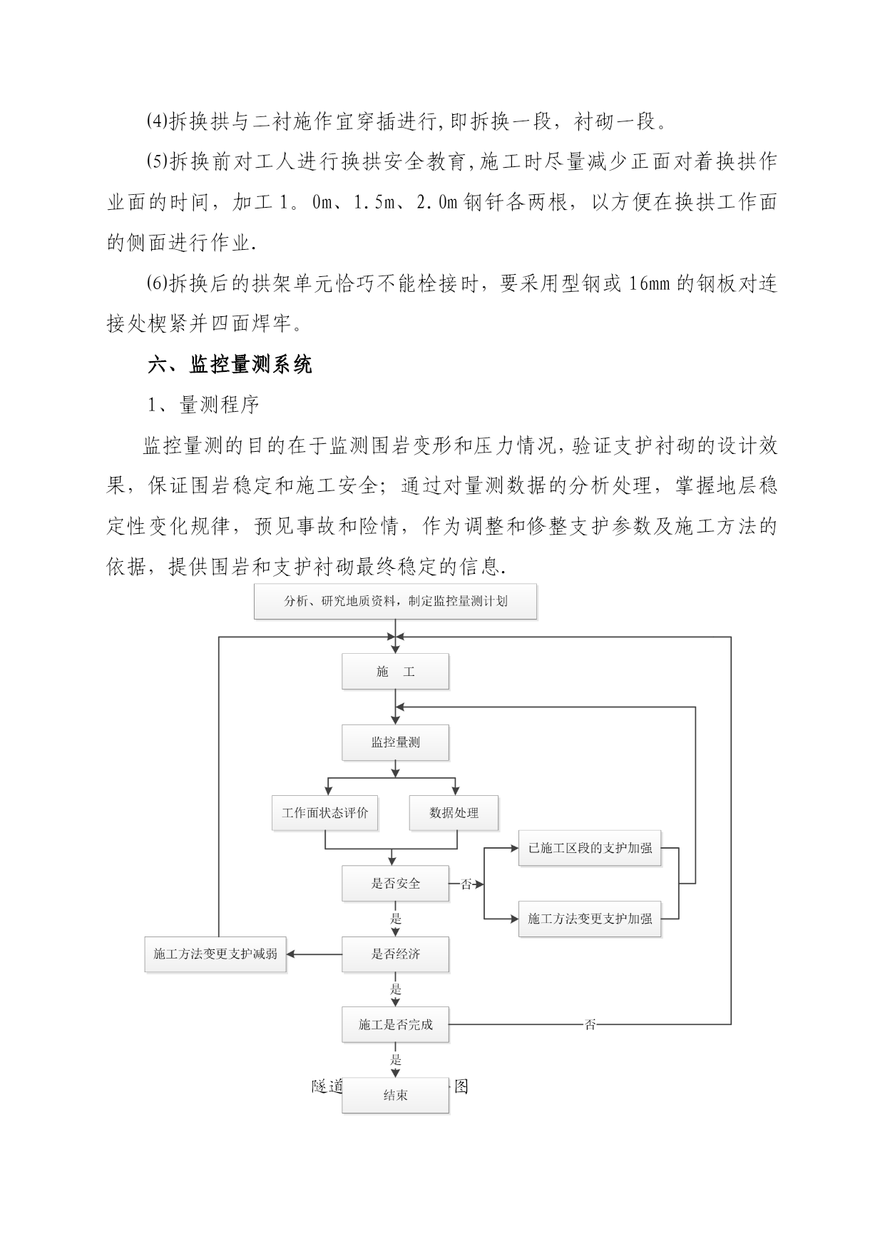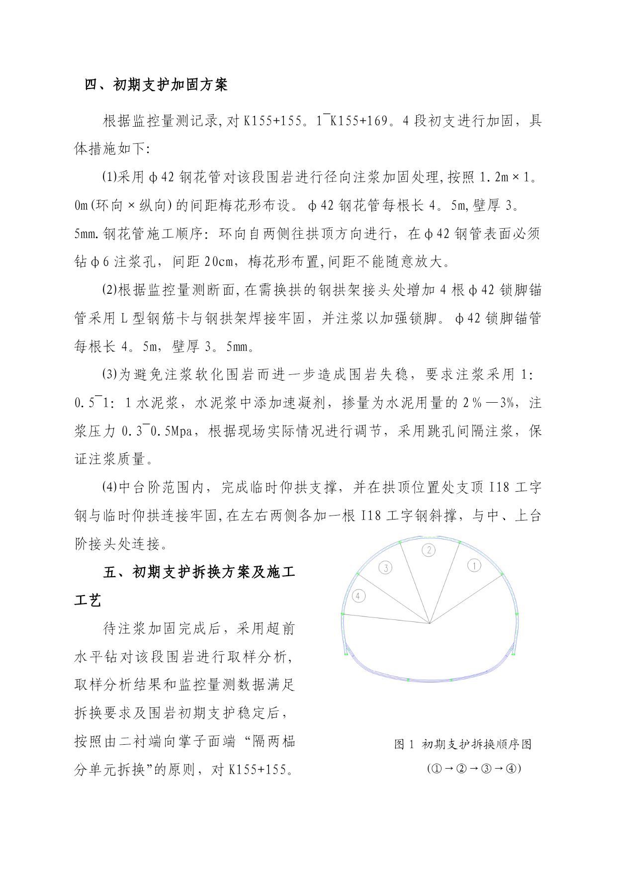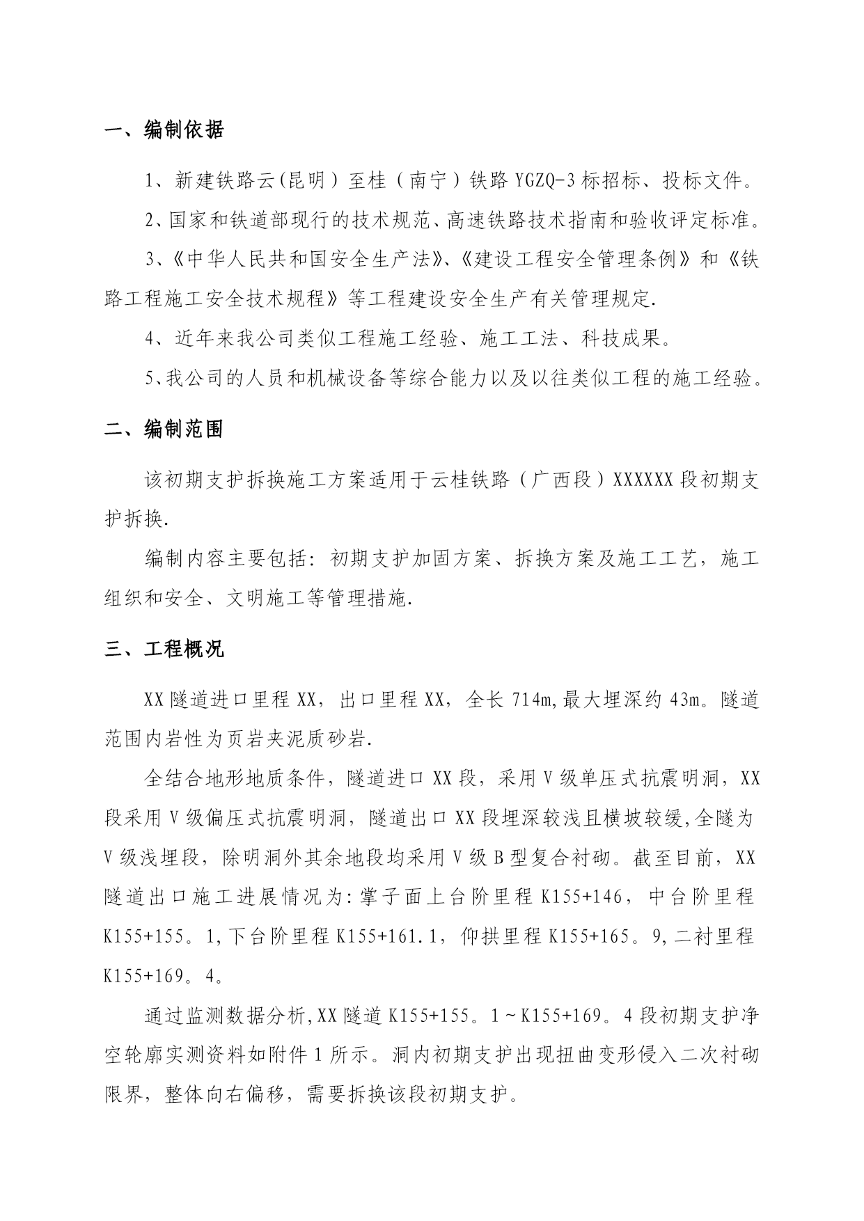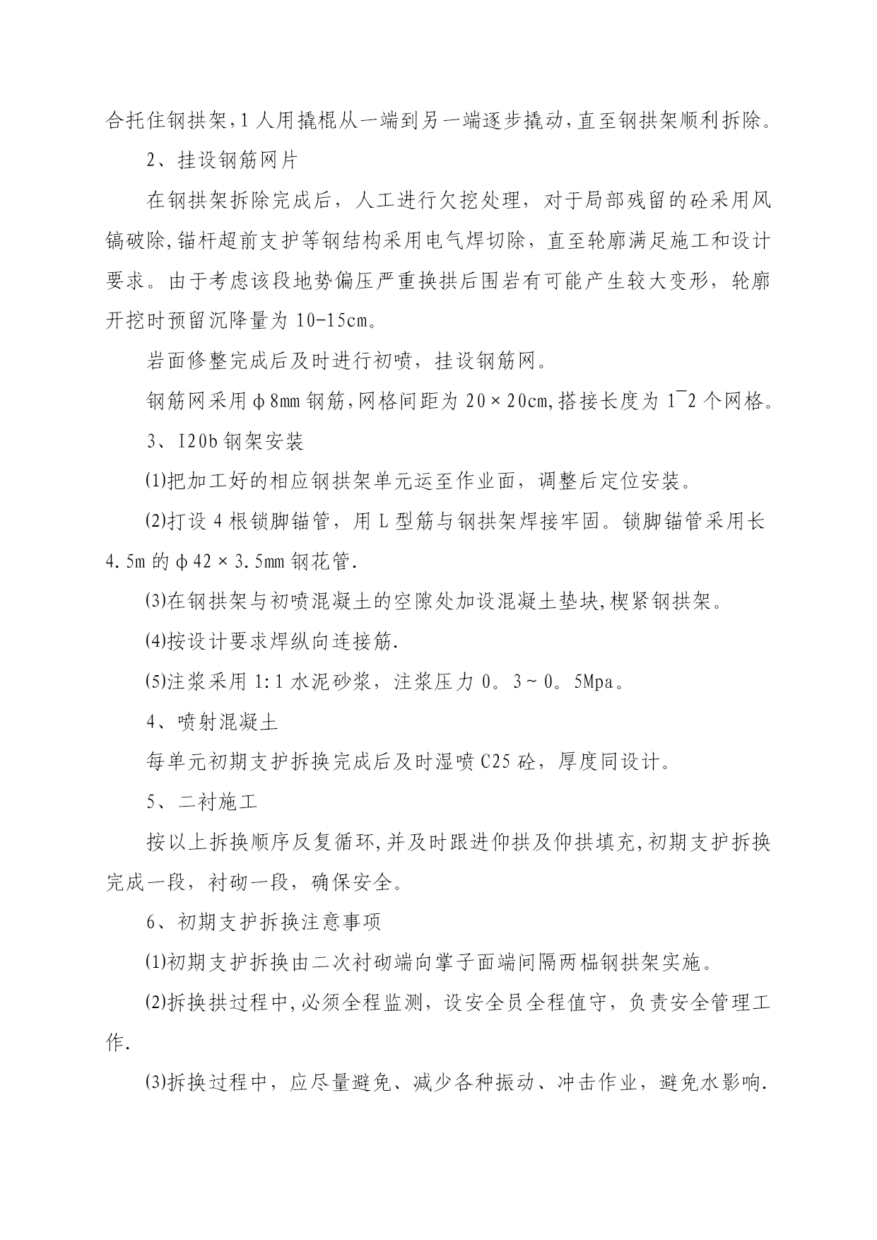 隧道换拱施工方案实用文档(实用文档,可以直接使用,可编辑优秀版资料,欢迎下载)隧道初期支护拆换施工方案审批:二零一四年四月目录TOC\o"1—3"\h\z\uHYPERLINK\l"_Toc295776265"一、编制依据PAGEREF_Toc295776265\h1HYPERLINK\l"_Toc295776266”二、编制范围PAGEREF_Toc295776266\h1HYPERLINK\l"_Toc295776267”三、工程概况PAGEREF_Toc295776267\h1HYPERLINK\l"_Toc295776268”四、初期支护加固方案2HYPERLINK\l"_Toc295776269”五、初期支护拆换方案及施工工艺2HYPERLINK\l”_Toc295776270”六、监控量测系统5HYPERLINK\l"_Toc295776271"七、安全质量保证措施7一、编制依据1、新建铁路云(昆明)至桂(南宁)铁路YGZQ-3标招标、投标文件。2、国家和铁道部现行的技术规范、高速铁路技术指南和验收评定标准。3、《中华人民共和国安全生产法》、《建设工程安全管理条例》和《铁路工程施工安全技术规程》等工程建设安全生产有关管理规定.4、近年来我公司类似工程施工经验、施工工法、科技成果。5、我公司的人员和机械设备等综合能力以及以往类似工程的施工经验。二、编制范围该初期支护拆换施工方案适用于云桂铁路(广西段)XXXXXX段初期支护拆换.编制内容主要包括:初期支护加固方案、拆换方案及施工工艺,施工组织和安全、文明施工等管理措施.三、工程概况XX隧道进口里程XX,出口里程XX,全长714m,最大埋深约43m。隧道范围内岩性为页岩夹泥质砂岩.全结合地形地质条件,隧道进口XX段,采用V级单压式抗震明洞,XX段采用V级偏压式抗震明洞,隧道出口XX段埋深较浅且横坡较缓,全隧为V级浅埋段,除明洞外其余地段均采用V级B型复合衬砌。截至目前,XX隧道出口施工进展情况为:掌子面上台阶里程K155+146,中台阶里程K155+155。1,下台阶里程K155+161.1,仰拱里程K155+165。9,二衬里程K155+169。4。通过监测数据分析,XX隧道K155+155。1~K155+169。4段初期支护净空轮廓实测资料如附件1所示。洞内初期支护出现扭曲变形侵入二次衬砌限界,整体向右偏移,需要拆换该段初期支护。四、初期支护加固方案根据监控量测记录,对K155+155。1~K155+169。4段初支进行加固,具体措施如下:⑴采用φ42钢花管对该段围岩进行径向注浆加固处理,按照1.2m×1。0m(环向×纵向)的间距梅花形布设。φ42钢花管每根长4。5m,壁厚3。5mm.钢花管施工顺序:环向自两侧往拱顶方向进行,在φ42钢管表面必须钻φ6注浆孔,间距20cm,梅花形布置,间距不能随意放大。⑵根据监控量测断面,在需换拱的钢拱架接头处增加4根φ42锁脚锚管采用L型钢筋卡与钢拱架焊接牢固,并注浆以加强锁脚。φ42锁脚锚管每根长4。5m,壁厚3。5mm。⑶为避免注浆软化围岩而进一步造成围岩失稳,要求注浆采用1:0.5~1:1水泥浆,水泥浆中添加速凝剂,掺量为水泥用量的2%—3%,注浆压力0.3~0.5Mpa,根据现场实际情况进行调节,采用跳孔间隔注浆,保证注浆质量。图1初期支护拆换顺序图(①→②→③→④)⑷中台阶范围内,完成临时仰拱支撑,并在拱顶位置处支顶I18工字钢与临时仰拱连接牢固,在左右两侧各加一根I18工字钢斜撑,与中、上台阶接头处连接。五、初期支护拆换方案及施工工艺待注浆加固完成后,采用超前水平钻对该段围岩进行取样分析,取样分析结果和监控量测数据满足拆换要求及围岩初期支护稳定后,按照由二衬端向掌子面端“隔两榀分单元拆换”的原则,对K155+155。1~K155+169.4段初期支护局部进行拆换,每榀拆换顺序如图1所示。初期支护拆换工艺流程如图2所示.1、拆除初期支护图2拆换工艺流程图按照拱架单元进行凿除,且每次只能凿除一榀中的一个拱架单元。凿除主要以人工利用风镐开挖为主,尽量减少对围岩的扰动。⑴初期支护喷射混凝土凿除根据断面测量结果凿除侵限喷射混凝土,凿除侵限初支混凝土施工注意事项:①根据断面实测数据,用红油漆在喷射混凝土表面标志出侵限的范围,并用数字写出该处或该段侵限多少。②风镐凿除喷射混凝土之前,必须先把喷射混凝土的凿除部分与不凿除部分在分界处切开分离,以防对不凿除部分混凝土有损伤.③不得大面积拆除初期支护,防止塌方及冒顶。=4\*GB3④拆换位置、