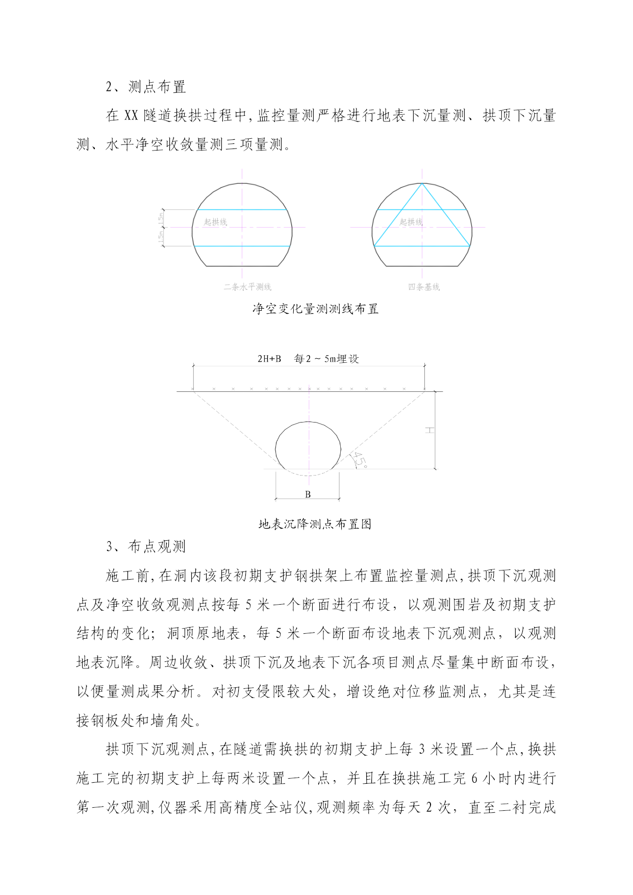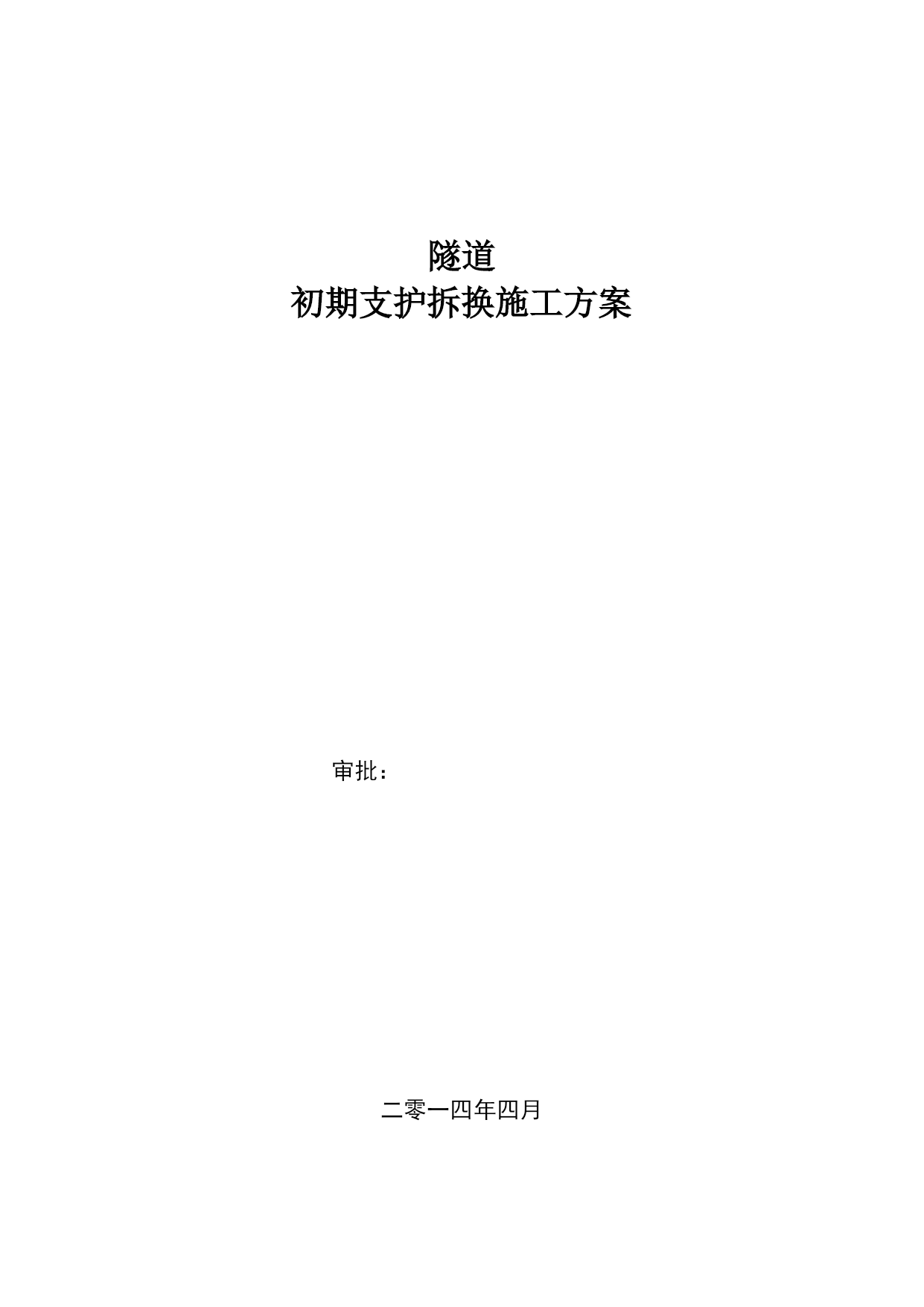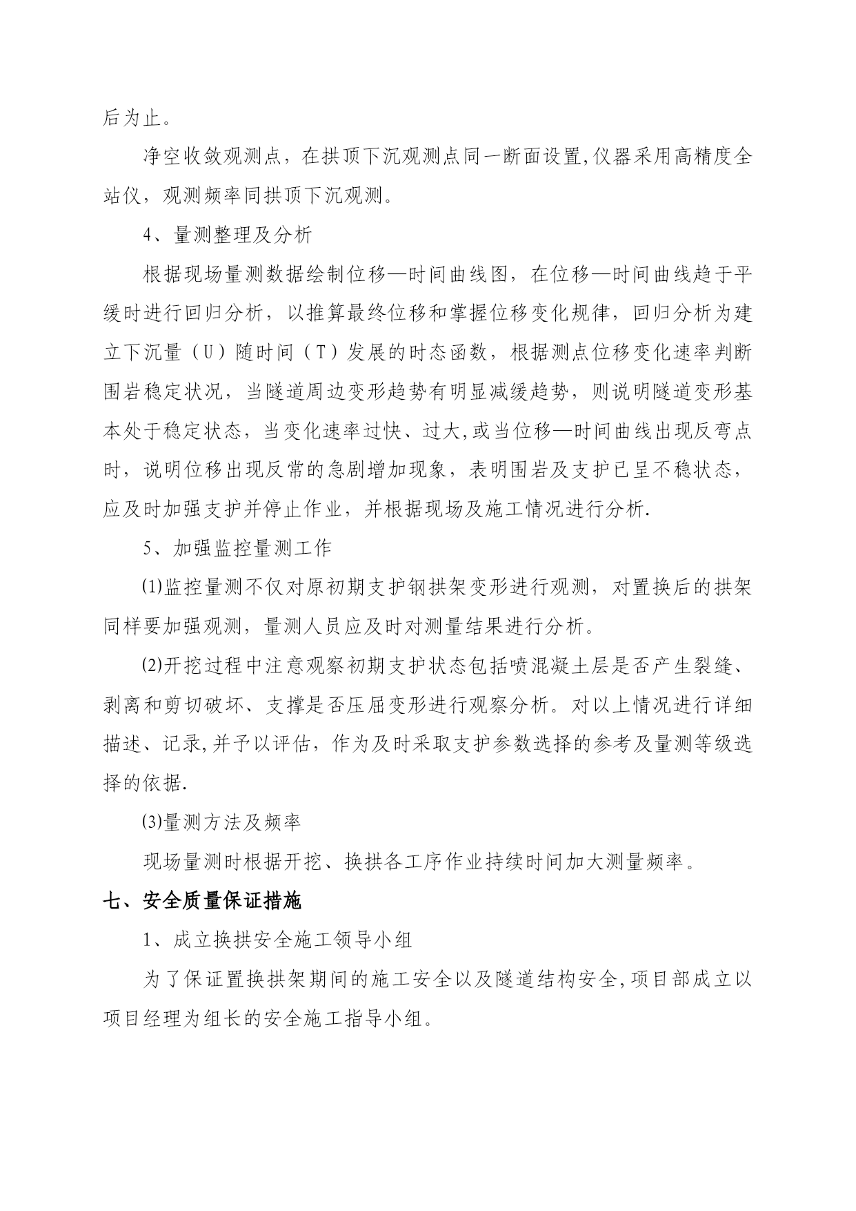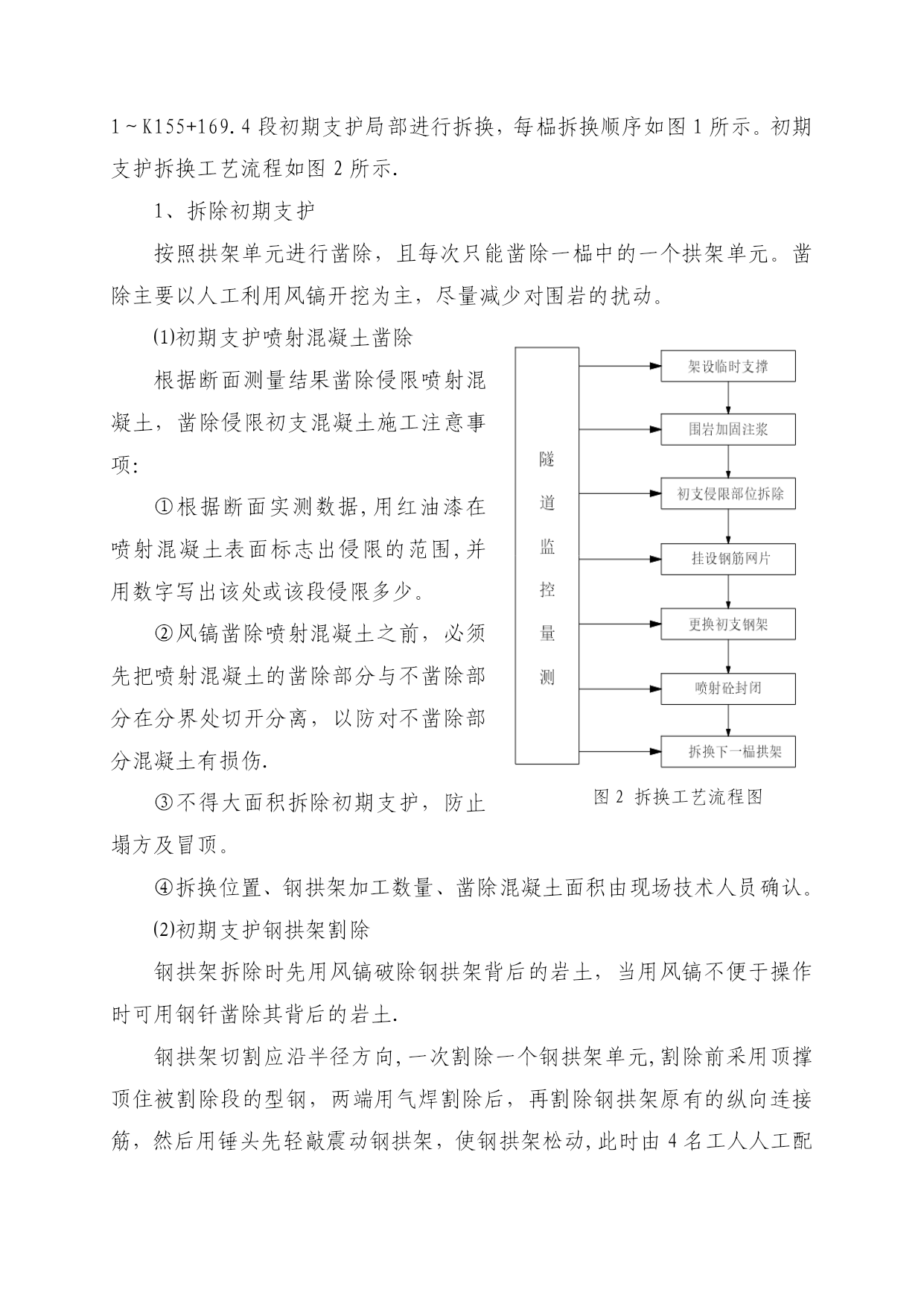 隧道换拱施工方案实用文档(实用文档,可以直接使用,可编辑优秀版资料,欢迎下载)隧道初期支护拆换施工方案审批:二零一四年四月目录TOC\o"1—3"\h\z\uHYPERLINK\l"_Toc295776265"一、编制依据PAGEREF_Toc295776265\h1HYPERLINK\l"_Toc295776266”二、编制范围PAGEREF_Toc295776266\h1HYPERLINK\l"_Toc295776267”三、工程概况PAGEREF_Toc295776267\h1HYPERLINK\l"_Toc295776268”四、初期支护加固方案2HYPERLINK\l"_Toc295776269”五、初期支护拆换方案及施工工艺2HYPERLINK\l”_Toc295776270”六、监控量测系统5HYPERLINK\l"_Toc295776271"七、安全质量保证措施7一、编制依据1、新建铁路云(昆明)至桂(南宁)铁路YGZQ-3标招标、投标文件。2、国家和铁道部现行的技术规范、高速铁路技术指南和验收评定标准。3、《中华人民共和国安全生产法》、《建设工程安全管理条例》和《铁路工程施工安全技术规程》等工程建设安全生产有关管理规定.4、近年来我公司类似工程施工经验、施工工法、科技成果。5、我公司的人员和机械设备等综合能力以及以往类似工程的施工经验。二、编制范围该初期支护拆换施工方案适用于云桂铁路(广西段)XXXXXX段初期支护拆换.编制内容主要包括:初期支护加固方案、拆换方案及施工工艺,施工组织和安全、文明施工等管理措施.三、工程概况XX隧道进口里程XX,出口里程XX,全长714m,最大埋深约43m。隧道范围内岩性为页岩夹泥质砂岩.全结合地形地质条件,隧道进口XX段,采用V级单压式抗震明洞,XX段采用V级偏压式抗震明洞,隧道出口XX段埋深较浅且横坡较缓,全隧为V级浅埋段,除明洞外其余地段均采用V级B型复合衬砌。截至目前,XX隧道出口施工进展情况为:掌子面上台阶里程K155+146,中台阶里程K155+155。1,下台阶里程K155+161.1,仰拱里程K155+165。9,二衬里程K155+169。4。通过监测数据分析,XX隧道K155+155。1~K155+169。4段初期支护净空轮廓实测资料如附件1所示。洞内初期支护出现扭曲变形侵入二次衬砌限界,整体向右偏移,需要拆换该段初期支护。四、初期支护加固方案根据监控量测记录,对K155+155。1~K155+169。4段初支进行加固,具体措施如下:⑴采用φ42钢花管对该段围岩进行径向注浆加固处理,按照1.2m×1。0m(环向×纵向)的间距梅花形布设。φ42钢花管每根长4。5m,壁厚3。5mm.钢花管施工顺序:环向自两侧往拱顶方向进行,在φ42钢管表面必须钻φ6注浆孔,间距20cm,梅花形布置,间距不能随意放大。⑵根据监控量测断面,在需换拱的钢拱架接头处增加4根φ42锁脚锚管采用L型钢筋卡与钢拱架焊接牢固,并注浆以加强锁脚。φ42锁脚锚管每根长4。5m,壁厚3。5mm。⑶为避免注浆软化围岩而进一步造成围岩失稳,要求注浆采用1:0.5~1:1水泥浆,水泥浆中添加速凝剂,掺量为水泥用量的2%—3%,注浆压力0.3~0.5Mpa,根据现场实际情况进行调节,采用跳孔间隔注浆,保证注浆质量。图1初期支护拆换顺序图(①→②→③→④)⑷中台阶范围内,完成临时仰拱支撑,并在拱顶位置处支顶I18工字钢与临时仰拱连接牢固,在左右两侧各加一根I18工字钢斜撑,与中、上台阶接头处连接。五、初期支护拆换方案及施工工艺待注浆加固完成后,采用超前水平钻对该段围岩进行取样分析,取样分析结果和监控量测数据满足拆换要求及围岩初期支护稳定后,按照由二衬端向掌子面端“隔两榀分单元拆换”的原则,对K155+155。1~K155+169.4段初期支护局部进行拆换,每榀拆换顺序如图1所示。初期支护拆换工艺流程如图2所示.1、拆除初期支护图2拆换工艺流程图按照拱架单元进行凿除,且每次只能凿除一榀中的一个拱架单元。凿除主要以人工利用风镐开挖为主,尽量减少对围岩的扰动。⑴初期支护喷射混凝土凿除根据断面测量结果凿除侵限喷射混凝土,凿除侵限初支混凝土施工注意事项:①根据断面实测数据,用红油漆在喷射混凝土表面标志出侵限的范围,并用数字写出该处或该段侵限多少。②风镐凿除喷射混凝土之前,必须先把喷射混凝土的凿除部分与不凿除部分在分界处切开分离,以防对不凿除部分混凝土有损伤.③不得大面积拆除初期支护,防止塌方及冒顶。=4\*GB3④拆换位置、