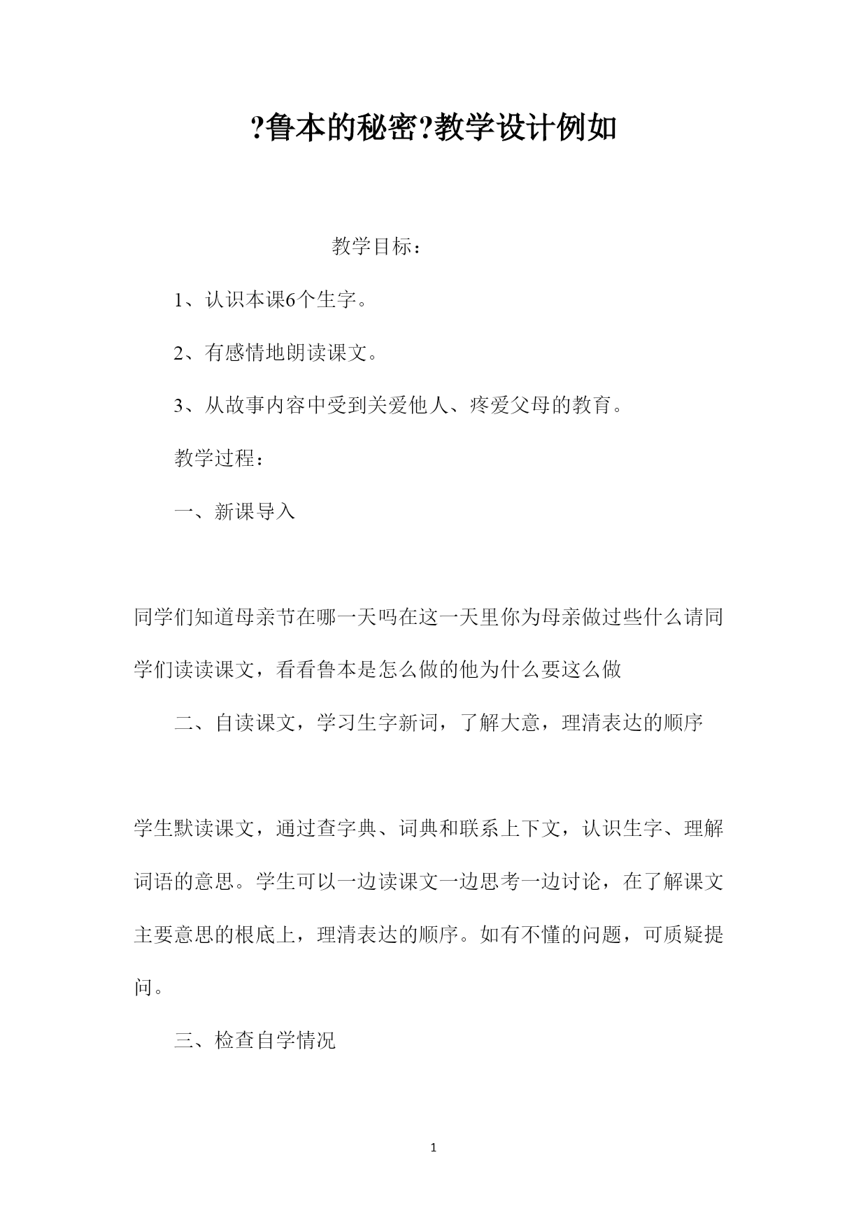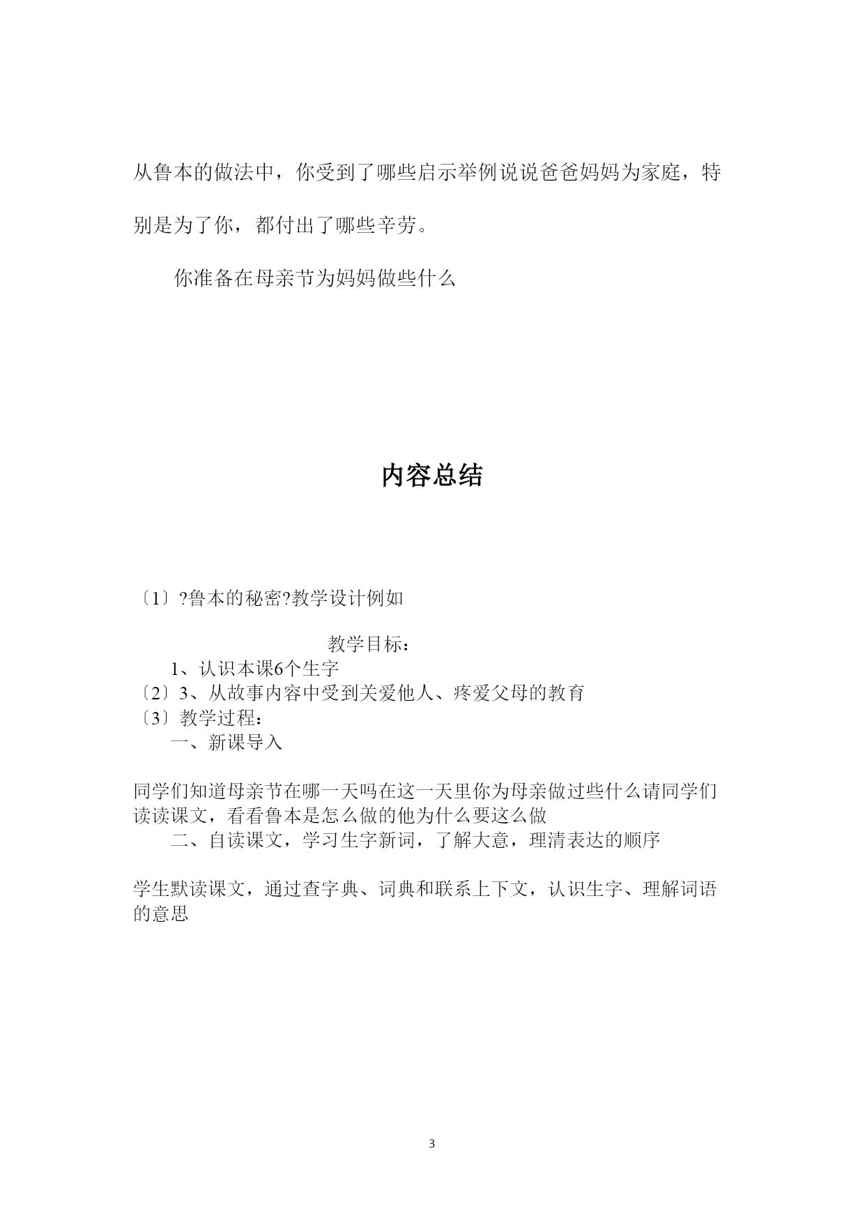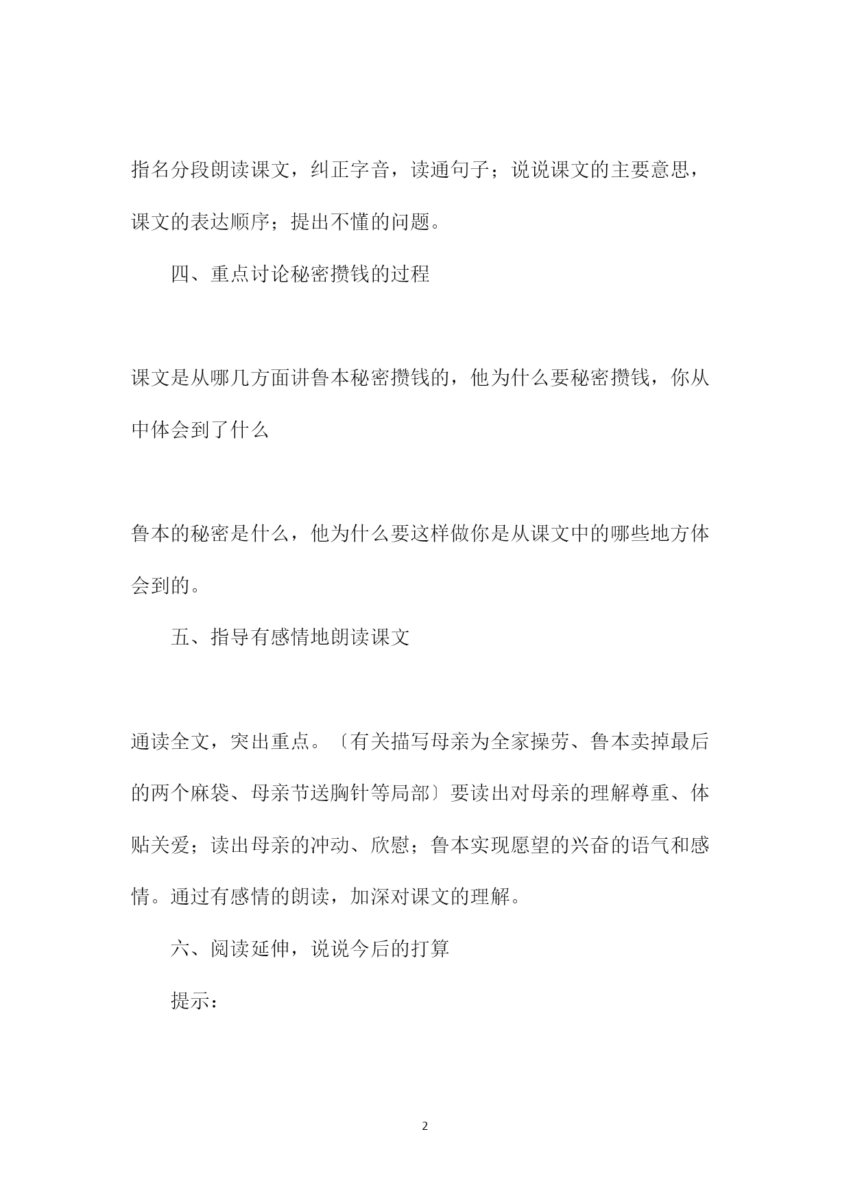PAGEPAGE3?鲁本的秘密?教学设计例如教学目标:1、认识本课6个生字。2、有感情地朗读课文。3、从故事内容中受到关爱他人、疼爱父母的教育。教学过程:一、新课导入同学们知道母亲节在哪一天吗在这一天里你为母亲做过些什么请同学们读读课文,看看鲁本是怎么做的他为什么要这么做二、自读课文,学习生字新词,了解大意,理清表达的顺序学生默读课文,通过查字典、词典和联系上下文,认识生字、理解词语的意思。学生可以一边读课文一边思考一边讨论,在了解课文主要意思的根底上,理清表达的顺序。如有不懂的问题,可质疑提问。三、检查自学情况指名分段朗读课文,纠正字音,读通句子;说说课文的主要意思,课文的表达顺序;提出不懂的问题。四、重点讨论秘密攒钱的过程课文是从哪几方面讲鲁本秘密攒钱的,他为什么要秘密攒钱,你从中体会到了什么鲁本的秘密是什么,他为什么要这样做你是从课文中的哪些地方体会到的。五、指导有感情地朗读课文通读全文,突出重点。〔有关描写母亲为全家操劳、鲁本卖掉最后的两个麻袋、母亲节送胸针等局部〕要读出对母亲的理解尊重、体贴关爱;读出母亲的冲动、欣慰;鲁本实现愿望的兴奋的语气和感情。通过有感情的朗读,加深对课文的理解。六、阅读延伸,说说今后的打算提示:从鲁本的做法中,你受到了哪些启示举例说说爸爸妈妈为家庭,特别是为了你,都付出了哪些辛劳。你准备在母亲节为妈妈做些什么内容总结〔1〕?鲁本的秘密?教学设计例如教学目标:1、认识本课6个生字〔2〕3、从故事内容中受到关爱他人、疼爱父母的教育〔3〕教学过程:一、新课导入同学们知道母亲节在哪一天吗在这一天里你为母亲做过些什么请同学们读读课文,看看鲁本是怎么做的他为什么要这么做二、自读课文,学习生字新词,了解大意,理清表达的顺序学生默读课文,通过查字典、词典和联系上下文,认识生字、理解词语的意思