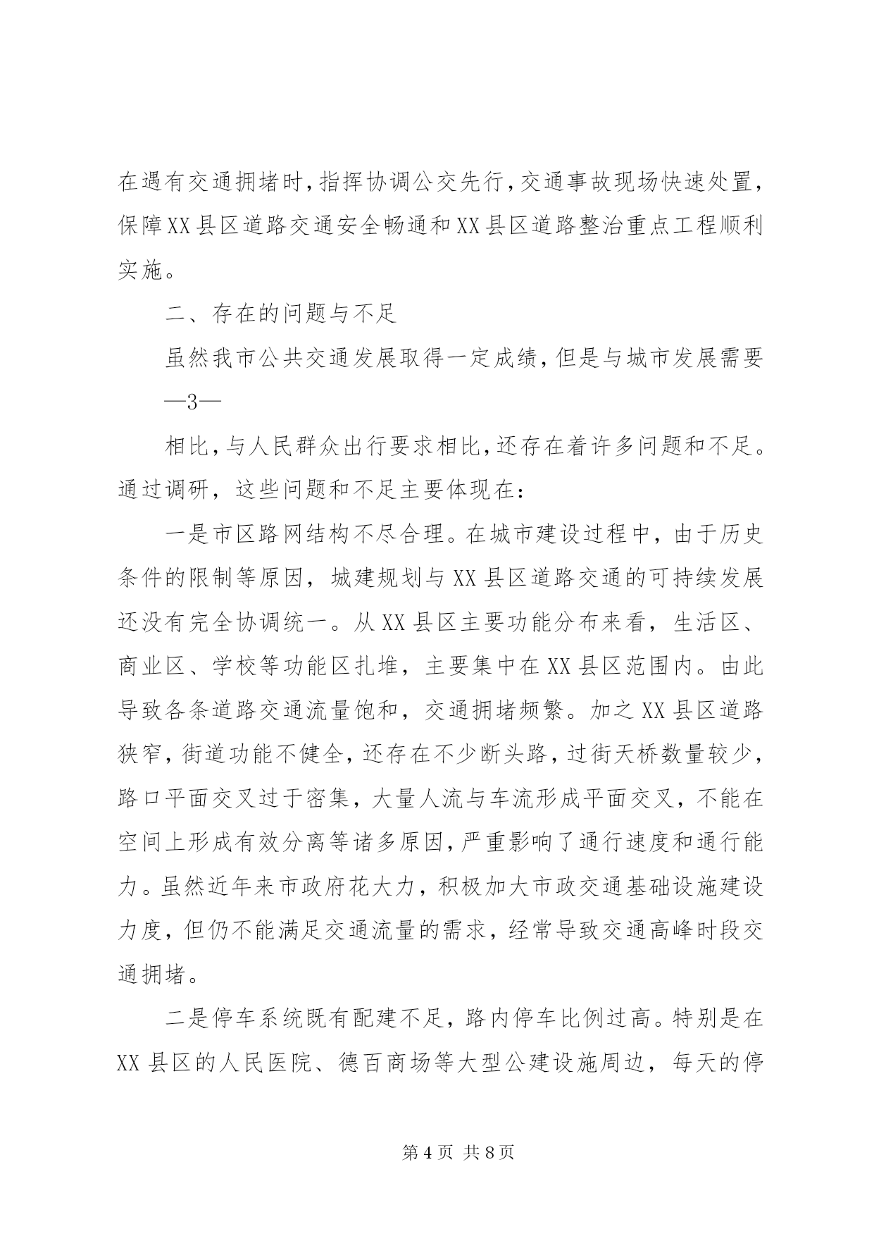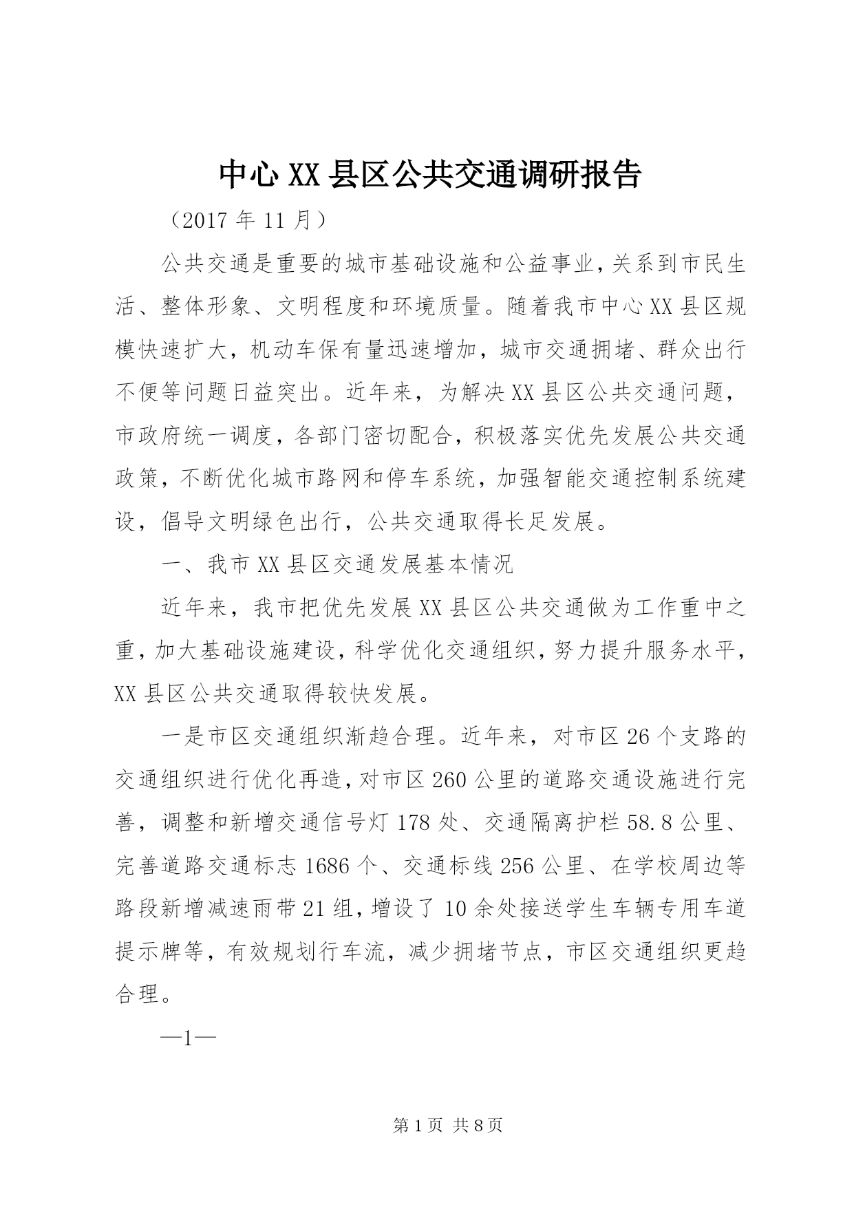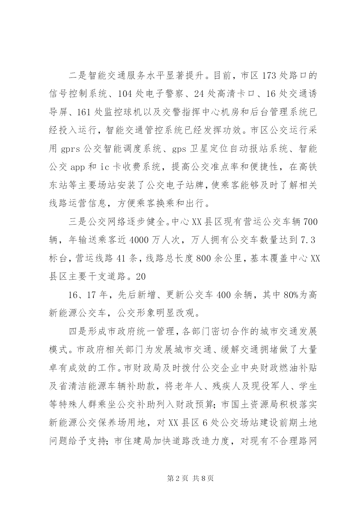 第PAGE\*Arabic\*MERGEFORMAT8页共NUMPAGES\*MERGEFORMAT8页中心XX县区公共交通调研报告(2017年11月)公共交通是重要的城市基础设施和公益事业,关系到市民生活、整体形象、文明程度和环境质量。随着我市中心XX县区规模快速扩大,机动车保有量迅速增加,城市交通拥堵、群众出行不便等问题日益突出。近年来,为解决XX县区公共交通问题,市政府统一调度,各部门密切配合,积极落实优先发展公共交通政策,不断优化城市路网和停车系统,加强智能交通控制系统建设,倡导文明绿色出行,公共交通取得长足发展。一、我市XX县区交通发展基本情况近年来,我市把优先发展XX县区公共交通做为工作重中之重,加大基础设施建设,科学优化交通组织,努力提升服务水平,XX县区公共交通取得较快发展。一是市区交通组织渐趋合理。近年来,对市区26个支路的交通组织进行优化再造,对市区260公里的道路交通设施进行完善,调整和新增交通信号灯178处、交通隔离护栏58.8公里、完善道路交通标志1686个、交通标线256公里、在学校周边等路段新增减速雨带21组,增设了10余处接送学生车辆专用车道提示牌等,有效规划行车流,减少拥堵节点,市区交通组织更趋合理。—1—二是智能交通服务水平显著提升。目前,市区173处路口的信号控制系统、104处电子警察、24处高清卡口、16处交通诱导屏、161处监控球机以及交警指挥中心机房和后台管理系统已经投入运行,智能交通管控系统已经发挥功效。市区公交运行采用gprs公交智能调度系统、gps卫星定位自动报站系统、智能公交app和ic卡收费系统,提高公交准点率和便捷性,在高铁东站等主要场站安装了公交电子站牌,使乘客能够及时了解相关线路运营信息,方便乘客换乘和出行。三是公交网络逐步健全。中心XX县区现有营运公交车辆700辆,年输送乘客近4000万人次,万人拥有公交车数量达到7.3标台,营运线路41条,线路总长度800余公里,基本覆盖中心XX县区主要干支道路。2016、17年,先后新增、更新公交车400余辆,其中80%为高新能源公交车,公交形象明显改观。四是形成市政府统一管理,各部门密切合作的城市交通发展模式。市政府相关部门为发展城市交通、缓解交通拥堵做了大量卓有成效的工作。市财政局及时拨付公交企业中央财政燃油补贴及省清洁能源车辆补助款,将老年人、残疾人及现役军人、学生等特殊人群乘坐公交补助列入财政预算;市国土资源局积极落实新能源公交保养场用地,对XX县区6处公交场站建设前期土地问题给予支持;市住建局加快道路改造力度,对现有不合理路网进行改扩建,从而全面提升通行效率,通过加快人行道、非机动车道的改造步伐,为倡导低碳、绿色交通提供硬件支撑。市规划局优—2—化、完善停车系统和自行车专用车道规划,积极开展公交场站建设前期工作;市交通运输局累计补助公交车辆购置款2000万元,牵头编制公交发展专项规划,及时调度开通新的公交线路,实现新、XX县区公交高效对接,先后开通了德平105路、德陵104路城际公交,为促进区域经济社会发展发挥了重要作用,全面实行ic卡收费乘车,积极推进交邮ic卡代售点合作和全国交通一卡通,落实老年人、残疾人、现役及伤残军人、学生等特殊群体优待免费乘车政策,落实大气污染红色预警期间免费乘坐公交政策,开通了行政中心通勤班线和故城机场拥军专线两条公益线路,经济与社会效益明显;市城管执法局采取五项措施加强交通拥堵问题整治,一是加强人行道停车管理,规范车辆停放,二是严管主干道,加大对违章占道乱摆卖行为的清理,三是规范施工围挡,最大限度减少施工作业对交通的影响,四是调整环卫作业时间,清扫保洁作业规避交通高峰,五是对影响交通指示的树木进行修剪,确保车辆顺畅通行;市公安局交警支队大力加强道路交通指挥疏导,全力加快智能交通建设,提高交通管理科技水平,确保重点路段、易堵路段、重要区域、施工路段、高峰时段管控到位,在遇有交通拥堵时,指挥协调公交先行,交通事故现场快速处置,保障XX县区道路交通安全畅通和XX县区道路整治重点工程顺利实施。二、存在的问题与不足虽然我市公共交通发展取得一定成绩,但是与城市发展需要—3—相比,与人民群众出行要求相比,还存在着许多问题和不足。通过调研,这些问题和不足主要体现在:一是市区路网结构不尽合理。在城市建设过程中,由于历史条件的限制等原因,城建规划与XX县区道路交通的可持续发展还没有完全协调统一。从XX县区主要功能分布来看,生活区、商业区、学校等功能区扎堆,主要集中在XX县区范围内。由此导致各条道路交通流量饱和,交通拥堵频繁。加之XX县区道路狭窄,街道功能不健全,还存在不少断头路,过街天桥数量较少,路口平面交叉过于密集,大量人流与车流形成平面交叉,不能在空间上形成有效分离等诸多原因,严