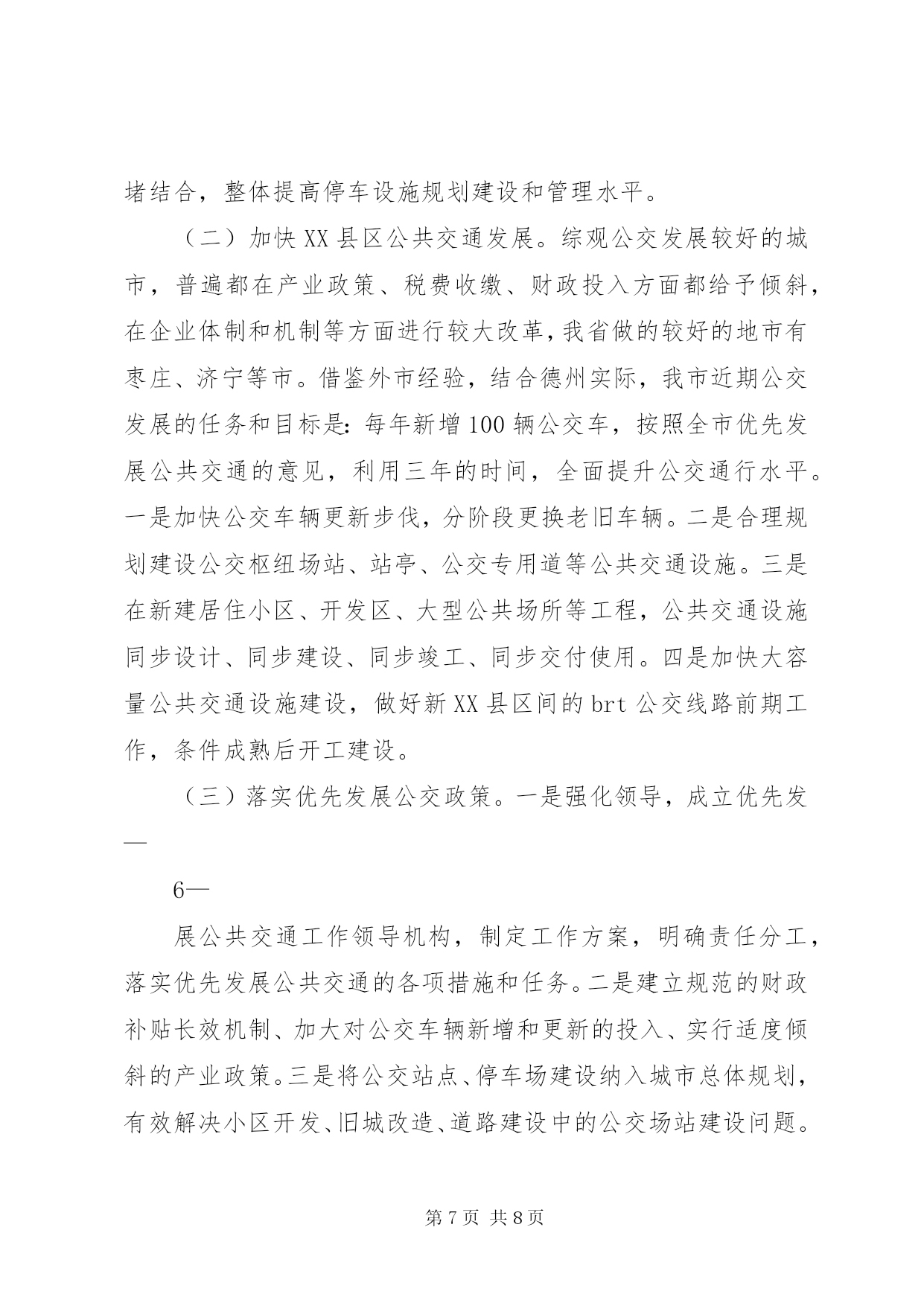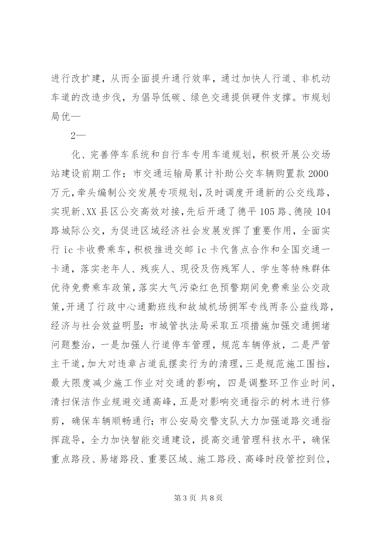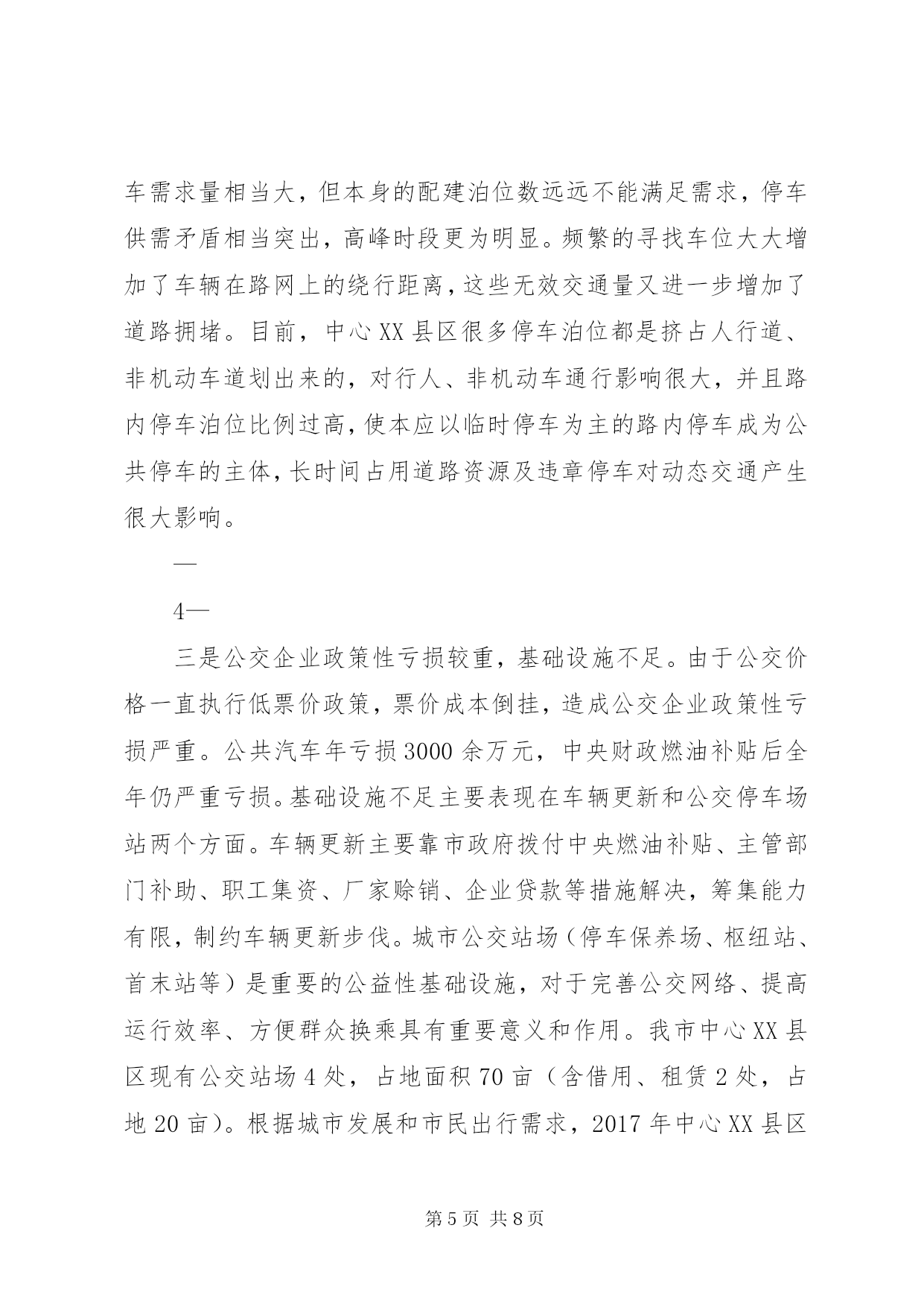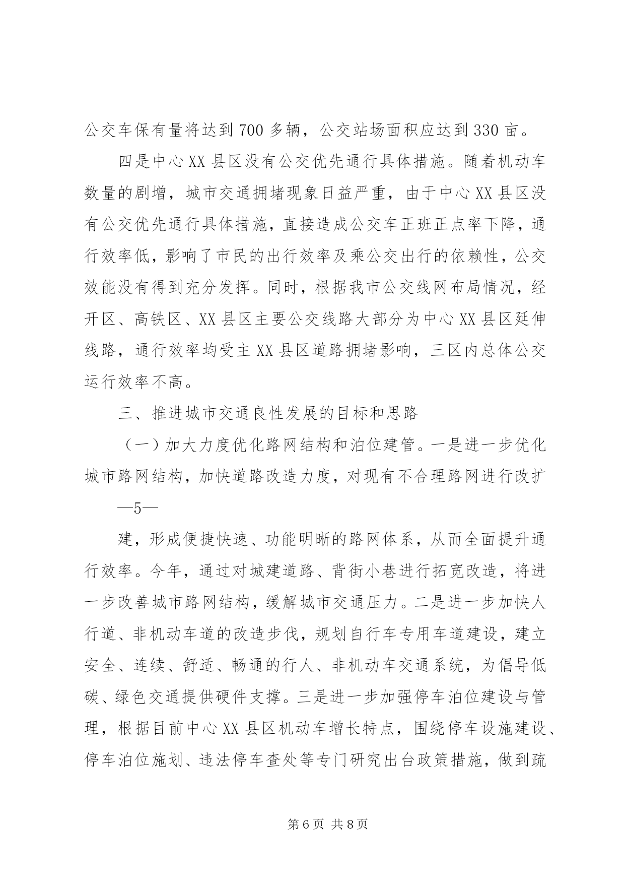 第PAGE\*Arabic\*MERGEFORMAT8页共NUMPAGES\*MERGEFORMAT8页中心XX县区公共交通调研报告(2017年11月)公共交通是重要的城市基础设施和公益事业,关系到市民生活、整体形象、文明程度和环境质量。随着我市中心XX县区规模快速扩大,机动车保有量迅速增加,城市交通拥堵、群众出行不便等问题日益突出。近年来,为解决XX县区公共交通问题,市政府统一调度,各部门密切配合,积极落实优先发展公共交通政策,不断优化城市路网和停车系统,加强智能交通控制系统建设,倡导文明绿色出行,公共交通取得长足发展。一、我市XX县区交通发展基本情况近年来,我市把优先发展XX县区公共交通做为工作重中之重,加大基础设施建设,科学优化交通组织,努力提升服务水平,XX县区公共交通取得较快发展。一是市区交通组织渐趋合理。近年来,对市区26个支路的交通组织进行优化再造,对市区260公里的道路交通设施进行完善,调整和新增交通信号灯178处、交通隔离护栏58.8公里、完善道路交通标志1686个、交通标线256公里、在学校周边等路段新增减速雨带21组,增设了10余处接送学生车辆专用车道提示牌等,有效规划行车流,减少拥堵节点,市区交通组织更趋合理。—1—二是智能交通服务水平显著提升。目前,市区173处路口的信号控制系统、104处电子警察、24处高清卡口、16处交通诱导屏、161处监控球机以及交警指挥中心机房和后台管理系统已经投入运行,智能交通管控系统已经发挥功效。市区公交运行采用gprs公交智能调度系统、gps卫星定位自动报站系统、智能公交app和ic卡收费系统,提高公交准点率和便捷性,在高铁东站等主要场站安装了公交电子站牌,使乘客能够及时了解相关线路运营信息,方便乘客换乘和出行。三是公交网络逐步健全。中心XX县区现有营运公交车辆700辆,年输送乘客近4000万人次,万人拥有公交车数量达到7.3标台,营运线路41条,线路总长度800余公里,基本覆盖中心XX县区主要干支道路。2016、17年,先后新增、更新公交车400余辆,其中80%为高新能源公交车,公交形象明显改观。四是形成市政府统一管理,各部门密切合作的城市交通发展模式。市政府相关部门为发展城市交通、缓解交通拥堵做了大量卓有成效的工作。市财政局及时拨付公交企业中央财政燃油补贴及省清洁能源车辆补助款,将老年人、残疾人及现役军人、学生等特殊人群乘坐公交补助列入财政预算;市国土资源局积极落实新能源公交保养场用地,对XX县区6处公交场站建设前期土地问题给予支持;市住建局加快道路改造力度,对现有不合理路网进行改扩建,从而全面提升通行效率,通过加快人行道、非机动车道的改造步伐,为倡导低碳、绿色交通提供硬件支撑。市规划局优—2—化、完善停车系统和自行车专用车道规划,积极开展公交场站建设前期工作;市交通运输局累计补助公交车辆购置款2000万元,牵头编制公交发展专项规划,及时调度开通新的公交线路,实现新、XX县区公交高效对接,先后开通了德平105路、德陵104路城际公交,为促进区域经济社会发展发挥了重要作用,全面实行ic卡收费乘车,积极推进交邮ic卡代售点合作和全国交通一卡通,落实老年人、残疾人、现役及伤残军人、学生等特殊群体优待免费乘车政策,落实大气污染红色预警期间免费乘坐公交政策,开通了行政中心通勤班线和故城机场拥军专线两条公益线路,经济与社会效益明显;市城管执法局采取五项措施加强交通拥堵问题整治,一是加强人行道停车管理,规范车辆停放,二是严管主干道,加大对违章占道乱摆卖行为的清理,三是规范施工围挡,最大限度减少施工作业对交通的影响,四是调整环卫作业时间,清扫保洁作业规避交通高峰,五是对影响交通指示的树木进行修剪,确保车辆顺畅通行;市公安局交警支队大力加强道路交通指挥疏导,全力加快智能交通建设,提高交通管理科技水平,确保重点路段、易堵路段、重要区域、施工路段、高峰时段管控到位,在遇有交通拥堵时,指挥协调公交先行,交通事故现场快速处置,保障XX县区道路交通安全畅通和XX县区道路整治重点工程顺利实施。二、存在的问题与不足虽然我市公共交通发展取得一定成绩,但是与城市发展需要—3—相比,与人民群众出行要求相比,还存在着许多问题和不足。通过调研,这些问题和不足主要体现在:一是市区路网结构不尽合理。在城市建设过程中,由于历史条件的限制等原因,城建规划与XX县区道路交通的可持续发展还没有完全协调统一。从XX县区主要功能分布来看,生活区、商业区、学校等功能区扎堆,主要集中在XX县区范围内。由此导致各条道路交通流量饱和,交通拥堵频繁。加之XX县区道路狭窄,街道功能不健全,还存在不少断头路,过街天桥数量较少,路口平面交叉过于密集,大量人流与车流形成平面交叉,不能在空间上形成有效分离等诸多原因,严