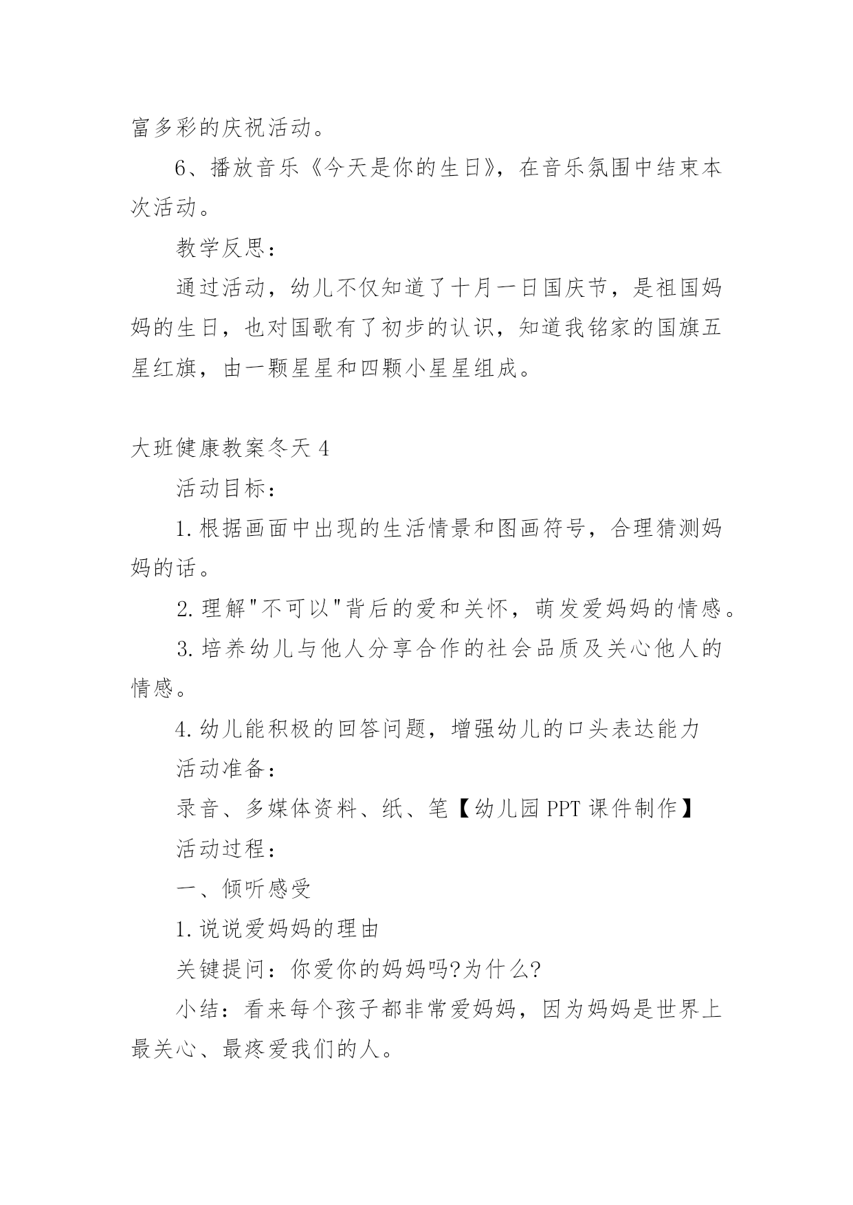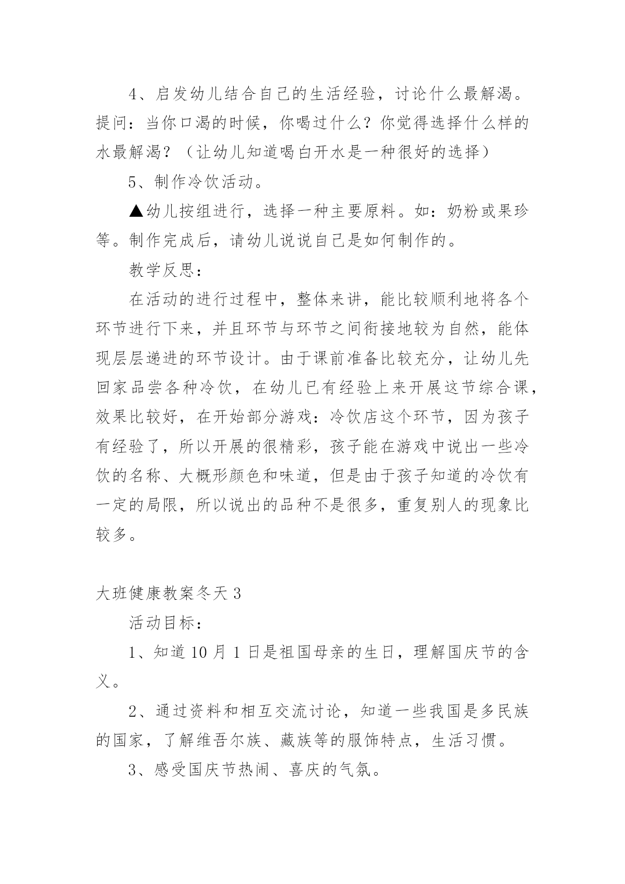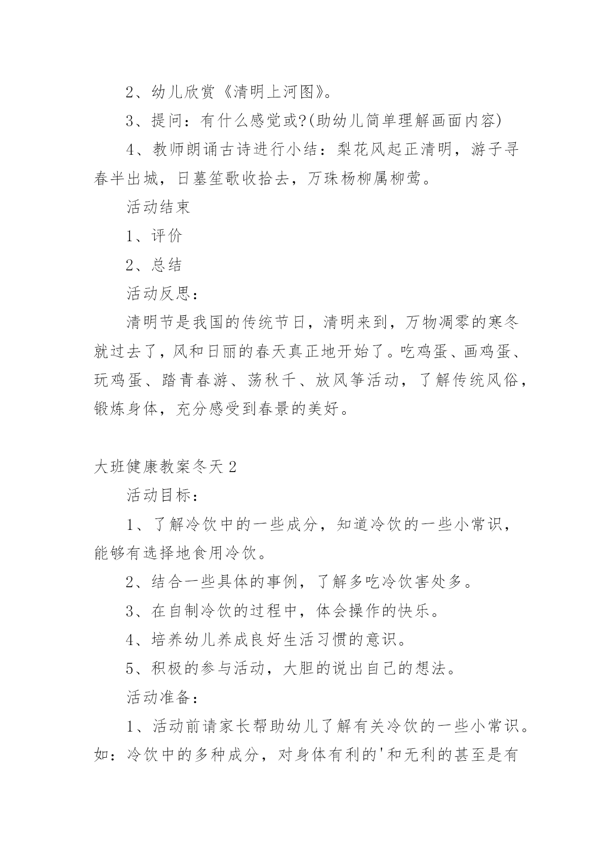 大班健康教案冬天作为一位不辞辛劳的人民教师,常常要根据教学需要编写教案,编写教案助于积累教学经验,不断提高教学质量。那么写教案需要注意哪些问题呢?下面是小编整理的大班健康教案冬天,仅供参考,欢迎大家阅读。大班健康教案冬天1活动目标1、理解四季轮换,感知清明是春天的节日,产生进一步探索了解中国传统节日的兴趣。2、喜欢古诗、古画等一些表达方式,在欣赏与体验中加深对我国节日文化的了解与喜爱。3、简单了解节日的来历,知道其全称、日期和意义。4、体验与同伴集体过节日的快乐。活动准备清明上河图复制品、有关清明照片活动过程(一)猜猜讲讲,理解四季轮换。1、演示画面一,看到这个图形你想到了什么?小结:一年从1月开始,从12月结束;新的一年又从1月开始,从12月结束。2、演示画面二,现在,你们又想到了什么?小结:一年有四季,一年中,我们从春天开始,然后经过夏天和秋天,紧接着是冬天,这之后又是春天。一年又一年,季节就是这样在不停的交替着。3、演示画面三,前些时候我们在日历上发现了一些节气,想一想,她们可能会在什么季节?4、小结:一年从春天开始,过了立春,是惊蛰,过了春分,是---,过了寒,又是立春,节气能告诉我们季节的变化。(二)看看找找,感知清明。1、现在我们处在什么季节?2、春天里除了有立春、惊蛰、春分这些节气,还有哪些节气?(引出清明)。3、从文字上看,清明可能是什么意思?4、今天老师准备了许多图片,请小朋友来找一找,哪些与清明有关?幼儿分组商讨。(再现与迁移已有经验:咏柳、游园不值、清明时节等古诗)。5、小结:清明不仅是春天的节气还是春天的重的节日,是我们中国人的节日。在这个节日里人们踏青到自然的怀抱,享受着春天温和的`气候和万物苏醒带来的恢,感谢先烈、祖先给我们创造的美好生活。(三)视听欣赏,感受传统艺术。1、清明这个节日在中国古代就有了。中国古代的人不仅用文字、古诗记载了清明,还用绘画的方式进行了记录。今天,老师带来了一幅中国世世代代流传下来的名画,你们想不想看看那时清明节的热闹场面?2、幼儿欣赏《清明上河图》。3、提问:有什么感觉或?(助幼儿简单理解画面内容)4、教师朗诵古诗进行小结:梨花风起正清明,游子寻春半出城,日墓笙歌收拾去,万珠杨柳属柳莺。活动结束1、评价2、总结活动反思:清明节是我国的传统节日,清明来到,万物凋零的寒冬就过去了,风和日丽的春天真正地开始了。吃鸡蛋、画鸡蛋、玩鸡蛋、踏青春游、荡秋千、放风筝活动,了解传统风俗,锻炼身体,充分感受到春景的美好。大班健康教案冬天2活动目标:1、了解冷饮中的一些成分,知道冷饮的一些小常识,能够有选择地食用冷饮。2、结合一些具体的事例,了解多吃冷饮害处多。3、在自制冷饮的过程中,体会操作的快乐。4、培养幼儿养成良好生活习惯的意识。5、积极的参与活动,大胆的说出自己的想法。活动准备:1、活动前请家长帮助幼儿了解有关冷饮的一些小常识。如:冷饮中的多种成分,对身体有利的'和无利的甚至是有害的成分┉2、自制冷饮的饮料:奶粉、不同口味的果珍、苹果汁、蜂蜜、糖、筷子┉3、教师收集一些冷饮的外包装。活动过程:1、组织幼儿进行谈话活动。建议提下列问题:▲我知道小朋友都喜欢吃冷饮,你们都吃过哪些冷饮?▲你最喜欢吃哪些冷饮,它是什么味道的?▲你为什么喜欢吃冷饮?吃冷饮有哪些用处?▲吃冷饮又有哪些不好的地方?(幼儿自由讨论)2、教师小结:冷饮虽然好吃,特别是在夏天,吃了冷饮会让我们感觉很舒服、很凉爽,但冷饮吃多了,我们的肚子会提意见了,肚子不喜欢太冷的东西,它碰到太冷的食品就会生病。冷饮大多是很甜的,人体内如果有了太多甜的食物,会影响食欲,让我们不想吃其他的食物,长期下来我们身体没有了其他营养来补充,就生病了,会营养不良。3、了解冷饮中的成分和营养量。▲教师:你们吃过许多冷饮,你知道冷饮有哪些口味的?冷饮里面有哪些原料吗?你知道制作冷饮需要哪些原料吗?▲教师向幼儿介绍冷饮包装上介绍的成分,每说一种成分便让幼儿了解其中的营养成分的数量。这样可以让幼儿更清楚地认识冷饮的营养成分并不多。▲教师小结:不同口味,不同名称的冷饮所需要的原料也不一样,而且冷饮的营养并不高。4、启发幼儿结合自己的生活经验,讨论什么最解渴。提问:当你口渴的时候,你喝过什么?你觉得选择什么样的水最解渴?(让幼儿知道喝白开水是一种很好的选择)5、制作冷饮活动。▲幼儿按组进行,选择一种主要原料。如:奶粉或果珍等。制作完成后,请幼儿说说自己是如何制作的。教学反思:在活动的进行过程中,整体来讲,能比较顺利地将各个环节进行下来,并且环节与环节之间衔接地较为自然,能体现层层递进的环节设计。由于课前准备比较充分,让幼儿先回家品尝各种冷饮,在幼儿已有经验上来开展这节综合课,效果比较好,在开始部分游戏:冷饮店这个环节,因为孩子有经验了,所以开展的很精彩,孩