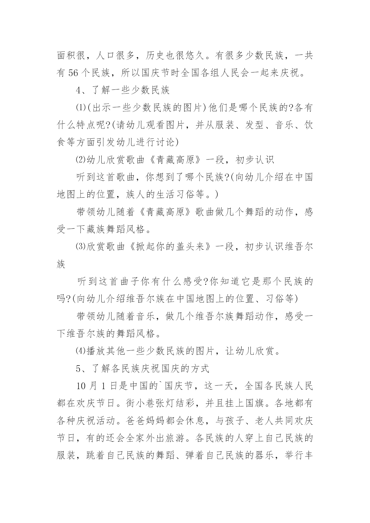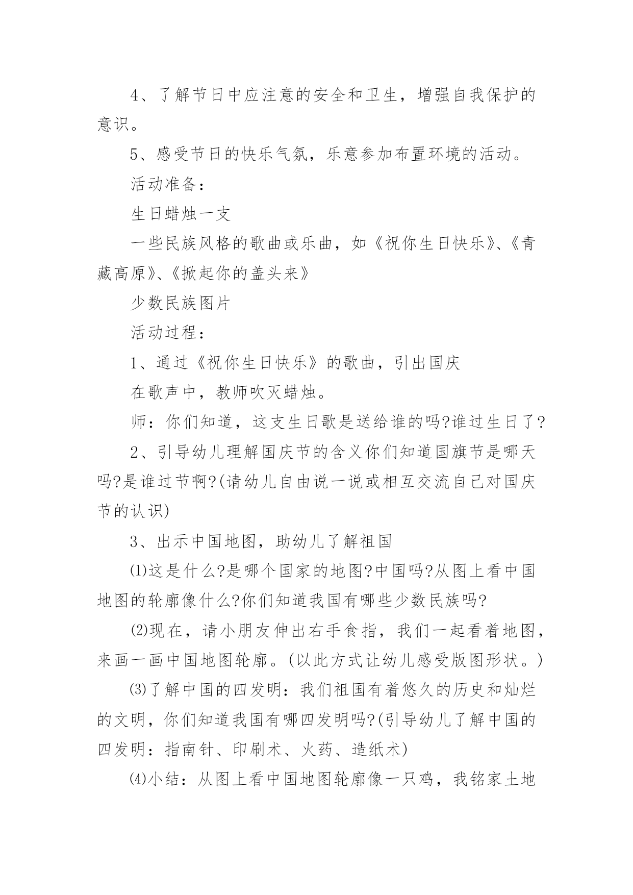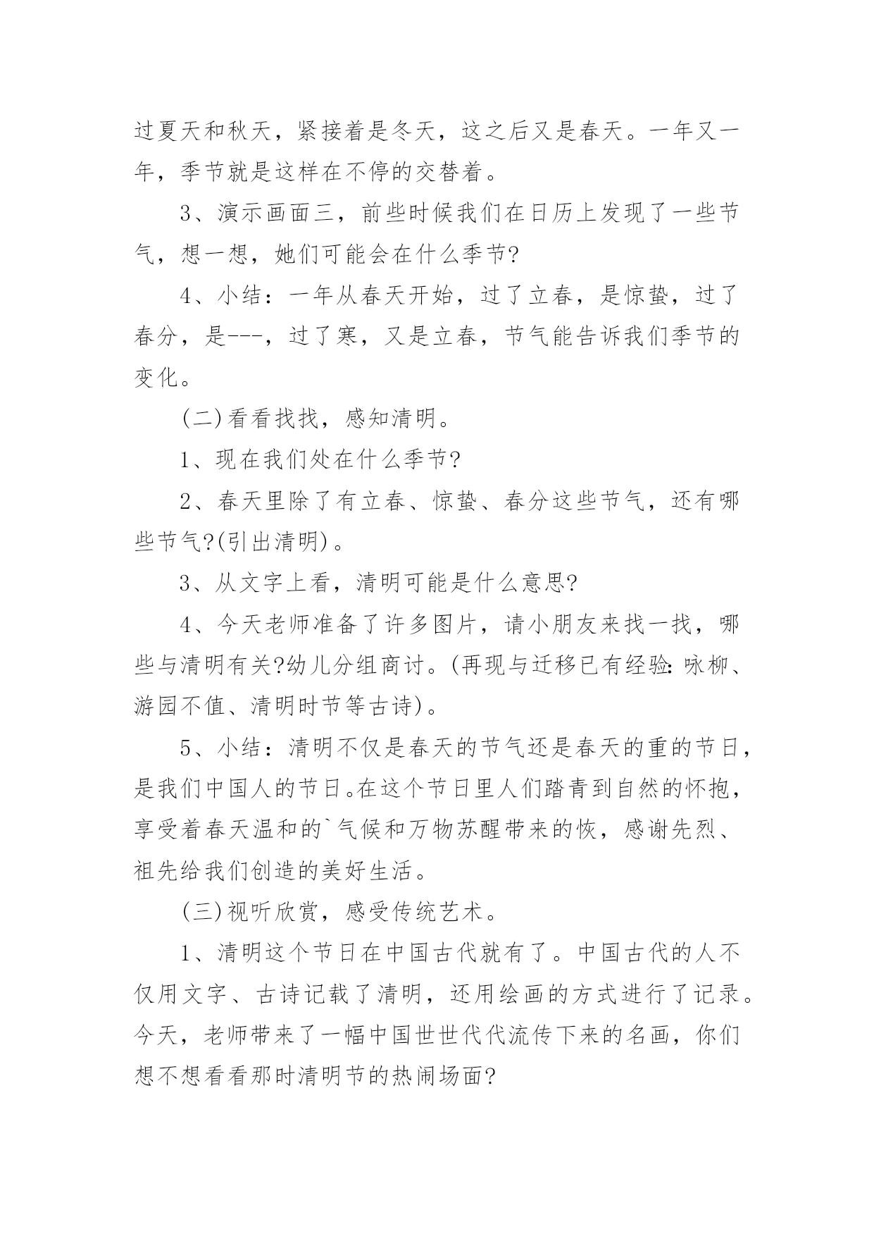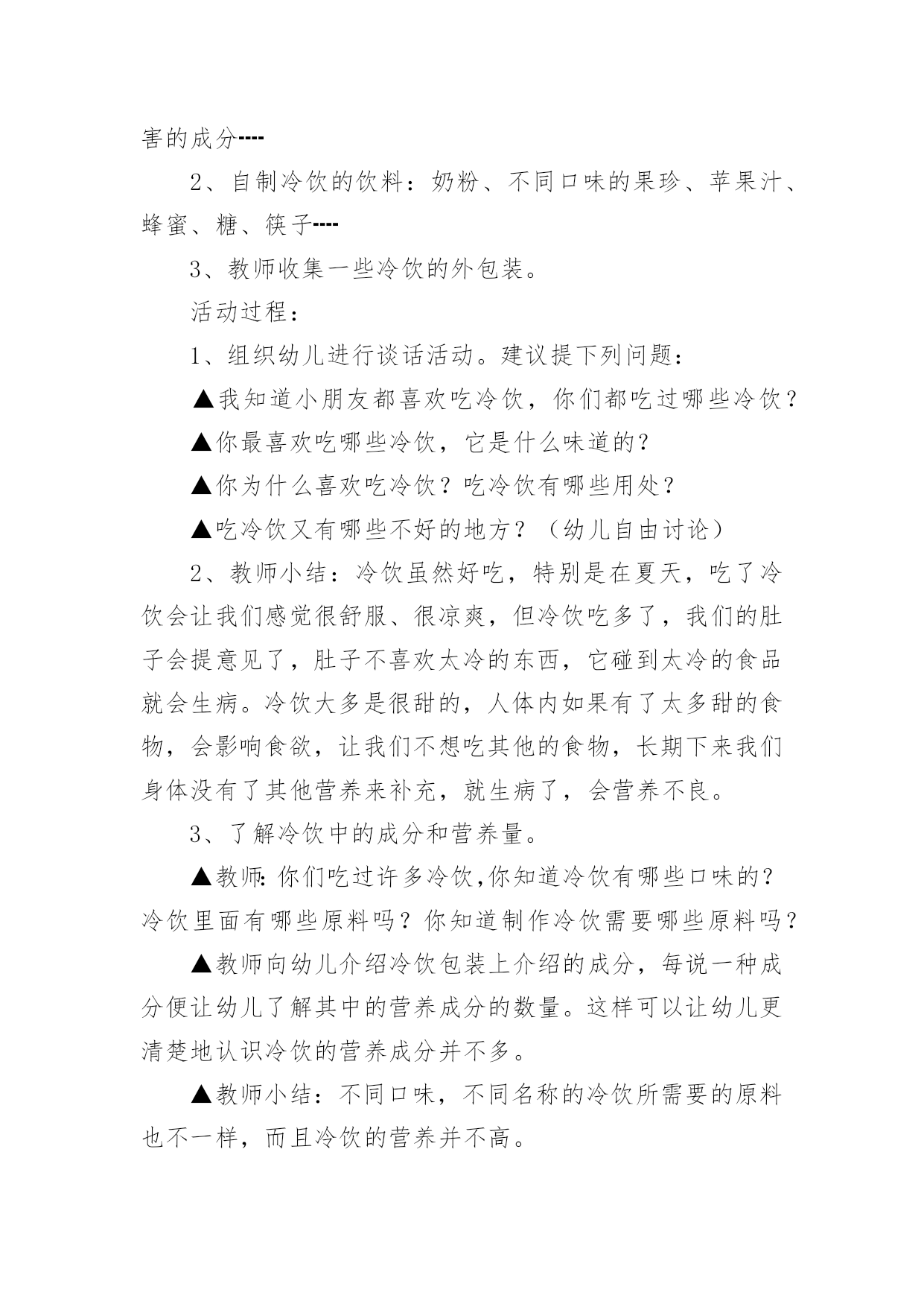 大班健康教案冬天作为一位不辞辛劳的人民教师,常常要根据教学需要编写教案,编写教案助于积累教学经验,不断提高教学质量。那么写教案需要注意哪些问题呢?下面是小编整理的大班健康教案冬天,仅供参考,欢迎大家阅读。大班健康教案冬天1活动目标1、理解四季轮换,感知清明是春天的节日,产生进一步探索了解中国传统节日的兴趣。2、喜欢古诗、古画等一些表达方式,在欣赏与体验中加深对我国节日文化的了解与喜爱。3、简单了解节日的来历,知道其全称、日期和意义。4、体验与同伴集体过节日的快乐。活动准备清明上河图复制品、有关清明照片活动过程(一)猜猜讲讲,理解四季轮换。1、演示画面一,看到这个图形你想到了什么?小结:一年从1月开始,从12月结束;新的一年又从1月开始,从12月结束。2、演示画面二,现在,你们又想到了什么?小结:一年有四季,一年中,我们从春天开始,然后经过夏天和秋天,紧接着是冬天,这之后又是春天。一年又一年,季节就是这样在不停的交替着。3、演示画面三,前些时候我们在日历上发现了一些节气,想一想,她们可能会在什么季节?4、小结:一年从春天开始,过了立春,是惊蛰,过了春分,是---,过了寒,又是立春,节气能告诉我们季节的变化。(二)看看找找,感知清明。1、现在我们处在什么季节?2、春天里除了有立春、惊蛰、春分这些节气,还有哪些节气?(引出清明)。3、从文字上看,清明可能是什么意思?4、今天老师准备了许多图片,请小朋友来找一找,哪些与清明有关?幼儿分组商讨。(再现与迁移已有经验:咏柳、游园不值、清明时节等古诗)。5、小结:清明不仅是春天的节气还是春天的重的节日,是我们中国人的节日。在这个节日里人们踏青到自然的怀抱,享受着春天温和的`气候和万物苏醒带来的恢,感谢先烈、祖先给我们创造的美好生活。(三)视听欣赏,感受传统艺术。1、清明这个节日在中国古代就有了。中国古代的人不仅用文字、古诗记载了清明,还用绘画的方式进行了记录。今天,老师带来了一幅中国世世代代流传下来的名画,你们想不想看看那时清明节的热闹场面?2、幼儿欣赏《清明上河图》。3、提问:有什么感觉或?(助幼儿简单理解画面内容)4、教师朗诵古诗进行小结:梨花风起正清明,游子寻春半出城,日墓笙歌收拾去,万珠杨柳属柳莺。活动结束1、评价2、总结活动反思:清明节是我国的传统节日,清明来到,万物凋零的寒冬就过去了,风和日丽的春天真正地开始了。吃鸡蛋、画鸡蛋、玩鸡蛋、踏青春游、荡秋千、放风筝活动,了解传统风俗,锻炼身体,充分感受到春景的美好。大班健康教案冬天2活动目标:1、了解冷饮中的一些成分,知道冷饮的一些小常识,能够有选择地食用冷饮。2、结合一些具体的事例,了解多吃冷饮害处多。3、在自制冷饮的过程中,体会操作的快乐。4、培养幼儿养成良好生活习惯的意识。5、积极的参与活动,大胆的说出自己的想法。活动准备:1、活动前请家长帮助幼儿了解有关冷饮的一些小常识。如:冷饮中的多种成分,对身体有利的'和无利的甚至是有害的成分┉2、自制冷饮的饮料:奶粉、不同口味的果珍、苹果汁、蜂蜜、糖、筷子┉3、教师收集一些冷饮的外包装。活动过程:1、组织幼儿进行谈话活动。建议提下列问题:▲我知道小朋友都喜欢吃冷饮,你们都吃过哪些冷饮?▲你最喜欢吃哪些冷饮,它是什么味道的?▲你为什么喜欢吃冷饮?吃冷饮有哪些用处?▲吃冷饮又有哪些不好的地方?(幼儿自由讨论)2、教师小结:冷饮虽然好吃,特别是在夏天,吃了冷饮会让我们感觉很舒服、很凉爽,但冷饮吃多了,我们的肚子会提意见了,肚子不喜欢太冷的东西,它碰到太冷的食品就会生病。冷饮大多是很甜的,人体内如果有了太多甜的食物,会影响食欲,让我们不想吃其他的食物,长期下来我们身体没有了其他营养来补充,就生病了,会营养不良。3、了解冷饮中的成分和营养量。▲教师:你们吃过许多冷饮,你知道冷饮有哪些口味的?冷饮里面有哪些原料吗?你知道制作冷饮需要哪些原料吗?▲教师向幼儿介绍冷饮包装上介绍的成分,每说一种成分便让幼儿了解其中的营养成分的数量。这样可以让幼儿更清楚地认识冷饮的营养成分并不多。▲教师小结:不同口味,不同名称的冷饮所需要的原料也不一样,而且冷饮的营养并不高。4、启发幼儿结合自己的生活经验,讨论什么最解渴。提问:当你口渴的时候,你喝过什么?你觉得选择什么样的水最解渴?(让幼儿知道喝白开水是一种很好的选择)5、制作冷饮活动。▲幼儿按组进行,选择一种主要原料。如:奶粉或果珍等。制作完成后,请幼儿说说自己是如何制作的。教学反思:在活动的进行过程中,整体来讲,能比较顺利地将各个环节进行下来,并且环节与环节之间衔接地较为自然,能体现层层递进的环节设计。由于课前准备比较充分,让幼儿先回家品尝各种冷饮,在幼儿已有经验上来开展这节综合课,效果比较好,在开始部分游戏:冷饮店这个环节,因为孩子有经验了,所以开展的很精彩,孩