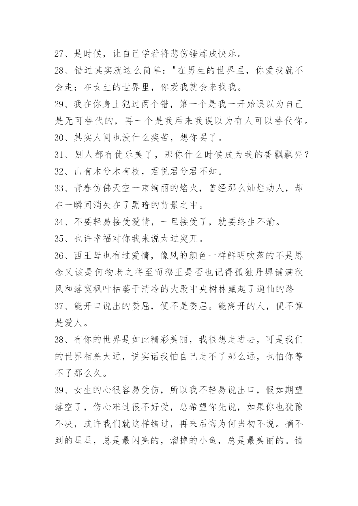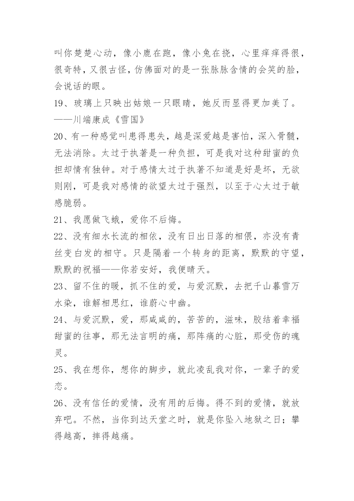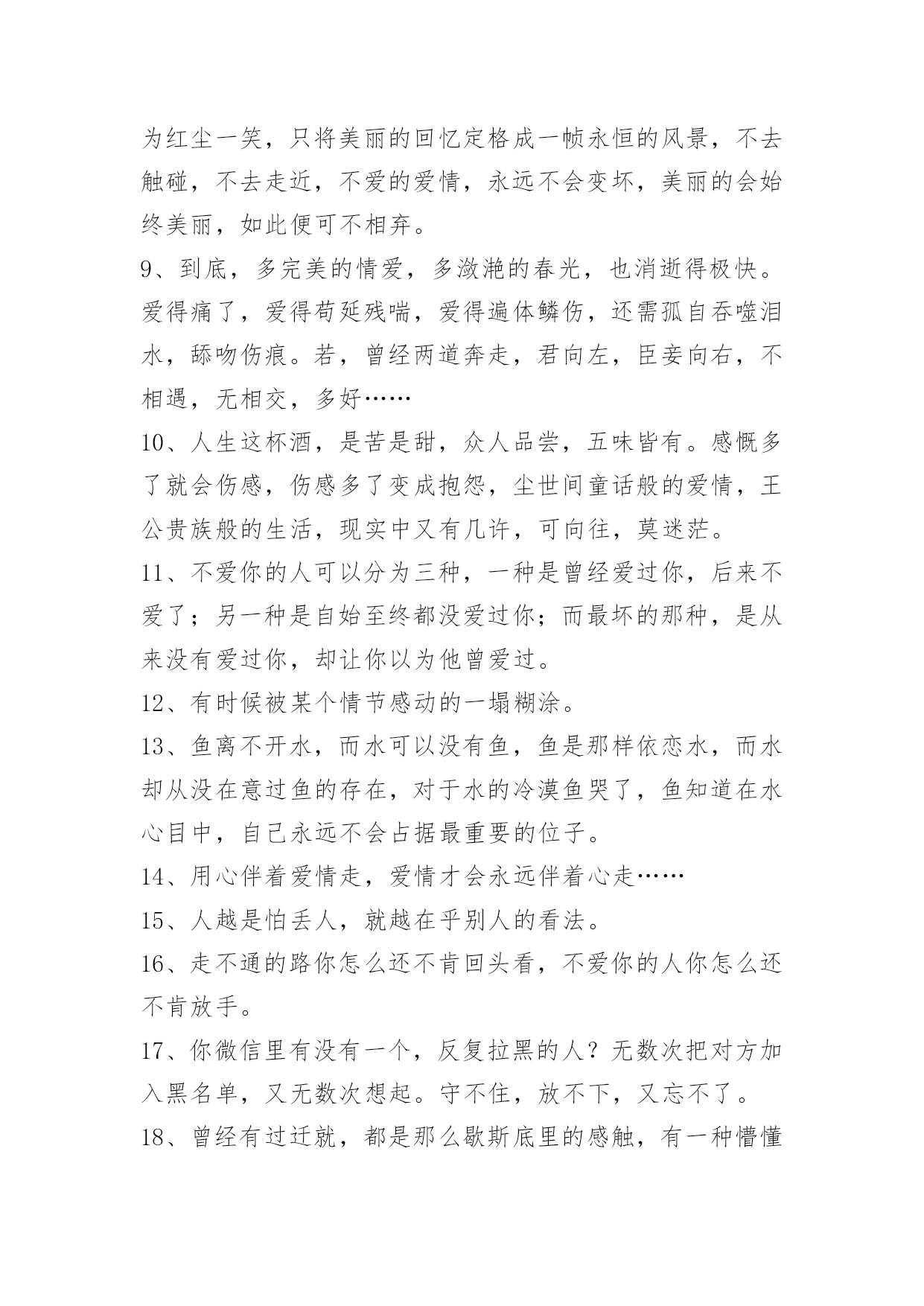 爱情情侣句子58条【推荐】爱情情侣句子58条爱情就象两个拉着橡皮筋的人,受伤的总是不愿意放手的那个人爱情老手,通常不会轻易将恋爱谈出结果!下面是小编为大家整理的爱情情侣句子58条,欢迎阅读。1、莫问我的思念!我的思念,恰似这一江春水向东流,拦不住,剪不断。2、是真的放开了吧?可以平静的面对他和她,纵然心里有种隐隐的说不出的酸楚,可是臣妾不再落泪,哭泣是因为一个人的记忆在心里,无论怎样也不肯散去。3、臣妾就像苍耳一样,想随着君到天涯,可君却将臣妾丢失在十六岁的那年夏季,可是臣妾再也找不到家。4、大妈,爱情市场价多少钱一斤。5、时间,总会把最爱你的人留到最后。6、总有人相信爱情,认为认真就永恒。7、秋的凄凉,雁过无痕。听着雨滴敲打着窗外不知名的物体,似乎谱写了一段天外的禅音。终明白了,原来走到哪,一样是四季犹在,只是要自己去细细品味了。心静自然万事不会燥与急,但凡遇大事而静者,必成其气,必得于心,万事不燥,一切遇静缘。凡事无杂念,心平天地宽。8、人生最好不相爱,没有相爱,便没有爱情带来的无奈、悲伤和痛苦,只留下初见时的惊艳、倾情,所有往事都可化为红尘一笑,只将美丽的回忆定格成一帧永恒的风景,不去触碰,不去走近,不爱的爱情,永远不会变坏,美丽的会始终美丽,如此便可不相弃。9、到底,多完美的情爱,多潋滟的春光,也消逝得极快。爱得痛了,爱得苟延残喘,爱得遍体鳞伤,还需孤自吞噬泪水,舔吻伤痕。若,曾经两道奔走,君向左,臣妾向右,不相遇,无相交,多好……10、人生这杯酒,是苦是甜,众人品尝,五味皆有。感慨多了就会伤感,伤感多了变成抱怨,尘世间童话般的爱情,王公贵族般的生活,现实中又有几许,可向往,莫迷茫。11、不爱你的人可以分为三种,一种是曾经爱过你,后来不爱了;另一种是自始至终都没爱过你;而最坏的那种,是从来没有爱过你,却让你以为他曾爱过。12、有时候被某个情节感动的一塌糊涂。13、鱼离不开水,而水可以没有鱼,鱼是那样依恋水,而水却从没在意过鱼的存在,对于水的冷漠鱼哭了,鱼知道在水心目中,自己永远不会占据最重要的位子。14、用心伴着爱情走,爱情才会永远伴着心走……15、人越是怕丢人,就越在乎别人的看法。16、走不通的路你怎么还不肯回头看,不爱你的人你怎么还不肯放手。17、你微信里有没有一个,反复拉黑的人?无数次把对方加入黑名单,又无数次想起。守不住,放不下,又忘不了。18、曾经有过迁就,都是那么歇斯底里的感触,有一种懵懂叫你楚楚心动,像小鹿在跑,像小兔在挠,心里痒痒得很,很奇特,又很古怪,仿佛面对的是一张脉脉含情的会笑的脸,会说话的眼。19、玻璃上只映出姑娘一只眼睛,她反而显得更加美了。——川端康成《雪国》20、有一种感觉叫患得患失,越是深爱越是害怕,深入骨髓,无法消除。太过于执著是一种负担,可是我对这种甜蜜的负担却情有独钟。对于感情太过于执著不知道是好是坏,无欲则刚,可是我对感情的欲望太过于强烈,以至于心太过于敏感脆弱。21、我愿做飞蛾,爱你不后悔。22、没有细水长流的相依,没有日出日落的相偎,亦没有青丝变白发的相守。只是隔着一个转身的距离,默默的守望,默默的祝福——你若安好,我便晴天。23、留不住的暖,抓不住的爱,与爱沉默,去把千山暮雪万水染,谁解相思红,谁蔚心中幽。24、与爱沉默,爱,那咸咸的,苦苦的,滋味,胶结着幸福甜蜜的往事,那无法言明的痛,那阵痛的心脏,那受伤的魂灵。25、我在想你,想你的脚步,就此凌乱我对你,一辈子的爱恋。26、没有信任的爱情,没有用的后悔。得不到的爱情,就放弃吧。不然,当你到达天堂之时,就是你坠入地狱之日;攀得越高,摔得越痛。27、是时候,让自己学着将悲伤锤炼成快乐。28、错过其实就这么简单:"在男生的世界里,你爱我就不会走;在女生的世界里,你爱我就会来找我。29、我在你身上犯过两个错,第一个是我一开始误以为自己是无可替代的,再一个是我后来我误以为有人可以替代你。30、其实人间也没什么疾苦,想你罢了。31、别人都有优乐美了,那你什么时候成为我的香飘飘呢?32、山有木兮木有枝,君悦君兮君不知。33、青春仿佛天空一束绚丽的焰火,曾经那么灿烂动人,却在一瞬间消失在了黑暗的背景之中。34、不要轻易接受爱情,一旦接受了,就要终生不渝。35、也许幸福对你我来说太过突兀。36、西王母也有过爱情,像风的颜色一样鲜明吹落的不是思念又该是何物老之将至而穆王是否也记得孤独丹墀铺满秋风和落寞枫叶枯萎于清冷的大殿中央树林藏起了通仙的路37、能开口说出的委屈,便不是委屈。能离开的人,便不算是爱人。38、有你的世界是如此精彩美丽,我很想走进去,可是我们的世界相差太远,说实话我怕自己走不了那么远,也怕你等不了那么久。39、女生的心很容易受伤,所以我不轻易说出口,假如期望落空了,伤心难过很不好受,总希望你先说,如果你也犹豫不决,或许我们