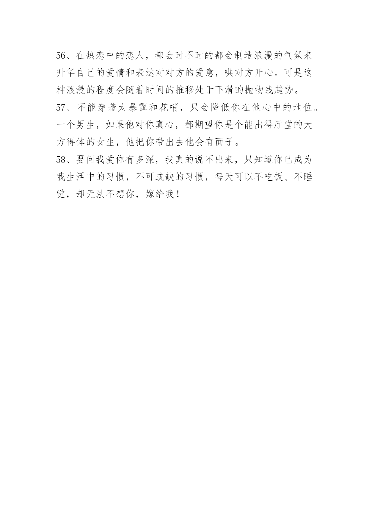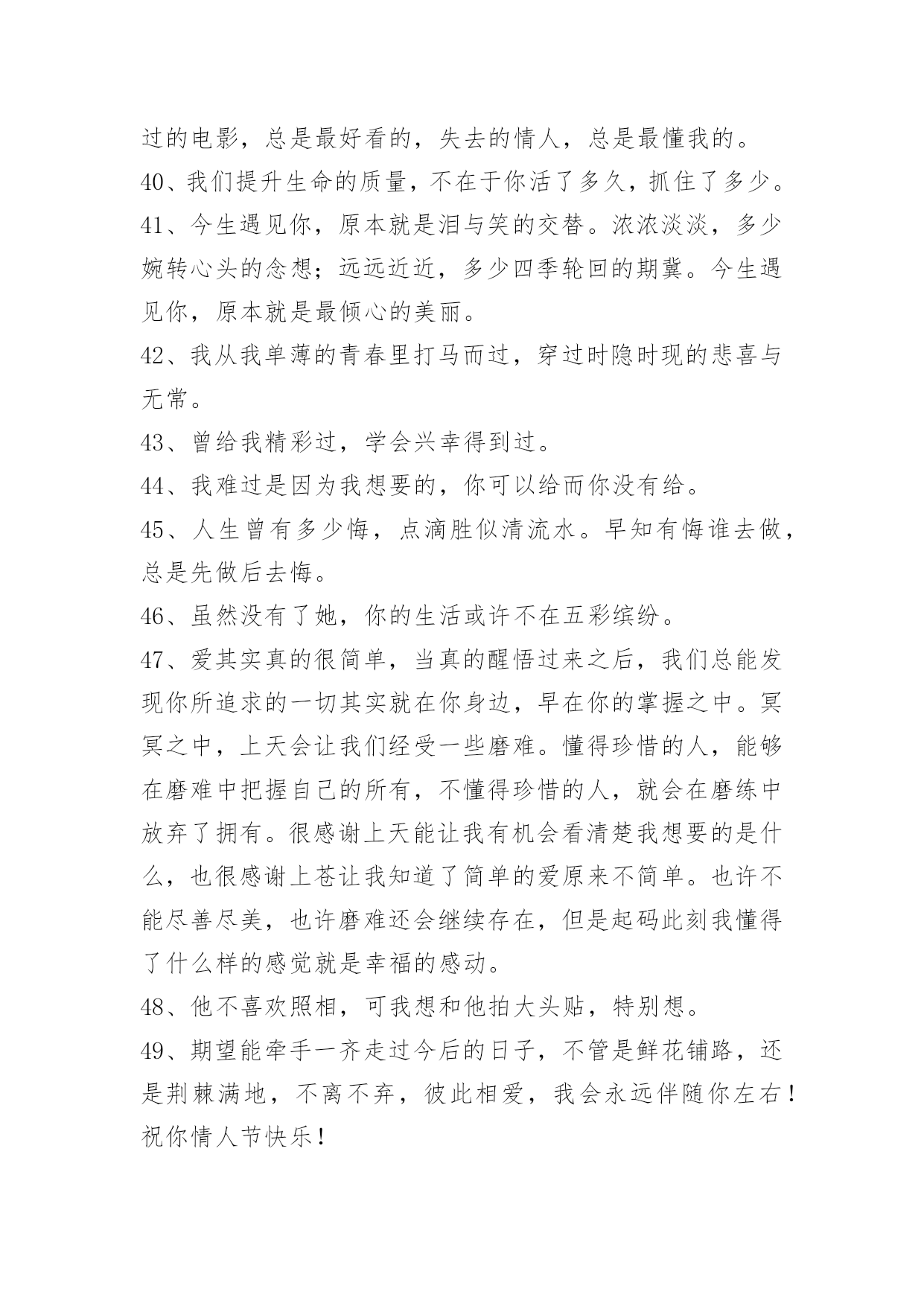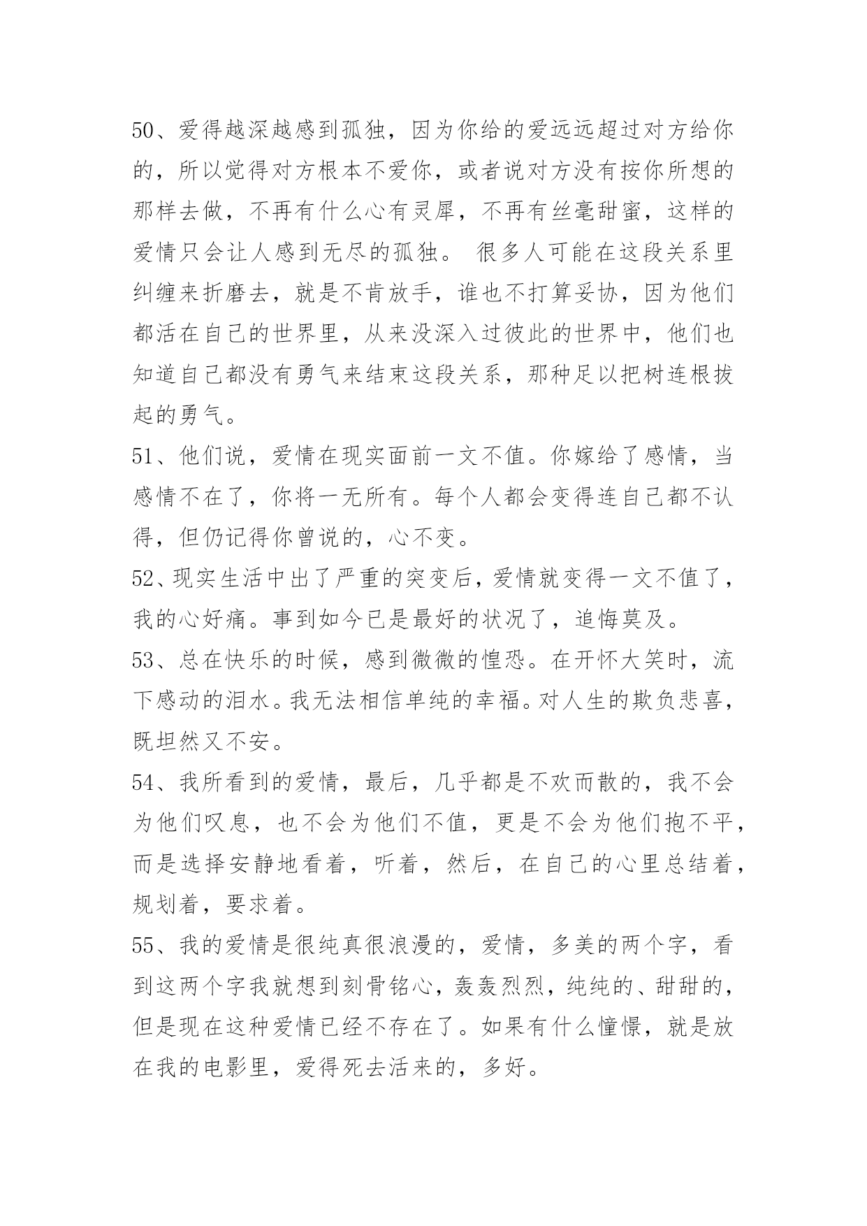 爱情情侣句子58条【推荐】爱情情侣句子58条爱情就象两个拉着橡皮筋的人,受伤的总是不愿意放手的那个人爱情老手,通常不会轻易将恋爱谈出结果!下面是小编为大家整理的爱情情侣句子58条,欢迎阅读。1、莫问我的思念!我的思念,恰似这一江春水向东流,拦不住,剪不断。2、是真的放开了吧?可以平静的面对他和她,纵然心里有种隐隐的说不出的酸楚,可是臣妾不再落泪,哭泣是因为一个人的记忆在心里,无论怎样也不肯散去。3、臣妾就像苍耳一样,想随着君到天涯,可君却将臣妾丢失在十六岁的那年夏季,可是臣妾再也找不到家。4、大妈,爱情市场价多少钱一斤。5、时间,总会把最爱你的人留到最后。6、总有人相信爱情,认为认真就永恒。7、秋的凄凉,雁过无痕。听着雨滴敲打着窗外不知名的物体,似乎谱写了一段天外的禅音。终明白了,原来走到哪,一样是四季犹在,只是要自己去细细品味了。心静自然万事不会燥与急,但凡遇大事而静者,必成其气,必得于心,万事不燥,一切遇静缘。凡事无杂念,心平天地宽。8、人生最好不相爱,没有相爱,便没有爱情带来的无奈、悲伤和痛苦,只留下初见时的惊艳、倾情,所有往事都可化为红尘一笑,只将美丽的回忆定格成一帧永恒的风景,不去触碰,不去走近,不爱的爱情,永远不会变坏,美丽的会始终美丽,如此便可不相弃。9、到底,多完美的情爱,多潋滟的春光,也消逝得极快。爱得痛了,爱得苟延残喘,爱得遍体鳞伤,还需孤自吞噬泪水,舔吻伤痕。若,曾经两道奔走,君向左,臣妾向右,不相遇,无相交,多好……10、人生这杯酒,是苦是甜,众人品尝,五味皆有。感慨多了就会伤感,伤感多了变成抱怨,尘世间童话般的爱情,王公贵族般的生活,现实中又有几许,可向往,莫迷茫。11、不爱你的人可以分为三种,一种是曾经爱过你,后来不爱了;另一种是自始至终都没爱过你;而最坏的那种,是从来没有爱过你,却让你以为他曾爱过。12、有时候被某个情节感动的一塌糊涂。13、鱼离不开水,而水可以没有鱼,鱼是那样依恋水,而水却从没在意过鱼的存在,对于水的冷漠鱼哭了,鱼知道在水心目中,自己永远不会占据最重要的位子。14、用心伴着爱情走,爱情才会永远伴着心走……15、人越是怕丢人,就越在乎别人的看法。16、走不通的路你怎么还不肯回头看,不爱你的人你怎么还不肯放手。17、你微信里有没有一个,反复拉黑的人?无数次把对方加入黑名单,又无数次想起。守不住,放不下,又忘不了。18、曾经有过迁就,都是那么歇斯底里的感触,有一种懵懂叫你楚楚心动,像小鹿在跑,像小兔在挠,心里痒痒得很,很奇特,又很古怪,仿佛面对的是一张脉脉含情的会笑的脸,会说话的眼。19、玻璃上只映出姑娘一只眼睛,她反而显得更加美了。——川端康成《雪国》20、有一种感觉叫患得患失,越是深爱越是害怕,深入骨髓,无法消除。太过于执著是一种负担,可是我对这种甜蜜的负担却情有独钟。对于感情太过于执著不知道是好是坏,无欲则刚,可是我对感情的欲望太过于强烈,以至于心太过于敏感脆弱。21、我愿做飞蛾,爱你不后悔。22、没有细水长流的相依,没有日出日落的相偎,亦没有青丝变白发的相守。只是隔着一个转身的距离,默默的守望,默默的祝福——你若安好,我便晴天。23、留不住的暖,抓不住的爱,与爱沉默,去把千山暮雪万水染,谁解相思红,谁蔚心中幽。24、与爱沉默,爱,那咸咸的,苦苦的,滋味,胶结着幸福甜蜜的往事,那无法言明的痛,那阵痛的心脏,那受伤的魂灵。25、我在想你,想你的脚步,就此凌乱我对你,一辈子的爱恋。26、没有信任的爱情,没有用的后悔。得不到的爱情,就放弃吧。不然,当你到达天堂之时,就是你坠入地狱之日;攀得越高,摔得越痛。27、是时候,让自己学着将悲伤锤炼成快乐。28、错过其实就这么简单:"在男生的世界里,你爱我就不会走;在女生的世界里,你爱我就会来找我。29、我在你身上犯过两个错,第一个是我一开始误以为自己是无可替代的,再一个是我后来我误以为有人可以替代你。30、其实人间也没什么疾苦,想你罢了。31、别人都有优乐美了,那你什么时候成为我的香飘飘呢?32、山有木兮木有枝,君悦君兮君不知。33、青春仿佛天空一束绚丽的焰火,曾经那么灿烂动人,却在一瞬间消失在了黑暗的背景之中。34、不要轻易接受爱情,一旦接受了,就要终生不渝。35、也许幸福对你我来说太过突兀。36、西王母也有过爱情,像风的颜色一样鲜明吹落的不是思念又该是何物老之将至而穆王是否也记得孤独丹墀铺满秋风和落寞枫叶枯萎于清冷的大殿中央树林藏起了通仙的路37、能开口说出的委屈,便不是委屈。能离开的人,便不算是爱人。38、有你的世界是如此精彩美丽,我很想走进去,可是我们的世界相差太远,说实话我怕自己走不了那么远,也怕你等不了那么久。39、女生的心很容易受伤,所以我不轻易说出口,假如期望落空了,伤心难过很不好受,总希望你先说,如果你也犹豫不决,或许我们