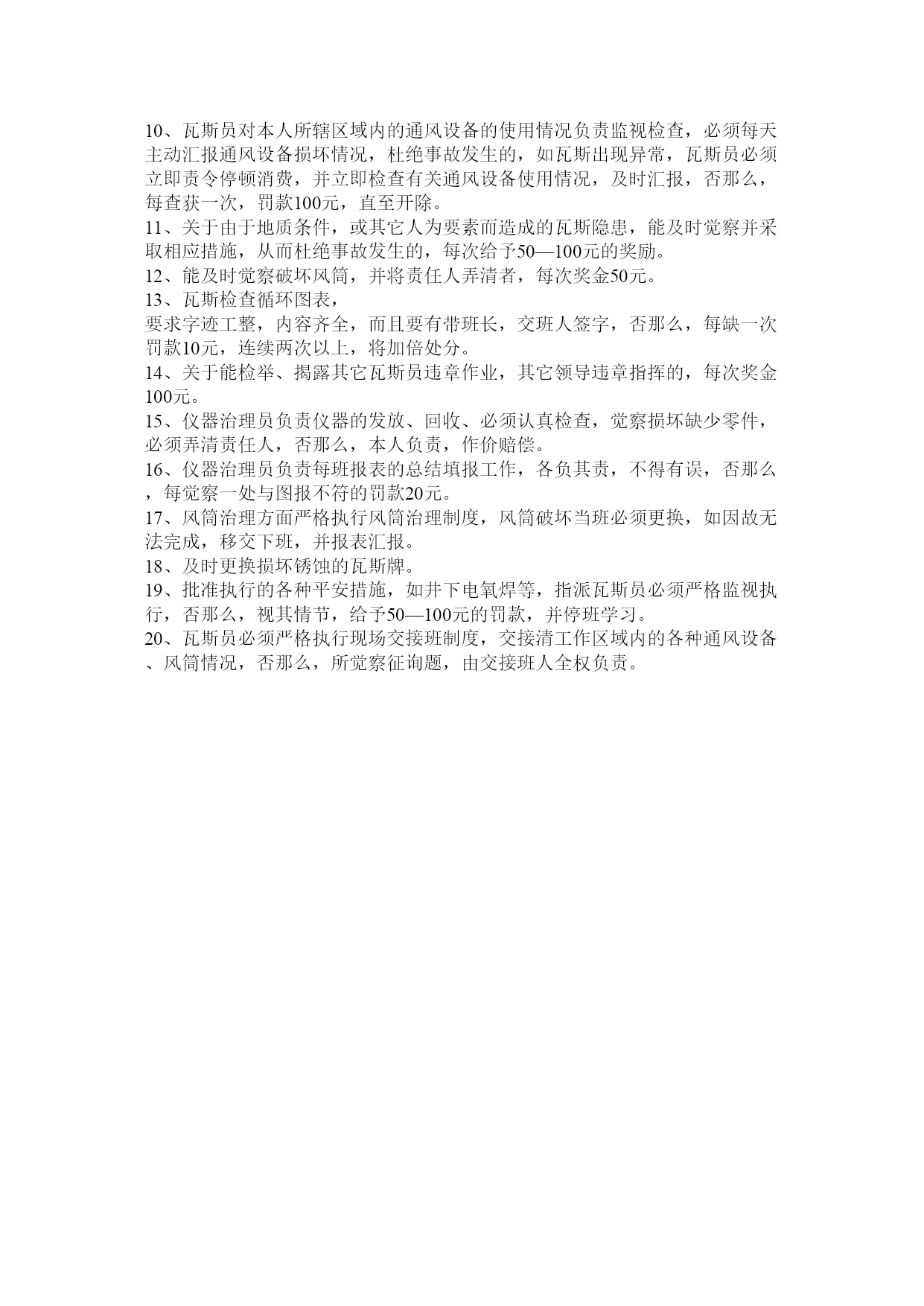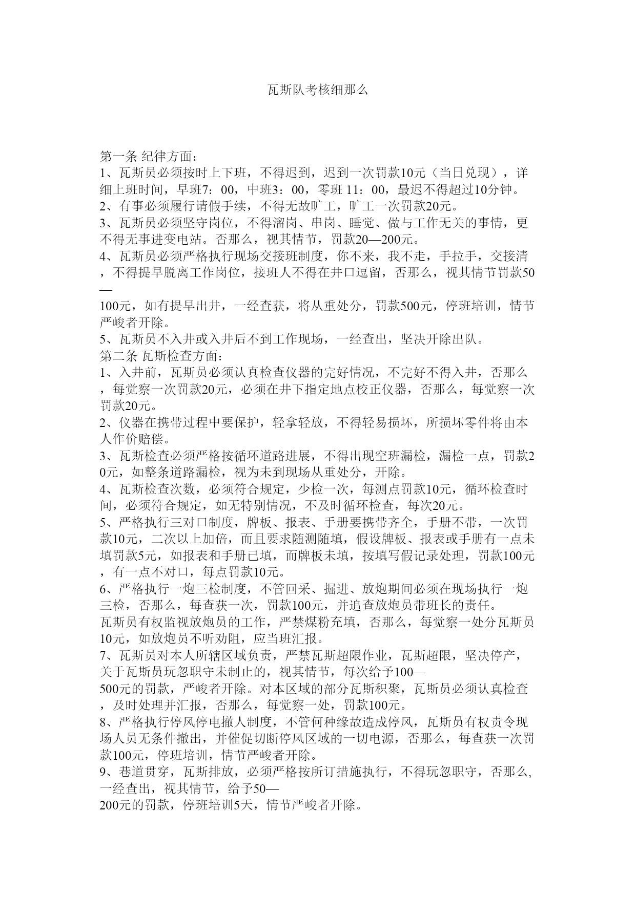 瓦斯队考核细那么第一条纪律方面:1、瓦斯员必须按时上下班,不得迟到,迟到一次罚款10元(当日兑现),详细上班时间,早班7:00,中班3:00,零班11:00,最迟不得超过10分钟。2、有事必须履行请假手续,不得无故旷工,旷工一次罚款20元。3、瓦斯员必须坚守岗位,不得溜岗、串岗、睡觉、做与工作无关的事情,更不得无事进变电站。否那么,视其情节,罚款20—200元。4、瓦斯员必须严格执行现场交接班制度,你不来,我不走,手拉手,交接清,不得提早脱离工作岗位,接班人不得在井口逗留,否那么,视其情节罚款50—100元,如有提早出井,一经查获,将从重处分,罚款500元,停班培训,情节严峻者开除。5、瓦斯员不入井或入井后不到工作现场,一经查出,坚决开除出队。第二条瓦斯检查方面:1、入井前,瓦斯员必须认真检查仪器的完好情况,不完好不得入井,否那么,每觉察一次罚款20元,必须在井下指定地点校正仪器,否那么,每觉察一次罚款20元。2、仪器在携带过程中要保护,轻拿轻放,不得轻易损坏,所损坏零件将由本人作价赔偿。3、瓦斯检查必须严格按循环道路进展,不得出现空班漏检,漏检一点,罚款20元,如整条道路漏检,视为未到现场从重处分,开除。4、瓦斯检查次数,必须符合规定,少检一次,每测点罚款10元,循环检查时间,必须符合规定,如无特别情况,不及时循环检查,每次20元。5、严格执行三对口制度,牌板、报表、手册要携带齐全,手册不带,一次罚款10元,二次以上加倍,而且要求随测随填,假设牌板、报表或手册有一点未填罚款5元,如报表和手册已填,而牌板未填,按填写假记录处理,罚款100元,有一点不对口,每点罚款10元。6、严格执行一炮三检制度,不管回采、掘进、放炮期间必须在现场执行一炮三检,否那么,每查获一次,罚款100元,并追查放炮员带班长的责任。瓦斯员有权监视放炮员的工作,严禁煤粉充填,否那么,每觉察一处分瓦斯员10元,如放炮员不听劝阻,应当班汇报。7、瓦斯员对本人所辖区域负责,严禁瓦斯超限作业,瓦斯超限,坚决停产,关于瓦斯员玩忽职守未制止的,视其情节,每次给予100—500元的罚款,严峻者开除。对本区域的部分瓦斯积聚,瓦斯员必须认真检查,及时处理并汇报,否那么,每觉察一处,罚款100元。8、严格执行停风停电撤人制度,不管何种缘故造成停风,瓦斯员有权责令现场人员无条件撤出,并催促切断停风区域的一切电源,否那么,每查获一次罚款100元,停班培训,情节严峻者开除。9、巷道贯穿,瓦斯排放,必须严格按所订措施执行,不得玩忽职守,否那么,一经查出,视其情节,给予50—200元的罚款,停班培训5天,情节严峻者开除。10、瓦斯员对本人所辖区域内的通风设备的使用情况负责监视检查,必须每天主动汇报通风设备损坏情况,杜绝事故发生的,如瓦斯出现异常,瓦斯员必须立即责令停顿消费,并立即检查有关通风设备使用情况,及时汇报,否那么,每查获一次,罚款100元,直至开除。11、关于由于地质条件,或其它人为要素而造成的瓦斯隐患,能及时觉察并采取相应措施,从而杜绝事故发生的,每次给予50—100元的奖励。12、能及时觉察破坏风筒,并将责任人弄清者,每次奖金50元。13、瓦斯检查循环图表,要求字迹工整,内容齐全,而且要有带班长,交班人签字,否那么,每缺一次罚款10元,连续两次以上,将加倍处分。14、关于能检举、揭露其它瓦斯员违章作业,其它领导违章指挥的,每次奖金100元。15、仪器治理员负责仪器的发放、回收、必须认真检查,觉察损坏缺少零件,必须弄清责任人,否那么,本人负责,作价赔偿。16、仪器治理员负责每班报表的总结填报工作,各负其责,不得有误,否那么,每觉察一处与图报不符的罚款20元。17、风筒治理方面严格执行风筒治理制度,风筒破坏当班必须更换,如因故无法完成,移交下班,并报表汇报。18、及时更换损坏锈蚀的瓦斯牌。19、批准执行的各种平安措施,如井下电氧焊等,指派瓦斯员必须严格监视执行,否那么,视其情节,给予50—100元的罚款,并停班学习。20、瓦斯员必须严格执行现场交接班制度,交接清工作区域内的各种通风设备、风筒情况,否那么,所觉察征询题,由交接班人全权负责。