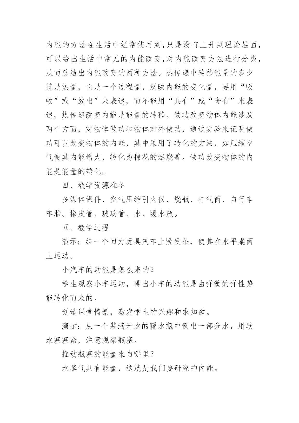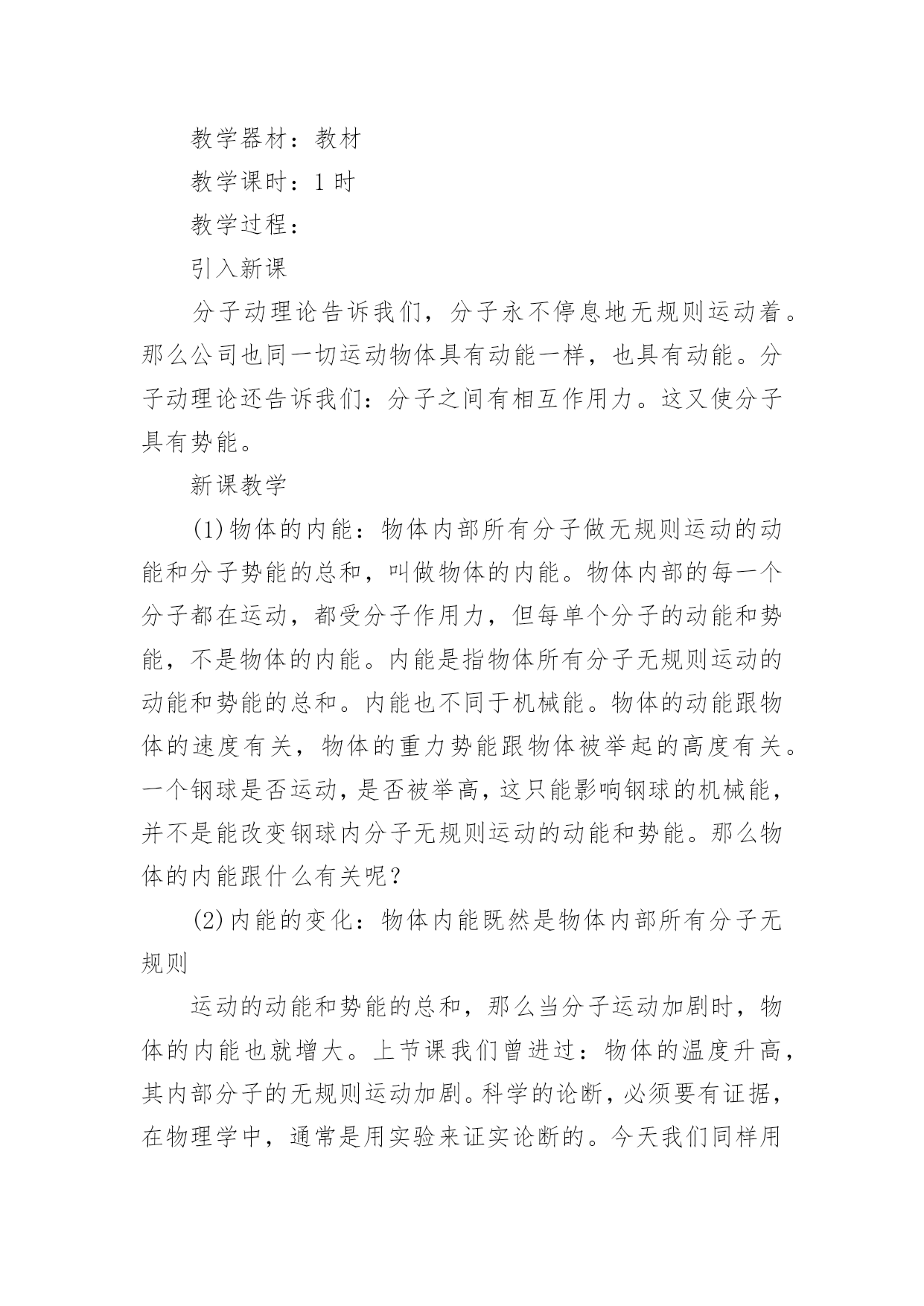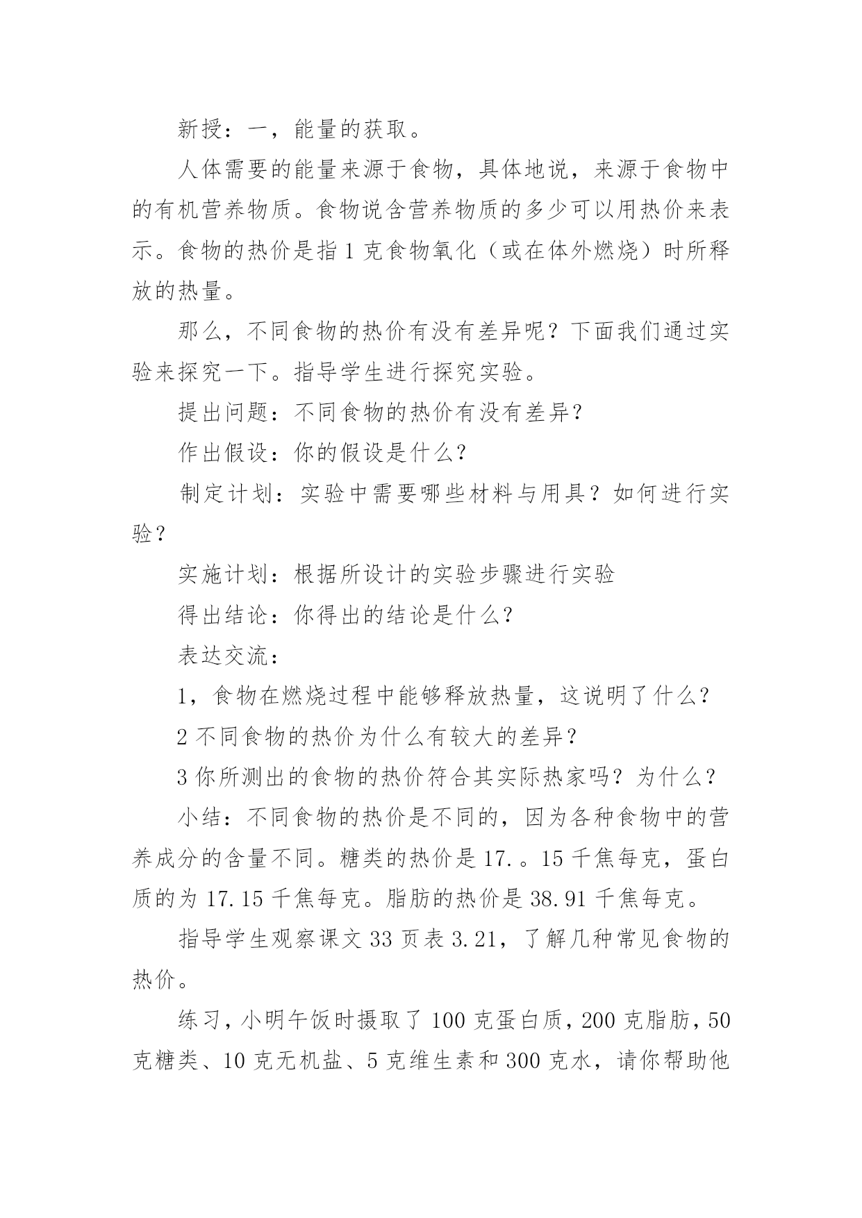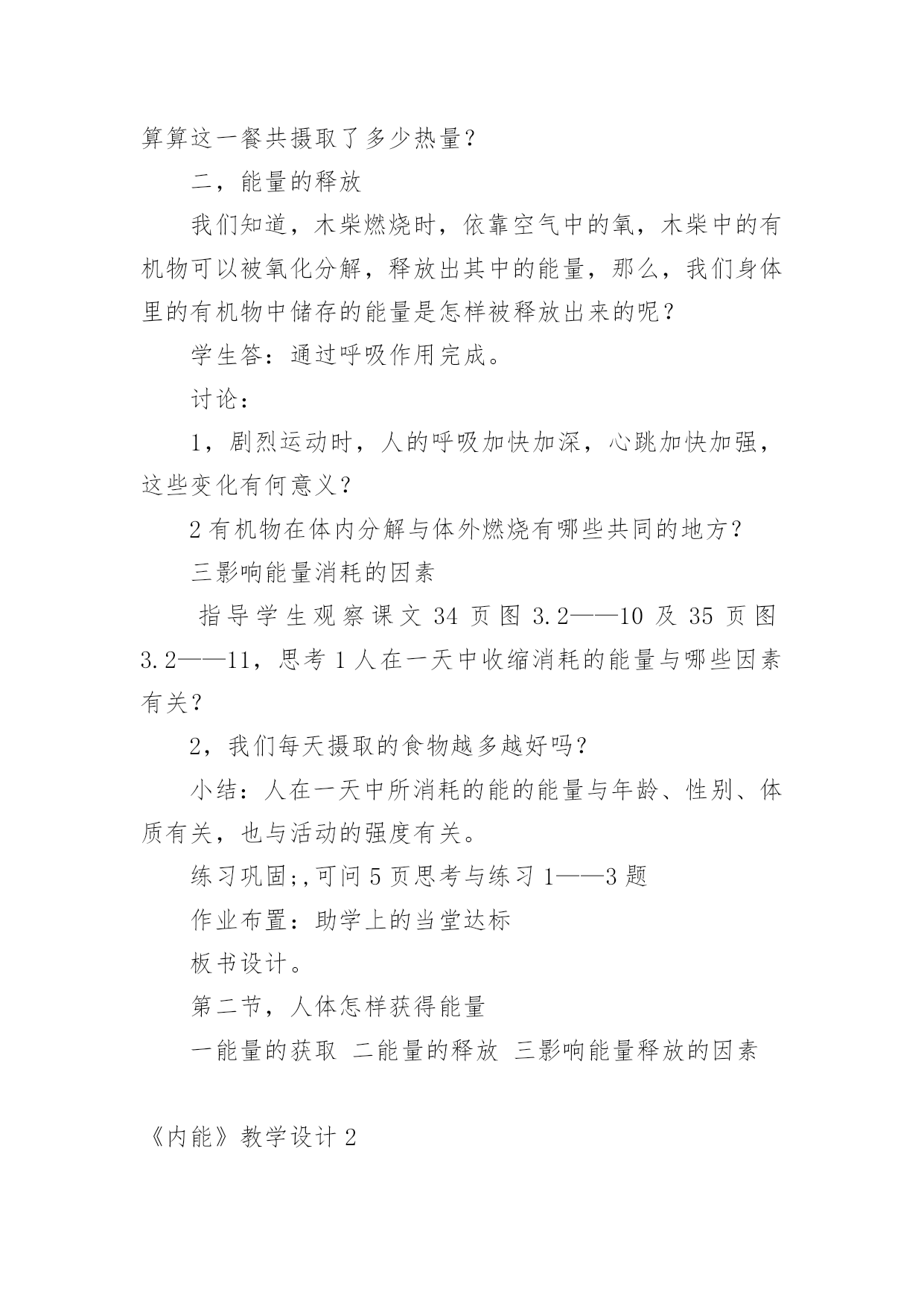 《内能》教学设计作为一名教师,常常要根据教学需要编写教学设计,教学设计以计划和布局安排的形式,对怎样才能达到教学目标进行创造性的决策,以解决怎样教的问题。那么什么样的教学设计才是好的呢?以下是小编收集整理的《内能》教学设计,希望能够帮助到大家。《内能》教学设计1学习目标1探究不同食物的热价(重、难点)2理解人体内能量的释放过程(重、难点)3举例说明影响能量消耗的因素学习用具:课件学习方法:观察、阅读、思考、讨论等学习过程:问:人体内的气体交换的原理是什么?包括哪两个过程?2肺泡内的气体交换和组织里的气体交换分别是如何进行的?引入:大家都有过这样的经历,当我们剧烈运动时,常有心慌、气短的感觉,饥饿时,我们会感到全身乏力。这些现象都预热体的能量的供给有关。那么,人体是如何获得能量的呢?让我们一起来学习第二节(板书课题)第二节人体怎样获得能量新授:一,能量的获取。人体需要的能量来源于食物,具体地说,来源于食物中的有机营养物质。食物说含营养物质的多少可以用热价来表示。食物的热价是指1克食物氧化(或在体外燃烧)时所释放的热量。那么,不同食物的热价有没有差异呢?下面我们通过实验来探究一下。指导学生进行探究实验。提出问题:不同食物的热价有没有差异?作出假设:你的假设是什么?制定计划:实验中需要哪些材料与用具?如何进行实验?实施计划:根据所设计的实验步骤进行实验得出结论:你得出的结论是什么?表达交流:1,食物在燃烧过程中能够释放热量,这说明了什么?2不同食物的热价为什么有较大的差异?3你所测出的食物的热价符合其实际热家吗?为什么?小结:不同食物的热价是不同的,因为各种食物中的营养成分的含量不同。糖类的热价是17.。15千焦每克,蛋白质的为17.15千焦每克。脂肪的热价是38.91千焦每克。指导学生观察课文33页表3.21,了解几种常见食物的热价。练习,小明午饭时摄取了100克蛋白质,200克脂肪,50克糖类、10克无机盐、5克维生素和300克水,请你帮助他算算这一餐共摄取了多少热量?二,能量的释放我们知道,木柴燃烧时,依靠空气中的氧,木柴中的有机物可以被氧化分解,释放出其中的能量,那么,我们身体里的有机物中储存的能量是怎样被释放出来的呢?学生答:通过呼吸作用完成。讨论:1,剧烈运动时,人的呼吸加快加深,心跳加快加强,这些变化有何意义?2有机物在体内分解与体外燃烧有哪些共同的地方?三影响能量消耗的因素指导学生观察课文34页图3.2——10及35页图3.2——11,思考1人在一天中收缩消耗的能量与哪些因素有关?2,我们每天摄取的食物越多越好吗?小结:人在一天中所消耗的能的能量与年龄、性别、体质有关,也与活动的强度有关。练习巩固;,可问5页思考与练习1——3题作业布置:助学上的当堂达标板书设计。第二节,人体怎样获得能量一能量的获取二能量的释放三影响能量释放的因素《内能》教学设计2教材分析:本节阐述了内能的概念,描述了温度与内能的关系,并讲解了什么是热量,以及热量的单位,教材从生活实际中的一些例子讲明了如何增加或减少物体的内能。教学目标:1.知识与技能●了解内能的概念,能简单描述温度和内能的关系.●知道热传递过程中,物体吸收(放出)热量,温度升高(降低),内能改变.●了解热量的概念,热量的单位是焦耳.●知道做功可以使物体内能增加和减少的一些事例.2.过程与方法●通过探究找到改变物体内能的多种方法.●通过演示实验说明做功可以使物体内能增加和减少.●通过学生查找资料,了解地球的"温室效应".3.情感态度与价值观●通过探究,使学生体验探究的过程,激发学生主动学习的兴趣.●通过演示实验,培养学生的观察能力,并使学生通过实验理解做功与内能变化的关系.●鼓励学生自己查找资料,培养学生自学的能力.教学重点与难点:重点:探究改变物体内能的多种方法.难点:内能与温度有关.教学器材:教材教学课时:1时教学过程:引入新课分子动理论告诉我们,分子永不停息地无规则运动着。那么公司也同一切运动物体具有动能一样,也具有动能。分子动理论还告诉我们:分子之间有相互作用力。这又使分子具有势能。新课教学(1)物体的内能:物体内部所有分子做无规则运动的动能和分子势能的总和,叫做物体的内能。物体内部的每一个分子都在运动,都受分子作用力,但每单个分子的动能和势能,不是物体的内能。内能是指物体所有分子无规则运动的动能和势能的总和。内能也不同于机械能。物体的动能跟物体的速度有关,物体的重力势能跟物体被举起的高度有关。一个钢球是否运动,是否被举高,这只能影响钢球的机械能,并不是能改变钢球内分子无规则运动的动能和势能。那么物体的内能跟什么有关呢?(2)内能的变化:物体内能既然是物体内部所有分子无规则运动的动能和势能的总和,那么当分子运动加剧时,物体的内能也就增大。上节课我们曾进过:物体的温度升高,