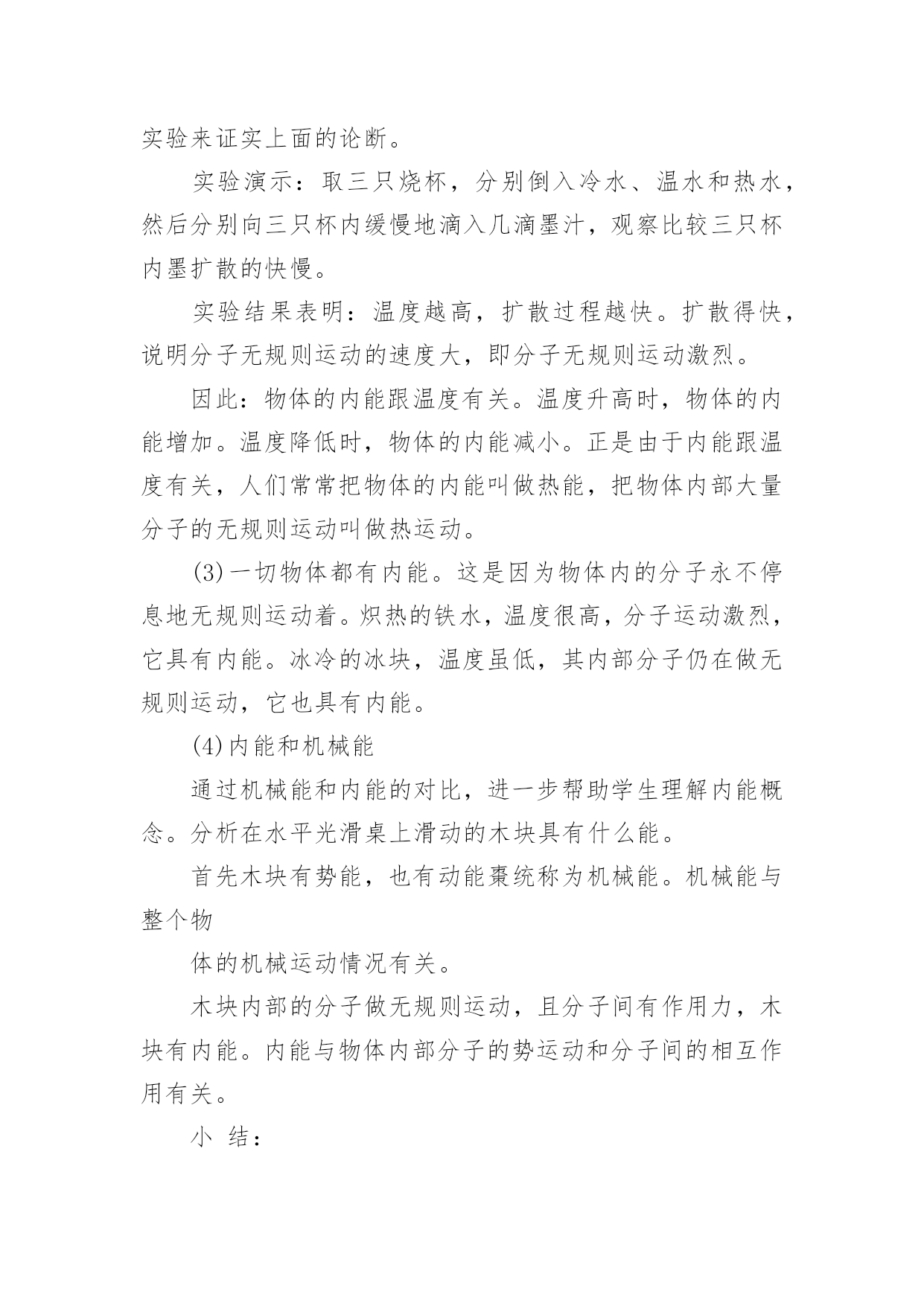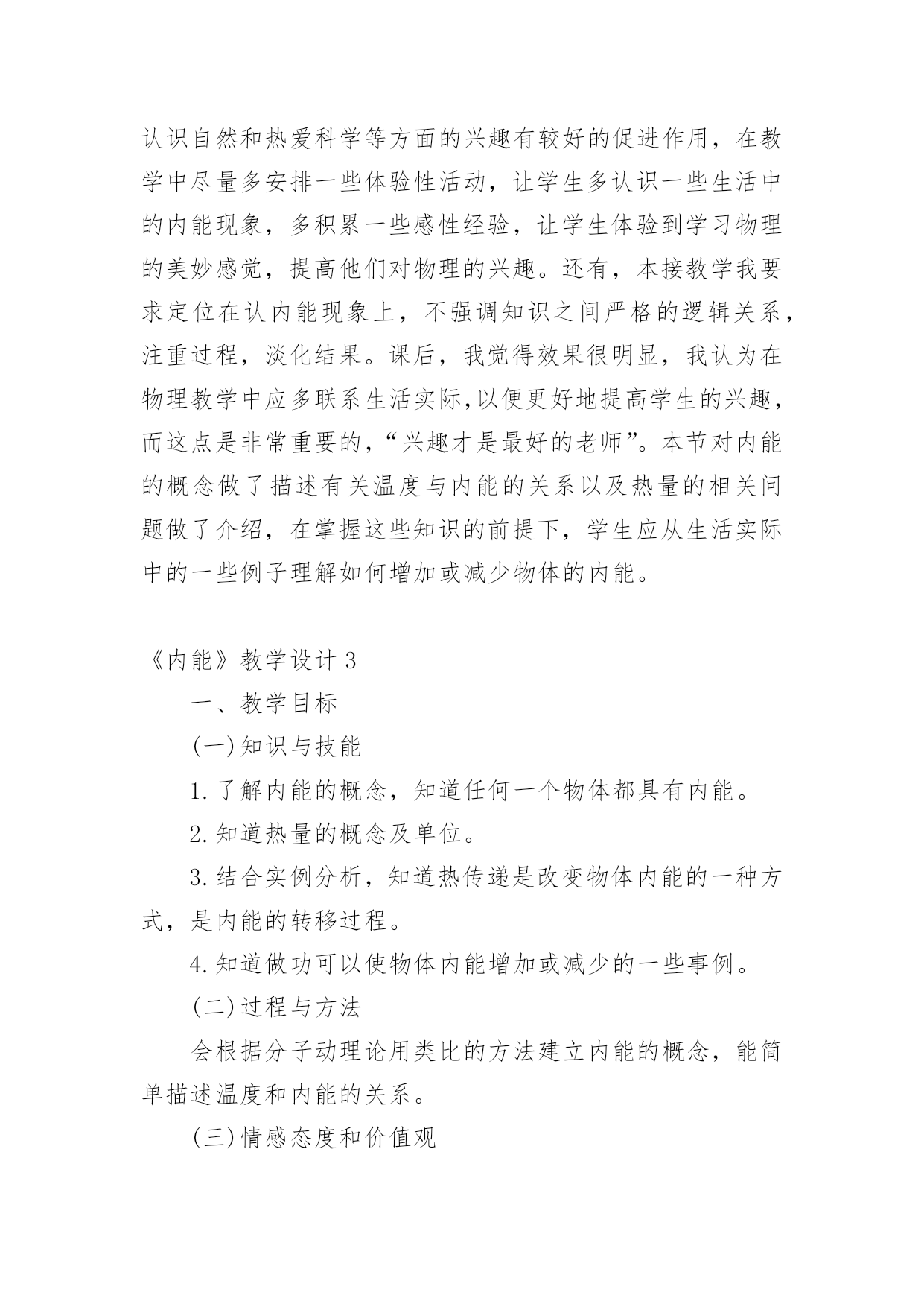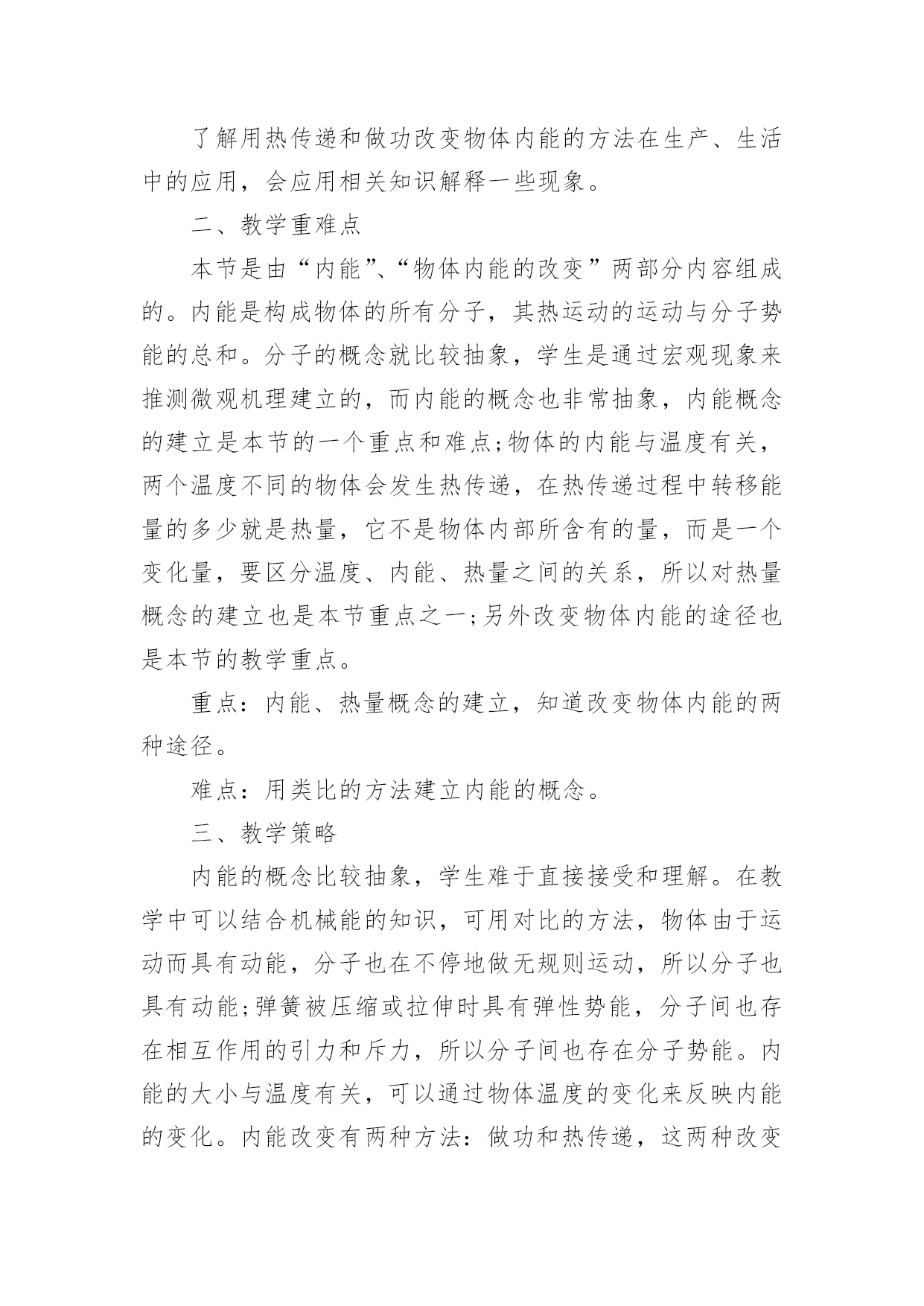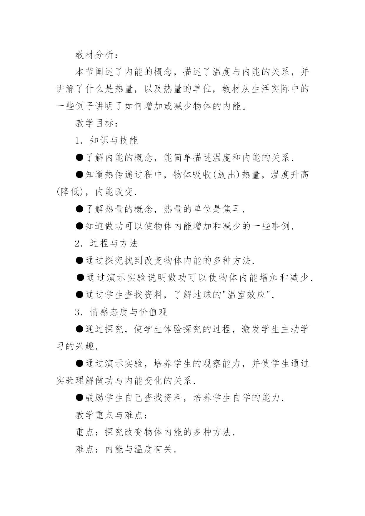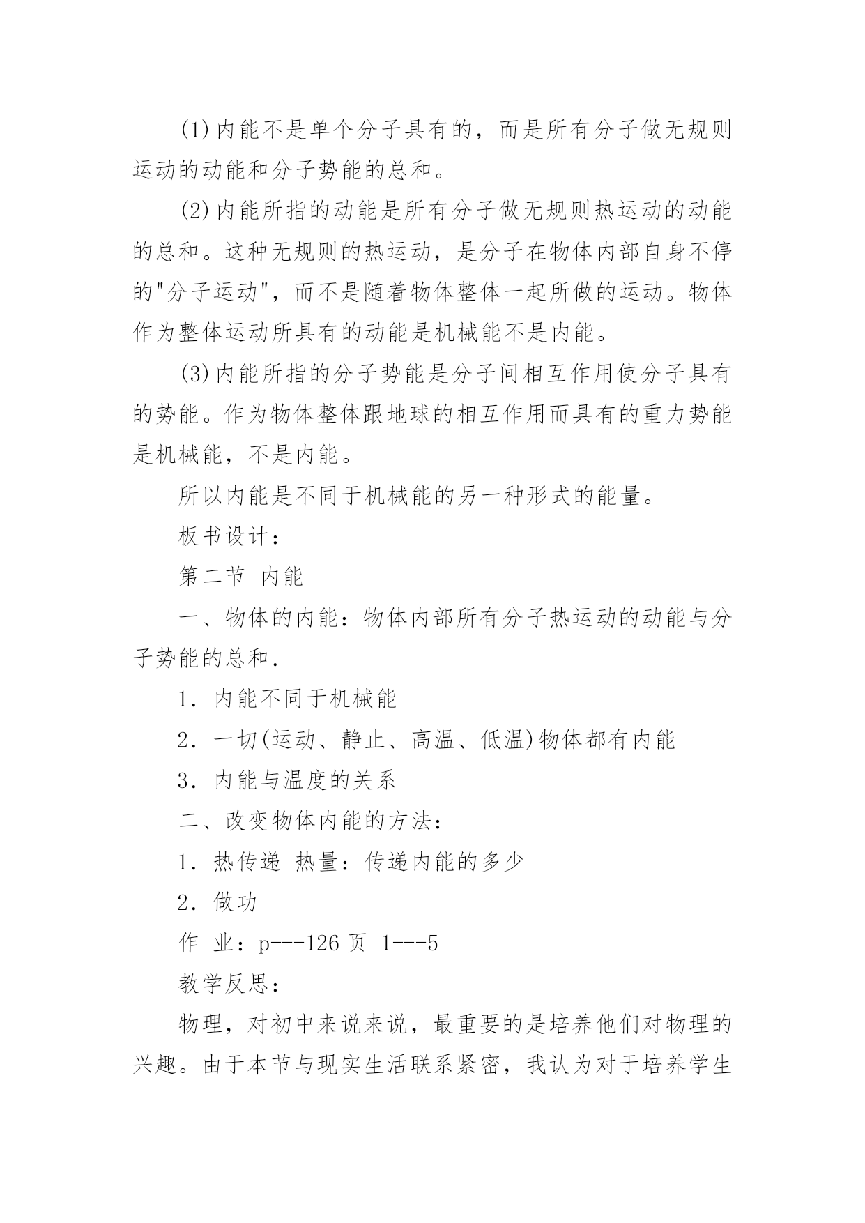 《内能》教学设计作为一名教师,常常要根据教学需要编写教学设计,教学设计以计划和布局安排的形式,对怎样才能达到教学目标进行创造性的决策,以解决怎样教的问题。那么什么样的教学设计才是好的呢?以下是小编收集整理的《内能》教学设计,希望能够帮助到大家。《内能》教学设计1学习目标1探究不同食物的热价(重、难点)2理解人体内能量的释放过程(重、难点)3举例说明影响能量消耗的因素学习用具:课件学习方法:观察、阅读、思考、讨论等学习过程:问:人体内的气体交换的原理是什么?包括哪两个过程?2肺泡内的气体交换和组织里的气体交换分别是如何进行的?引入:大家都有过这样的经历,当我们剧烈运动时,常有心慌、气短的感觉,饥饿时,我们会感到全身乏力。这些现象都预热体的能量的供给有关。那么,人体是如何获得能量的呢?让我们一起来学习第二节(板书课题)第二节人体怎样获得能量新授:一,能量的获取。人体需要的能量来源于食物,具体地说,来源于食物中的有机营养物质。食物说含营养物质的多少可以用热价来表示。食物的热价是指1克食物氧化(或在体外燃烧)时所释放的热量。那么,不同食物的热价有没有差异呢?下面我们通过实验来探究一下。指导学生进行探究实验。提出问题:不同食物的热价有没有差异?作出假设:你的假设是什么?制定计划:实验中需要哪些材料与用具?如何进行实验?实施计划:根据所设计的实验步骤进行实验得出结论:你得出的结论是什么?表达交流:1,食物在燃烧过程中能够释放热量,这说明了什么?2不同食物的热价为什么有较大的差异?3你所测出的食物的热价符合其实际热家吗?为什么?小结:不同食物的热价是不同的,因为各种食物中的营养成分的含量不同。糖类的热价是17.。15千焦每克,蛋白质的为17.15千焦每克。脂肪的热价是38.91千焦每克。指导学生观察课文33页表3.21,了解几种常见食物的热价。练习,小明午饭时摄取了100克蛋白质,200克脂肪,50克糖类、10克无机盐、5克维生素和300克水,请你帮助他算算这一餐共摄取了多少热量?二,能量的释放我们知道,木柴燃烧时,依靠空气中的氧,木柴中的有机物可以被氧化分解,释放出其中的能量,那么,我们身体里的有机物中储存的能量是怎样被释放出来的呢?学生答:通过呼吸作用完成。讨论:1,剧烈运动时,人的呼吸加快加深,心跳加快加强,这些变化有何意义?2有机物在体内分解与体外燃烧有哪些共同的地方?三影响能量消耗的因素指导学生观察课文34页图3.2——10及35页图3.2——11,思考1人在一天中收缩消耗的能量与哪些因素有关?2,我们每天摄取的食物越多越好吗?小结:人在一天中所消耗的能的能量与年龄、性别、体质有关,也与活动的强度有关。练习巩固;,可问5页思考与练习1——3题作业布置:助学上的当堂达标板书设计。第二节,人体怎样获得能量一能量的获取二能量的释放三影响能量释放的因素《内能》教学设计2教材分析:本节阐述了内能的概念,描述了温度与内能的关系,并讲解了什么是热量,以及热量的单位,教材从生活实际中的一些例子讲明了如何增加或减少物体的内能。教学目标:1.知识与技能●了解内能的概念,能简单描述温度和内能的关系.●知道热传递过程中,物体吸收(放出)热量,温度升高(降低),内能改变.●了解热量的概念,热量的单位是焦耳.●知道做功可以使物体内能增加和减少的一些事例.2.过程与方法●通过探究找到改变物体内能的多种方法.●通过演示实验说明做功可以使物体内能增加和减少.●通过学生查找资料,了解地球的"温室效应".3.情感态度与价值观●通过探究,使学生体验探究的过程,激发学生主动学习的兴趣.●通过演示实验,培养学生的观察能力,并使学生通过实验理解做功与内能变化的关系.●鼓励学生自己查找资料,培养学生自学的能力.教学重点与难点:重点:探究改变物体内能的多种方法.难点:内能与温度有关.教学器材:教材教学课时:1时教学过程:引入新课分子动理论告诉我们,分子永不停息地无规则运动着。那么公司也同一切运动物体具有动能一样,也具有动能。分子动理论还告诉我们:分子之间有相互作用力。这又使分子具有势能。新课教学(1)物体的内能:物体内部所有分子做无规则运动的动能和分子势能的总和,叫做物体的内能。物体内部的每一个分子都在运动,都受分子作用力,但每单个分子的动能和势能,不是物体的内能。内能是指物体所有分子无规则运动的动能和势能的总和。内能也不同于机械能。物体的动能跟物体的速度有关,物体的重力势能跟物体被举起的高度有关。一个钢球是否运动,是否被举高,这只能影响钢球的机械能,并不是能改变钢球内分子无规则运动的动能和势能。那么物体的内能跟什么有关呢?(2)内能的变化:物体内能既然是物体内部所有分子无规则运动的动能和势能的总和,那么当分子运动加剧时,物体的内能也就增大。上节课我们曾进过:物体的温度升高,