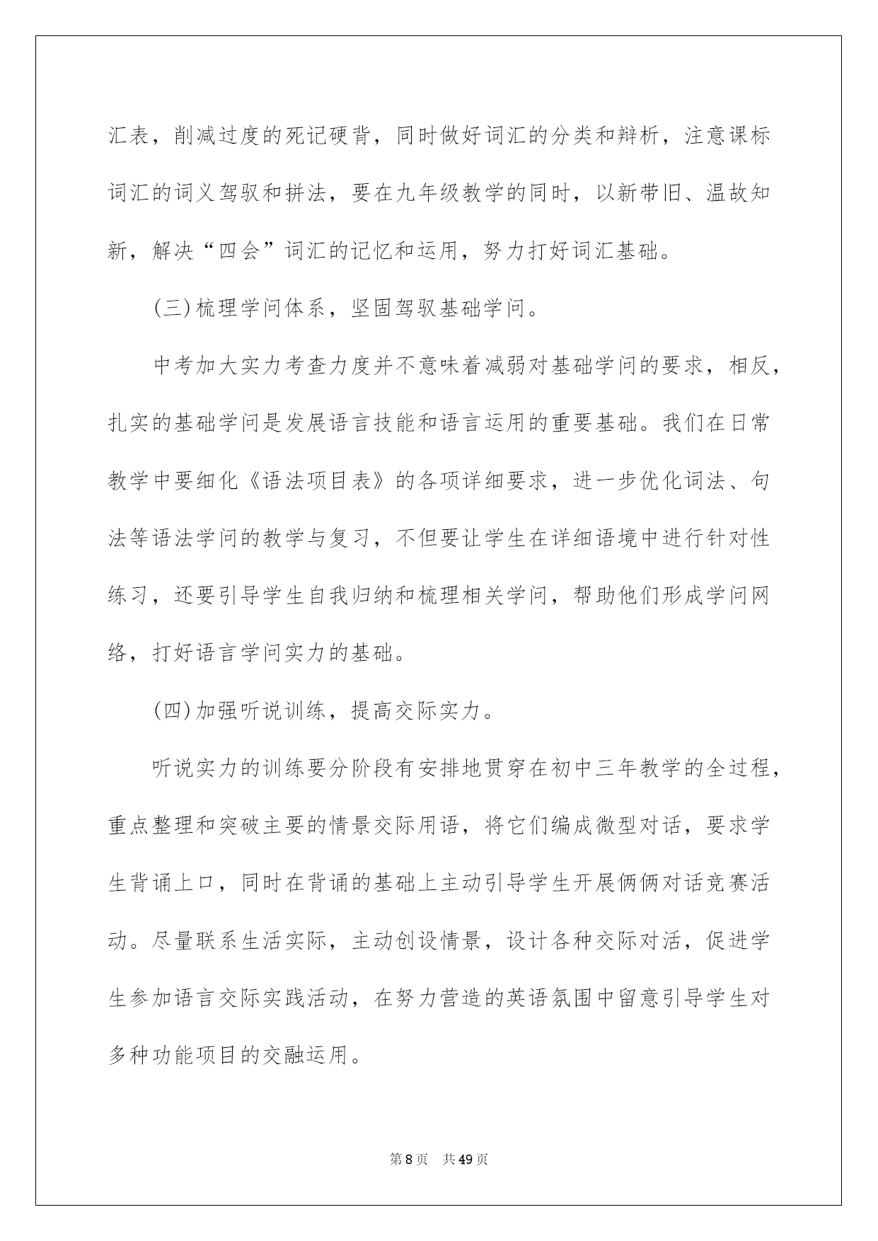 第PAGE\*Arabic\*MERGEFORMAT49页共NUMPAGES\*Arabic\*MERGEFORMAT49页第PAGE\*MERGEFORMAT49页共NUMPAGES\*MERGEFORMAT49页第PAGE\*MERGEFORMAT49页共NUMPAGES\*MERGEFORMAT49页第PAGE\*MERGEFORMAT49页共NUMPAGES\*MERGEFORMAT49页第PAGE\*MERGEFORMAT49页共NUMPAGES\*MERGEFORMAT49页第PAGE\*MERGEFORMAT49页共NUMPAGES\*MERGEFORMAT49页第PAGE\*MERGEFORMAT49页共NUMPAGES\*MERGEFORMAT49页第PAGE\*MERGEFORMAT49页共NUMPAGES\*MERGEFORMAT49页第PAGE\*MERGEFORMAT49页共NUMPAGES\*MERGEFORMAT49页第PAGE\*MERGEFORMAT49页共NUMPAGES\*MERGEFORMAT49页第PAGE\*MERGEFORMAT49页共NUMPAGES\*MERGEFORMAT49页2022初中英语教学计划初中英语教学安排日子在弹指一挥间就毫无声息的消逝,我们又将迎来新的喜悦、新的收获,做好安排可是让你提高工作效率的方法喔!什么样的安排才是好的安排呢?下面是我为大家收集的初中英语教学安排,希望能够帮助到大家。初中英语教学安排1一.指导思想全面贯彻党的教化方针,主动推动教学改革,以实施素养教化为突破口,结合学科特点,仔细学习课改方案和课程标准,努力探究教学方法创新,提高课堂教学效率,进一步提英语学科教化教学此文转自质量。二.学情分析七年级3班及4班现有学生83名,英语水平不等。学生的英语基础学问和听说实力普遍较差,大部分学生虽然在小学接触过英语,但应用实力非常薄弱,特殊是听力题,很大一部分学生听起来都很吃力。面对学生驾驭英语的程度不一,将采纳分层教学与整体教学相结合的方式完成教学任务,努力提高他们的英语水平。另外,两班学生在情感看法,学习策略和文化意识方面还存在诸多须要进一步解决的问题。例如:个别学生不明确学习英语的目的;有些同学对学好英语缺乏自信,不敢用英语表达;缺乏小组合作意识;一些学生没养成良好的学习习惯,不能做好课前预习课后复习,学习没有安排性和策略性;不擅长发觉和总结语言规律,不留意学问的巩固和积累。三.教材分析这套教材采纳任务型语言教学模式,融汇话题、交际功能和语言结构,形成了一套按部就班的生活化的学习程序。本书每个单元都列出明确的语言目标、主要的功能项目与语法结构、须要驾驭的基本词汇,并分为A和B两部分。A部分是基本的语言内容,B部分是学问的扩展和综合的语言运用。四.实行措施1、加强词汇教学。包括单词拼法,词义记忆,语用功能的训练,在平常的教学中肯定要常抓不懈。词汇是文章、句子的基本单位,词汇量的大小,将干脆关系到学生能否流畅地运用英语进行交际;能否娴熟地用英语读和写;能否顺当地用英语思索。单词教学肯定要做到词不离句,这样,学生在学会了单词的同时,也学会了词的一些基本用法。2、语法与语境相结合。要重视语法学问对于培育语言运用功能的基础作用,又要注意改革教法。课堂上肯定要有生动活泼的教学活动。让学生在生动的语境中学习语法,自然驾驭其中的规律。3、加强交际用语练习。用英语进行交际是英语教学的根本目标。在教学语言功能项目时,要尽量避开格式化,不能限制学生的思维实力,要培育学生敏捷运用语言的应变实力。4、进一步培育阅读实力。通过本次期末考试可以看出,学生们的阅读实力有待提高,正样就要求老师在平常讲解阅读理解题时,应着力帮助学生分析语言材料,而不是核对答案。从而帮助学生提高阅读实力。五.奋斗目标钻研新课标,提高教学水平,真正做到教学相长,努力达到学校规定的教学指标。六.教研教改仔细参与学校的教研教改活动,主动主动担当教改课题,细致探讨,用新课标历年,结合新课标精神,进行课堂改革,实行教与学的湖动,努力用一套行之有效的课堂教学模式,提高教学效率,争取取得优异成果。初中英语教学安排2转瞬,新的学期又将来临。在新的学期,初中英语教研组也有了新的面貌,在面对新的挑战,我们英语教研组,人人都充溢信念,在新的一年必定会取得新的成果,现将工作安排如下:一、指导思想:在科学发展观的指导下,并结合我校的实际状况和英语学科的特点,以“一案三环六步”为抓手,把提高备课组的质量作为主阵地,努力提高老师的教学理念和业务素养,探讨课堂,落实有效教学,扎